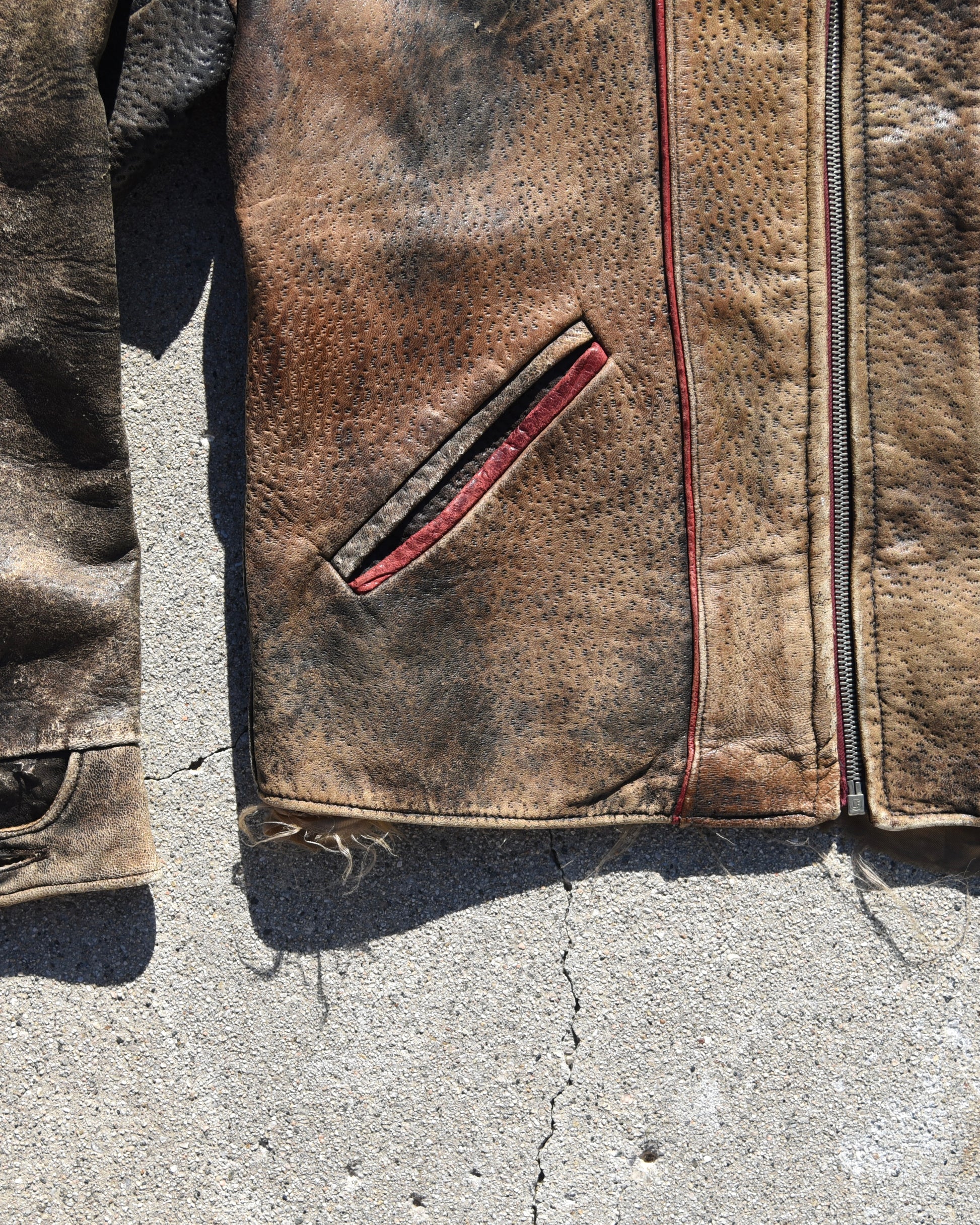 True vintage 1940s horsehide jacket. Lightning zipper, red lined pockets, red buckle backs. Made by Perfect Leather Garment Company in Toronto. Has signs of wear consistent with age most notably on the inside lining. Fits like a medium