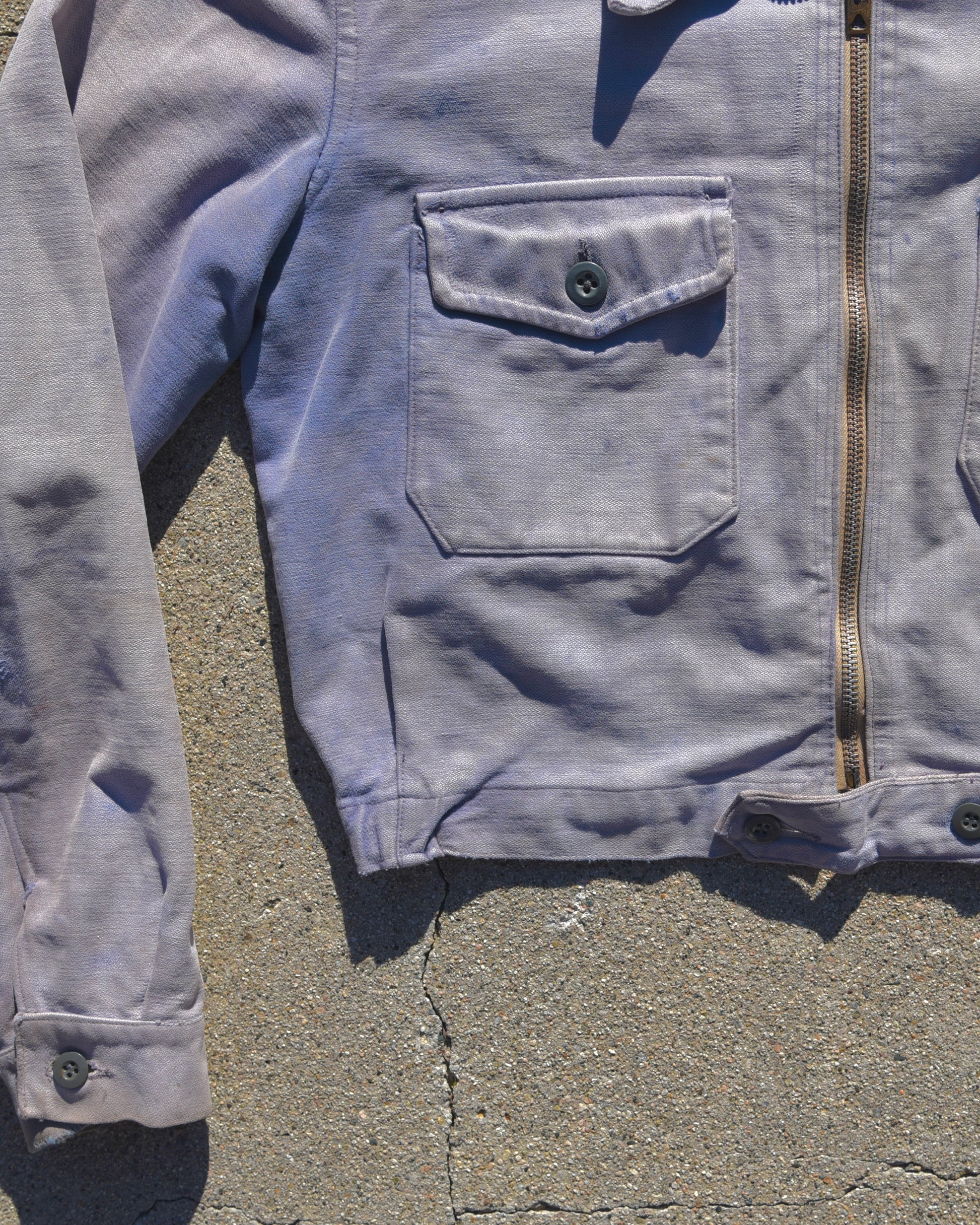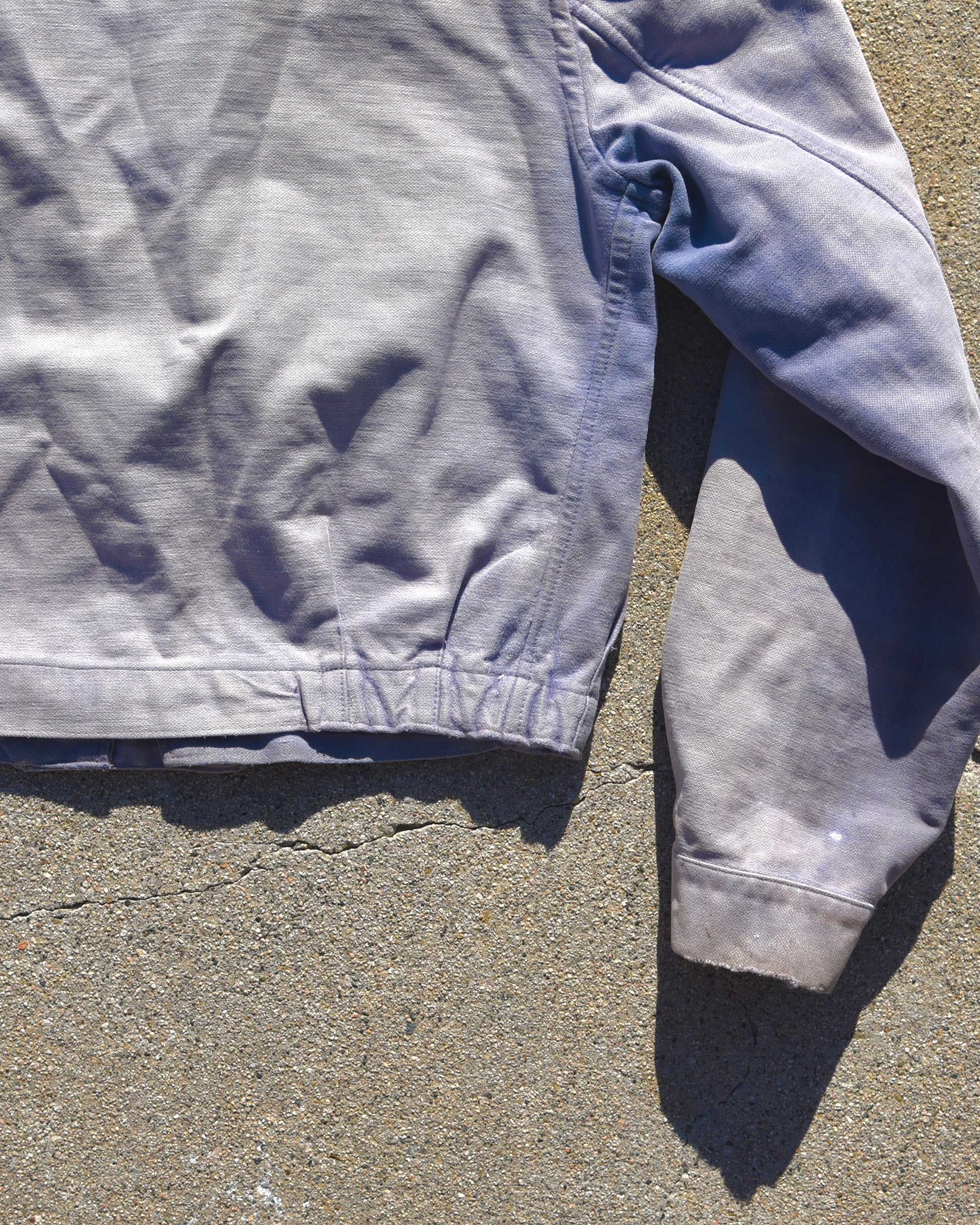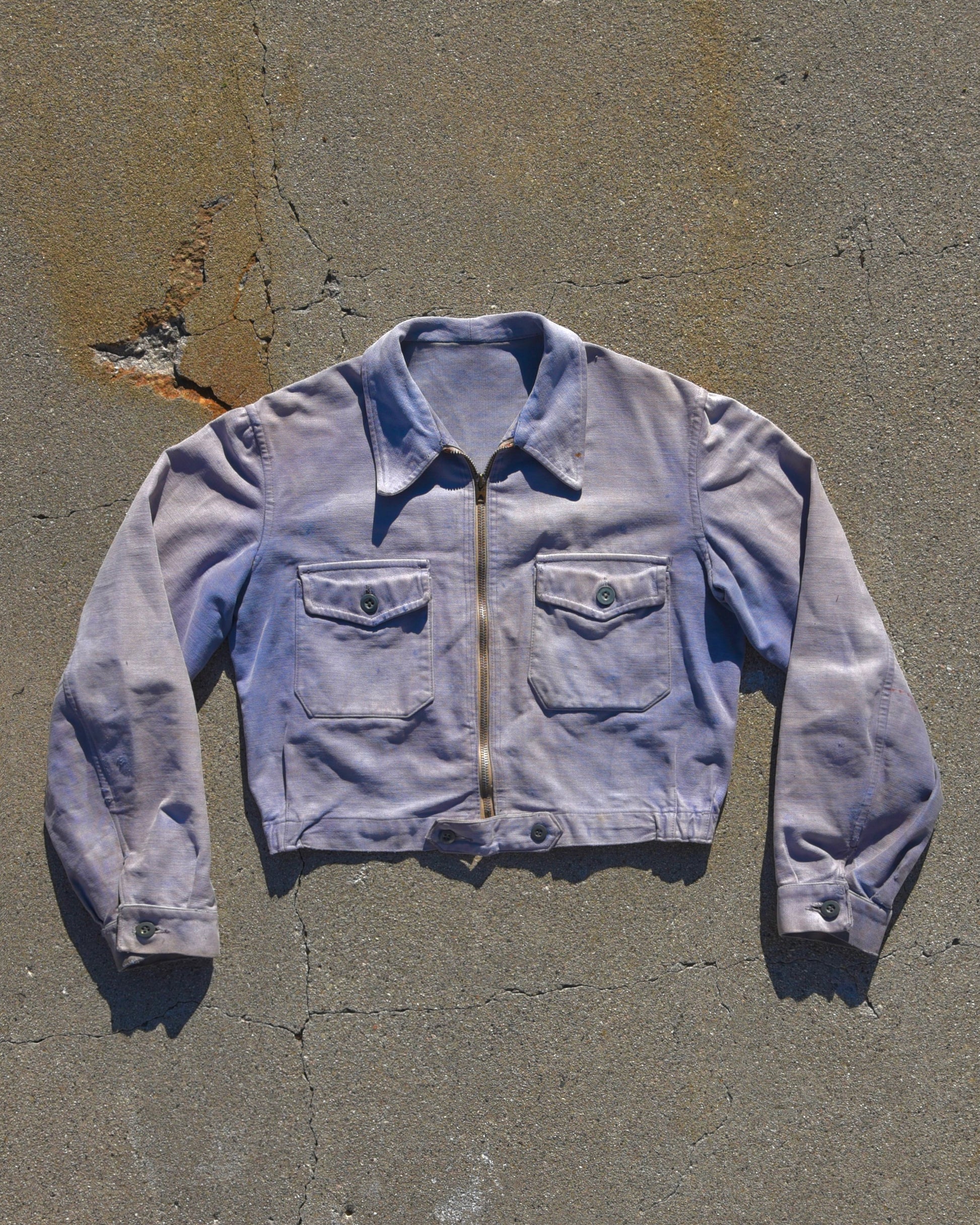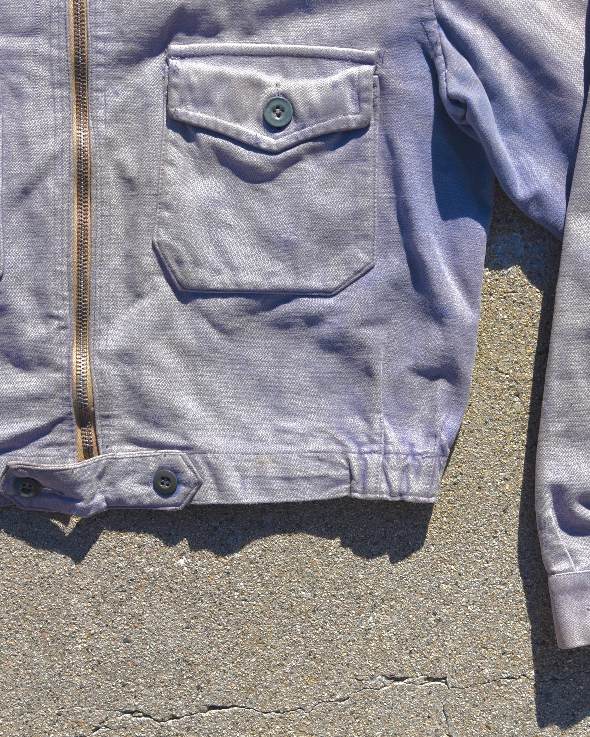 True vintage 1940s LeMont-Rouge French Cyclist Jacket. Sun faded heavily all throughout. Shades of purple, blue, and white. Fits like a very boxy small