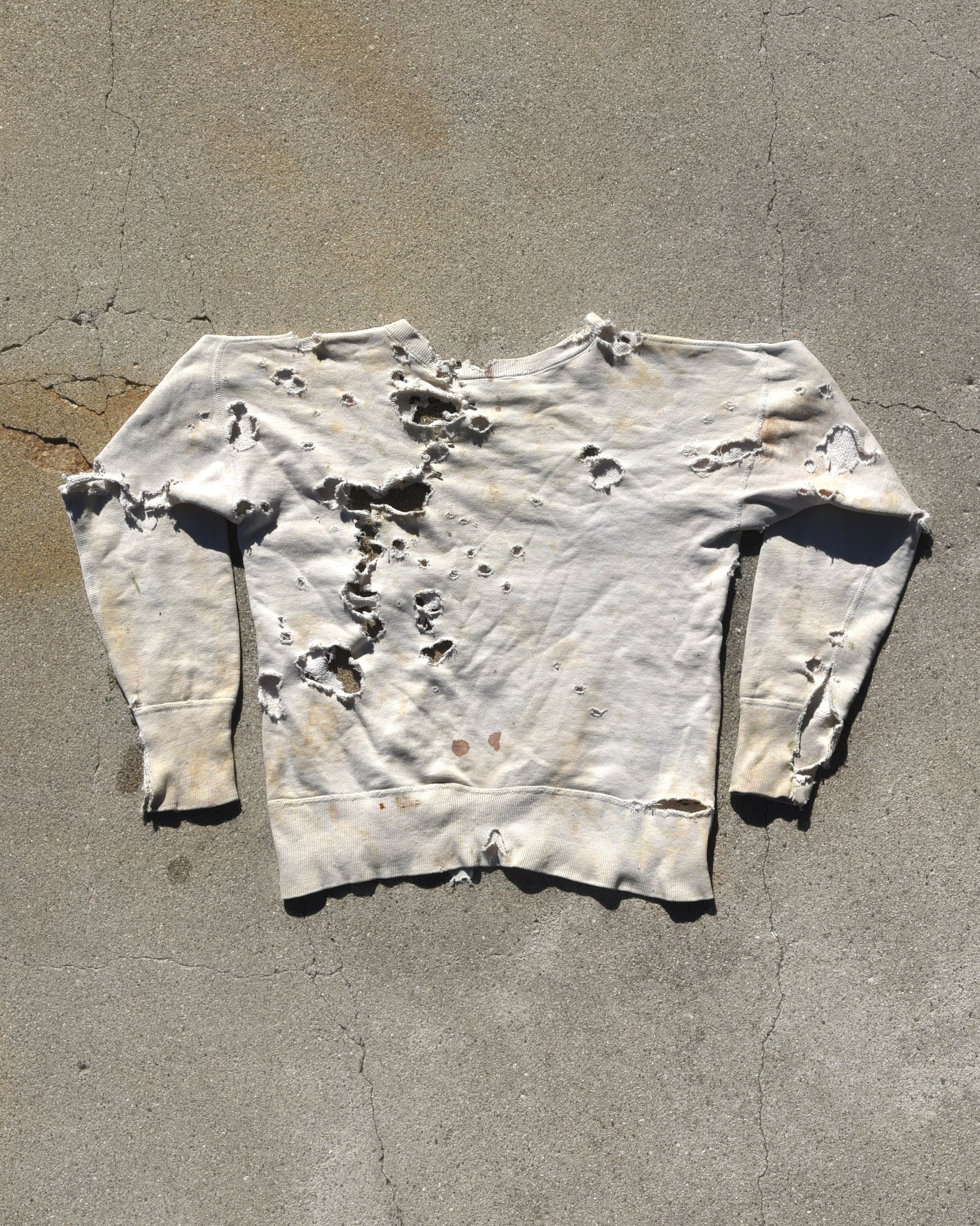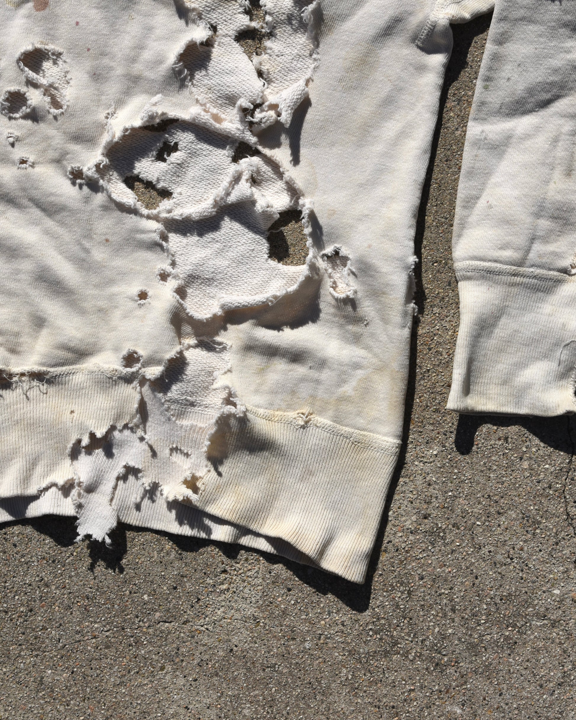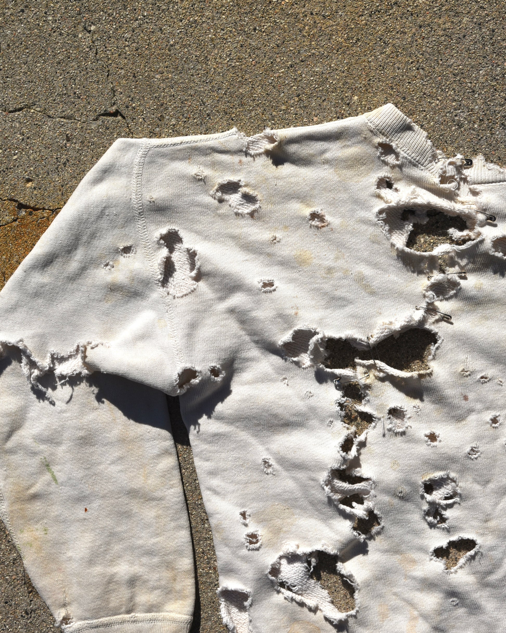 True vintage 1940s absolutely thrashed destroyed zombie single v sweatshirt. One of the most insanely distressed pieces I’ve come across. Holes all throughout, some being held together by safety pins. Definitely not for everyone. Fits like a vintage medium
