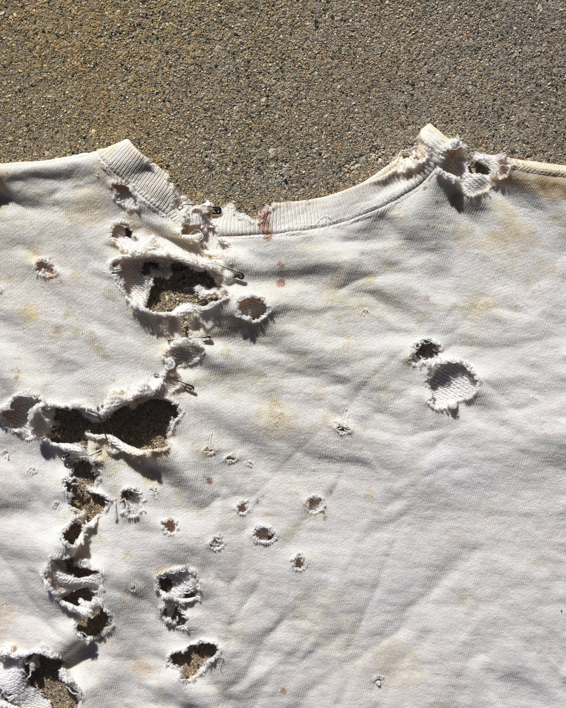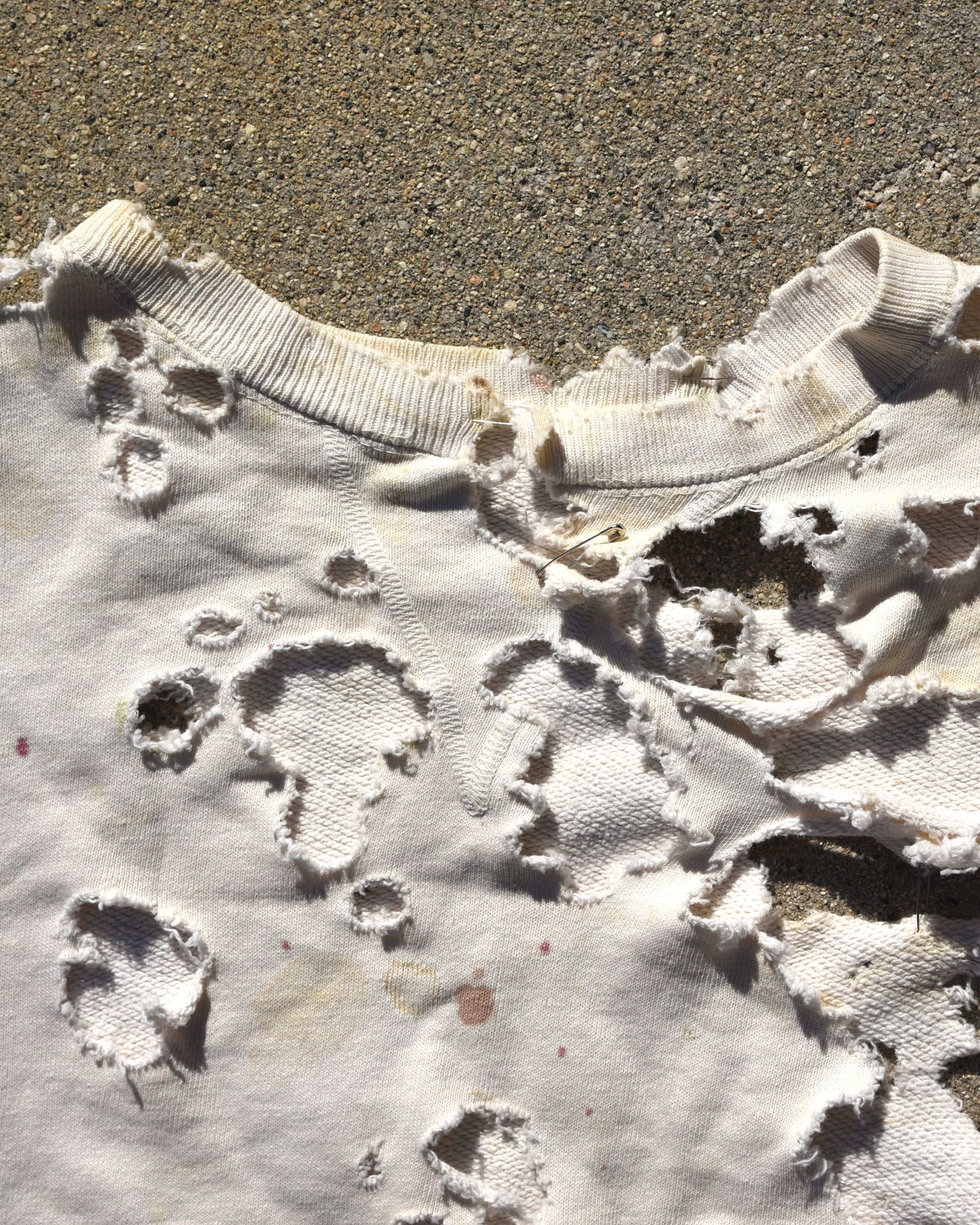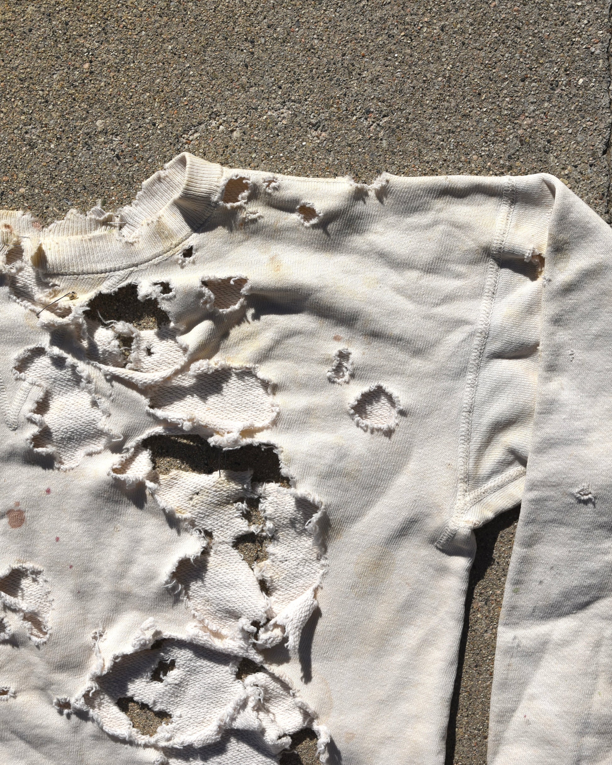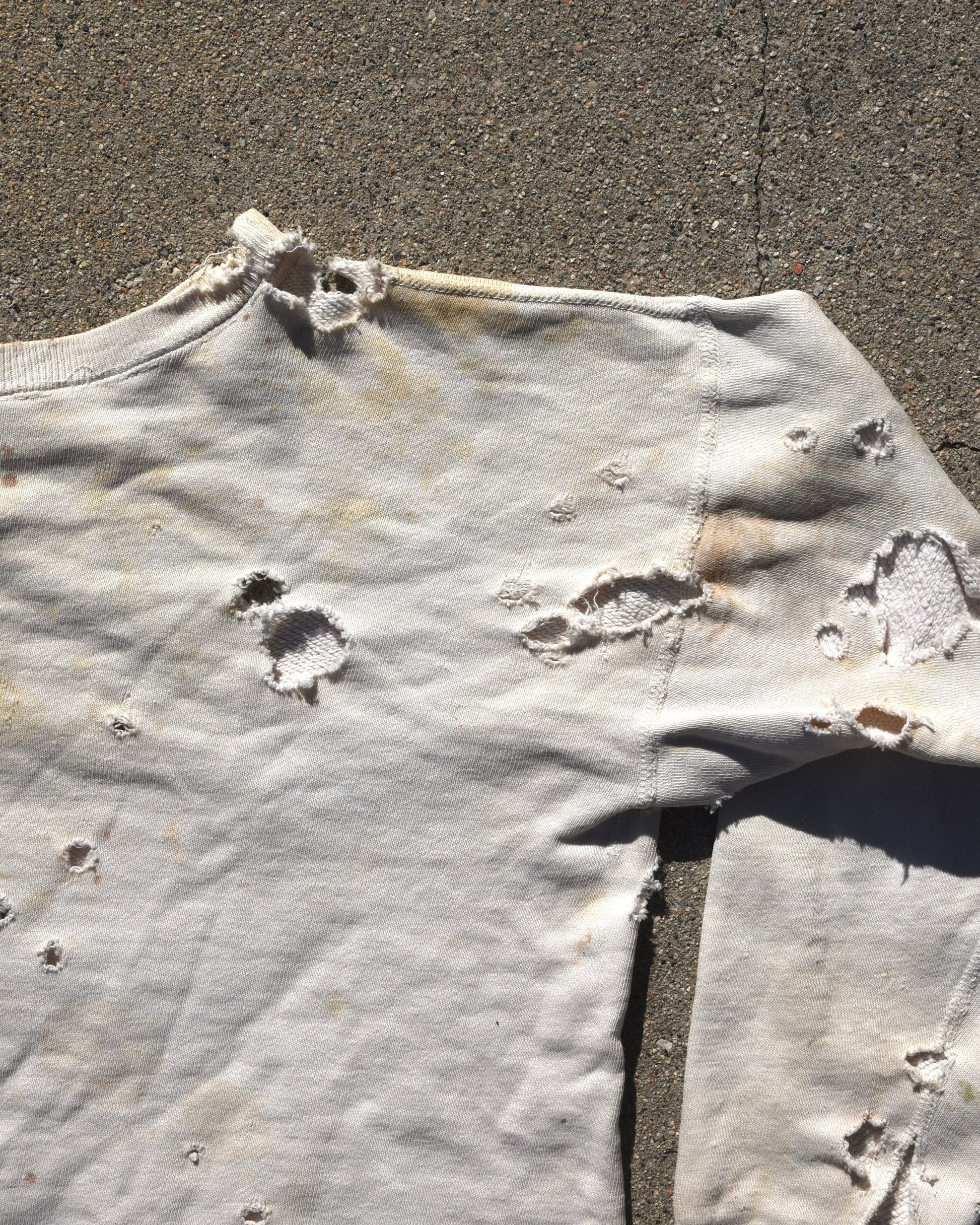True vintage 1940s absolutely thrashed destroyed zombie single v sweatshirt. One of the most insanely distressed pieces I’ve come across. Holes all throughout, some being held together by safety pins. Definitely not for everyone. Fits like a vintage medium