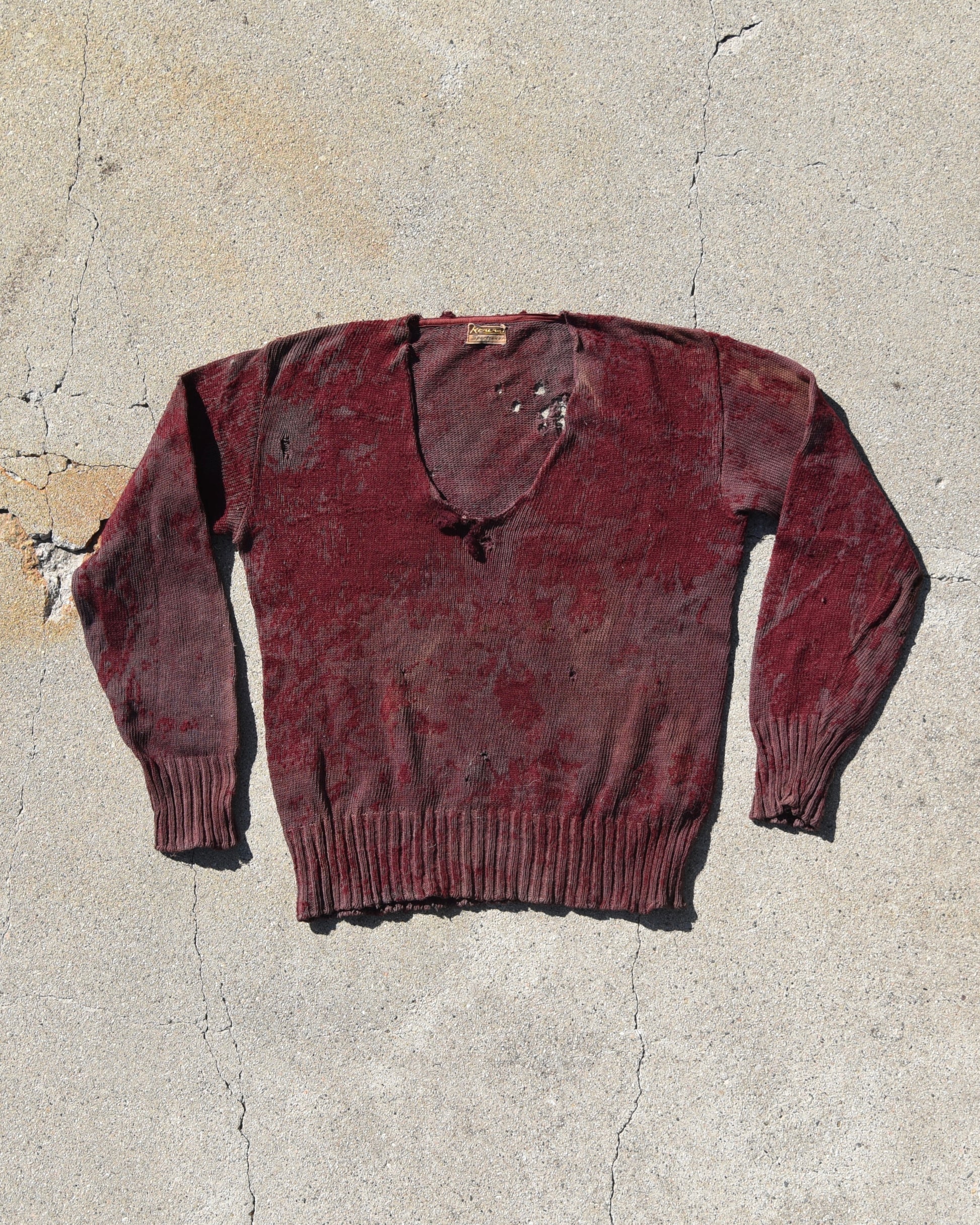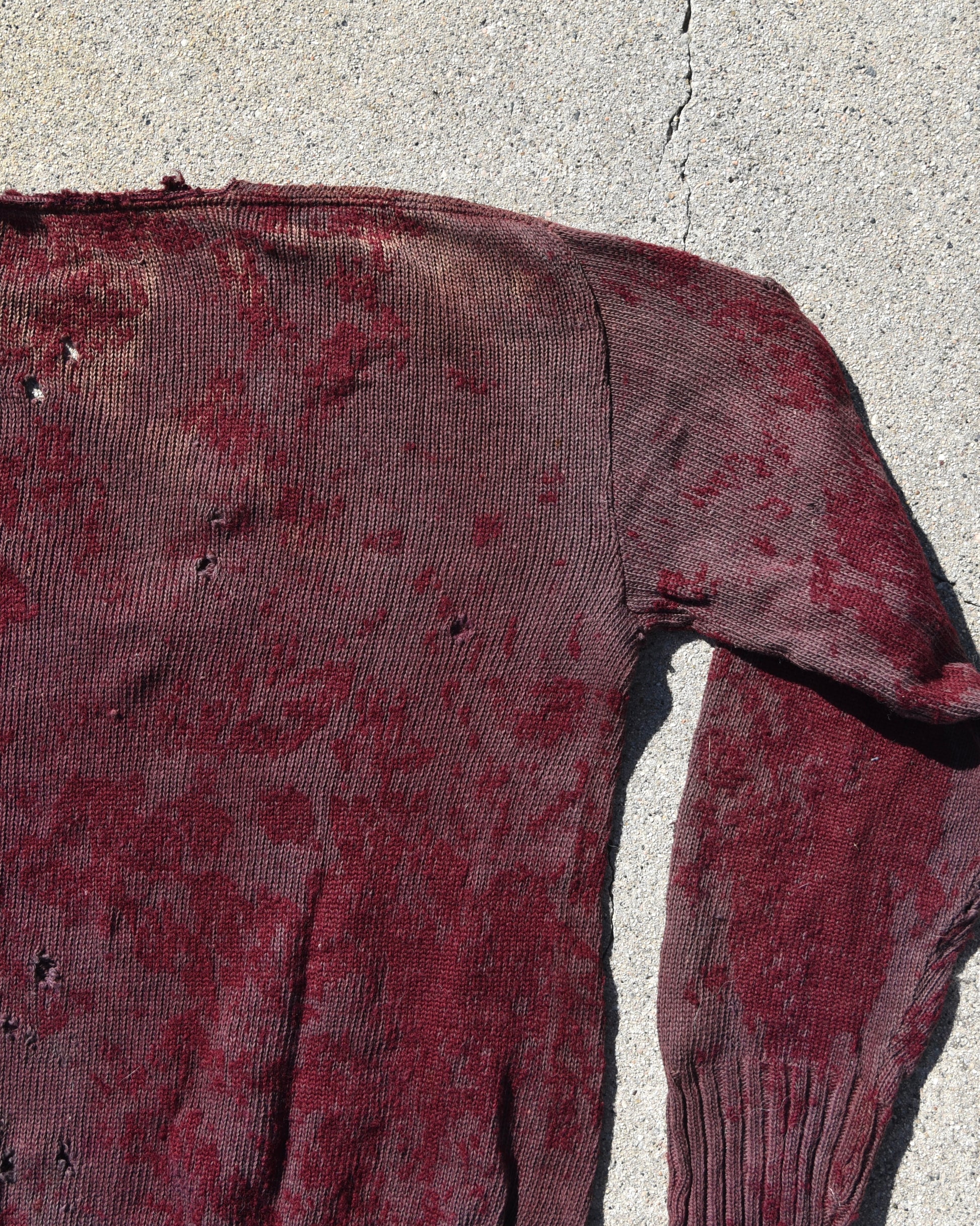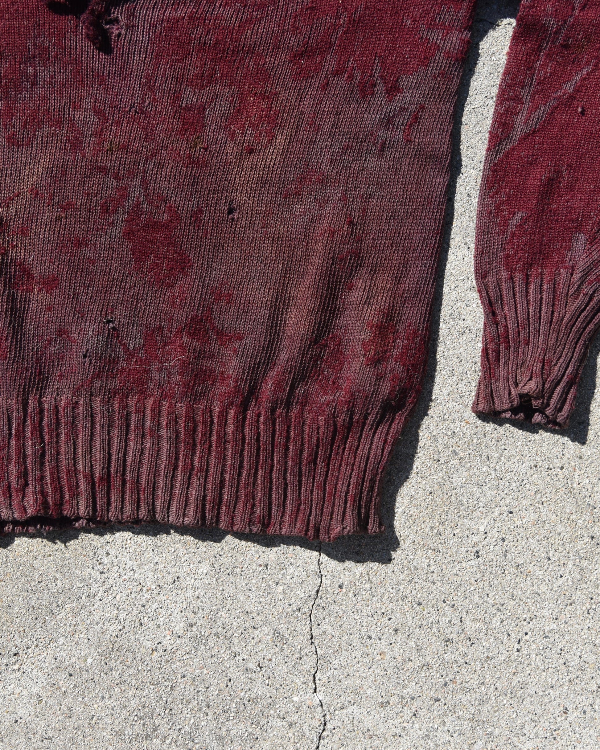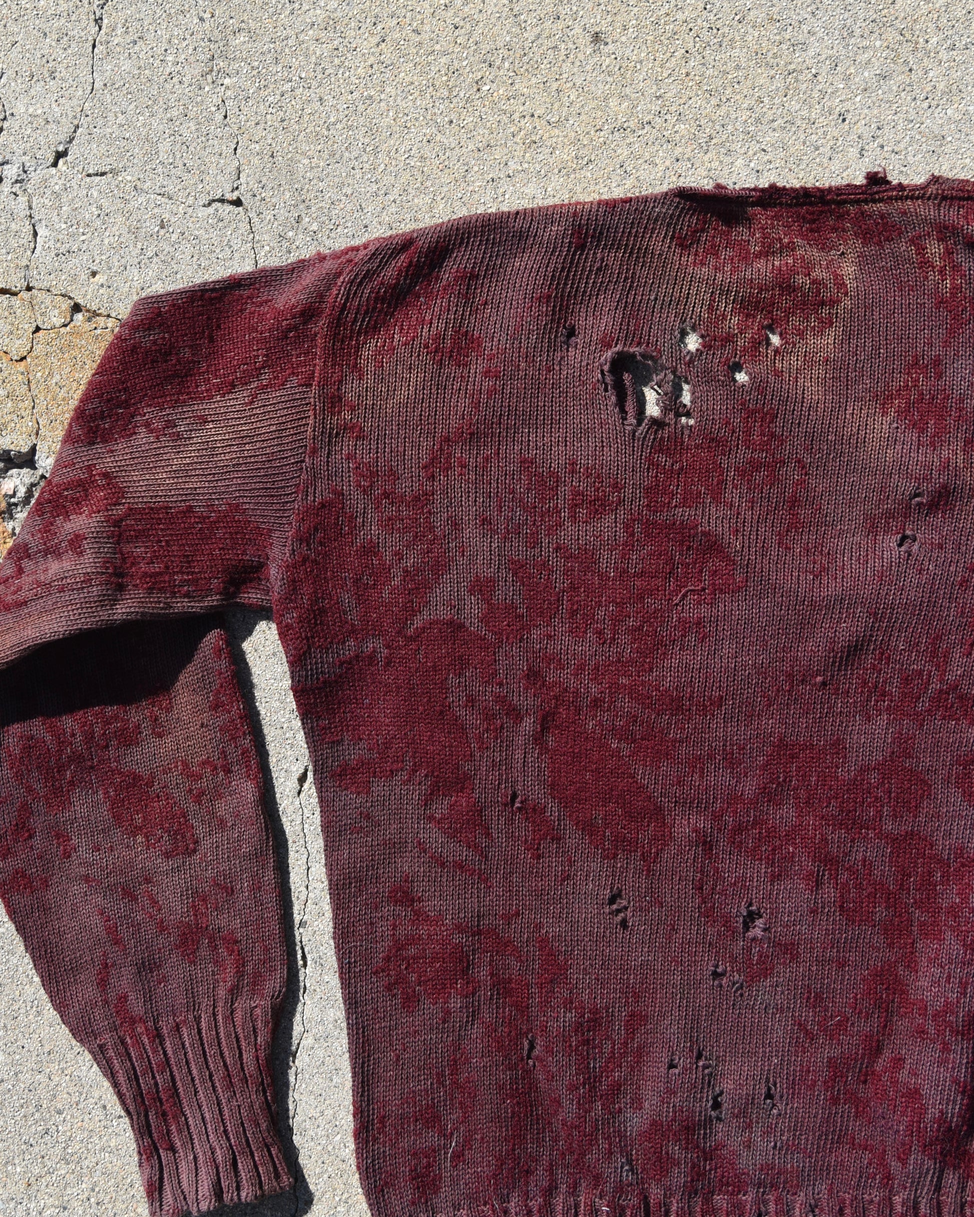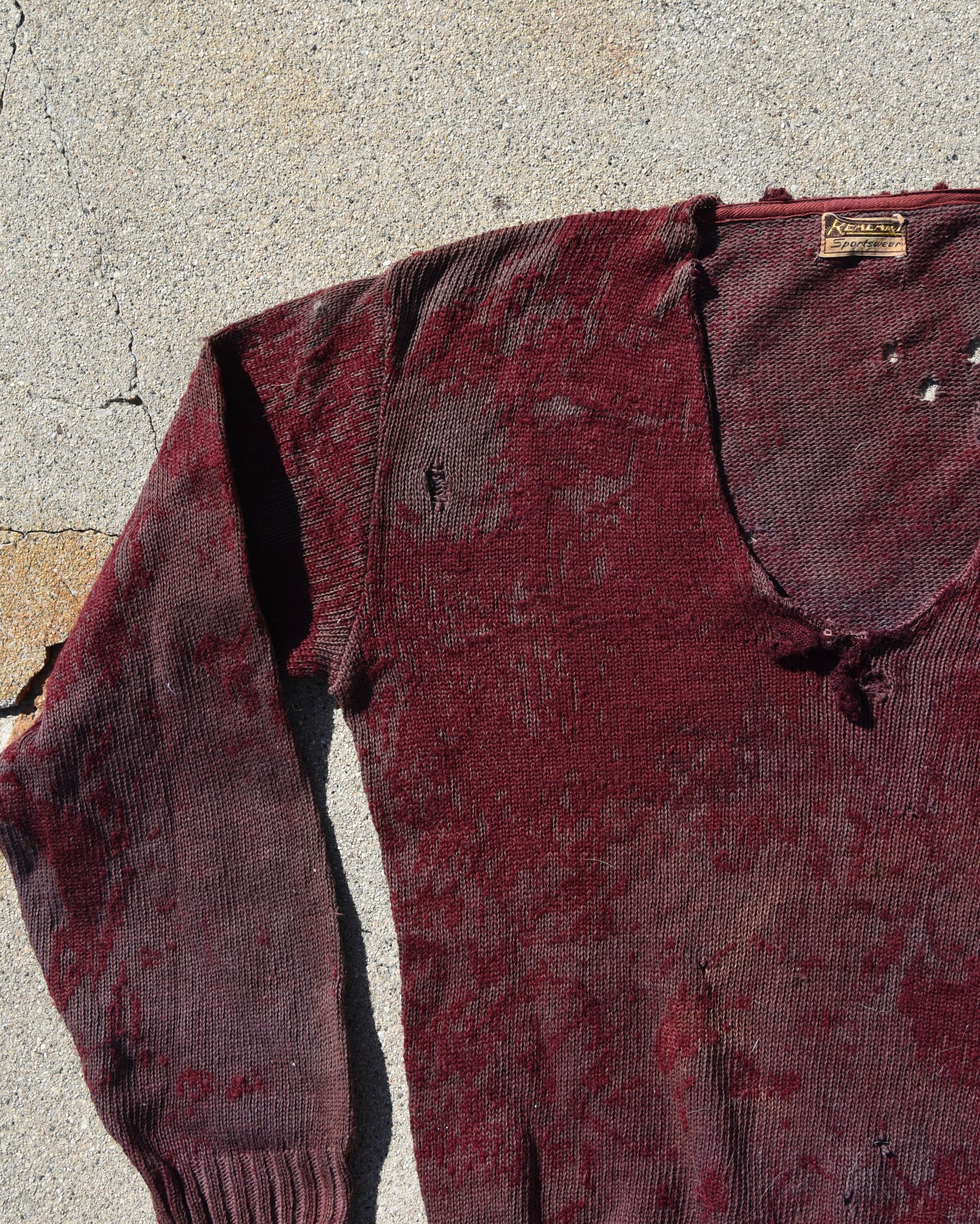 True vintage 1940s wool sweatshirt. Heavily worn from years of use. Unique red marbled pattern throughout. Fits like a medium