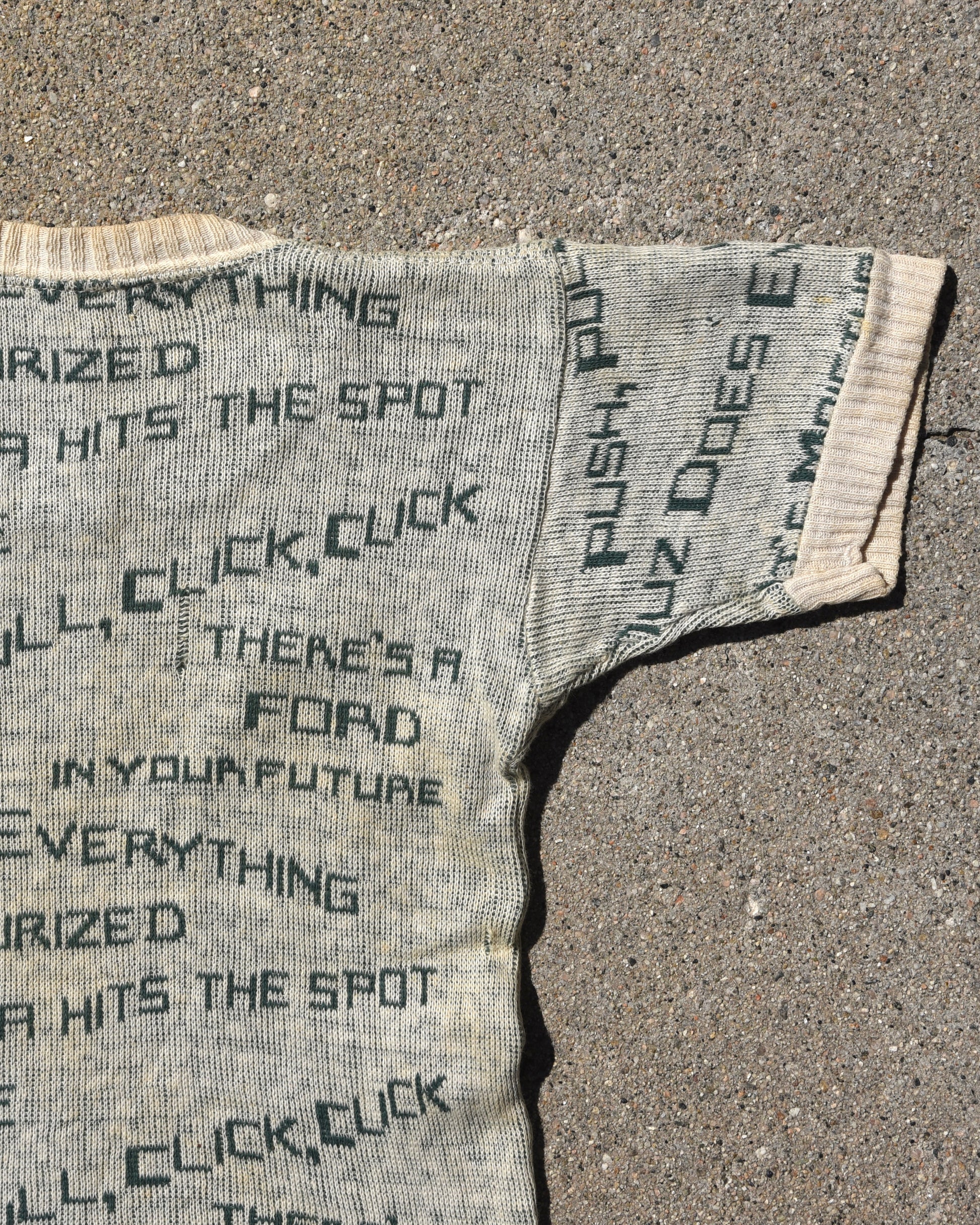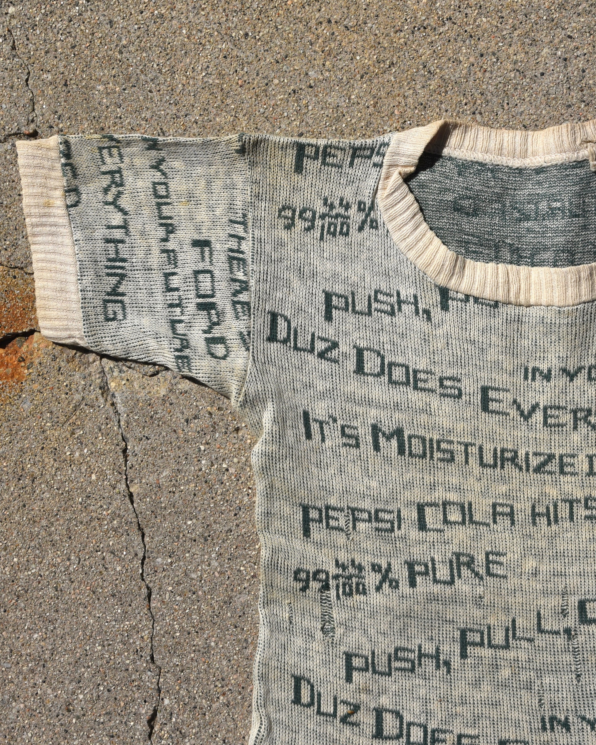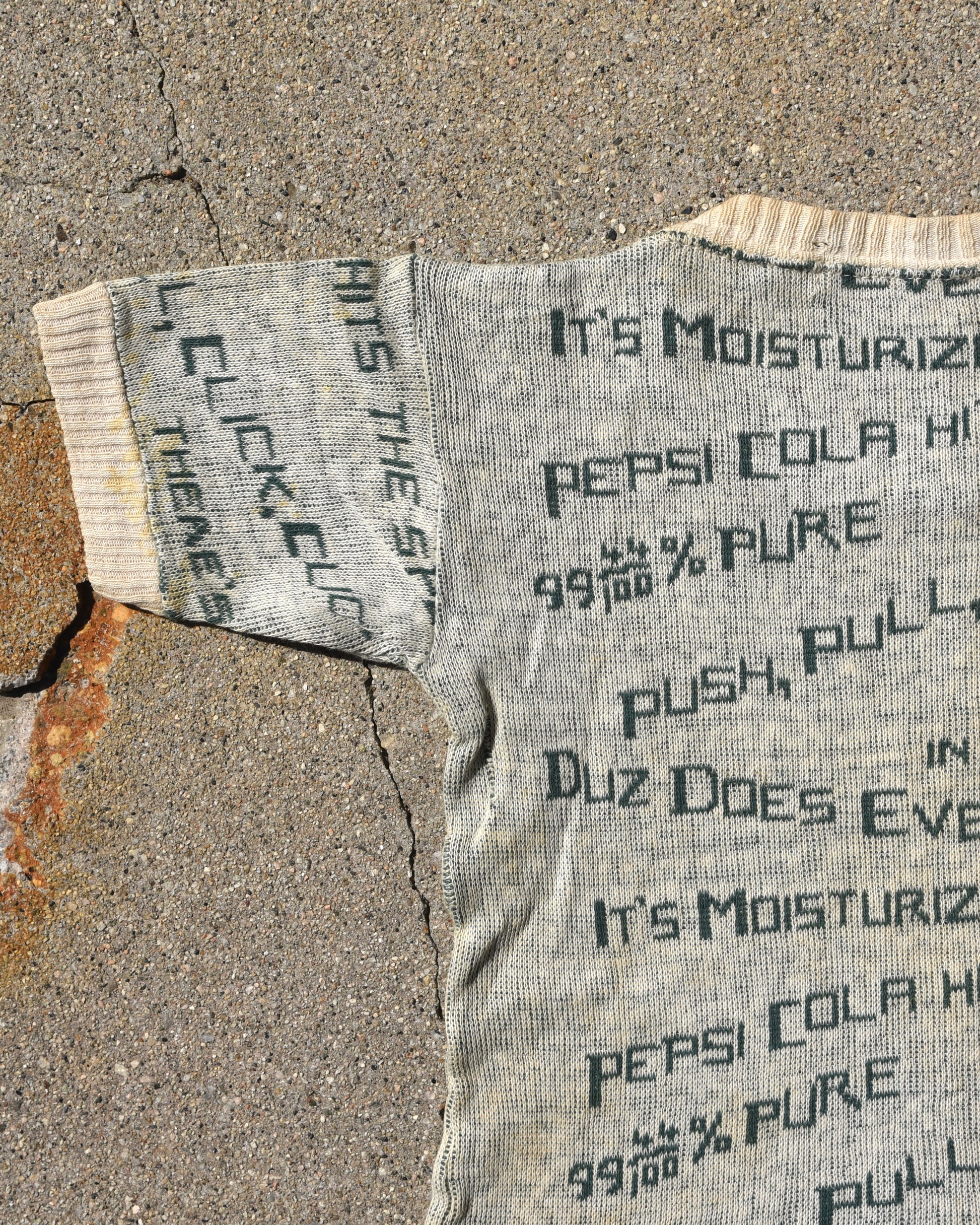 True vintage 1950s Advertisement Knit Tshirt. Very unique piece with a bunch of different ad slogans from different brands from back in the day. Ribbed knit material with quite a lot of stretch. Fits like a women’s xxs