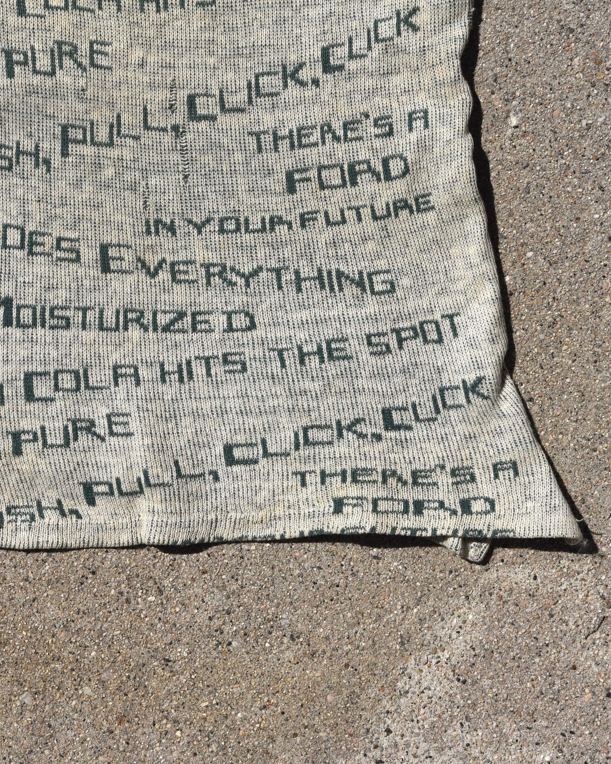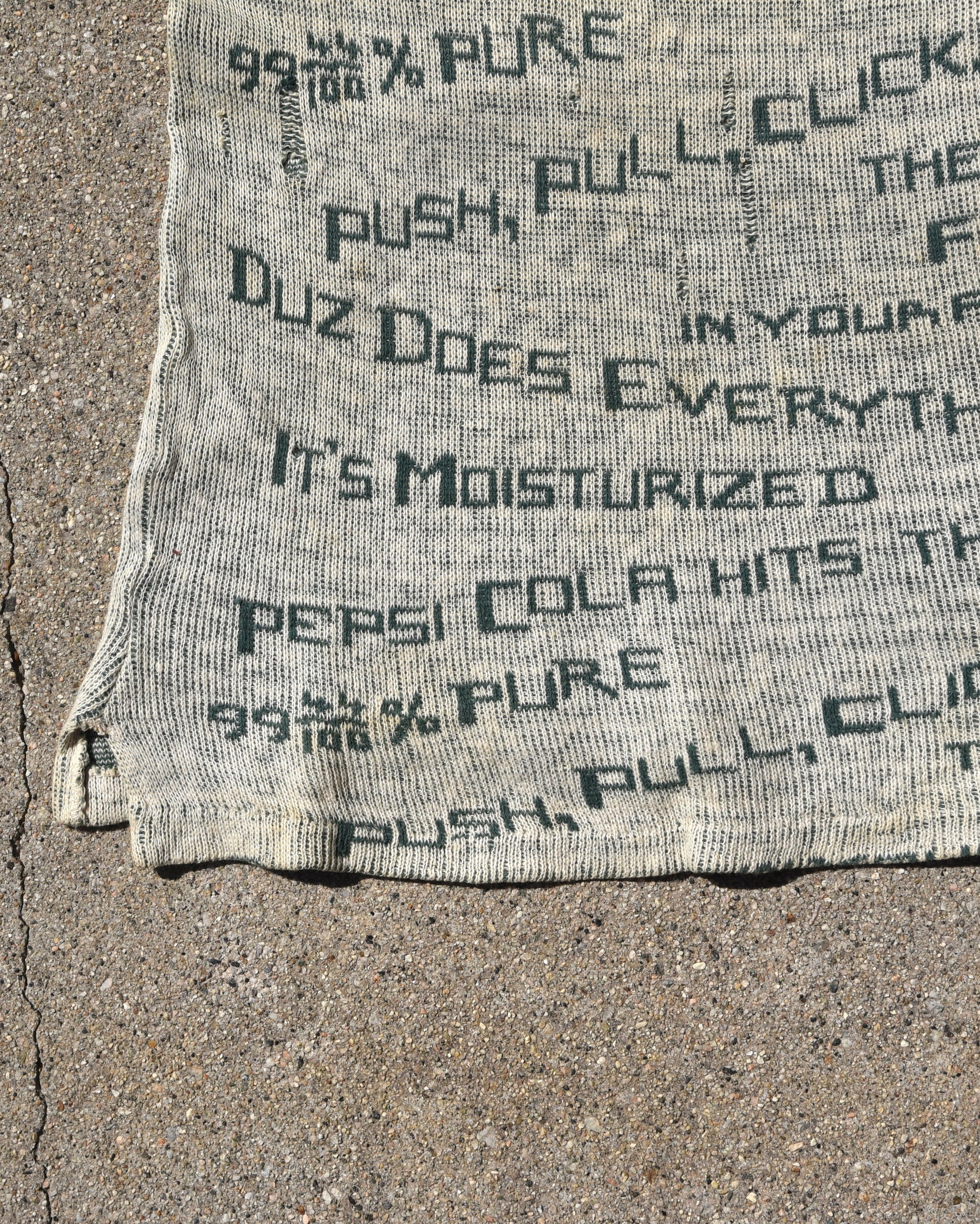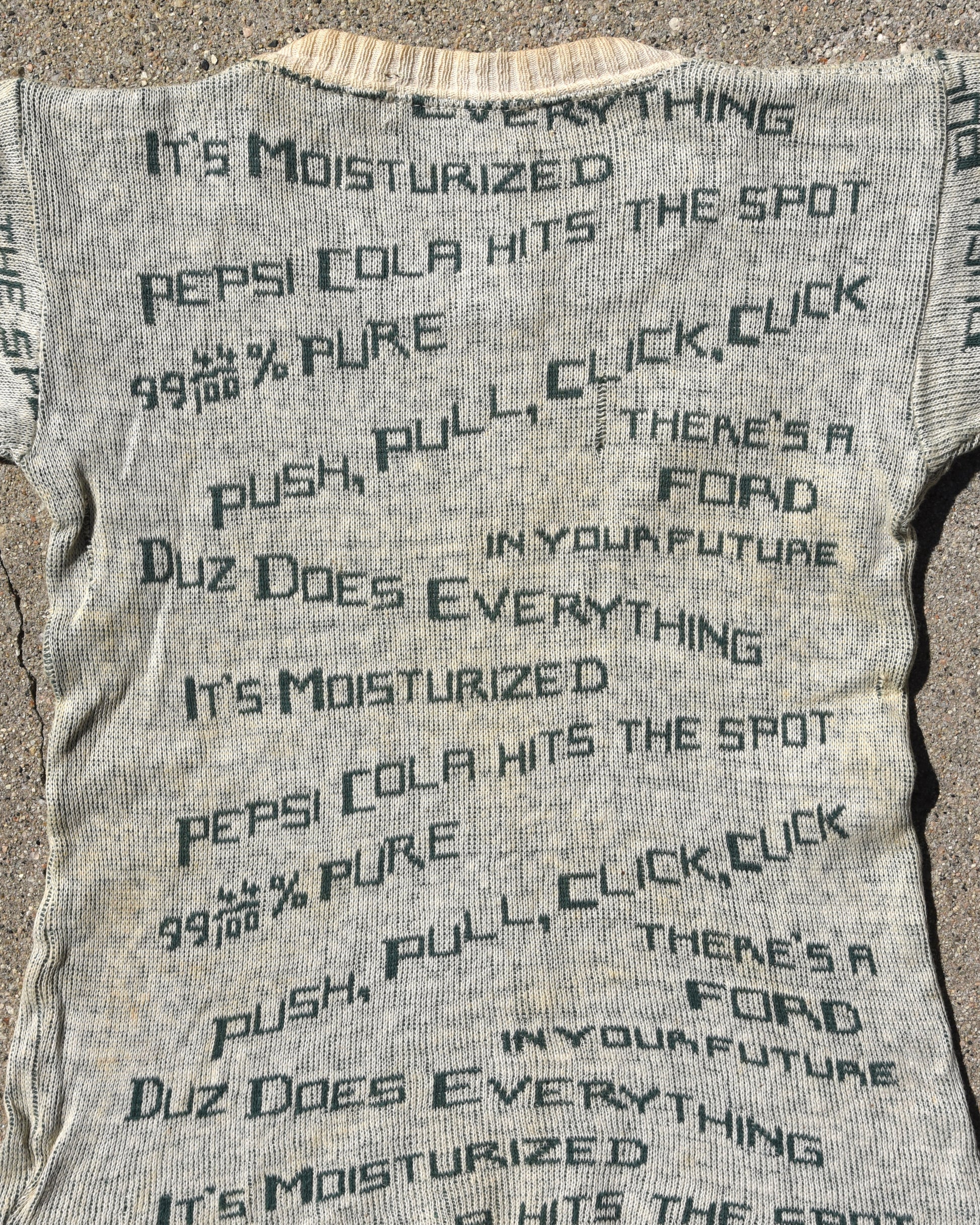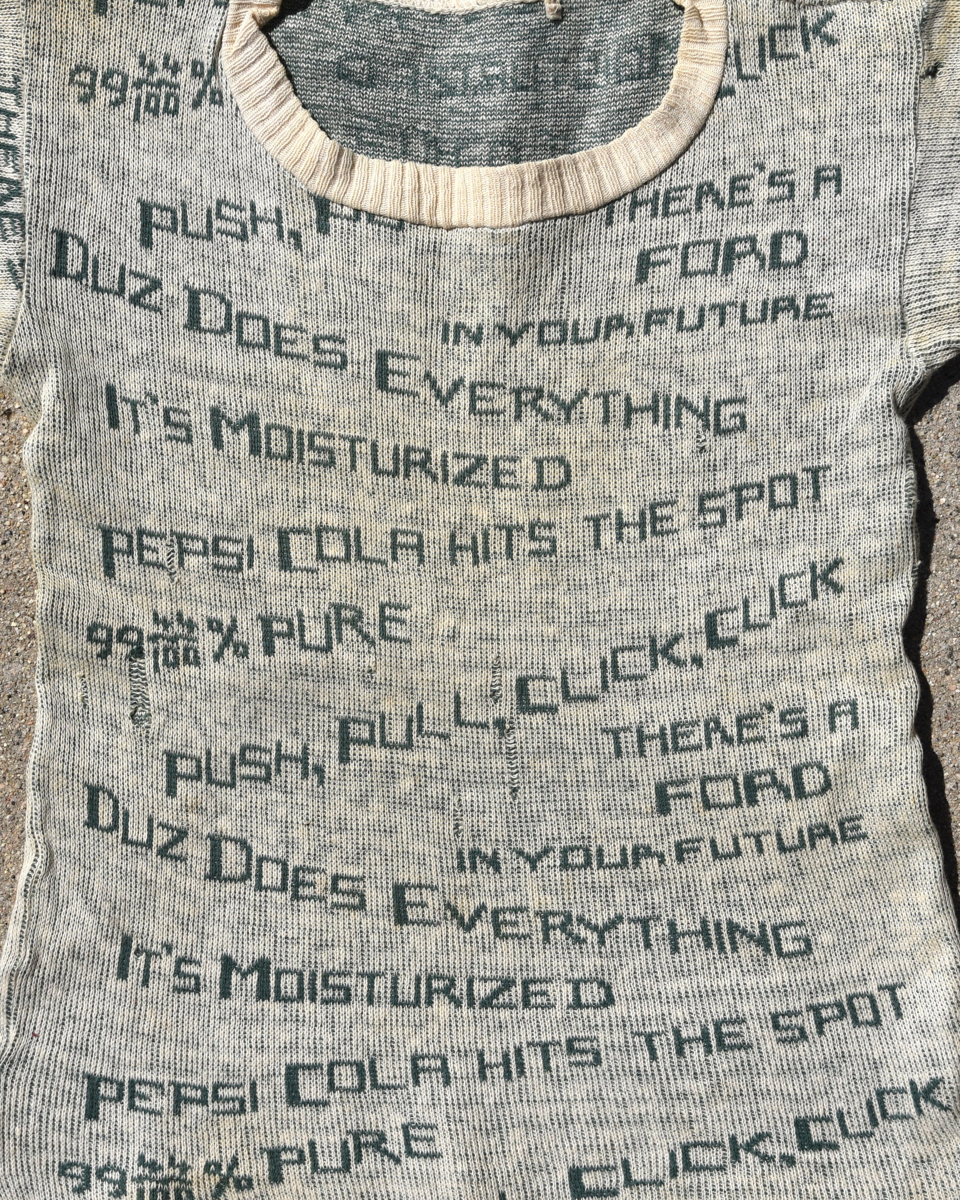 True vintage 1950s Advertisement Knit Tshirt. Very unique piece with a bunch of different ad slogans from different brands from back in the day. Ribbed knit material with quite a lot of stretch. Fits like a women’s xxs