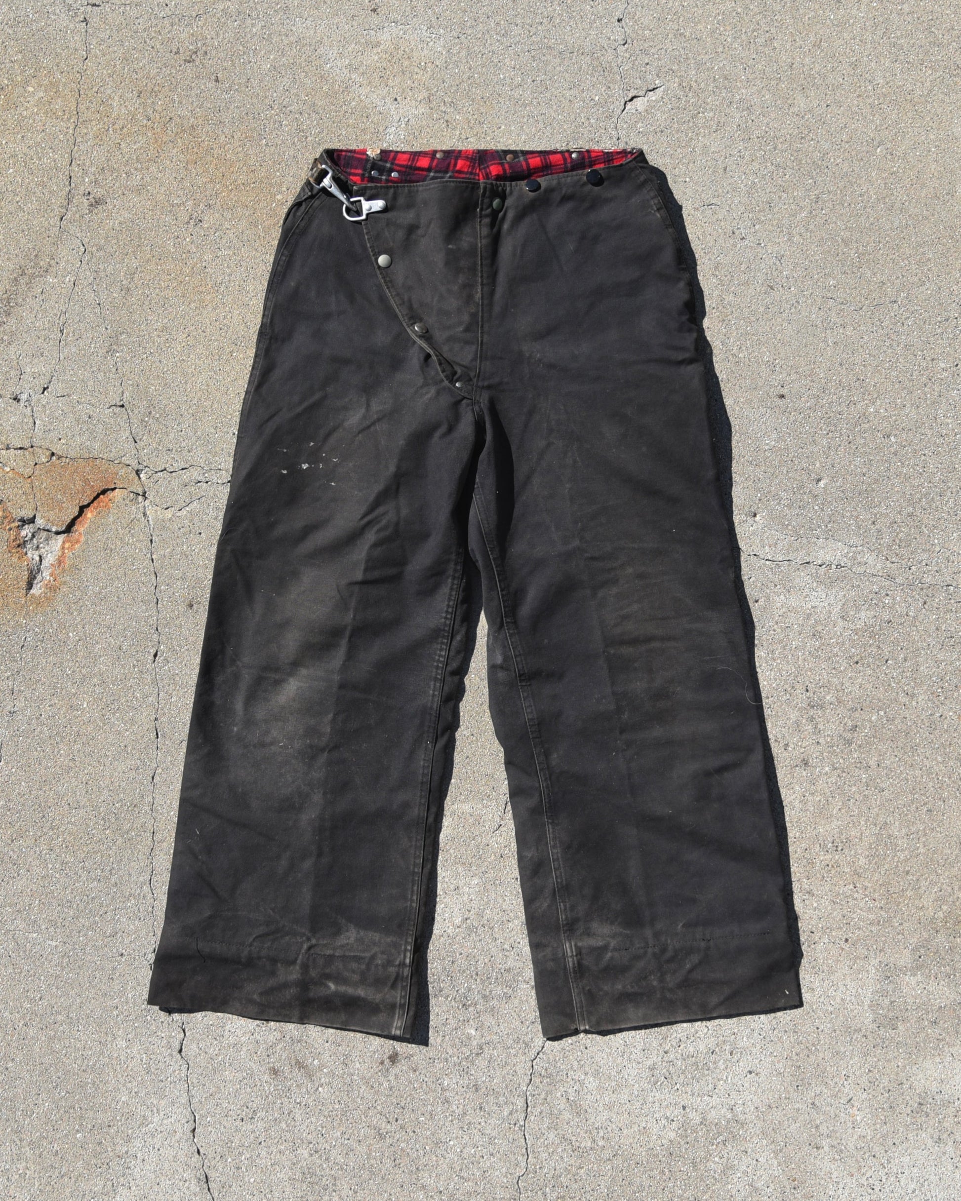 True vintage 1950s American LaFrance Canvas Fireman Trousers. Fireman clasp closure, red flannel lined inside. On body pic included at the end, I’m 6’0” and wearing heeled cowboy boots for reference