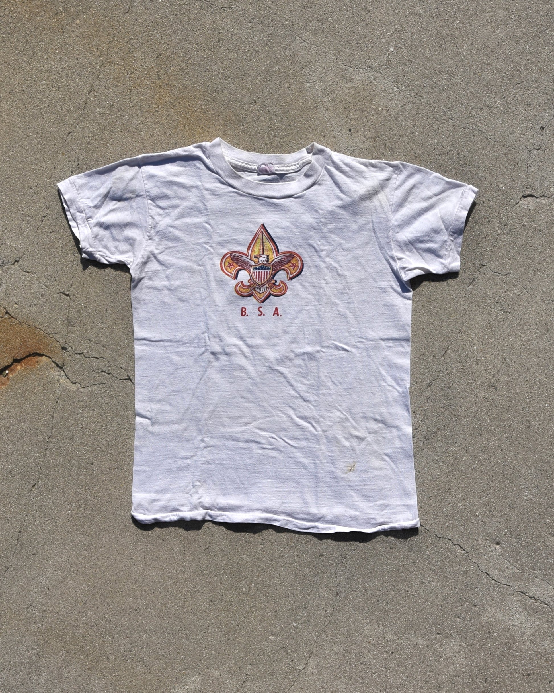 1950s Boy Scouts of America Tshirt. Some signs of wear but pretty good considering its age. Single stitch. Fits like a small Measurements: P2P Width 17” Length 22.5” |