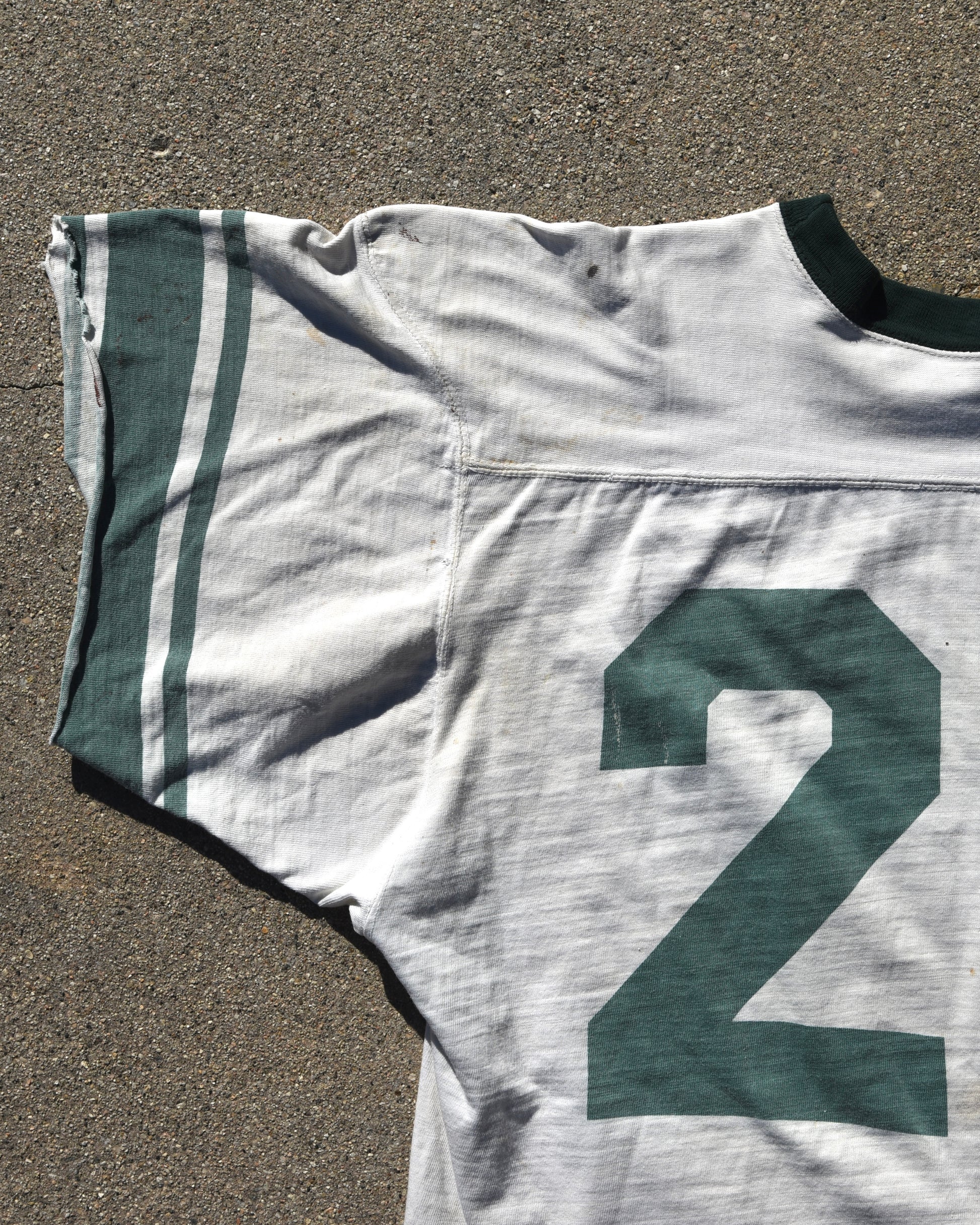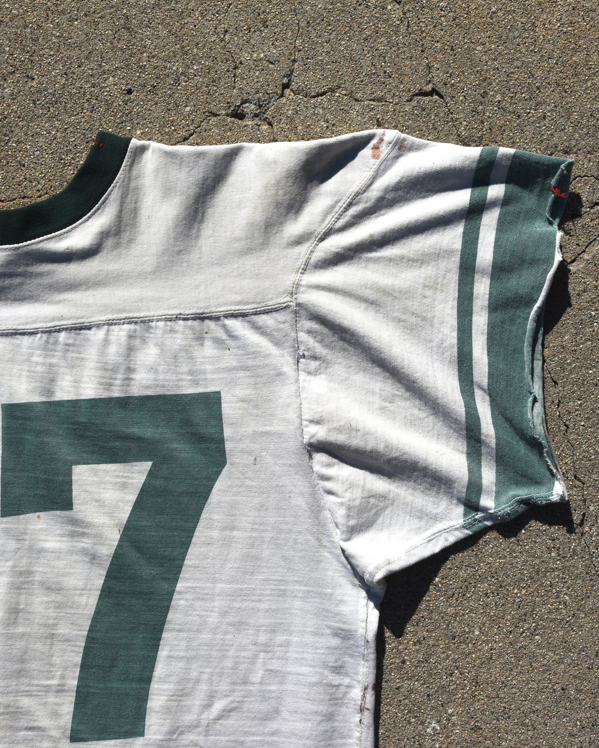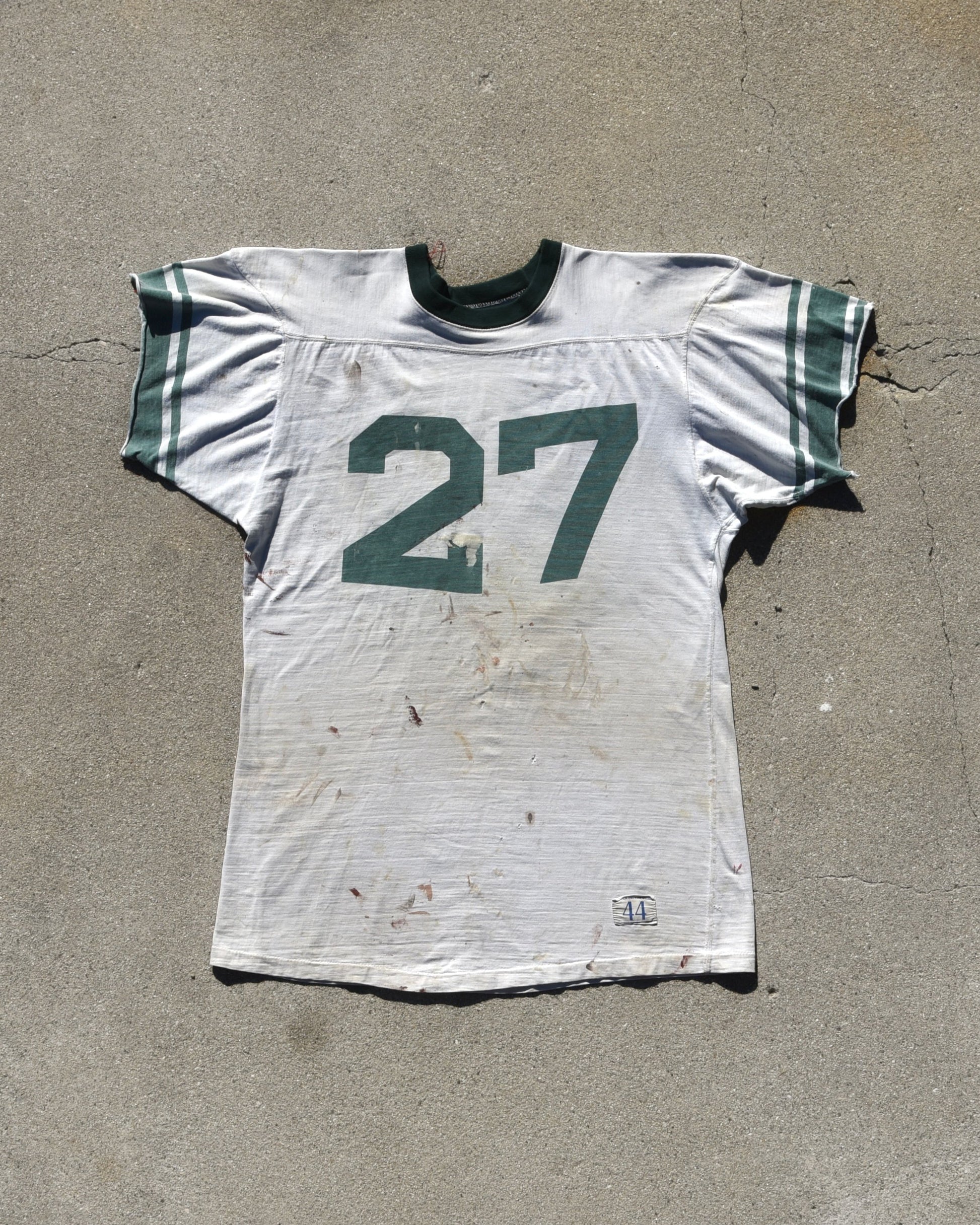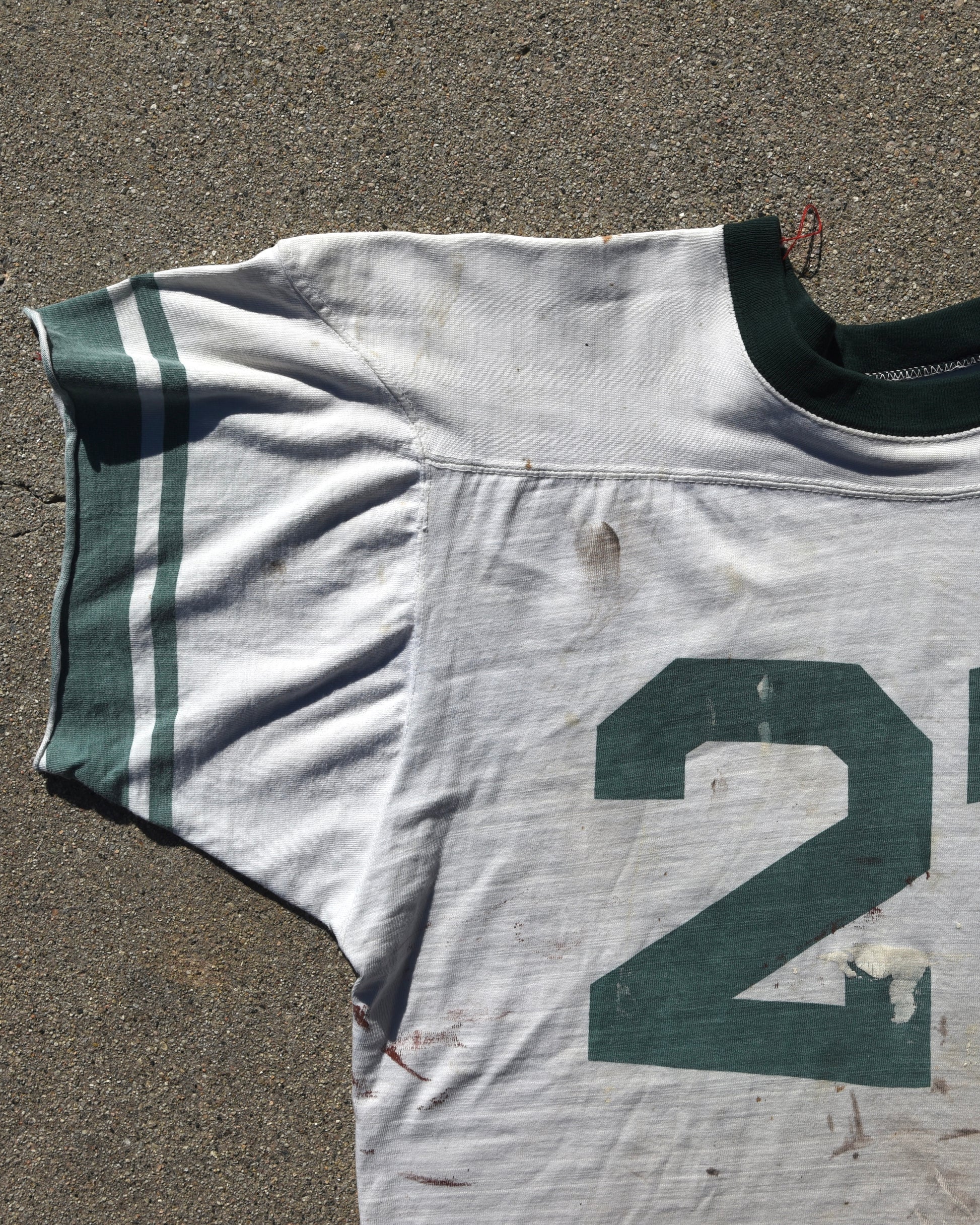 True Vintage 1950s Champion Cotton Football Jersey. Water print numbers. Sleeves have been cut. Worn heavily with marks all throughout which I feel add to the look. Has small repairs done over the years throughout. Size 44, fits like a large