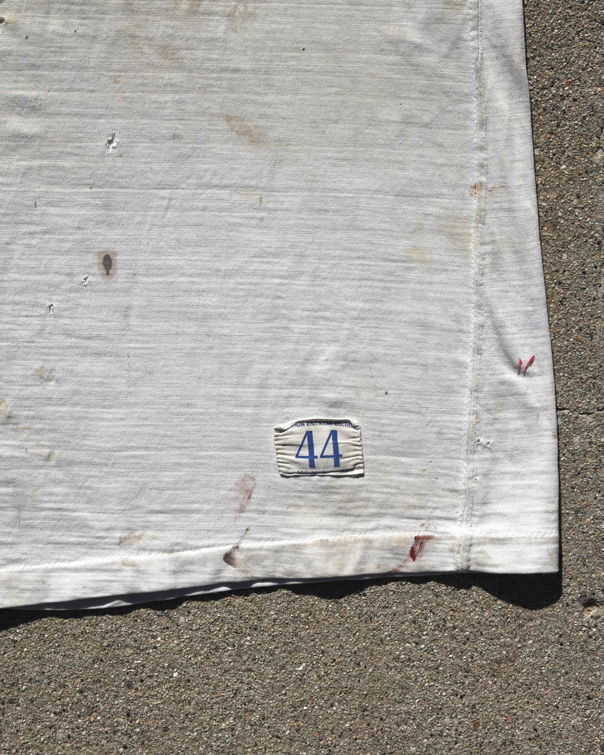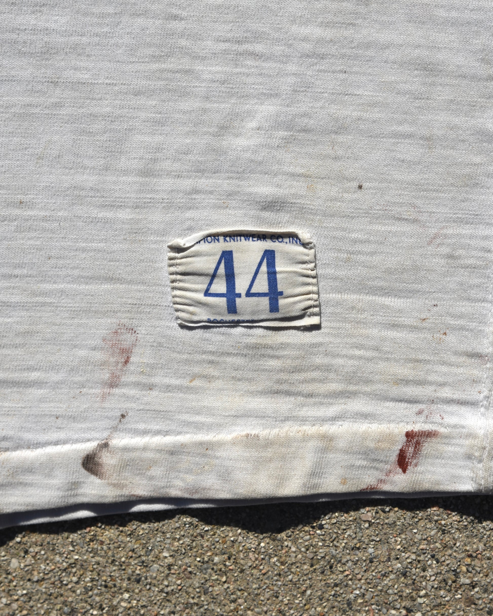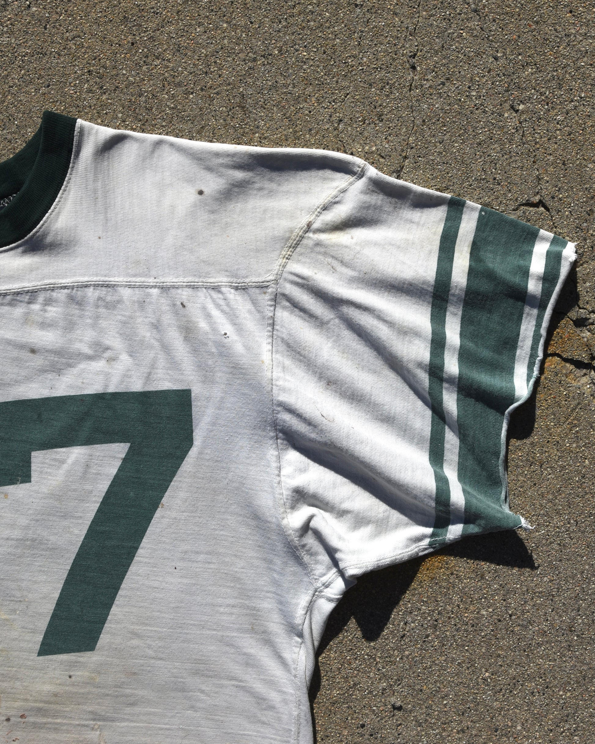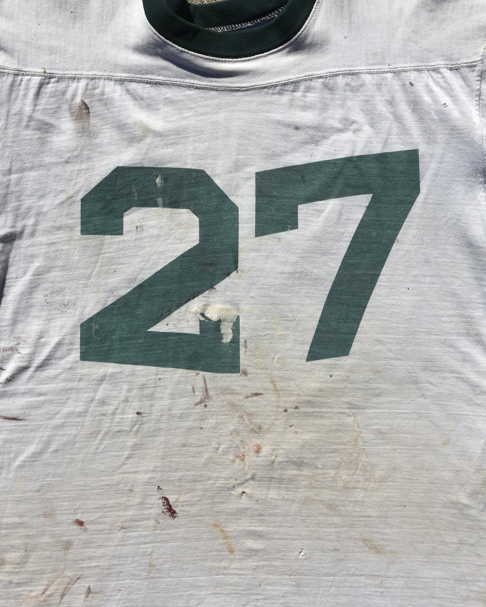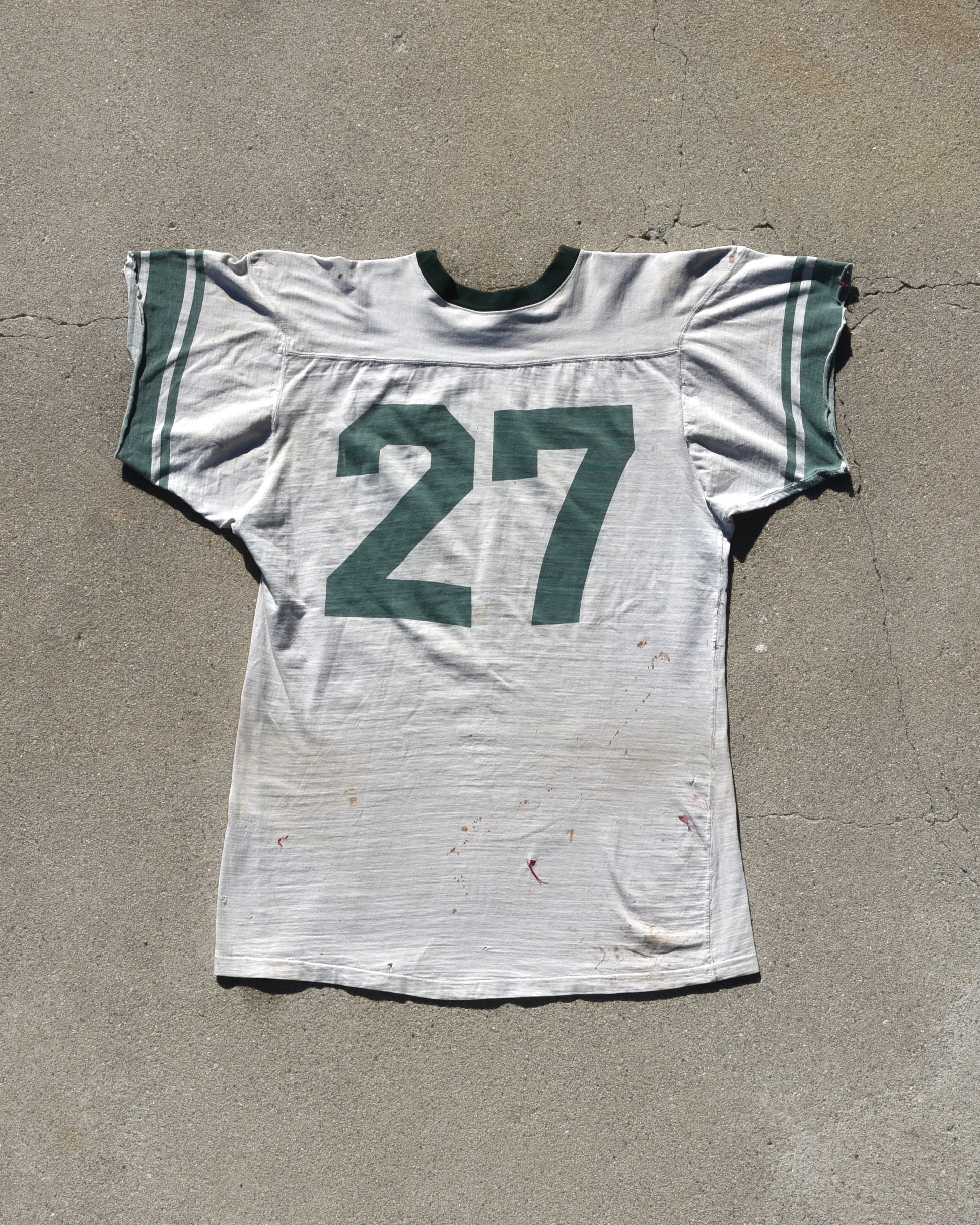 True Vintage 1950s Champion Cotton Football Jersey. Water print numbers. Sleeves have been cut. Worn heavily with marks all throughout which I feel add to the look. Has small repairs done over the years throughout. Size 44, fits like a large