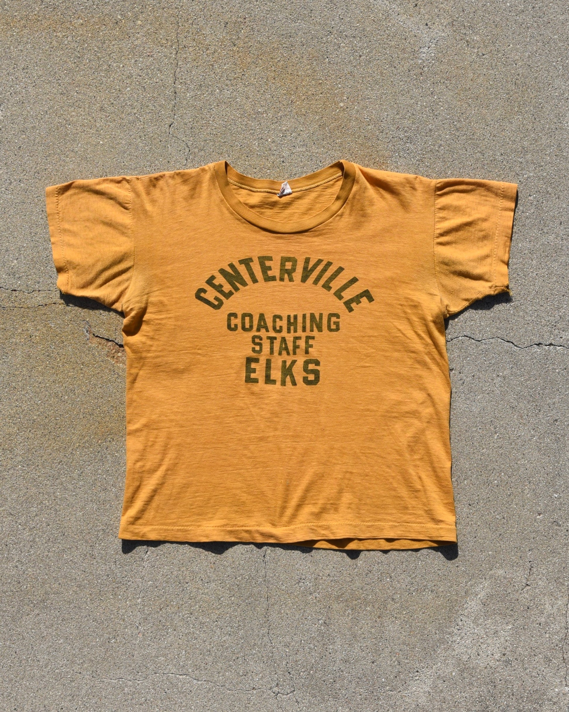 True vintage 1950s Champion Running Man Centerville Coaching Staff Elks Tshirt. In great condition for its age. Tagged size large