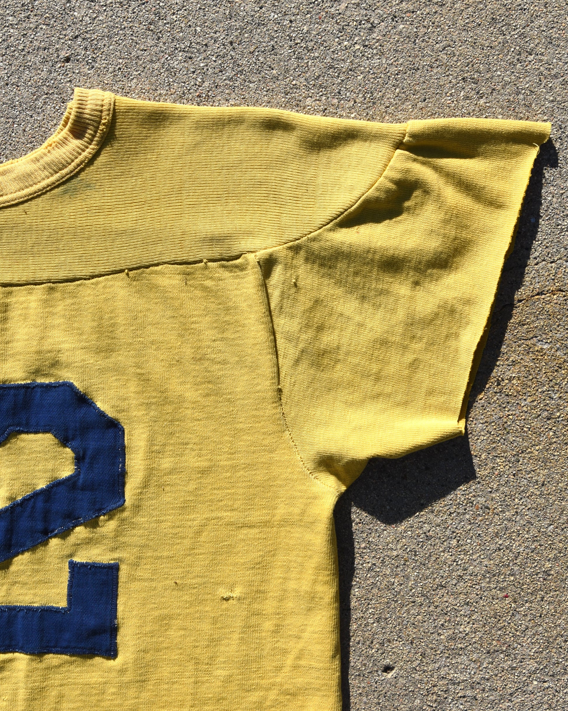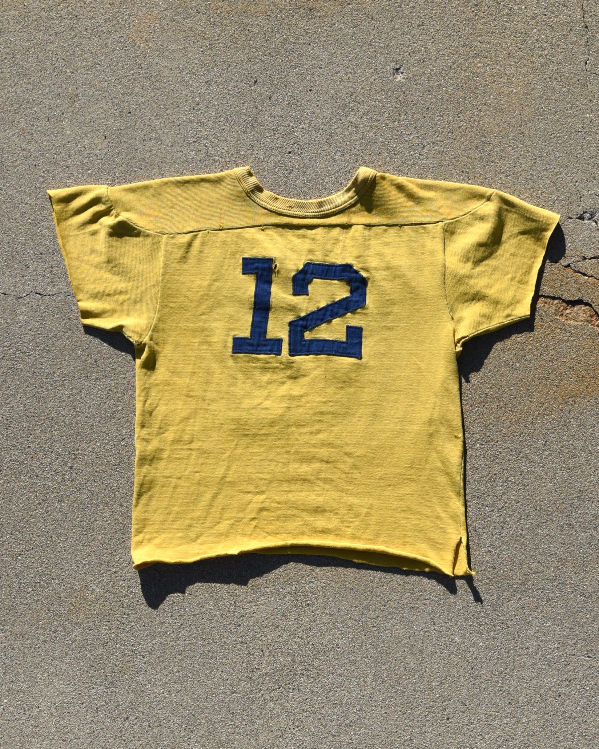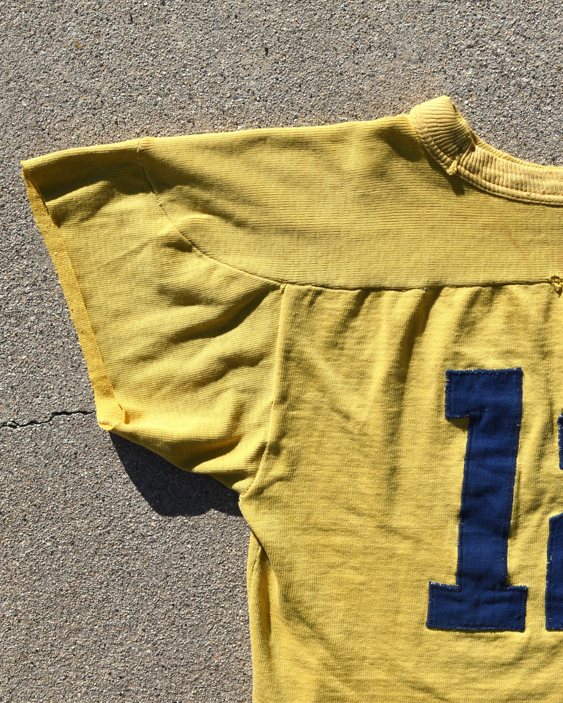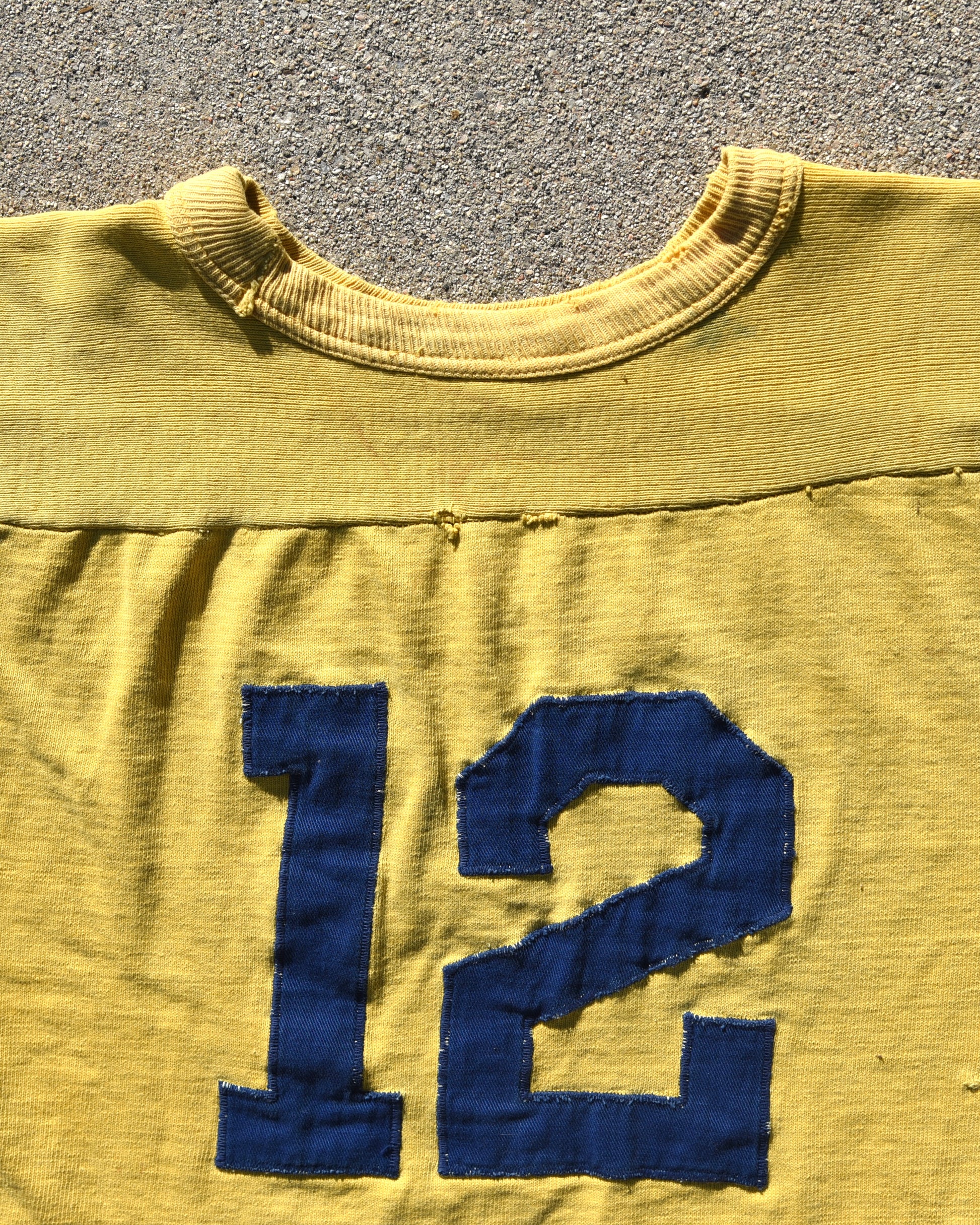 1950s Cotton Football Jersey. Chopped sleeves and hem. Signs of wear from age all throughout. No tag, fits like a boxy medium
