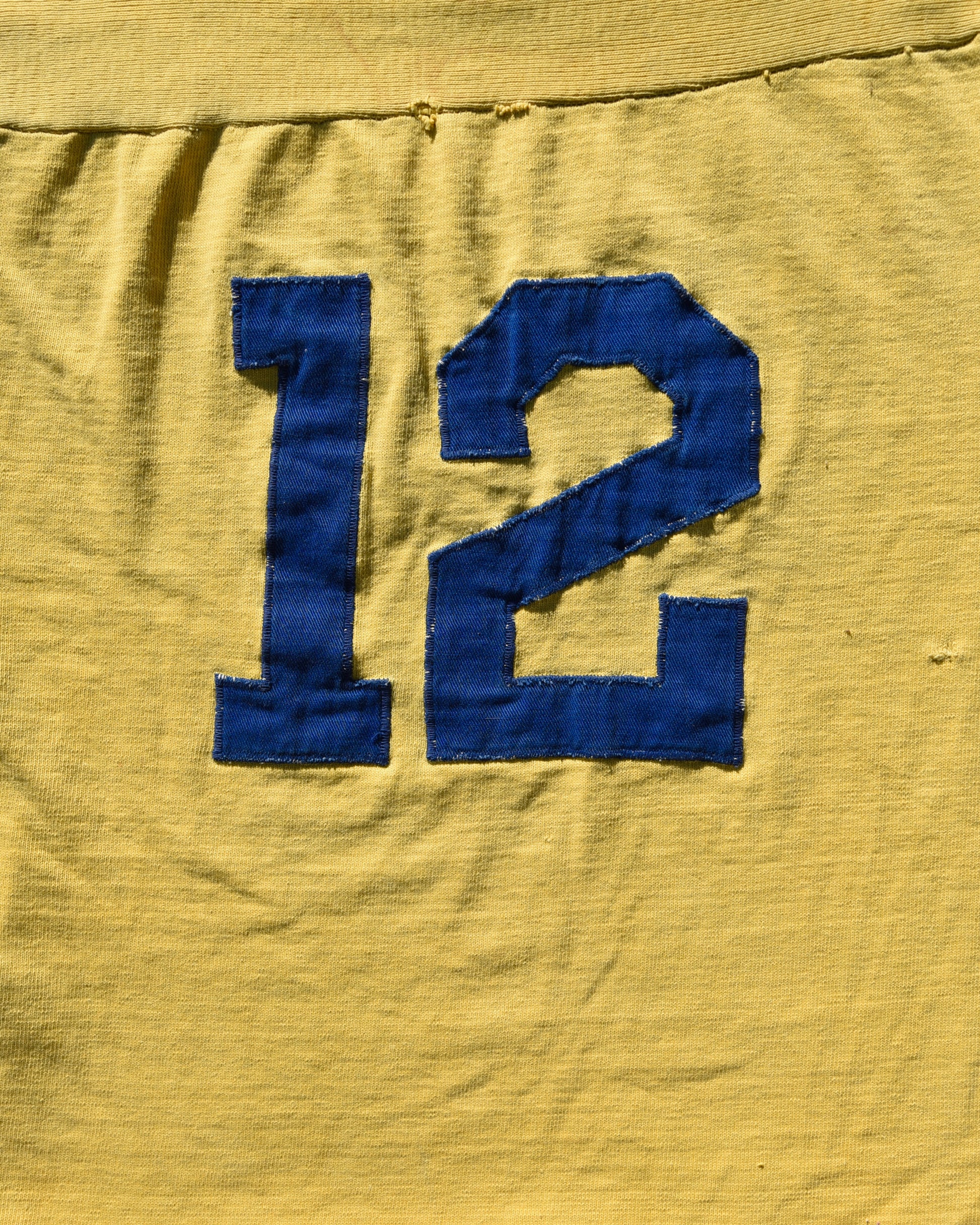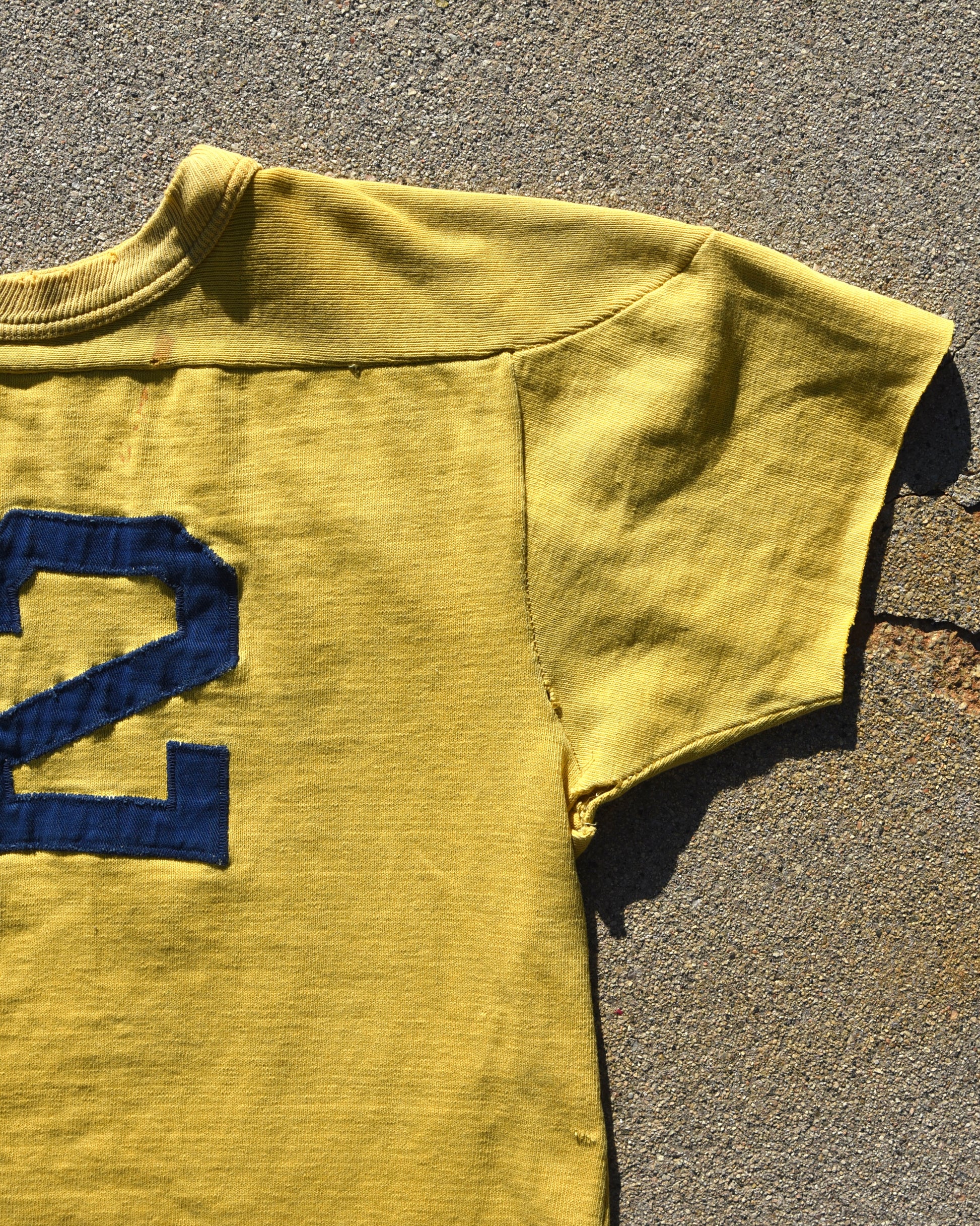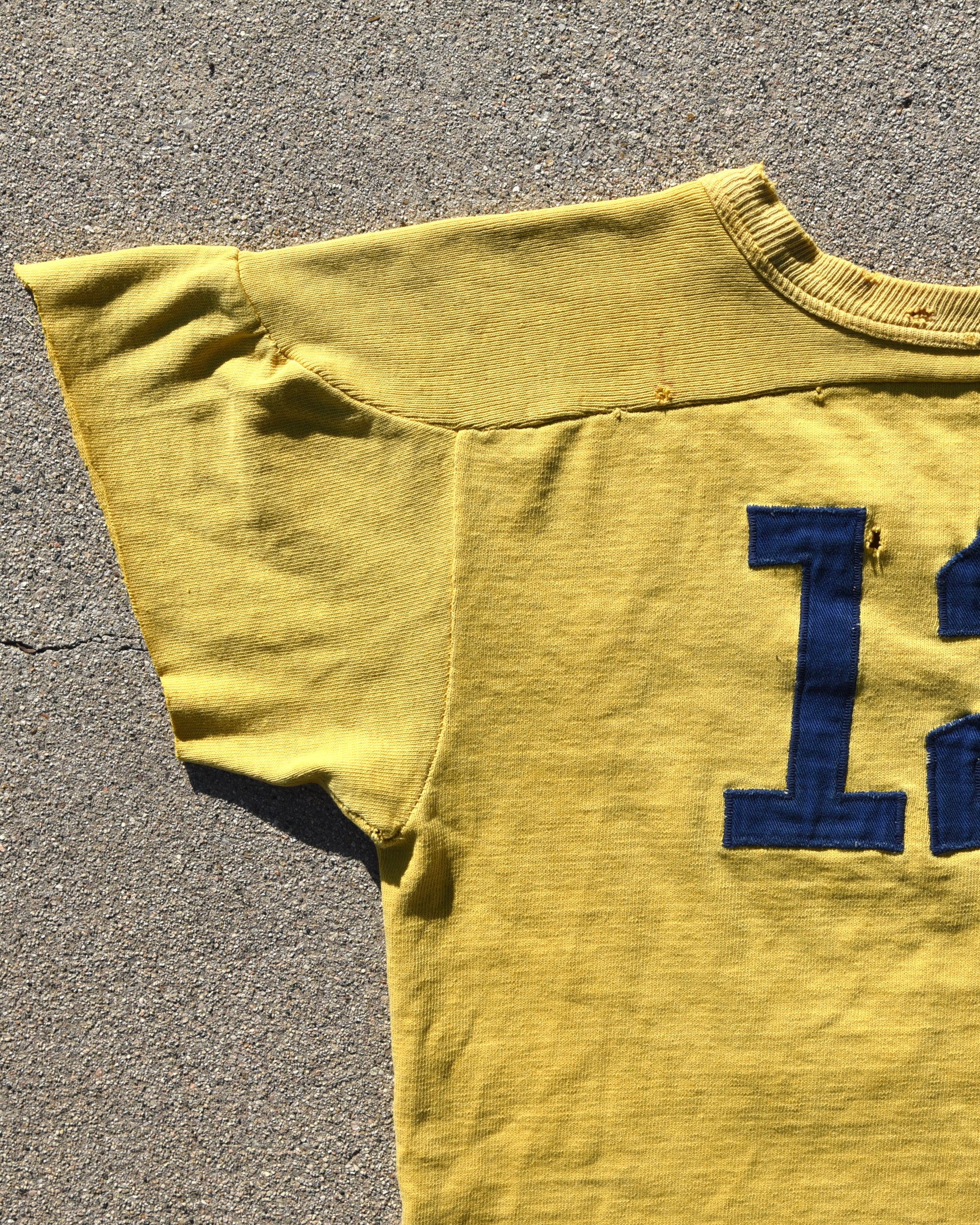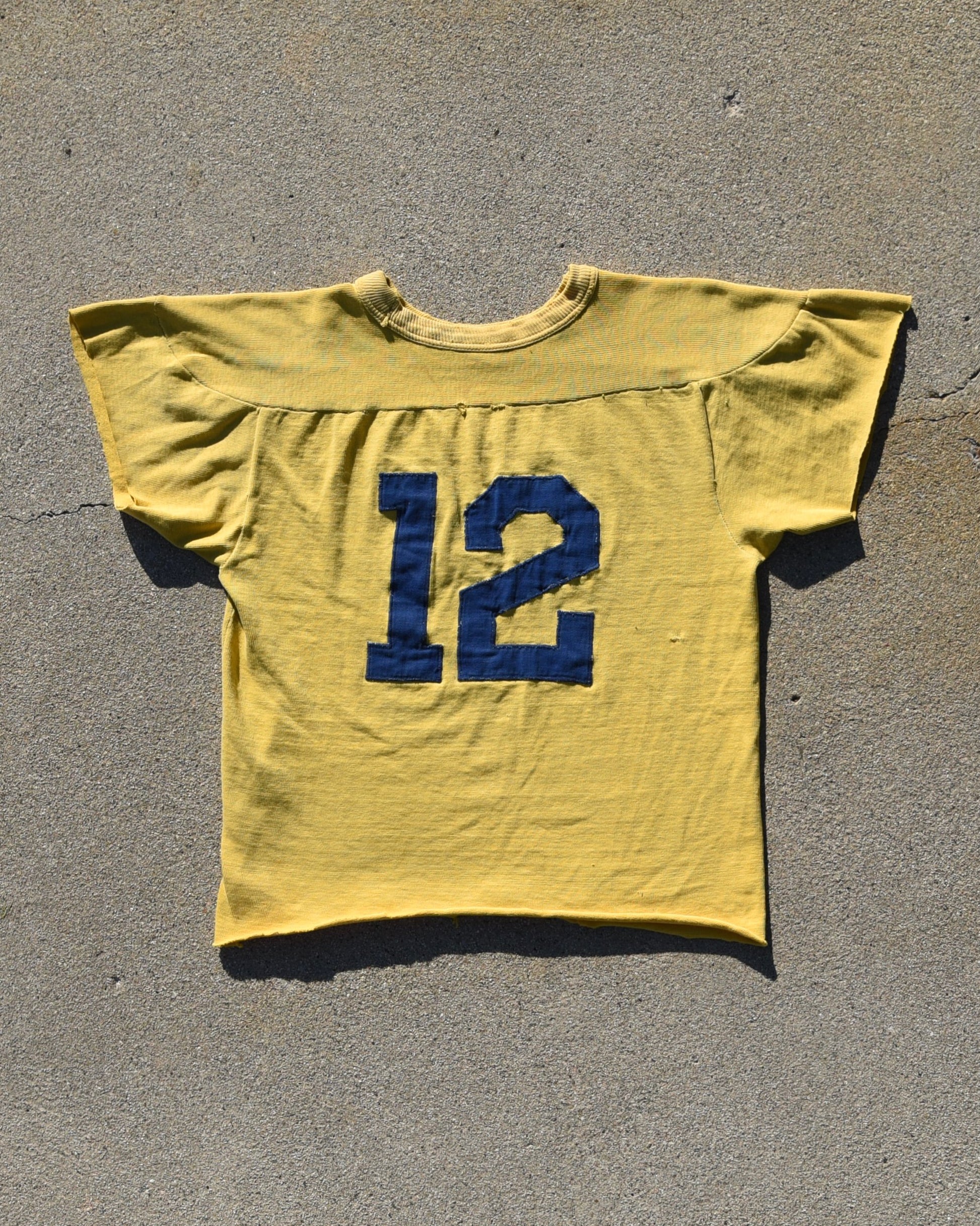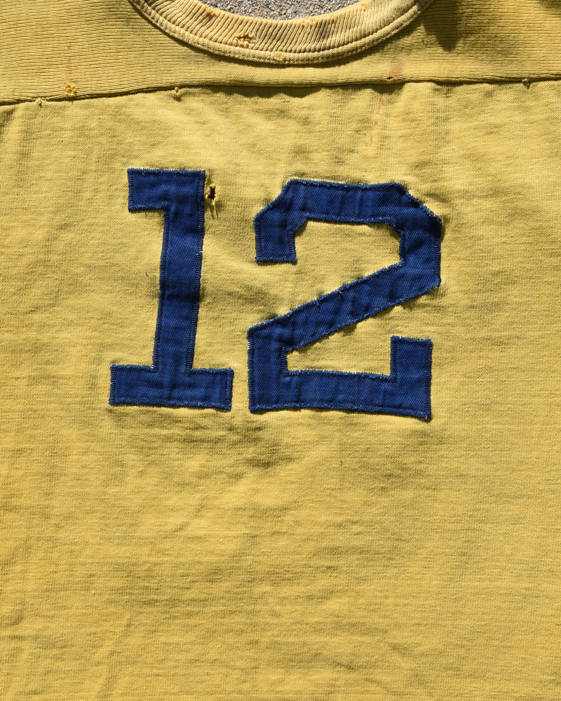 1950s Cotton Football Jersey. Chopped sleeves and hem. Signs of wear from age all throughout. No tag, fits like a boxy medium
