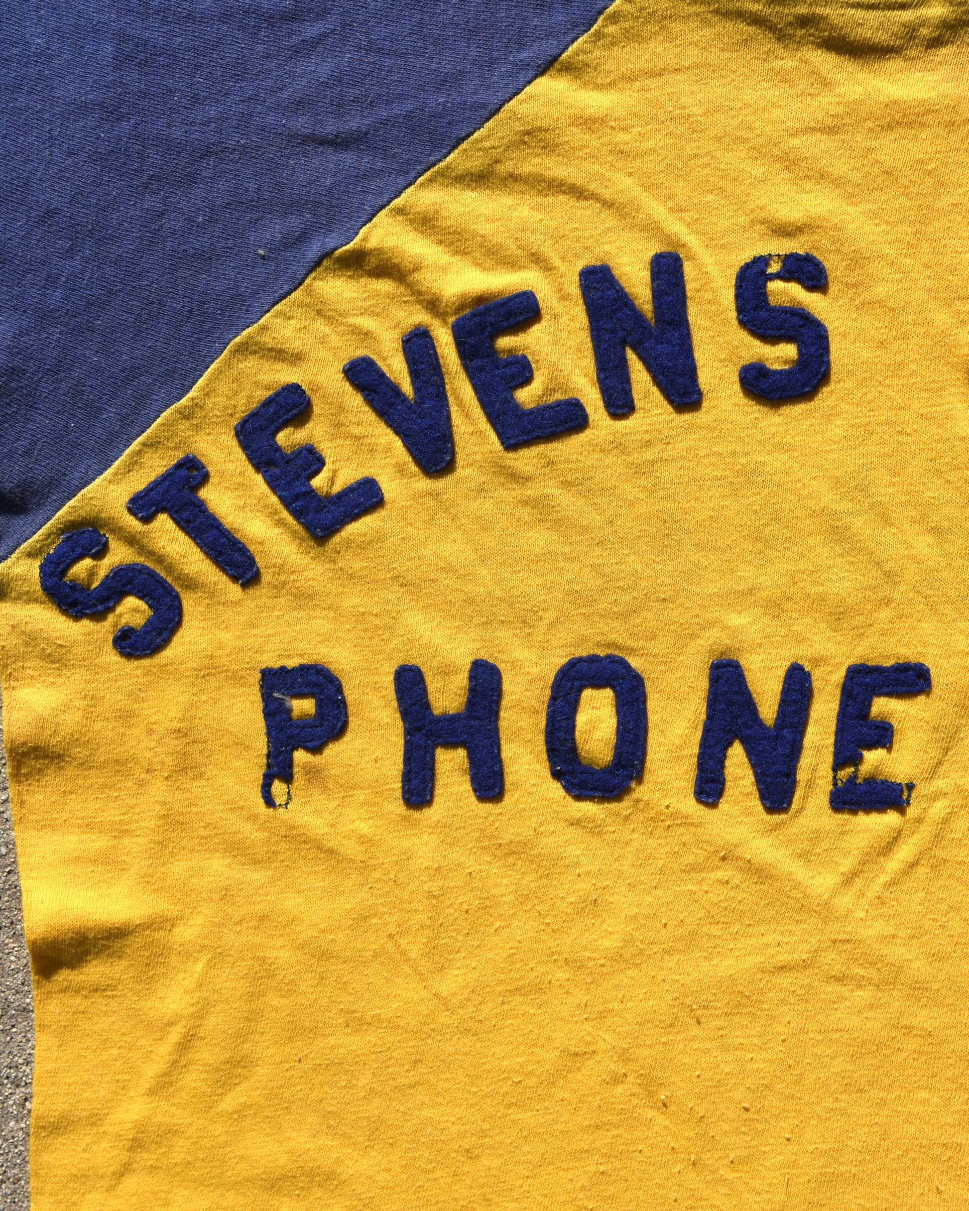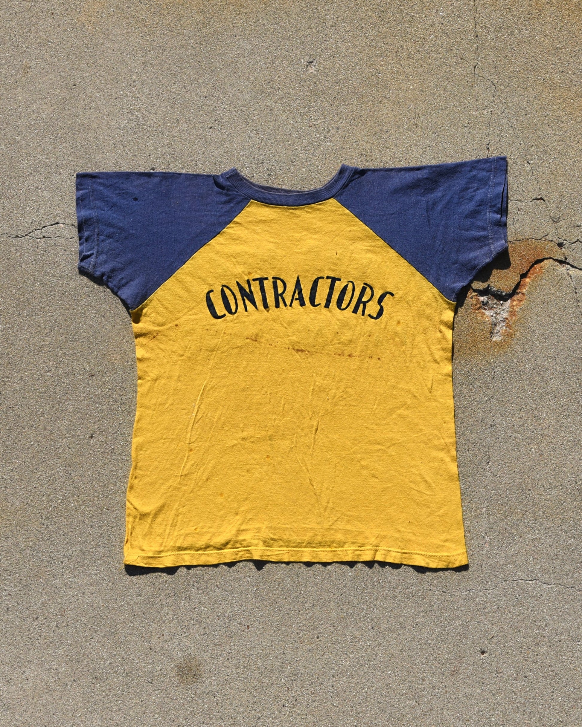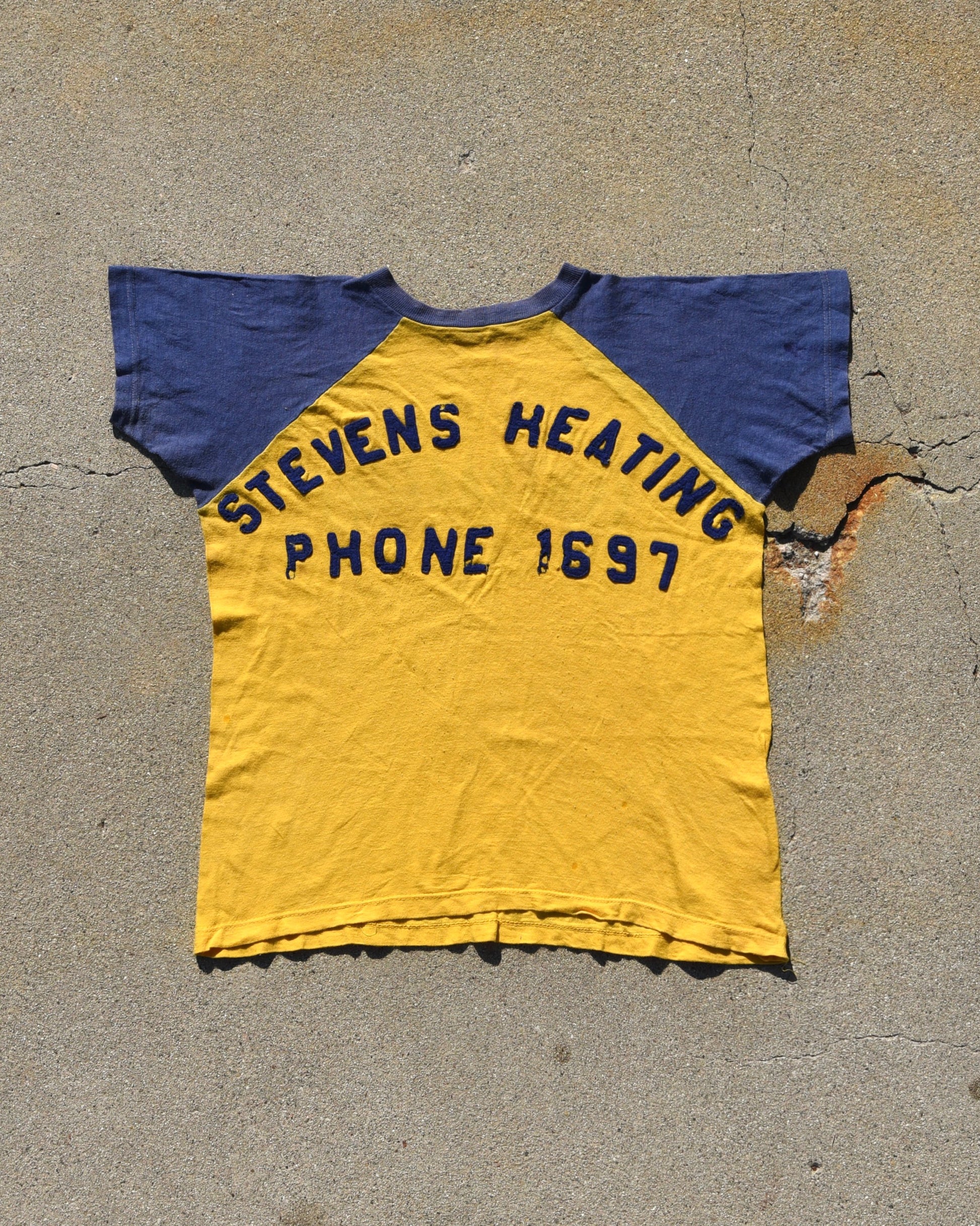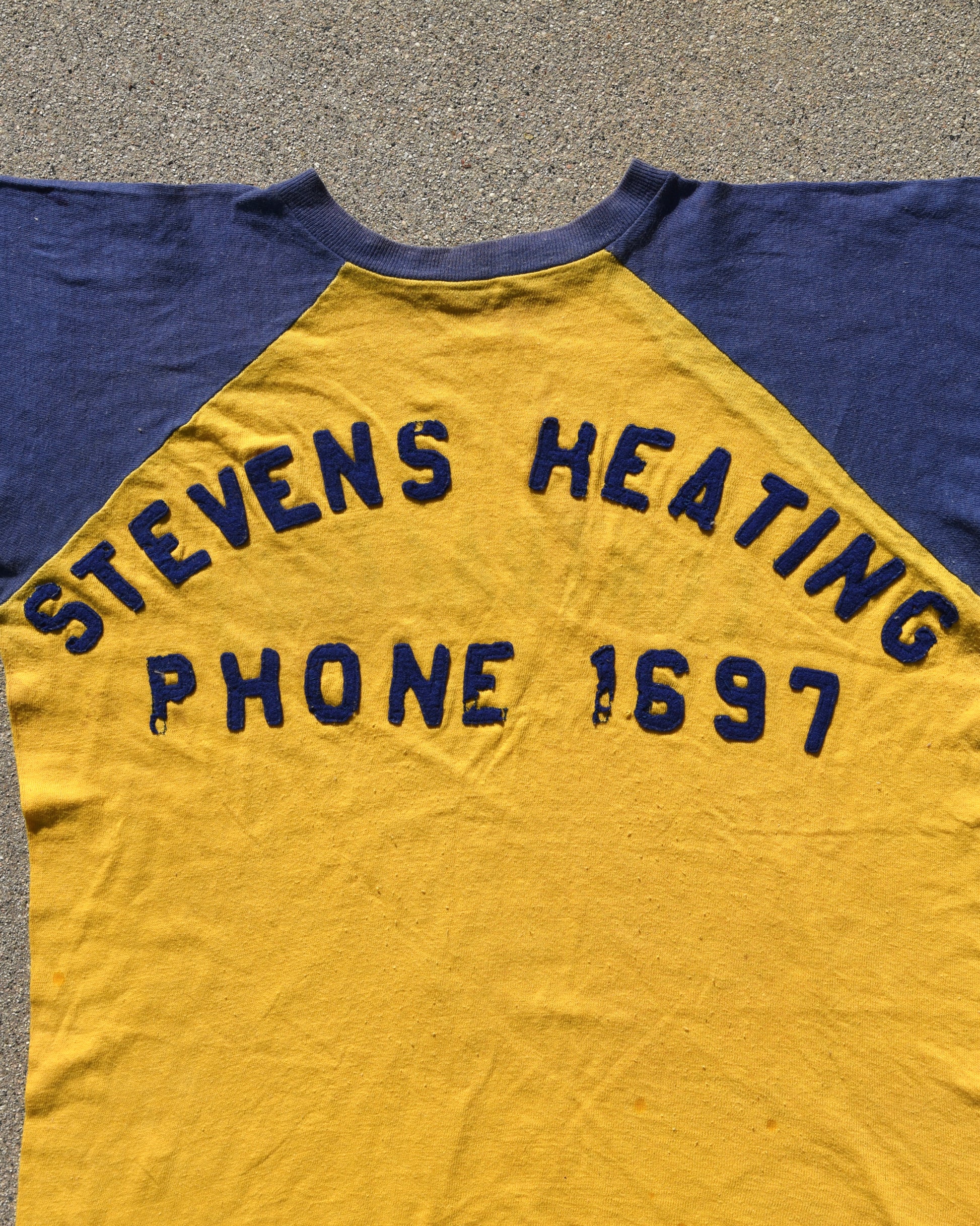 1950s Durene Contractors Two Tone Jersey. Felt Stitched lettering on the Steven’s Heating side, graphic print on the contractors side. True vintage item. Signs of wear and fading all throughout. The contractors side is the front of the tshirt. No tag fits like a medium or large