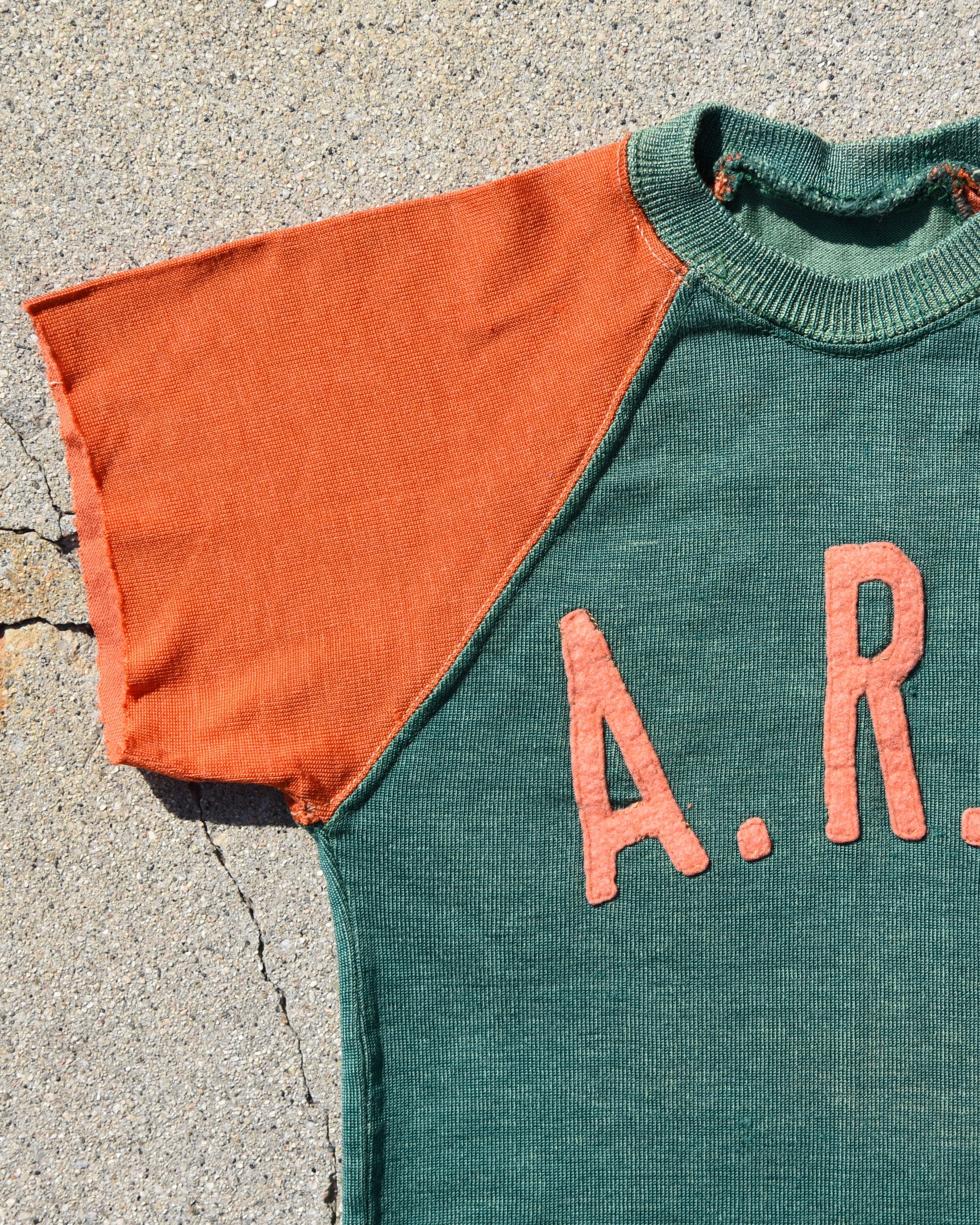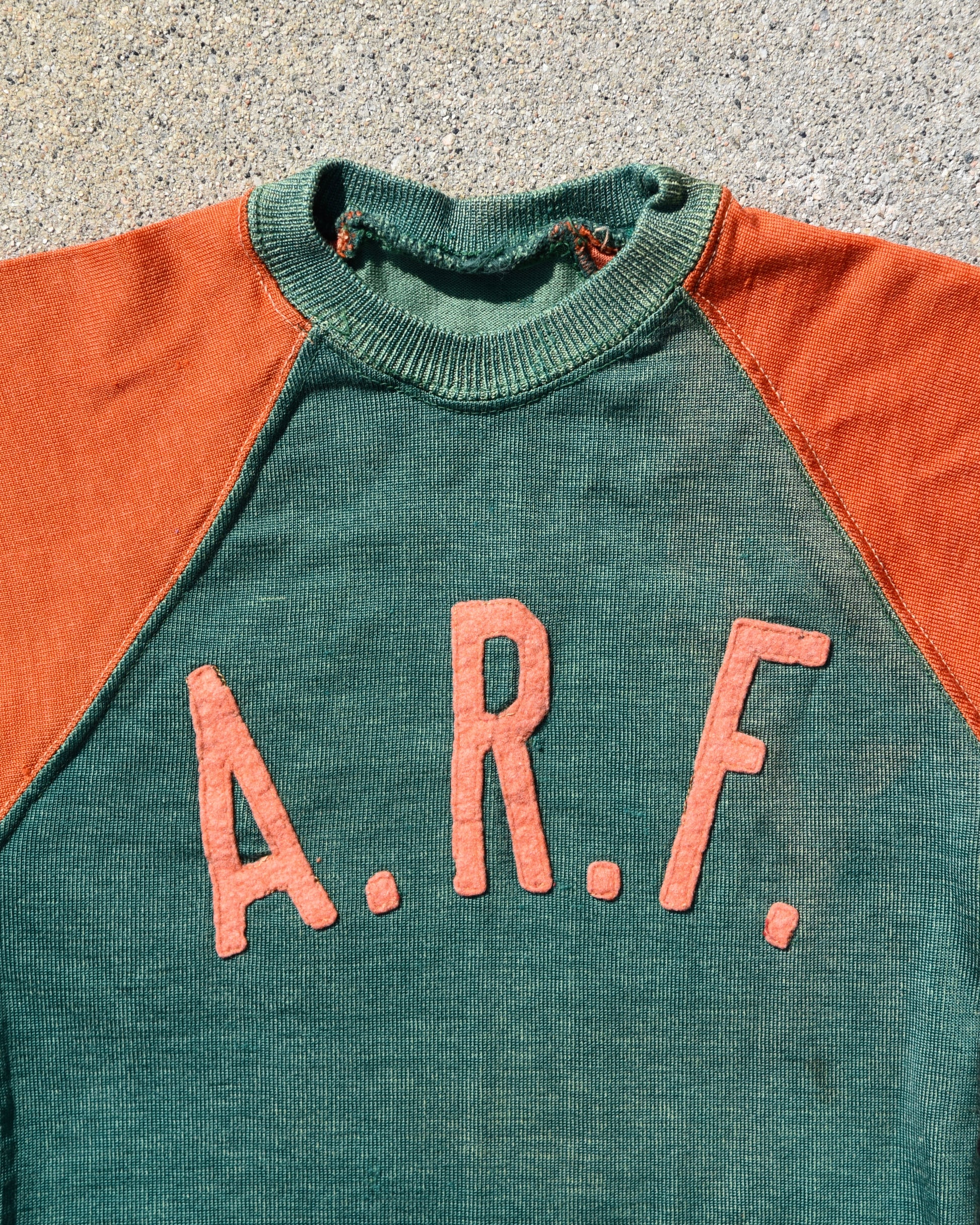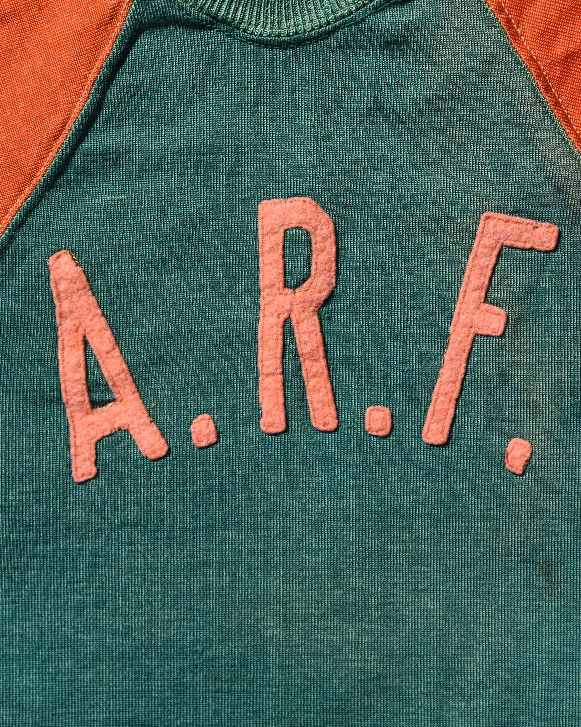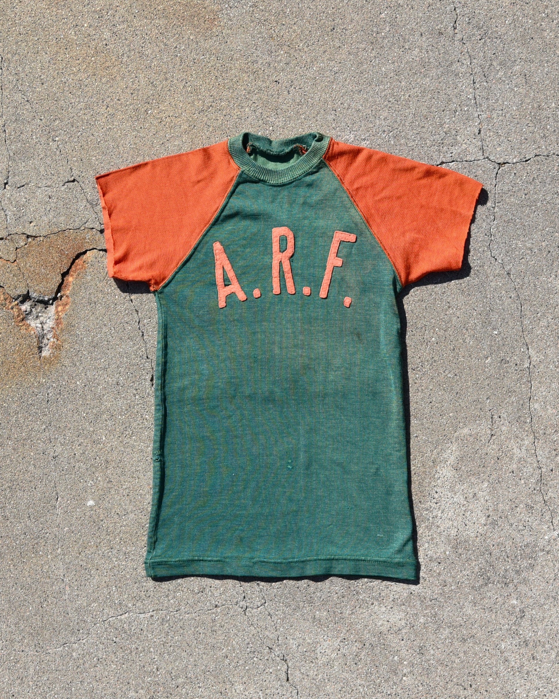 True vintage Durene Delso Knitting Mills jersey. Felt embroidered letters on front and back. A.R.F. Letters are on the front. No tag, fits like a women’s XS. Has a good amount of stretch Measurements: P2P Width 13” Length 23.5” |
