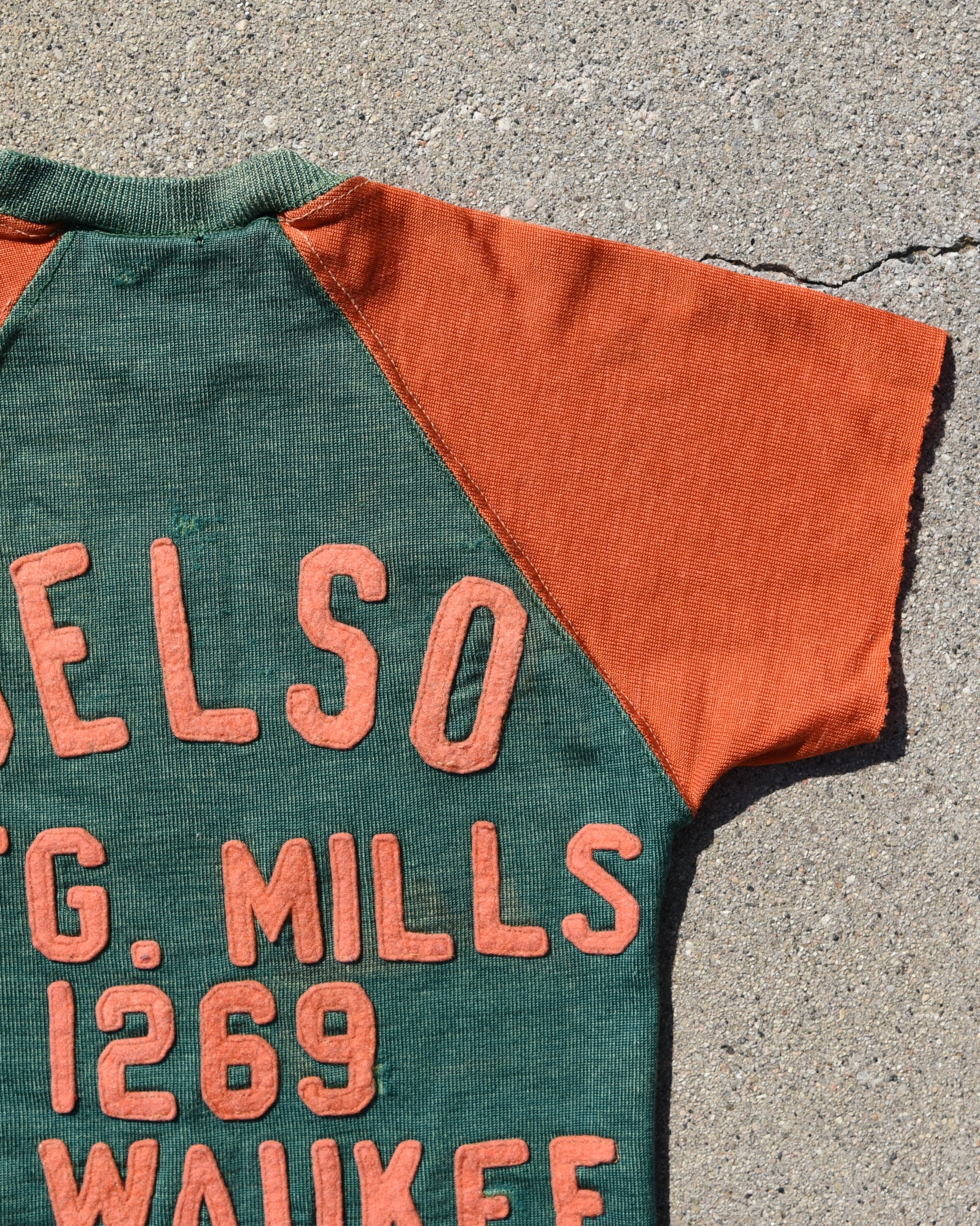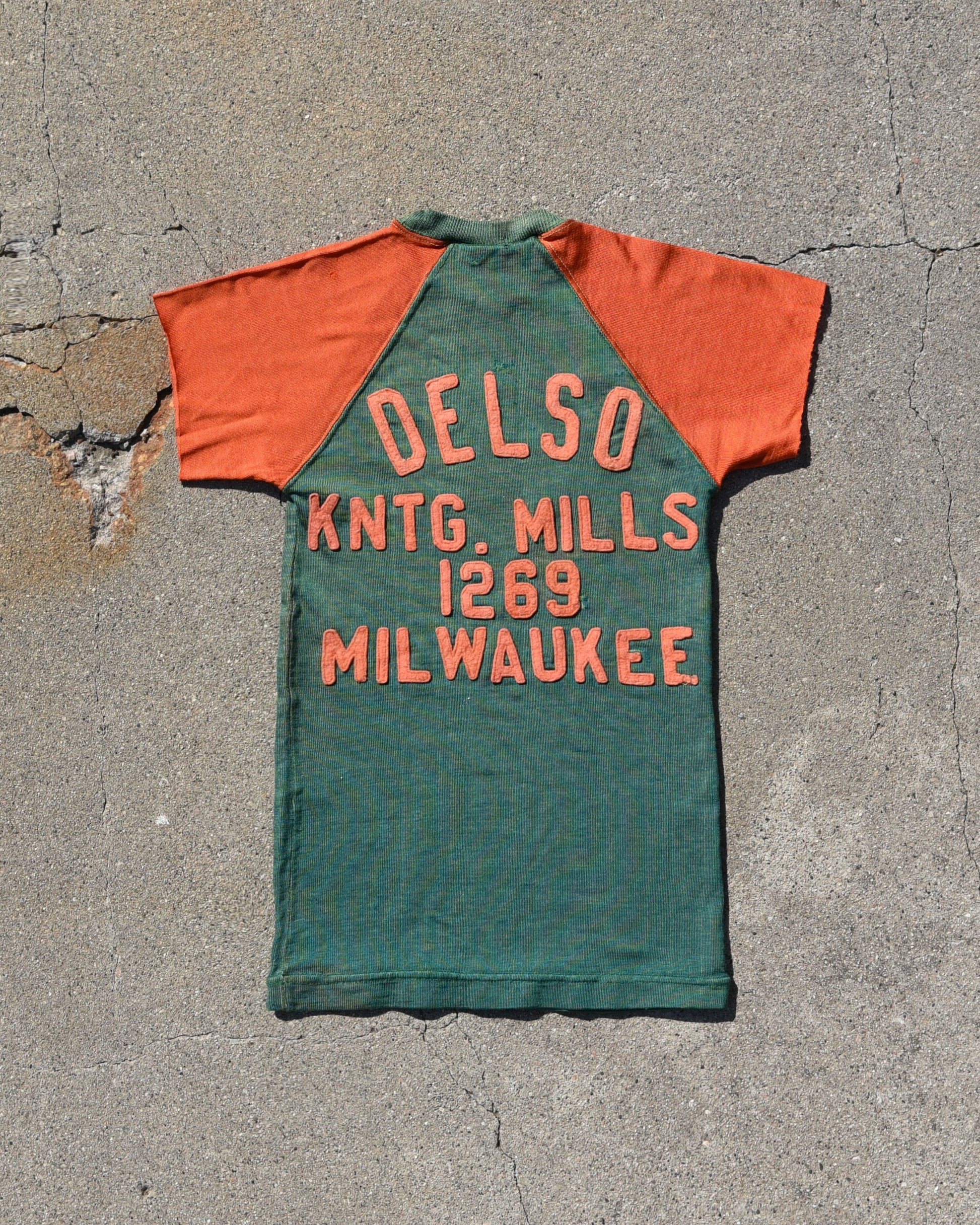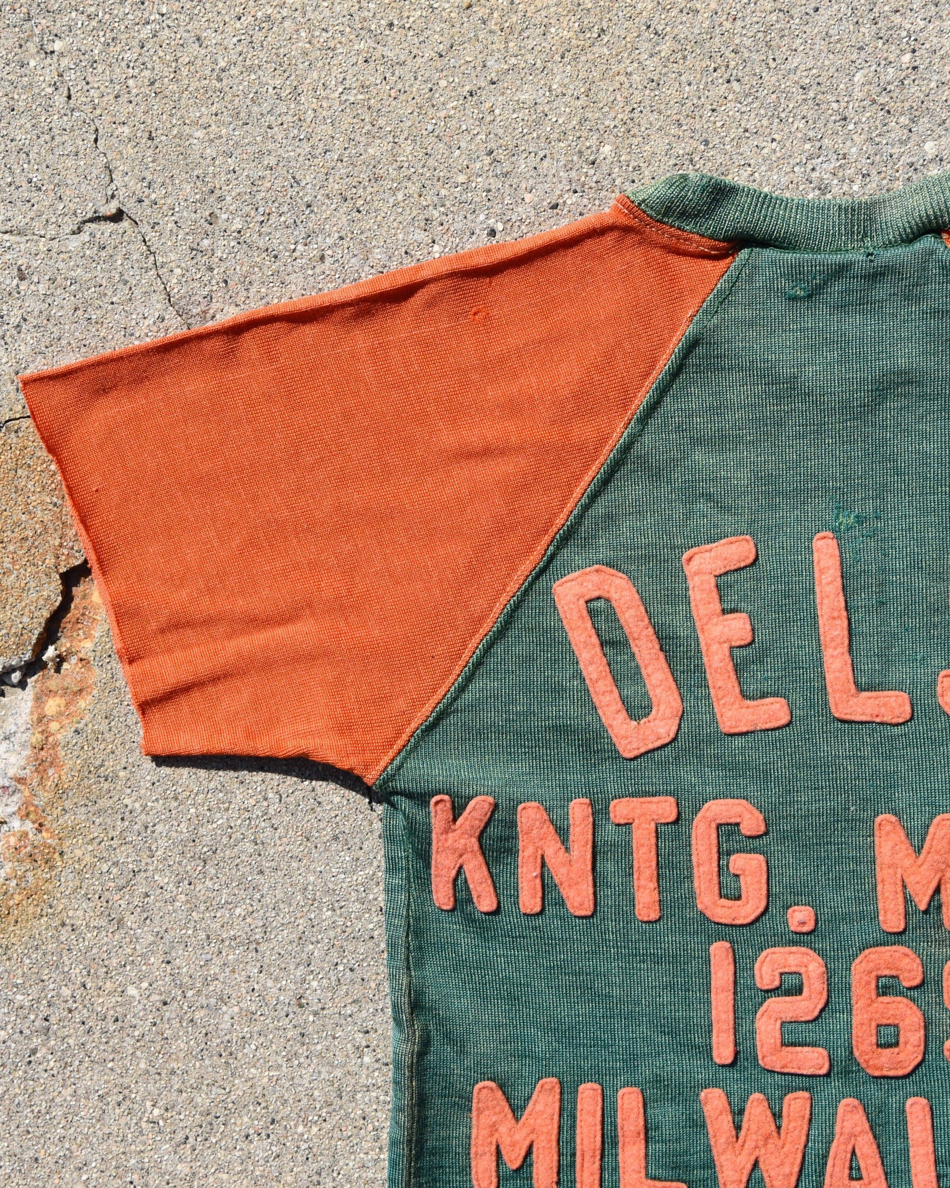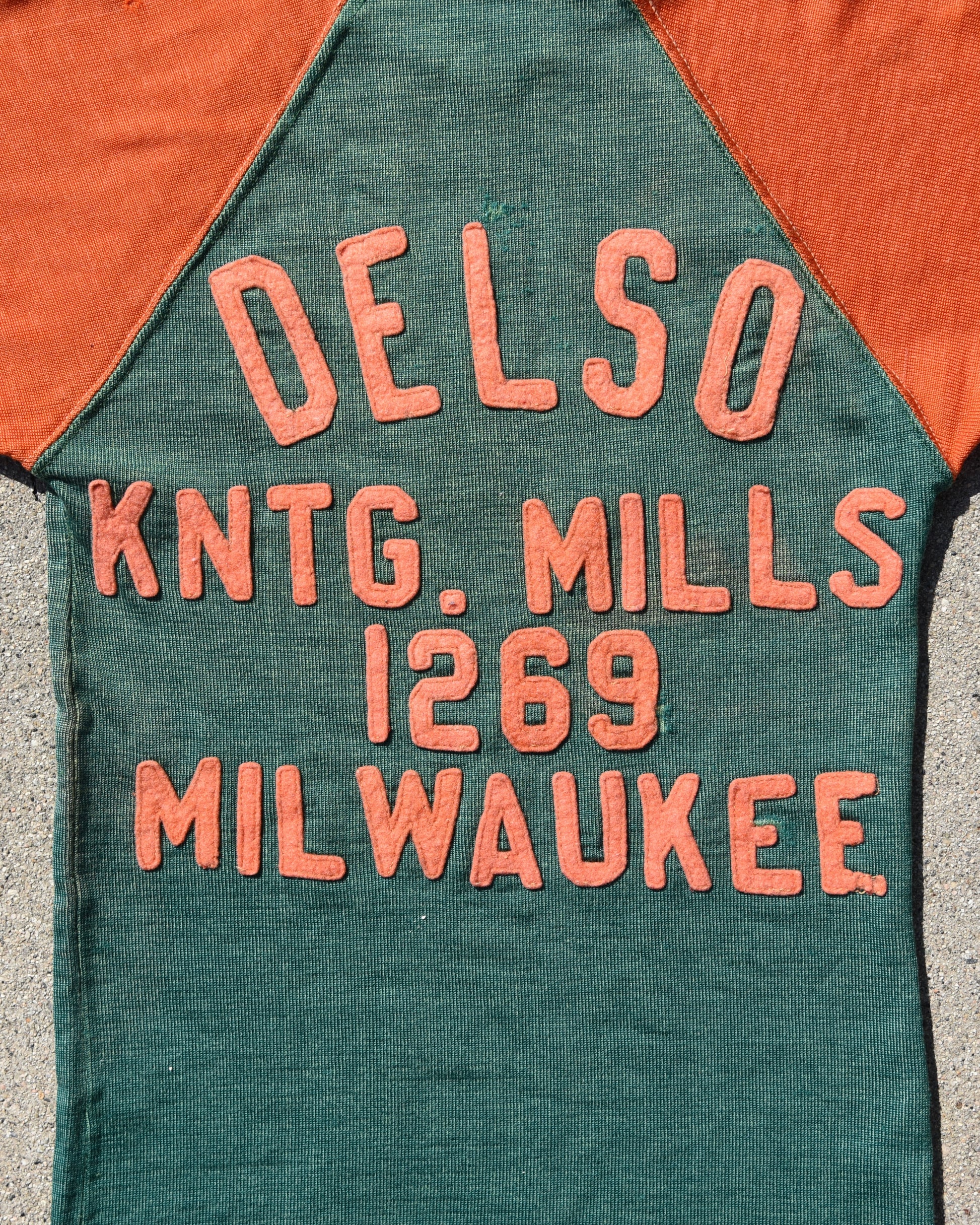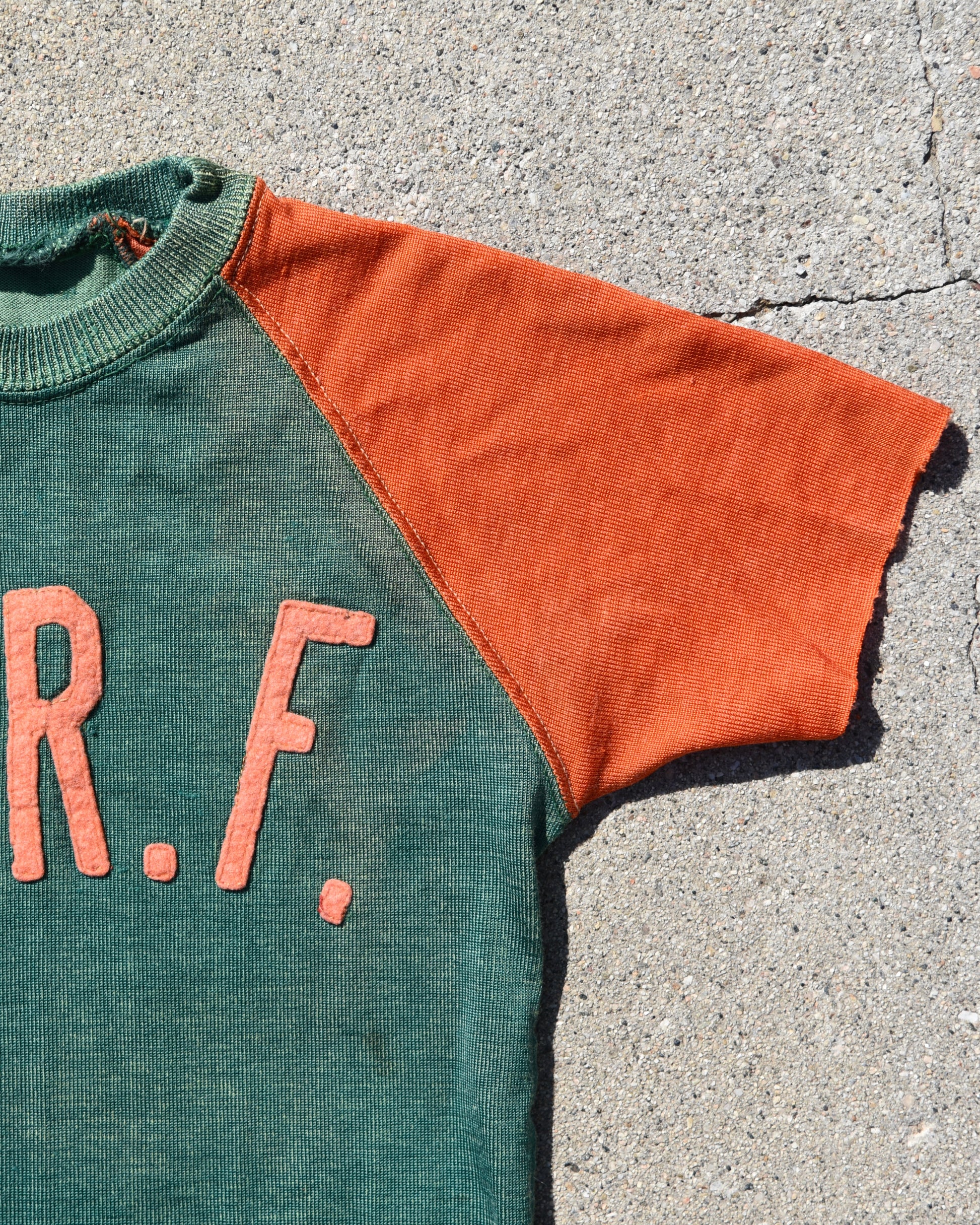 True vintage Durene Delso Knitting Mills jersey. Felt embroidered letters on front and back. A.R.F. Letters are on the front. No tag, fits like a women’s XS. Has a good amount of stretch Measurements: P2P Width 13” Length 23.5” |