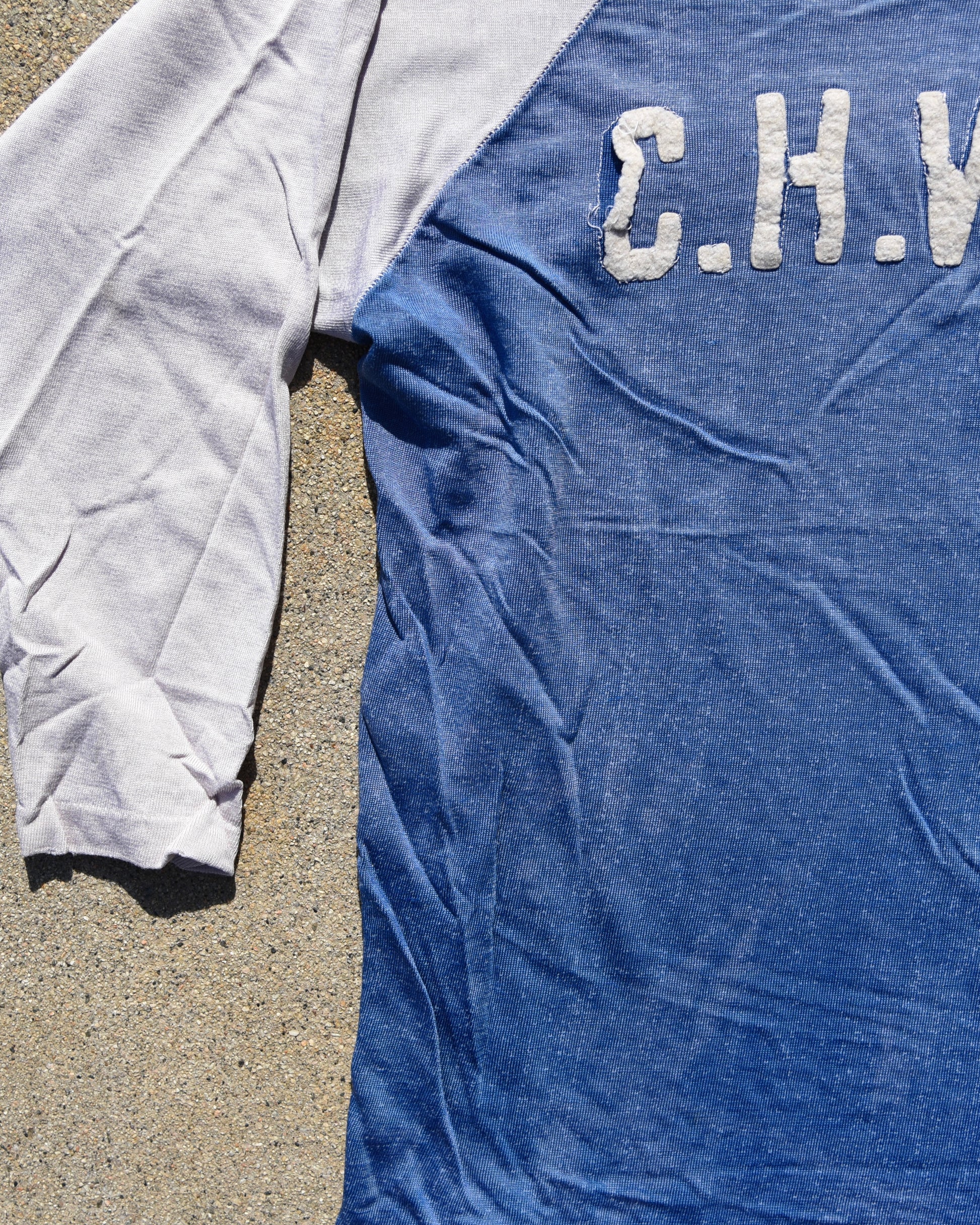 Vintage 1950s Durene Raglan Baseball Jersey. Really nicely sun faded and thrashed throughout. Embroidered lettering on front and back. Fits like a small. Has stretch