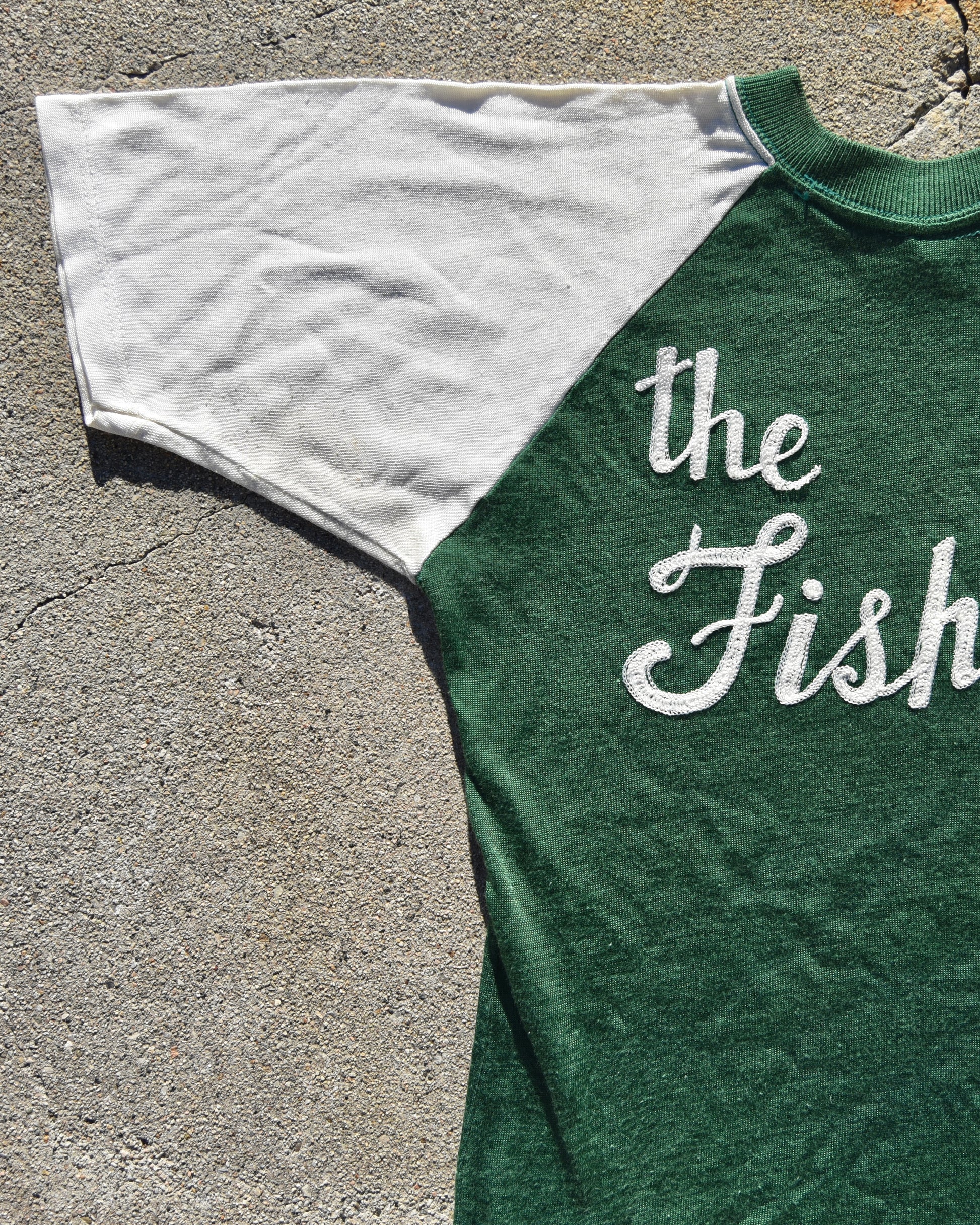 True Vintage 1950s Durene The Fishers Jersey. Chainstitched embroidery. In good condition for its age. Fits like a men’s small or medium. Has a good amount of stretch. Embroidery is on the back, front is blank