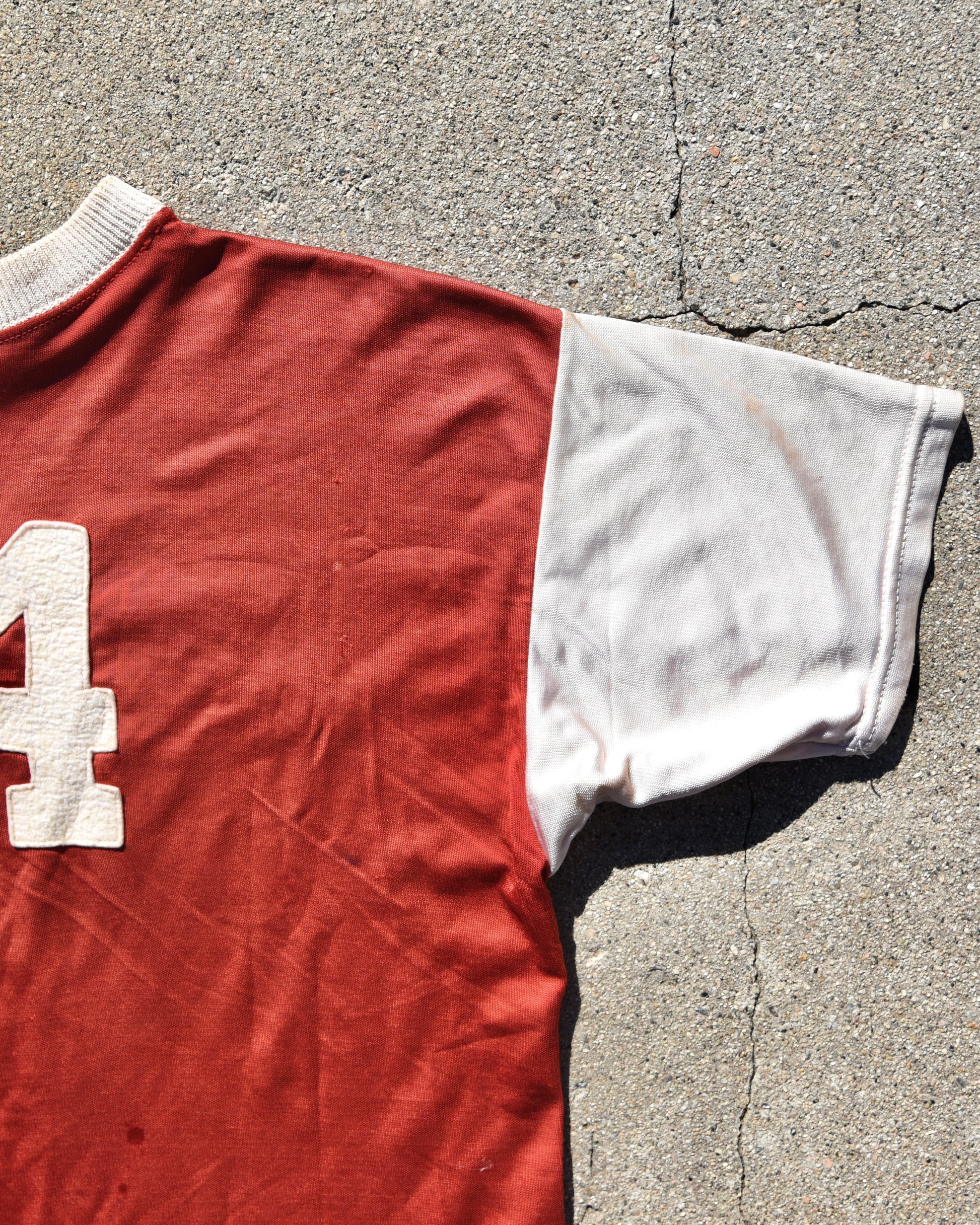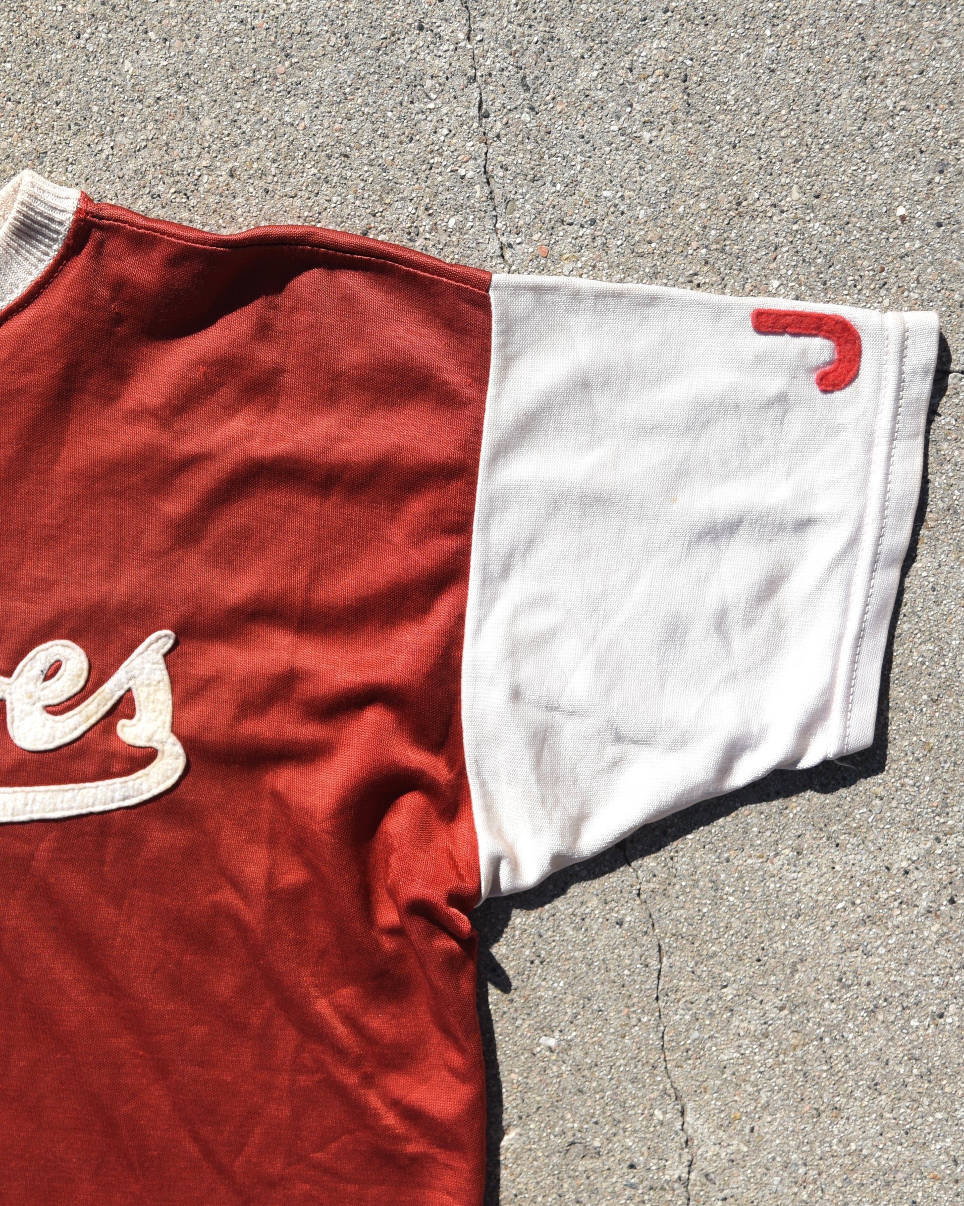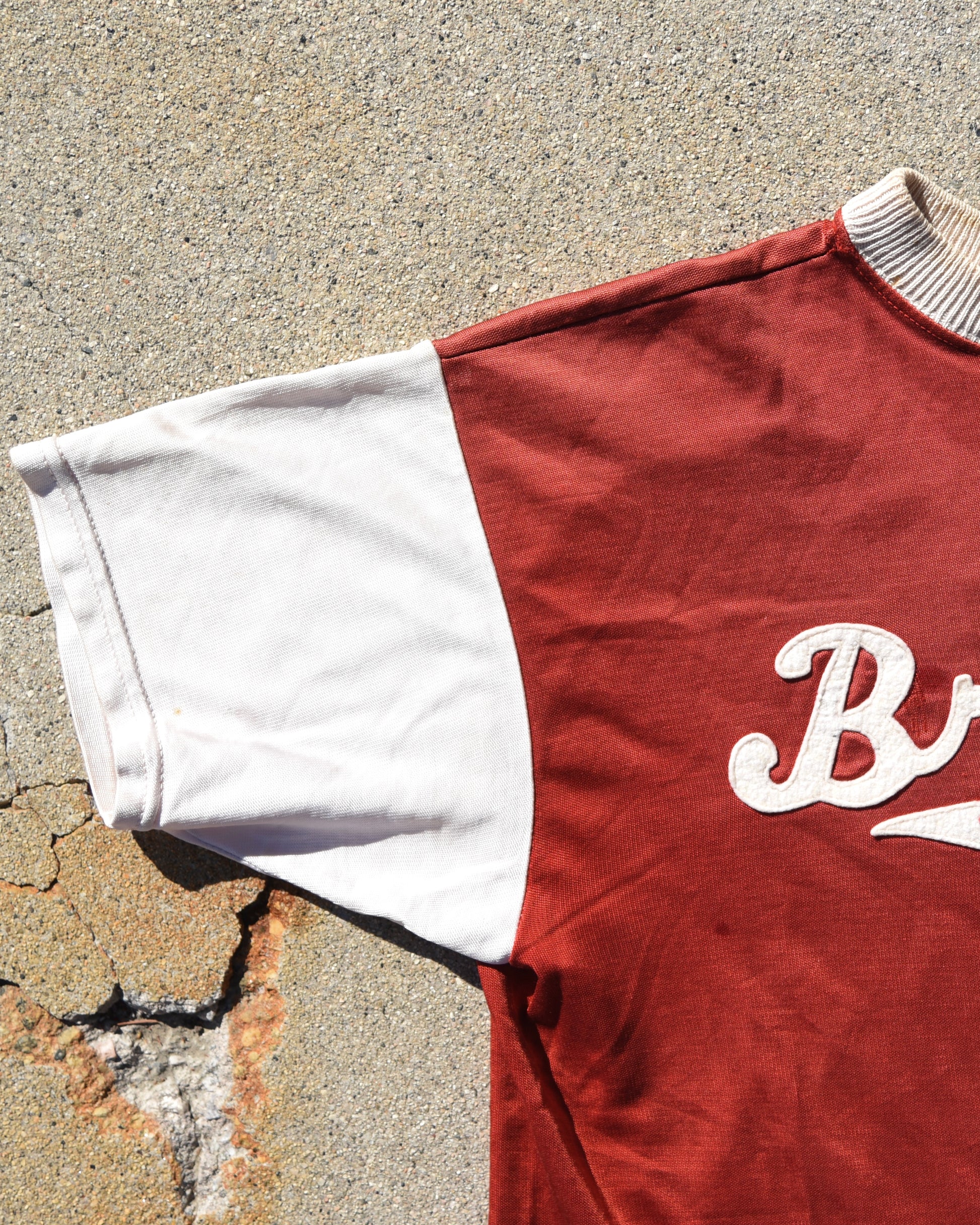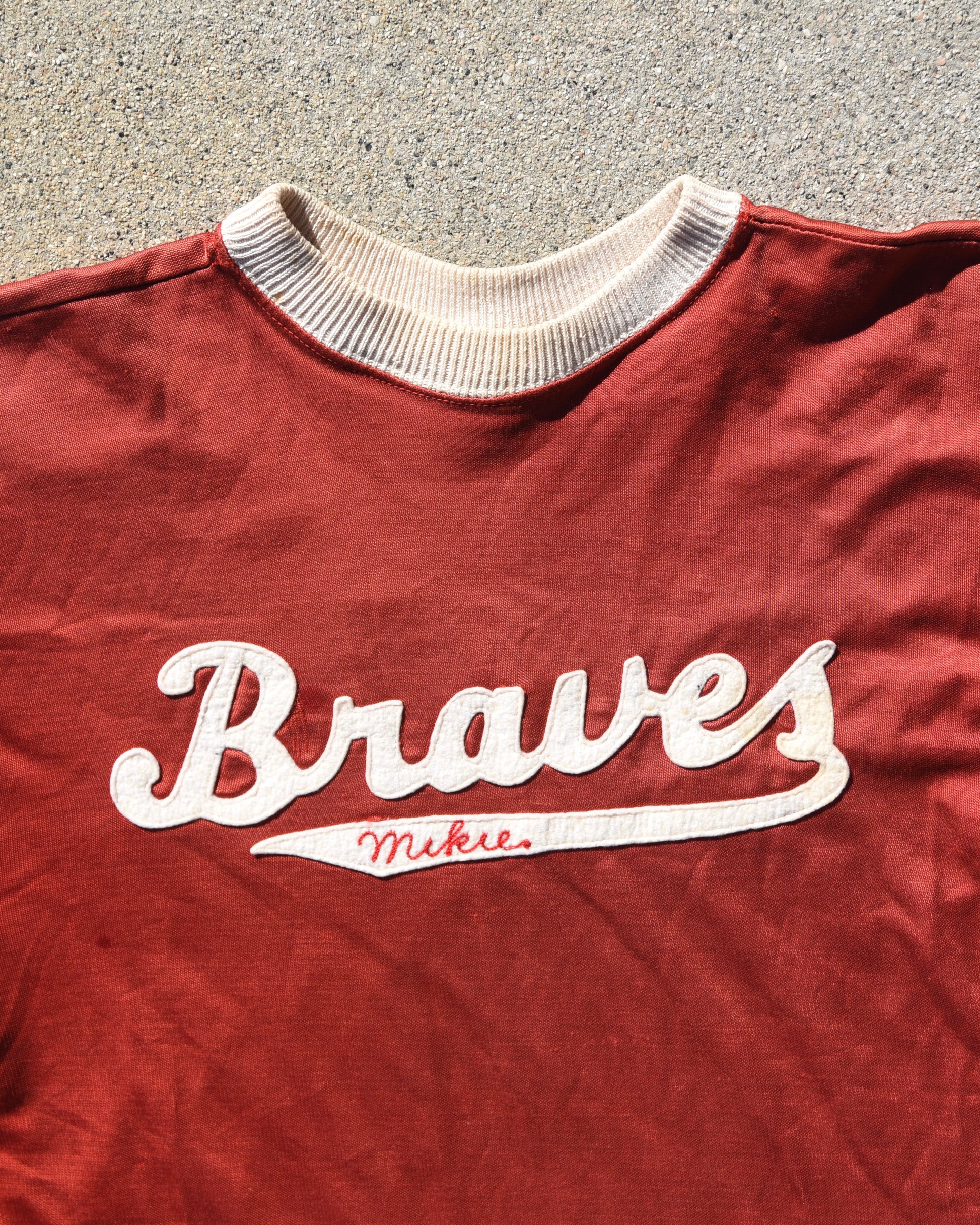 1950s Durene Two Tone Braves Jersey. In great condition overall for it’s age. Felt embroidered patches. No tag, fits like a large