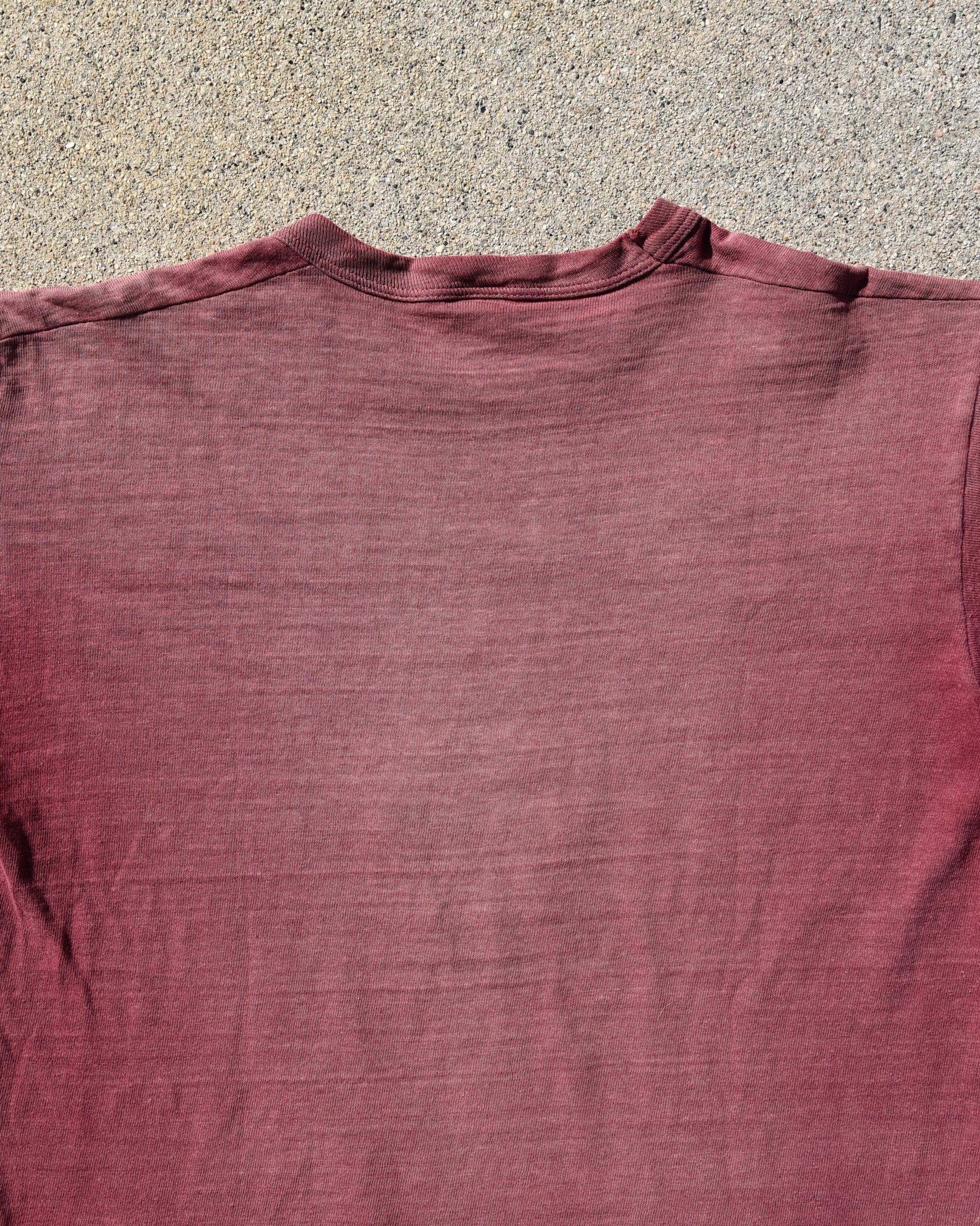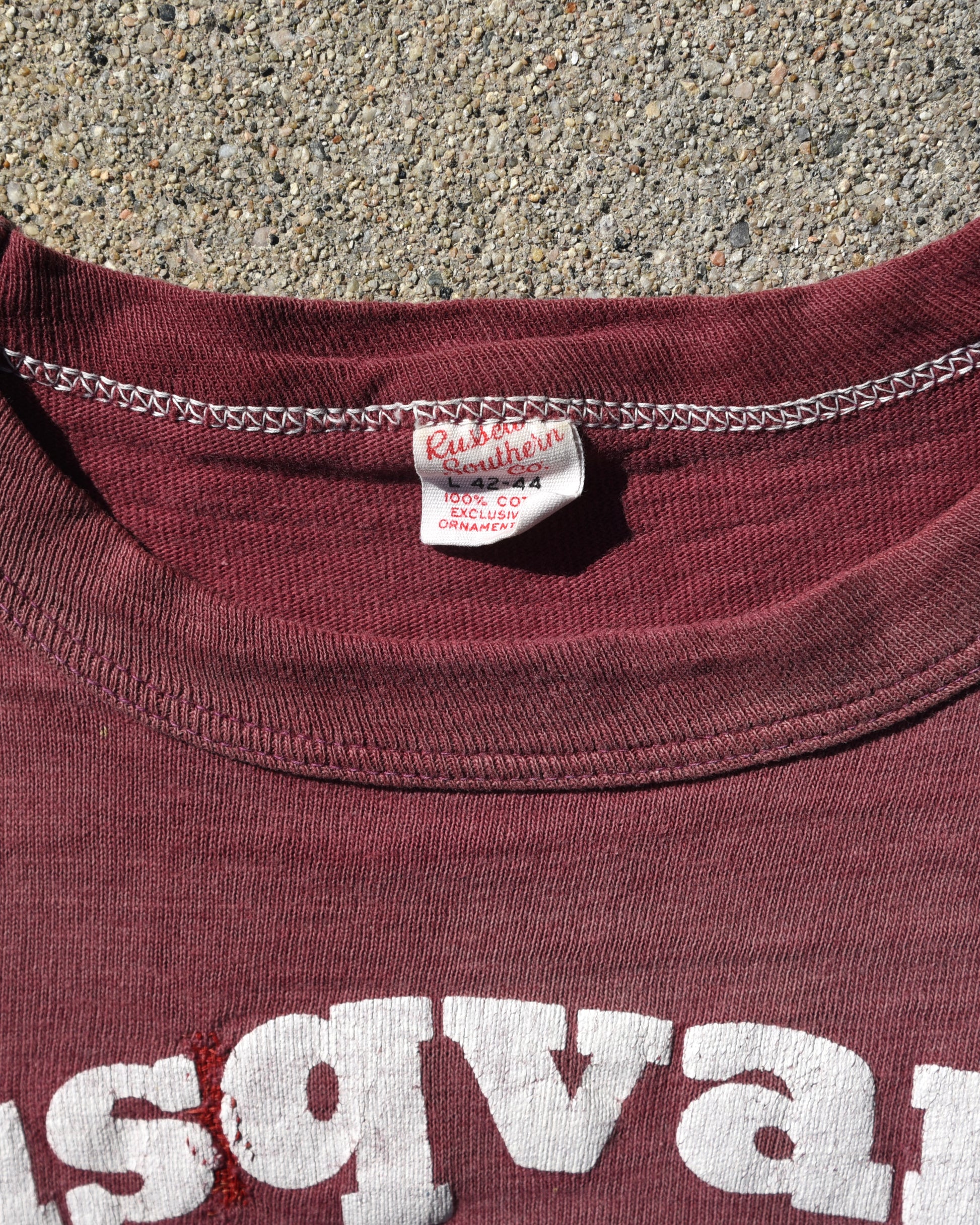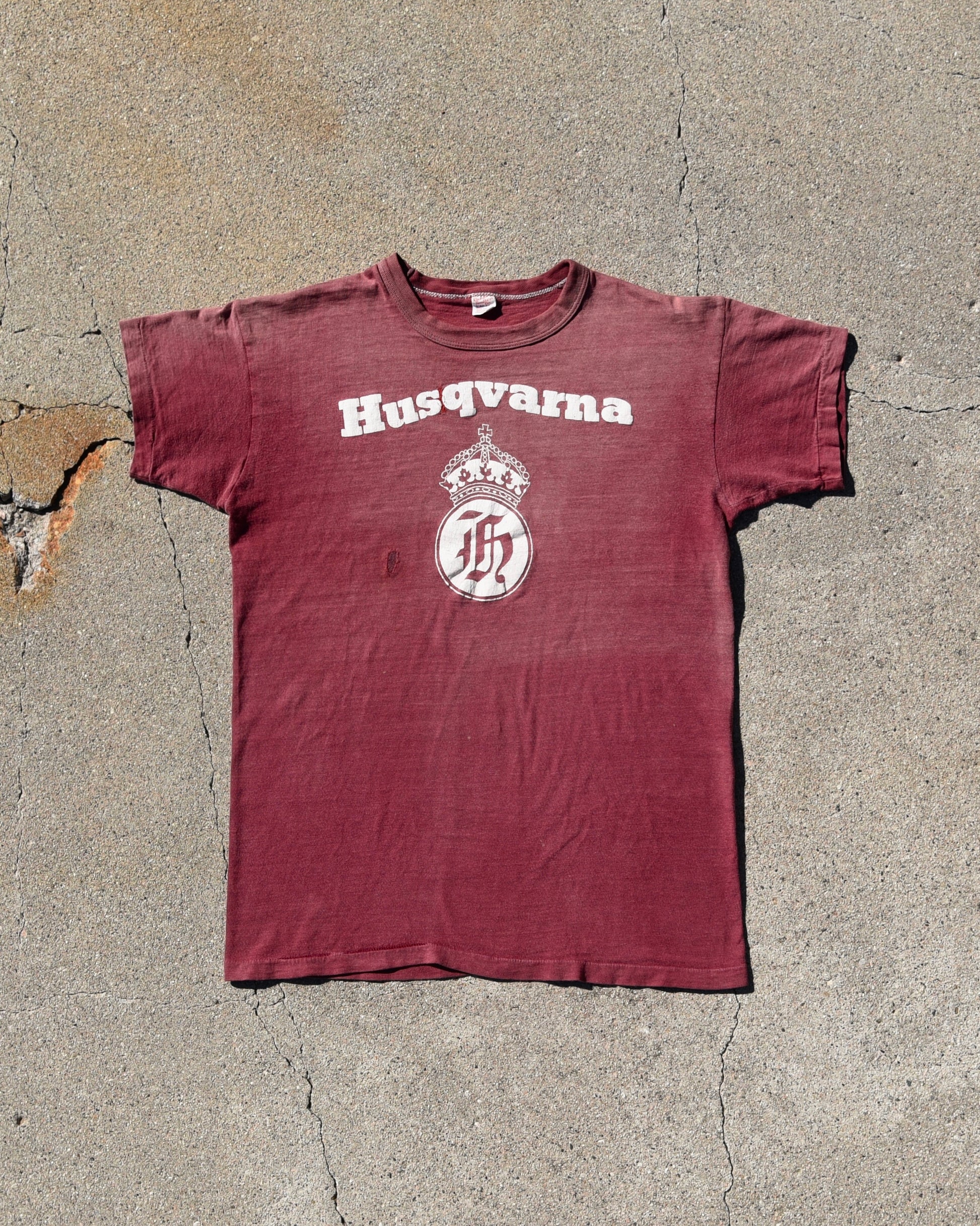 True vintage 1950s Husqvarna Tshirt. Perfectly sun faded all throughout. Repairs done professionally to mend the few holes it had on it. On a Russell Southern tag size large