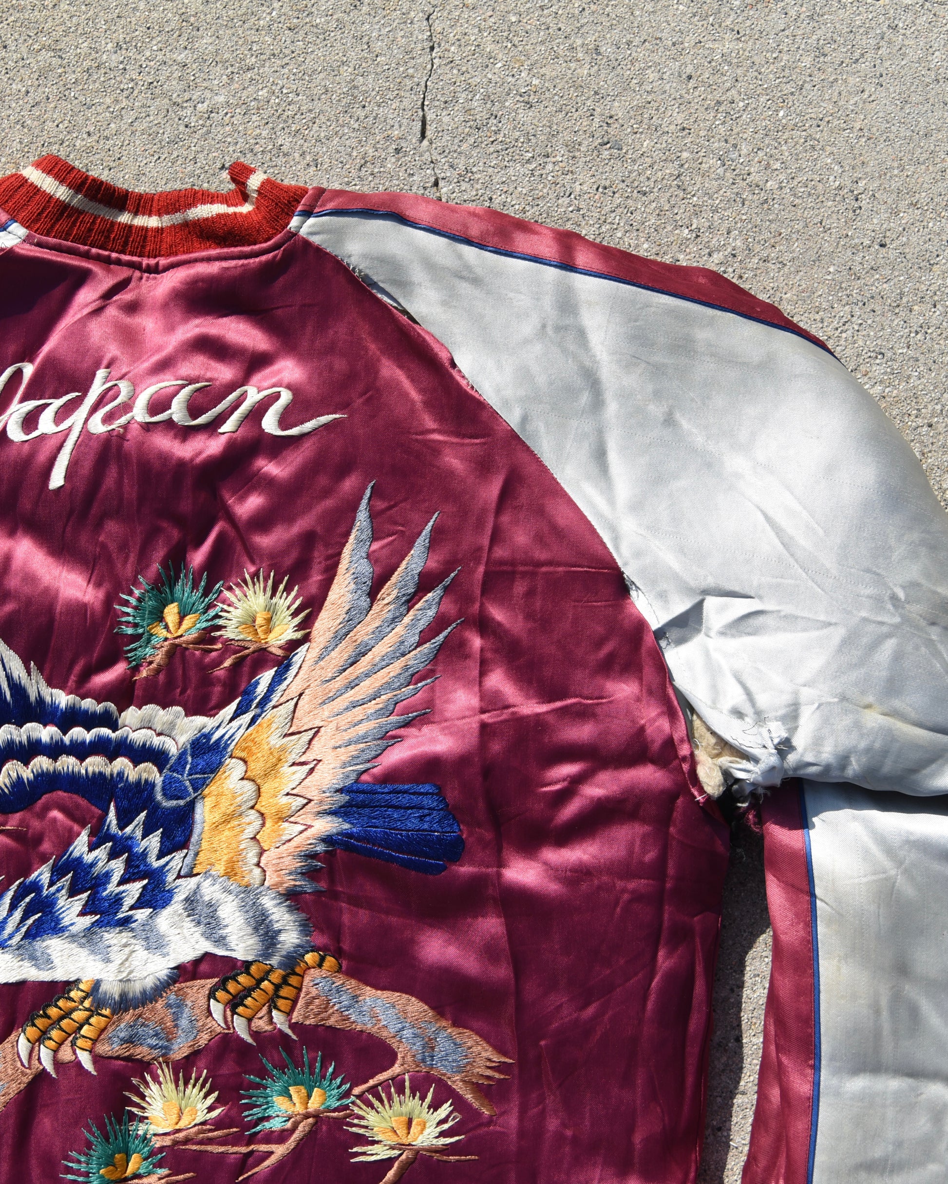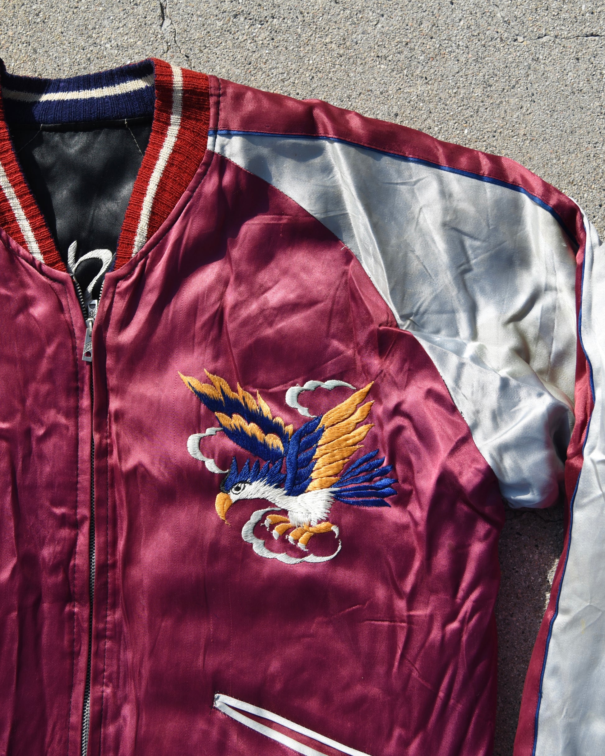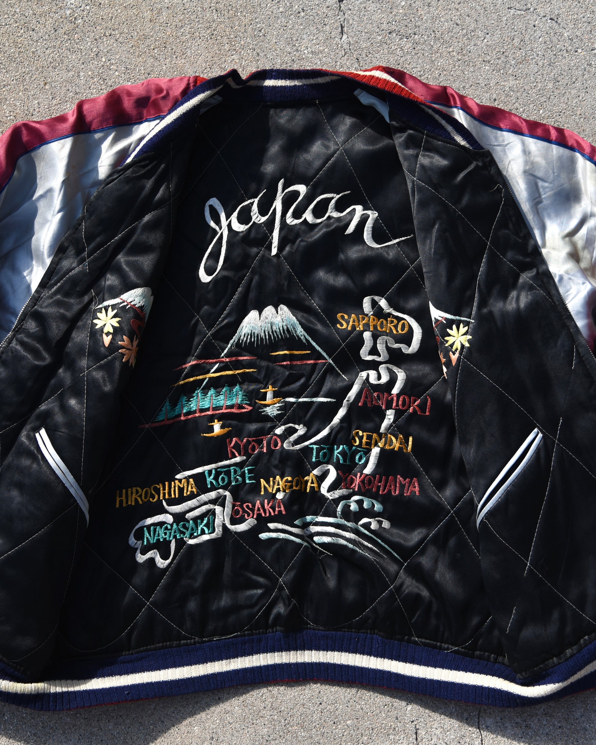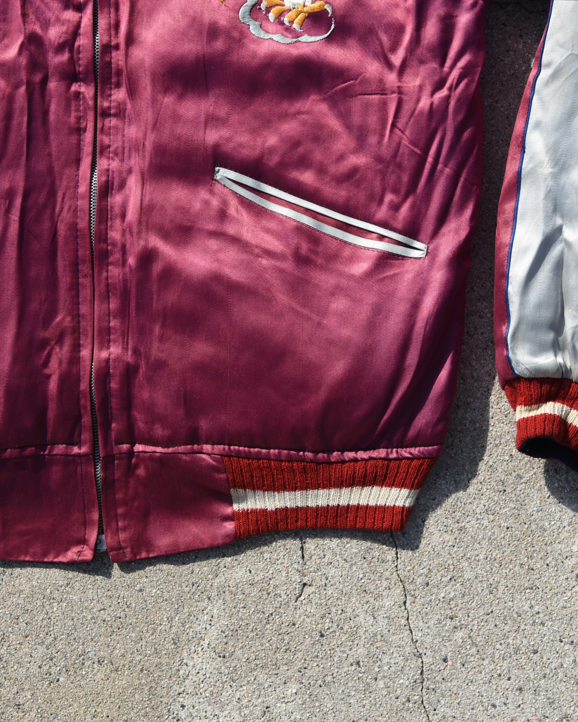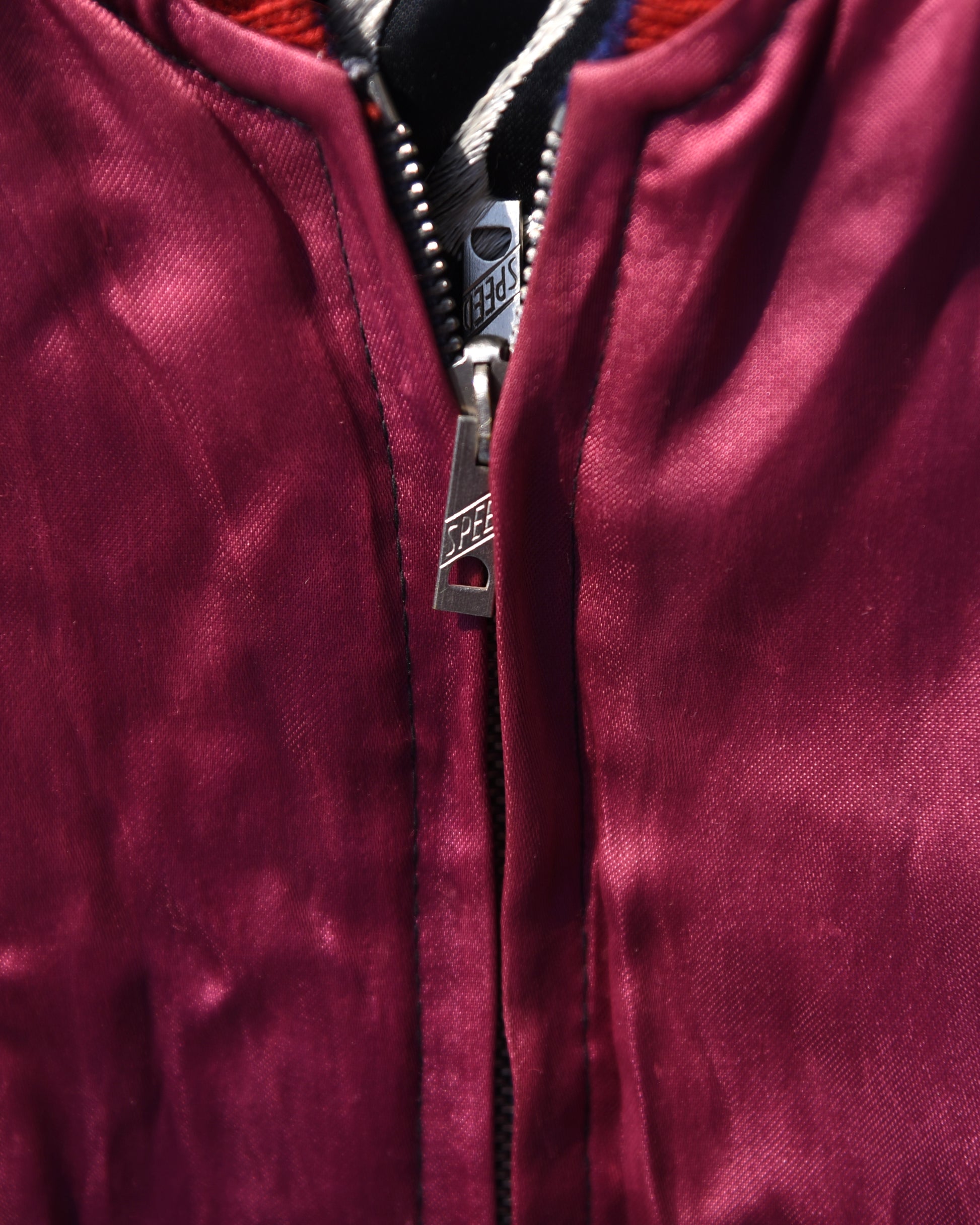 True vintage 1950s Japan Sukajan Reversible Jacket. Rare larger size of the Sukajan jackets. In good condition for its age but does have some signs of wear most notably on the red side of the jacket there are some seam splits and minor tears on one arm. Zipper works great. On original SPEED double sided zipper. Fits like a medium
