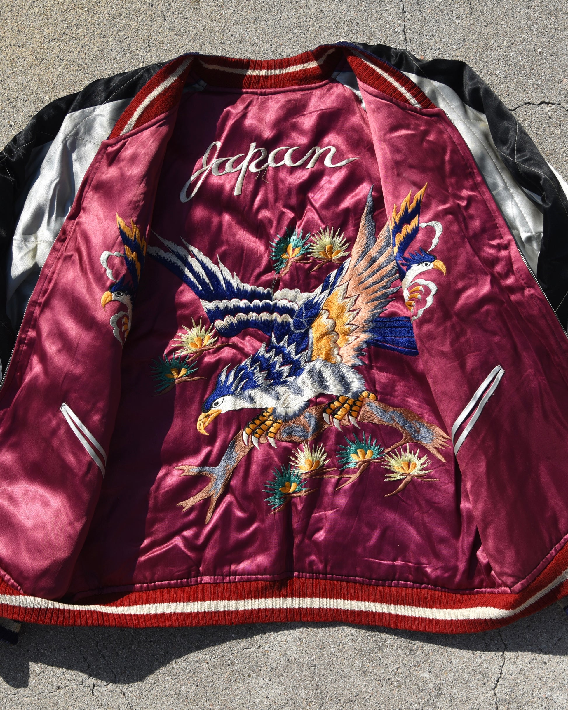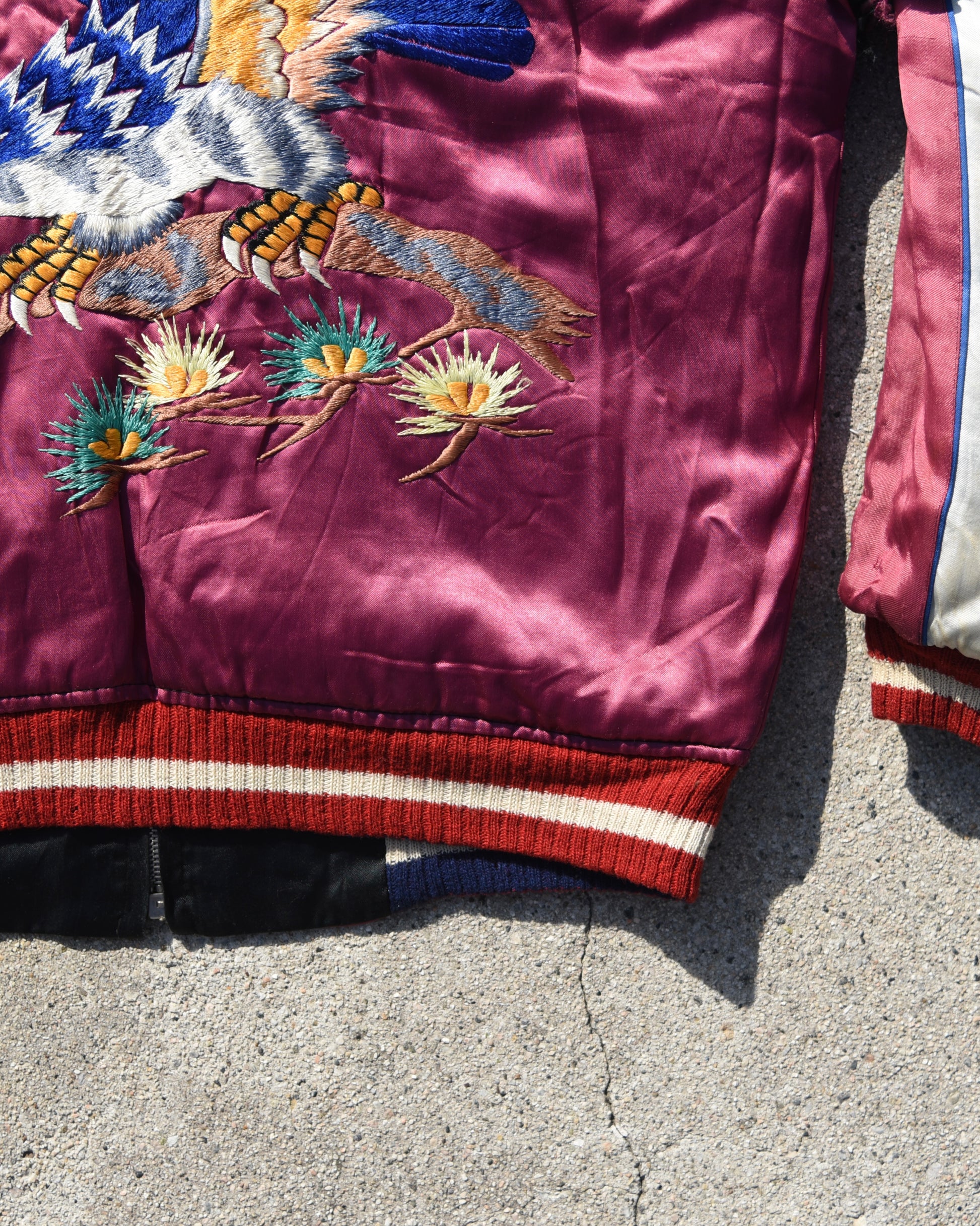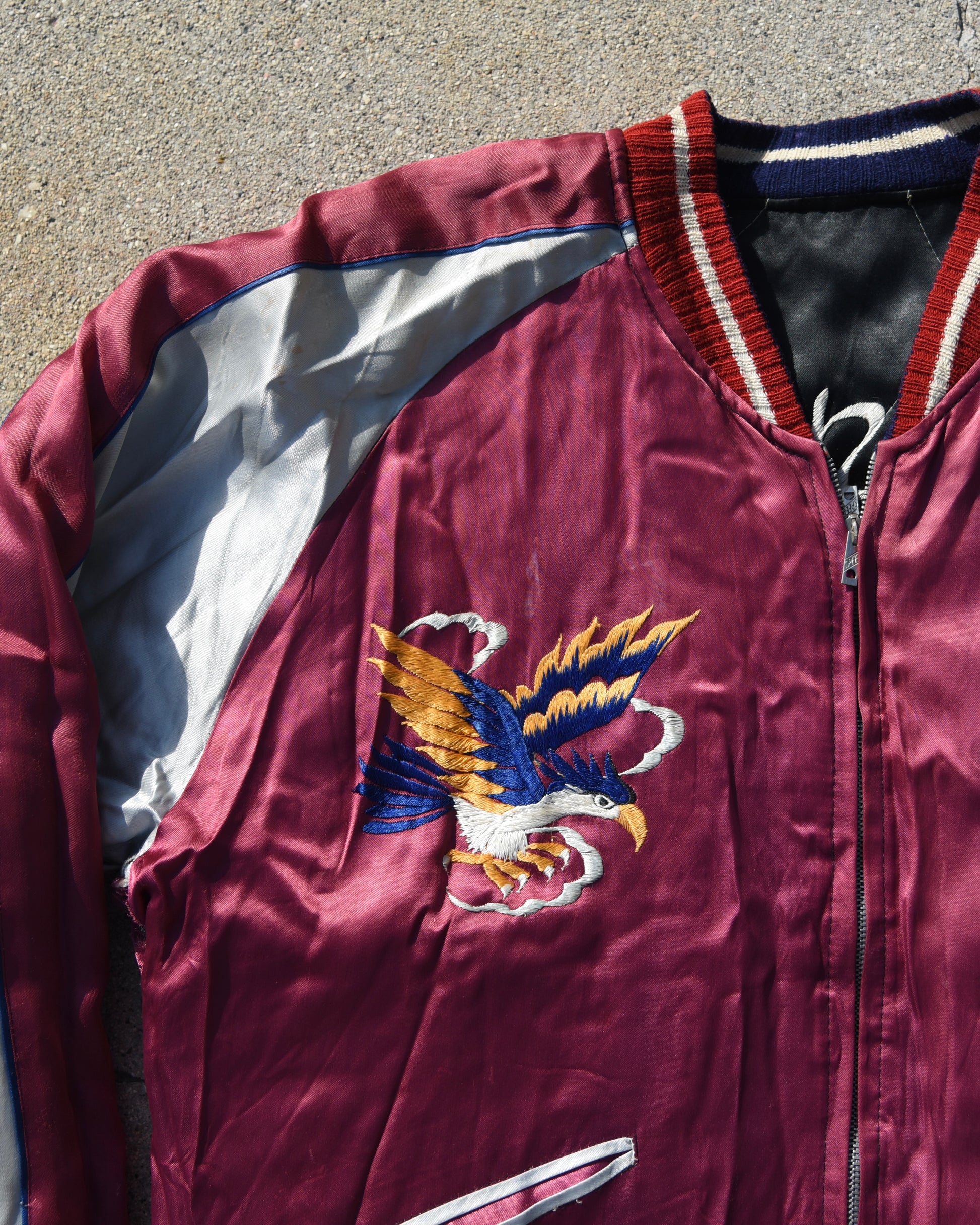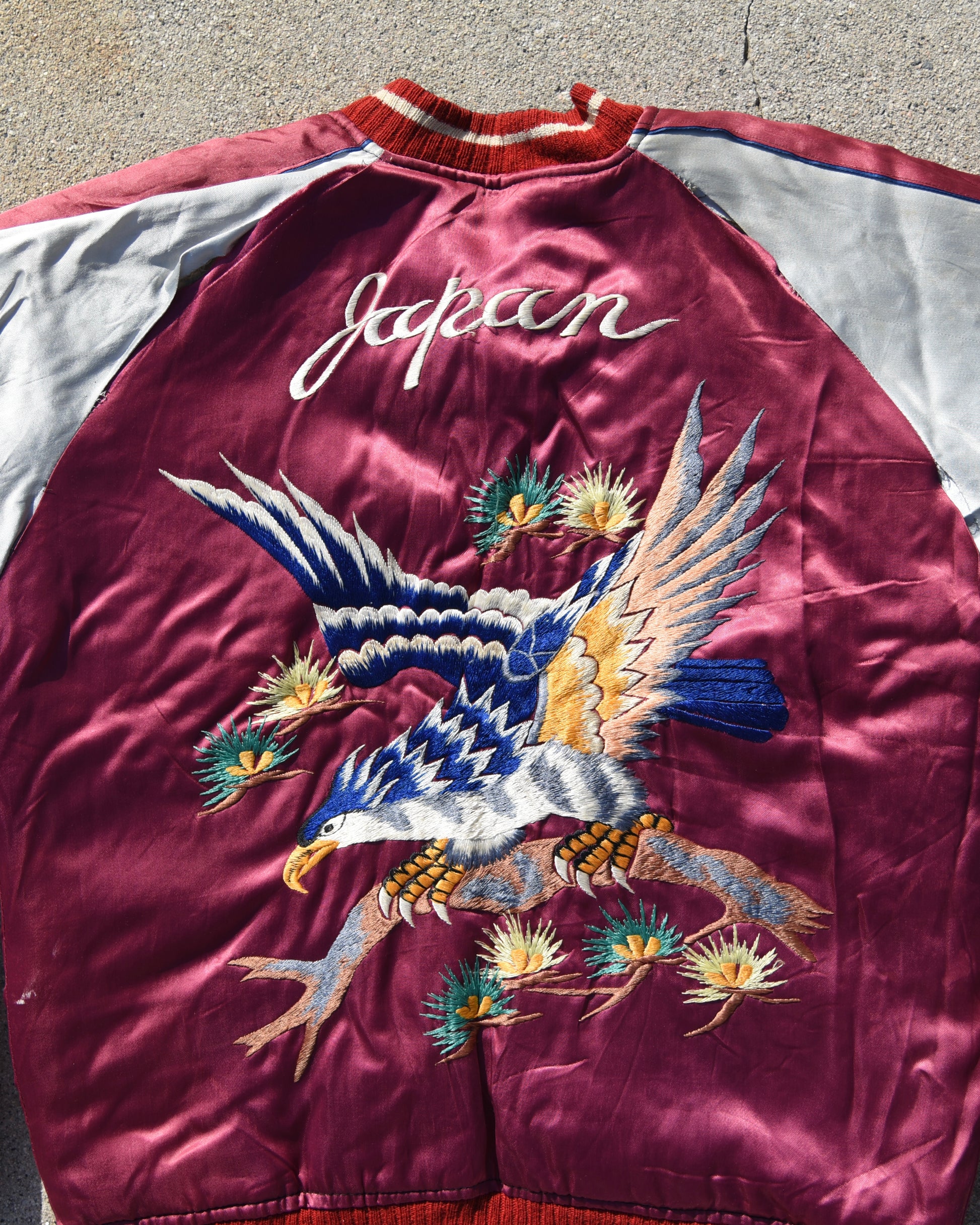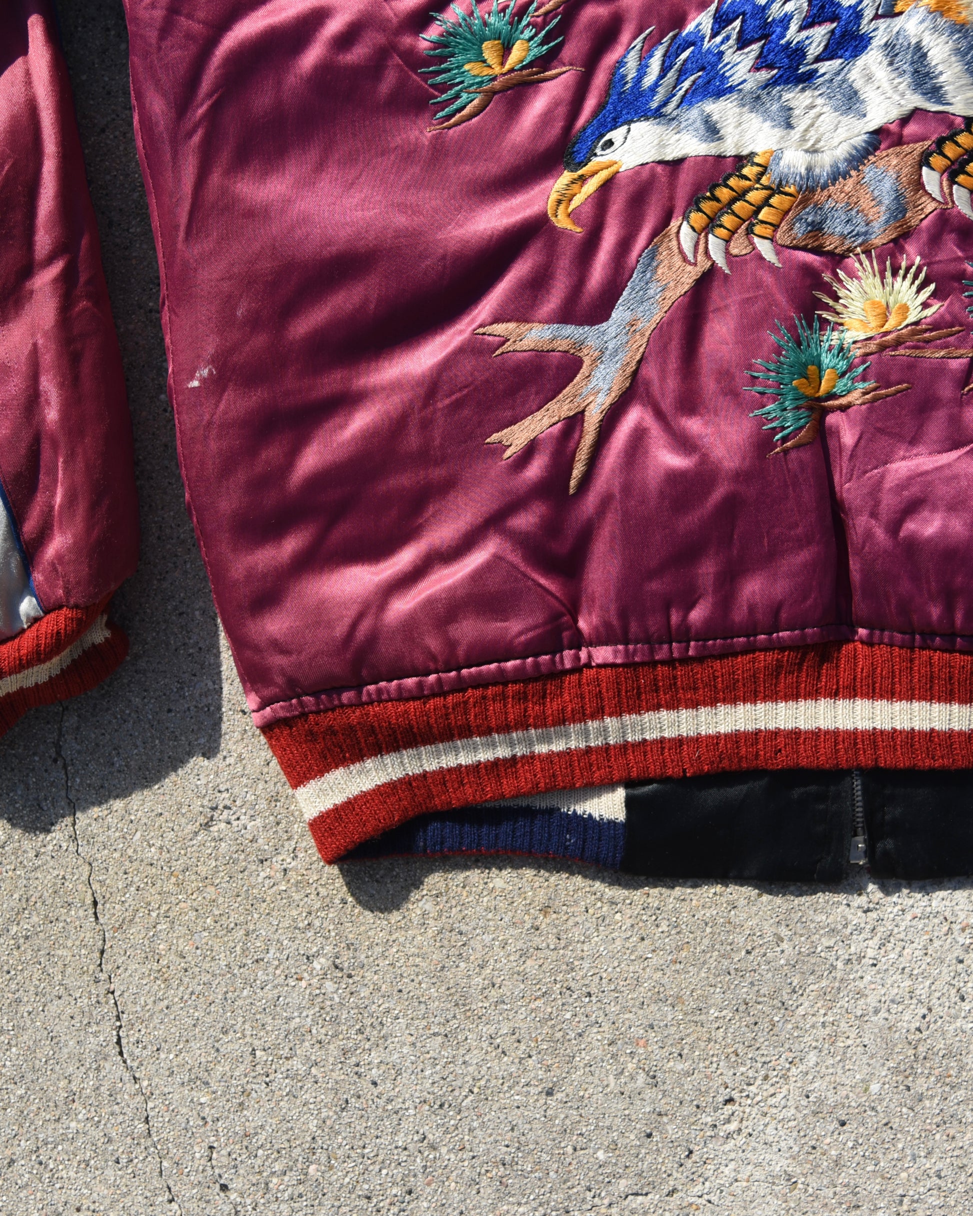 True vintage 1950s Japan Sukajan Reversible Jacket. Rare larger size of the Sukajan jackets. In good condition for its age but does have some signs of wear most notably on the red side of the jacket there are some seam splits and minor tears on one arm. Zipper works great. On original SPEED double sided zipper. Fits like a medium