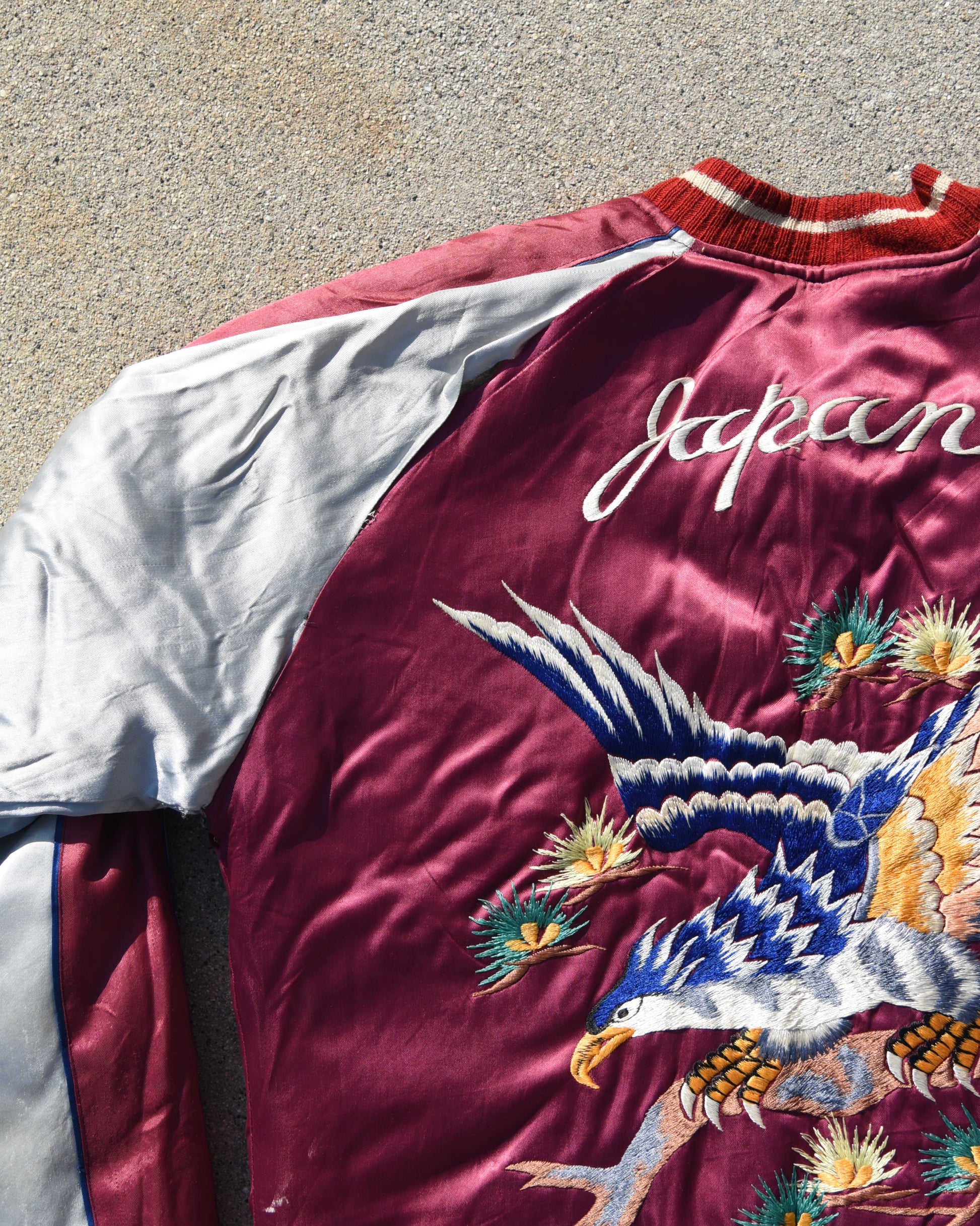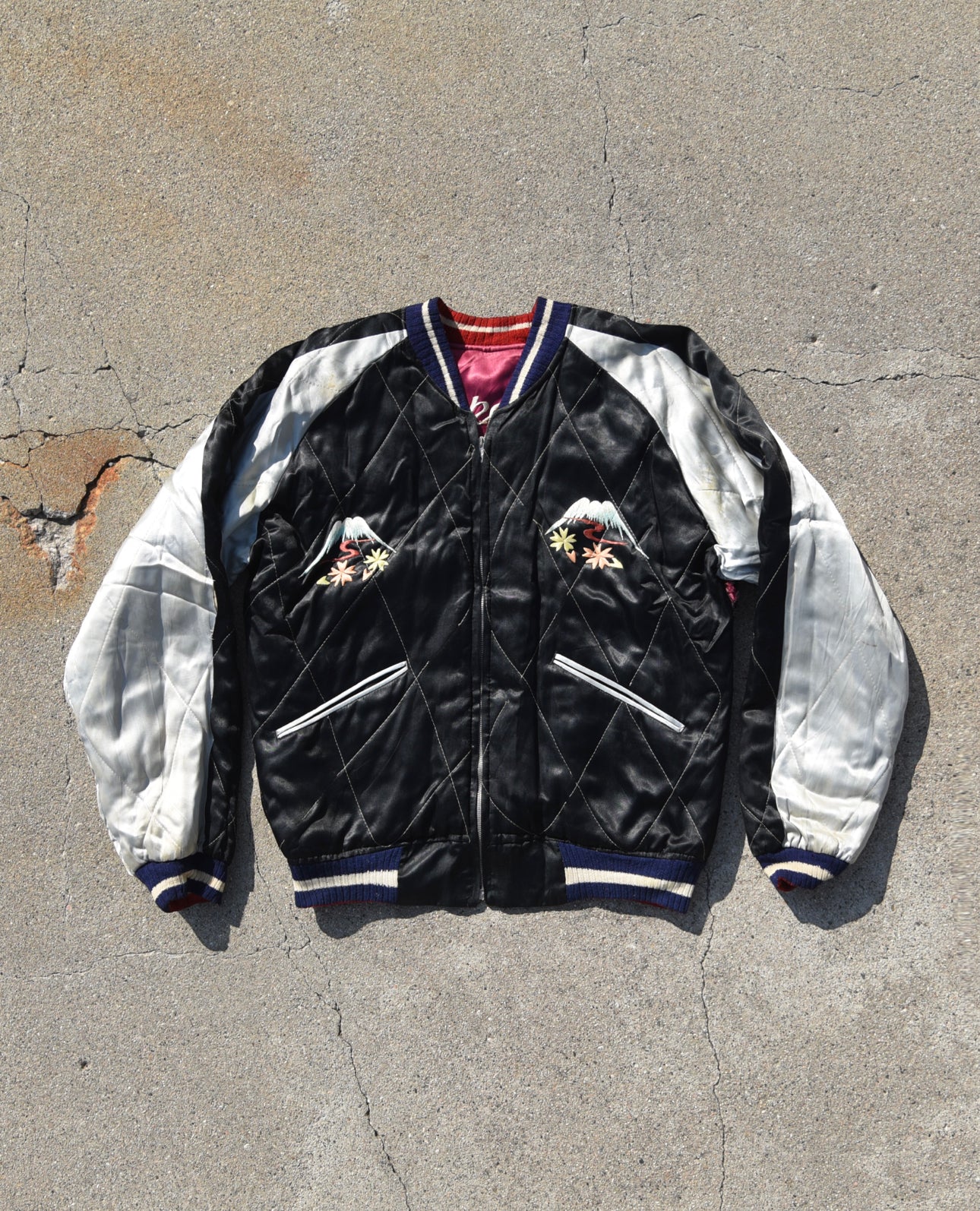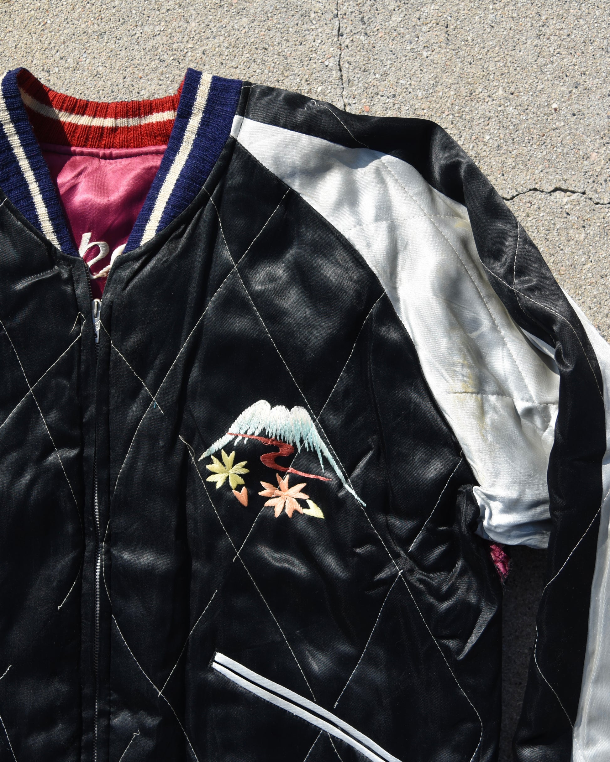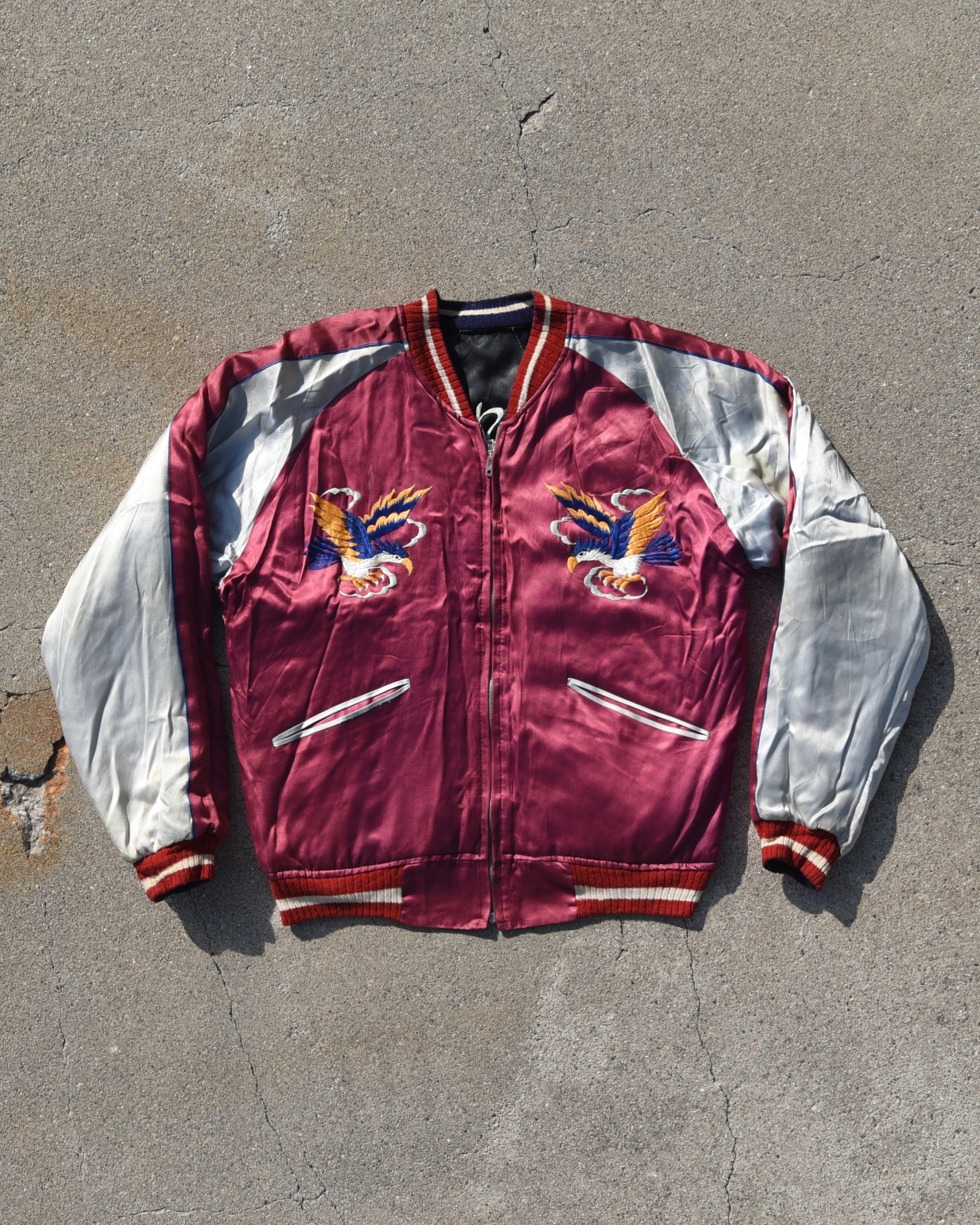 True vintage 1950s Japan Sukajan Reversible Jacket. Rare larger size of the Sukajan jackets. In good condition for its age but does have some signs of wear most notably on the red side of the jacket there are some seam splits and minor tears on one arm. Zipper works great. On original SPEED double sided zipper. Fits like a medium