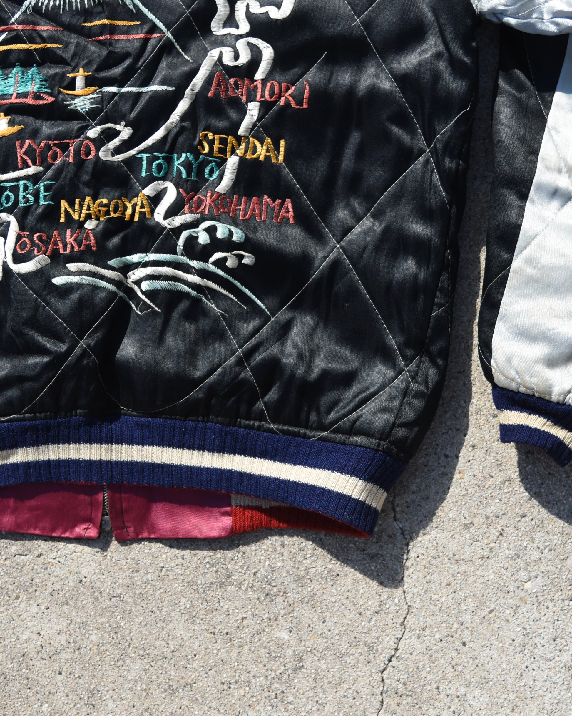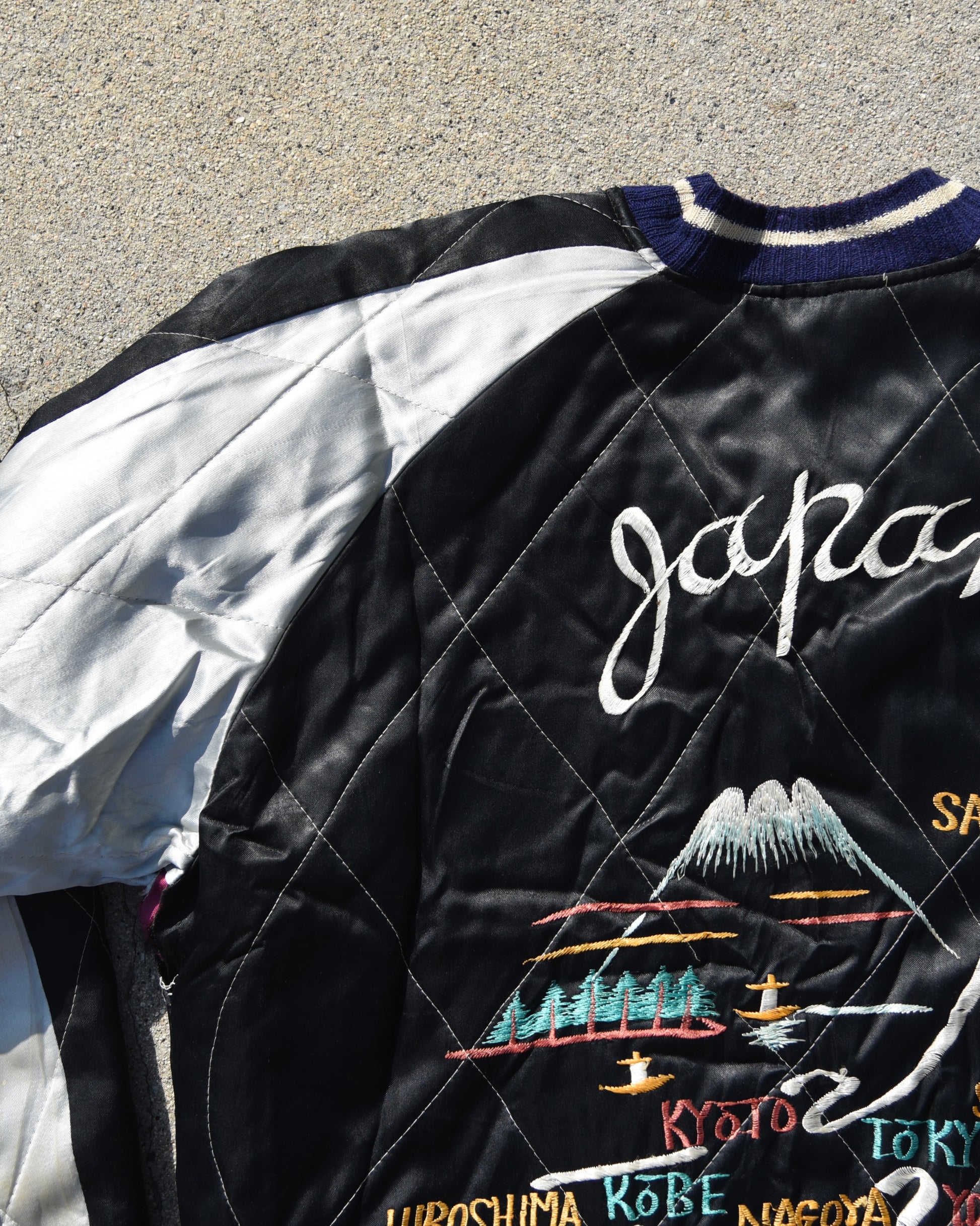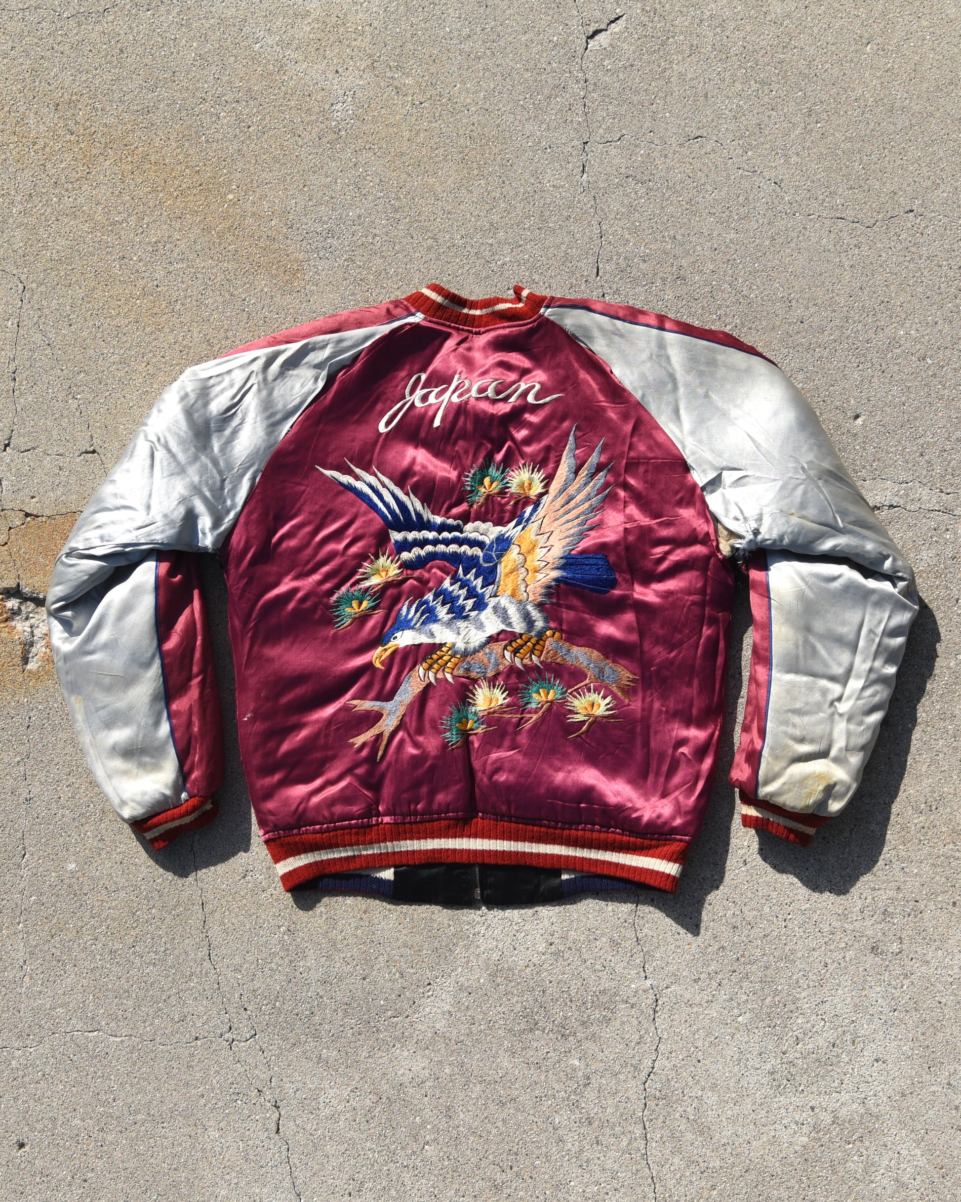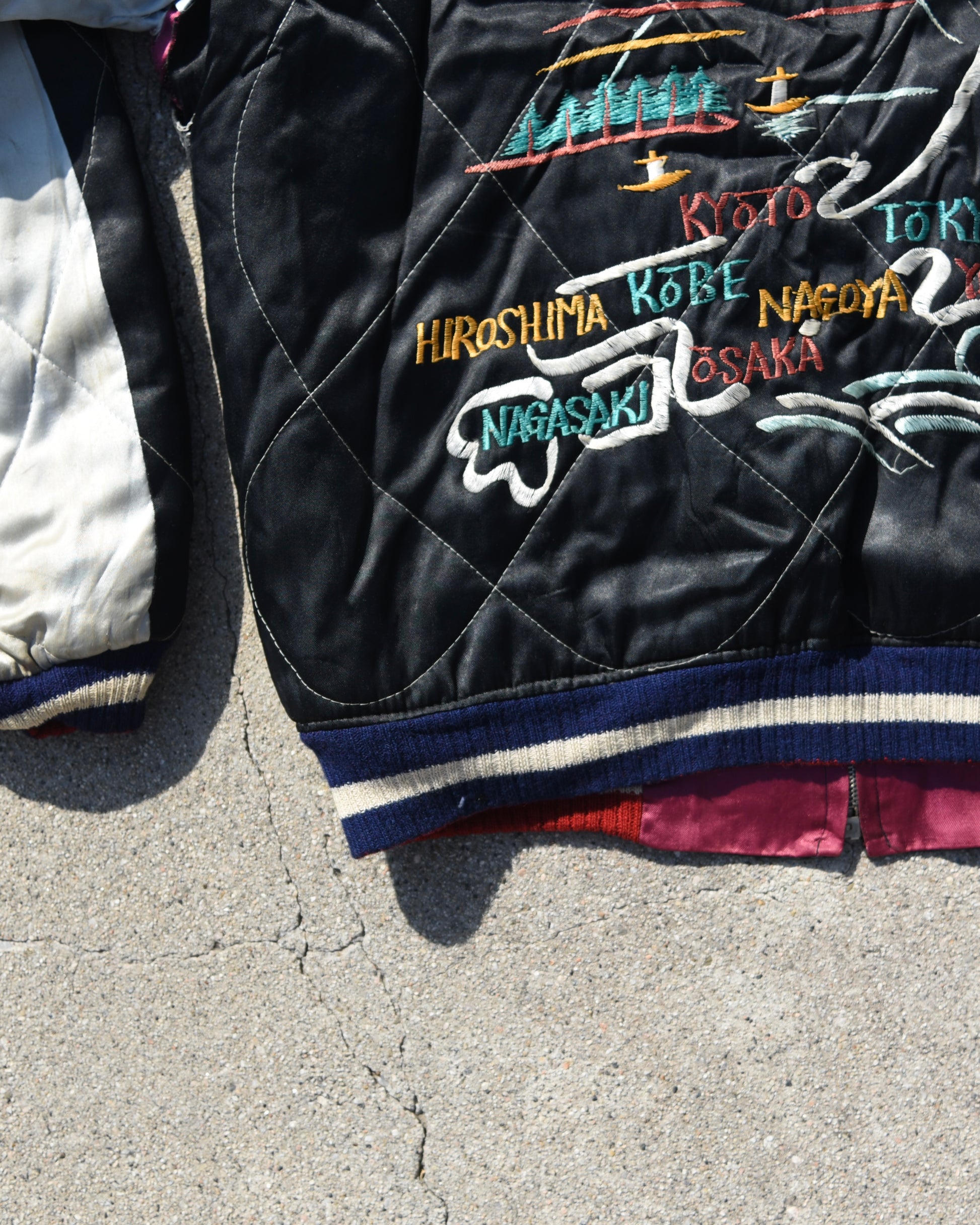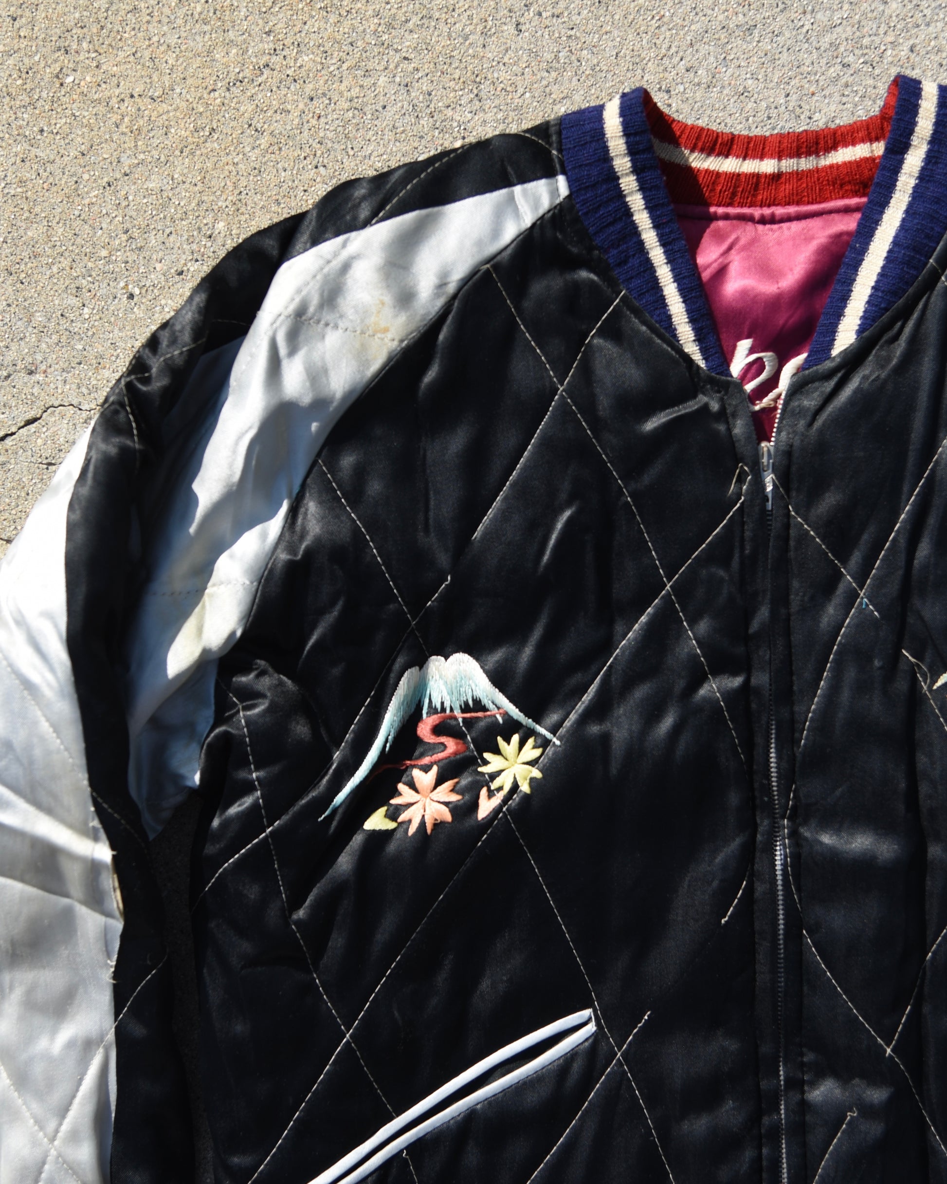 True vintage 1950s Japan Sukajan Reversible Jacket. Rare larger size of the Sukajan jackets. In good condition for its age but does have some signs of wear most notably on the red side of the jacket there are some seam splits and minor tears on one arm. Zipper works great. On original SPEED double sided zipper. Fits like a medium