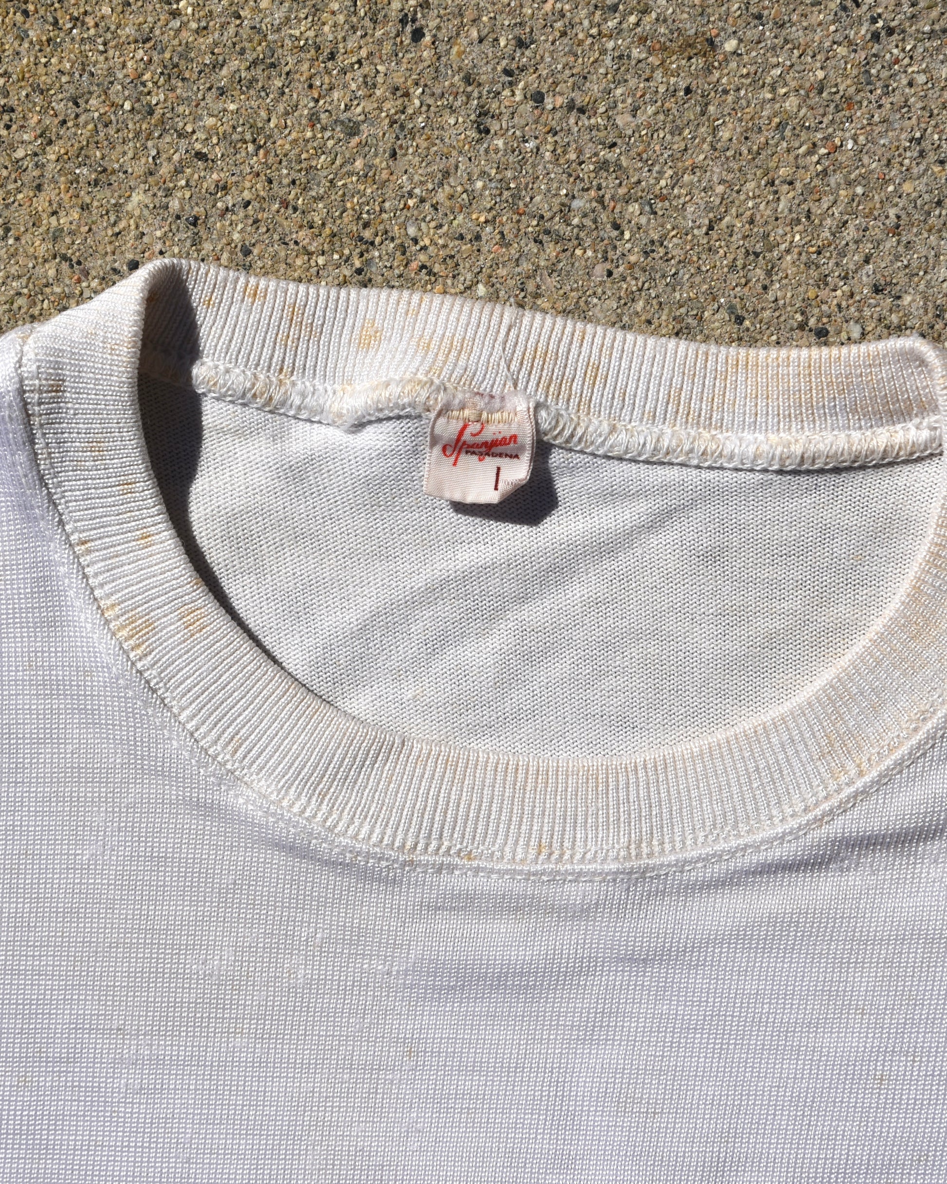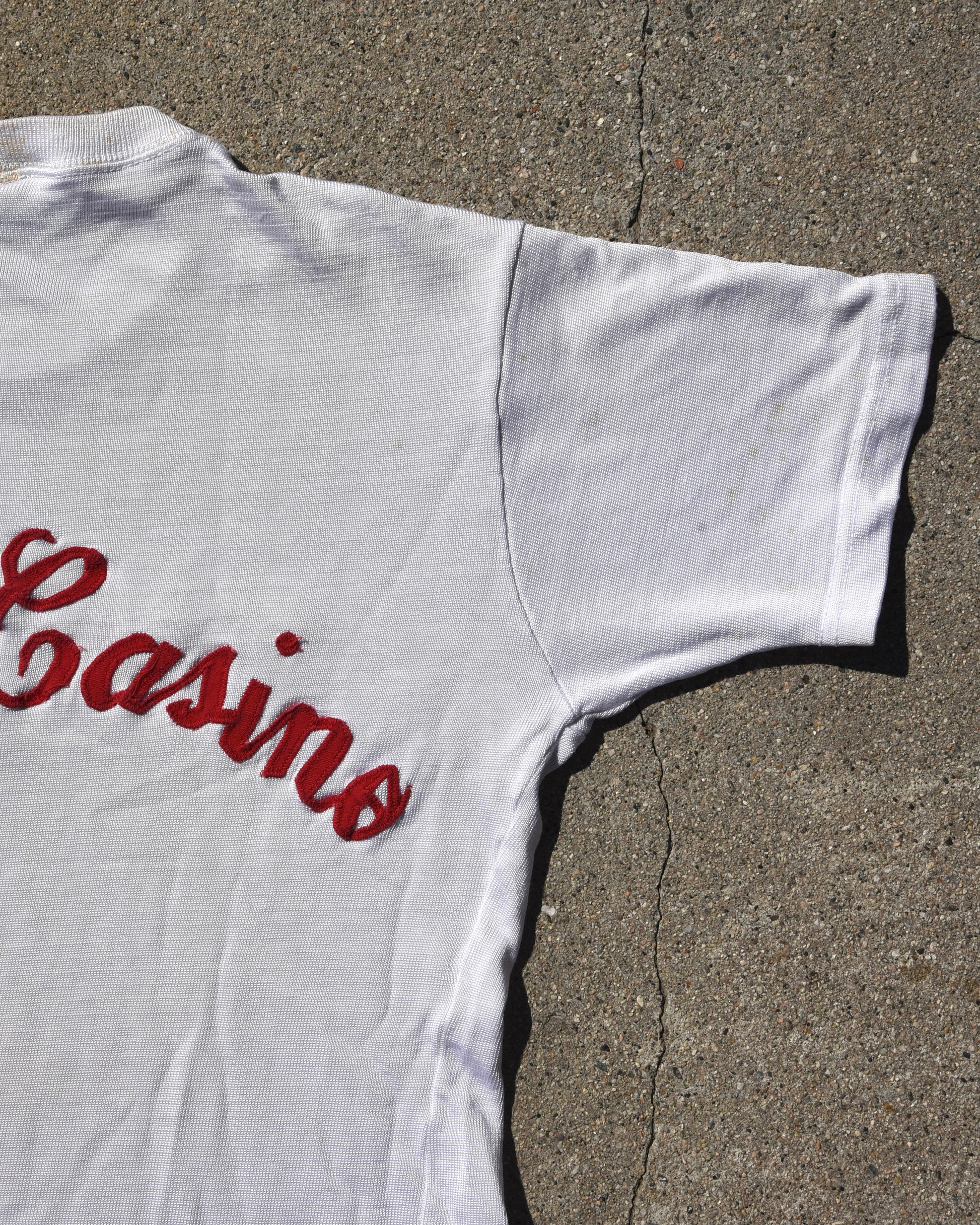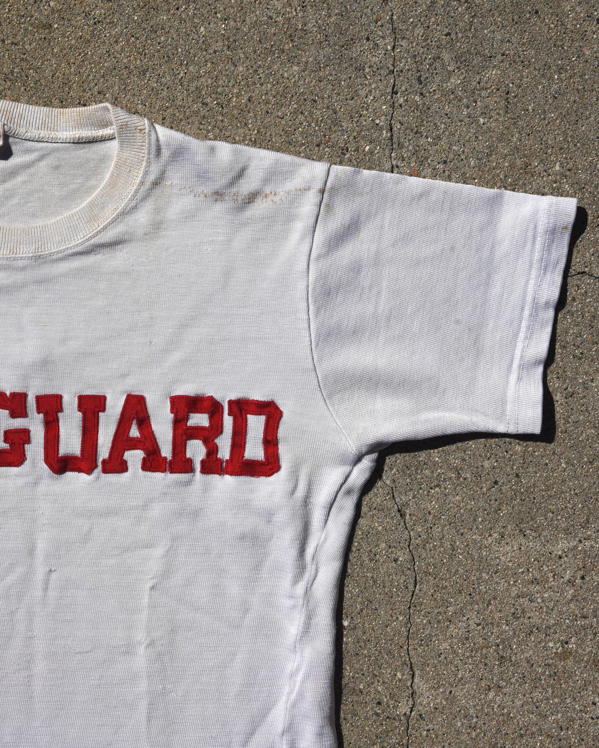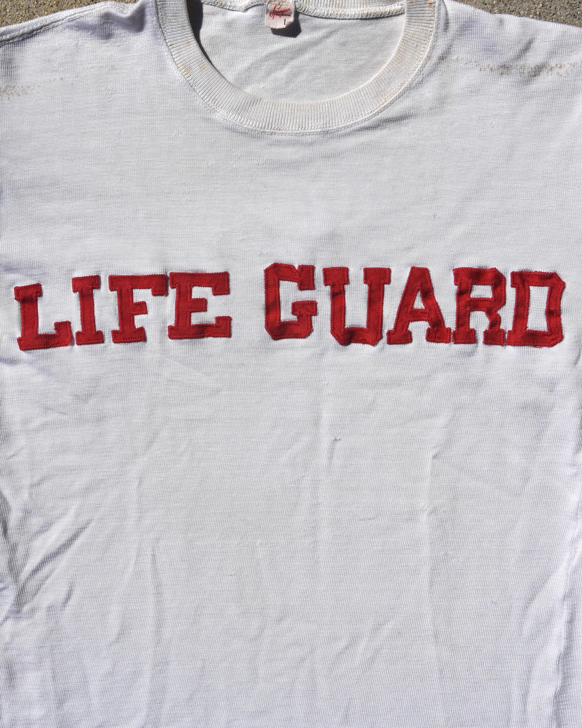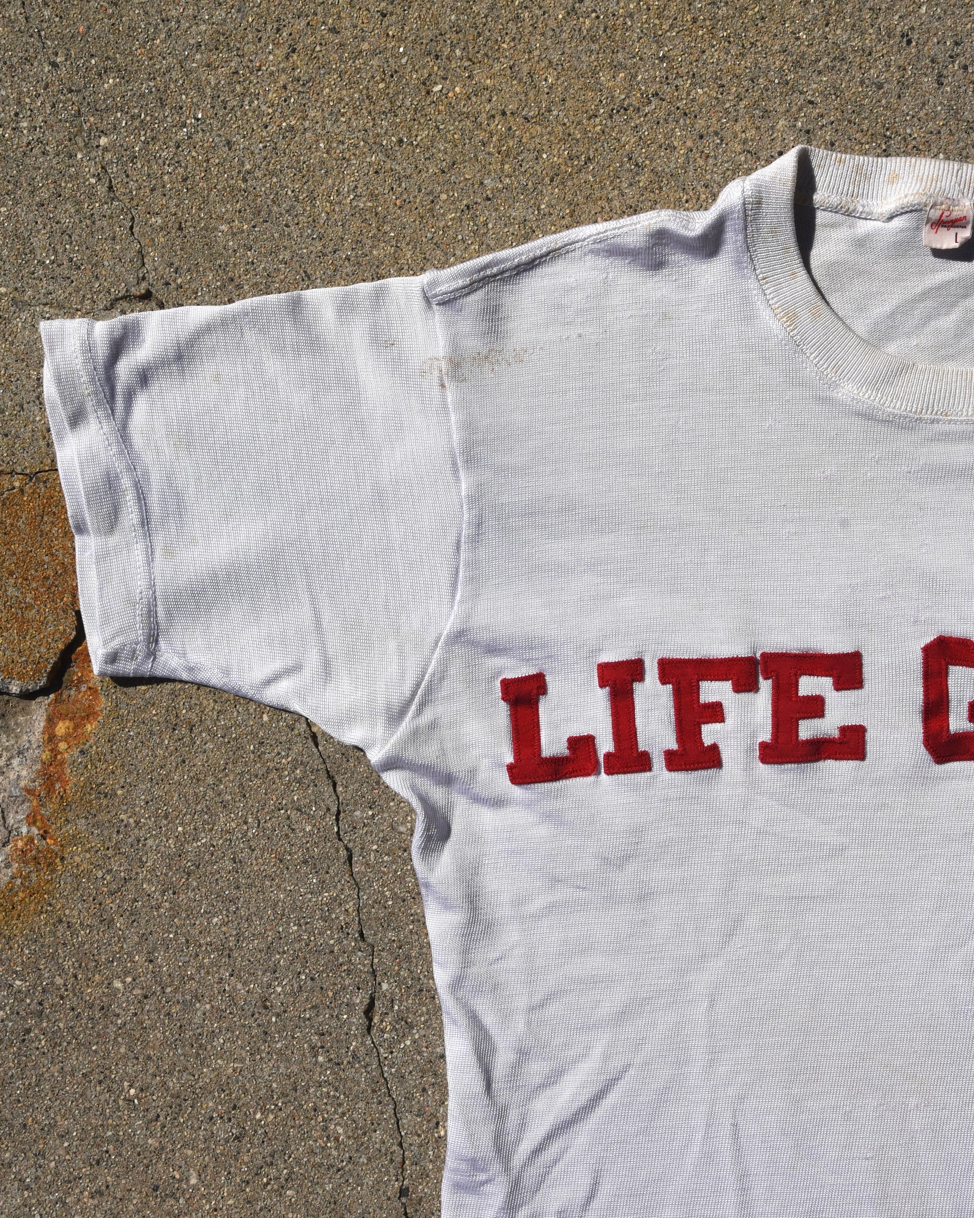 True vintage 1950s Life Guard / Coral Casino Durene Jersey. Minor signs of wear consistent with age throughout. Embroidered letters on front and back. On Spanjian tag, size large