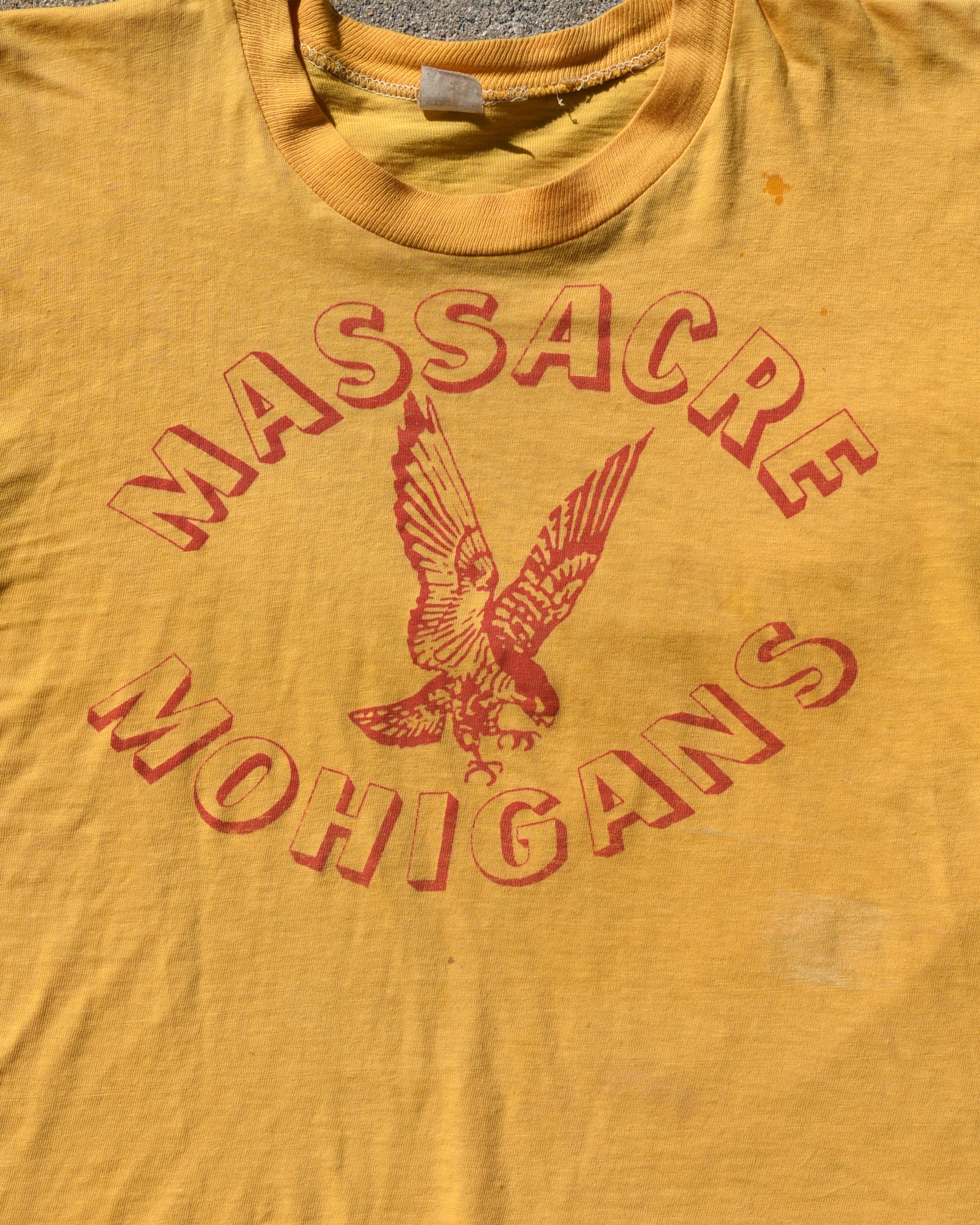 True vintage 1950s Mayo Spruce Massacre Mohigans Tshirt. In good condition overall for its age with only minor signs of wear throughout. On original Mayo Spruce tag, size medium