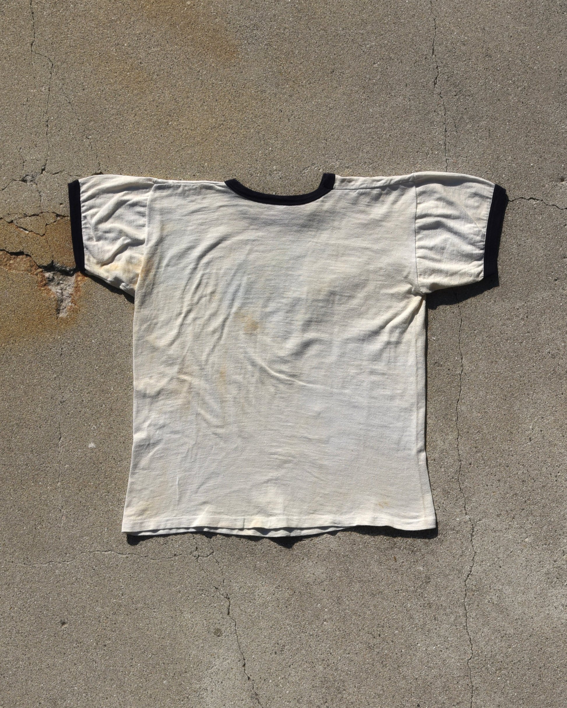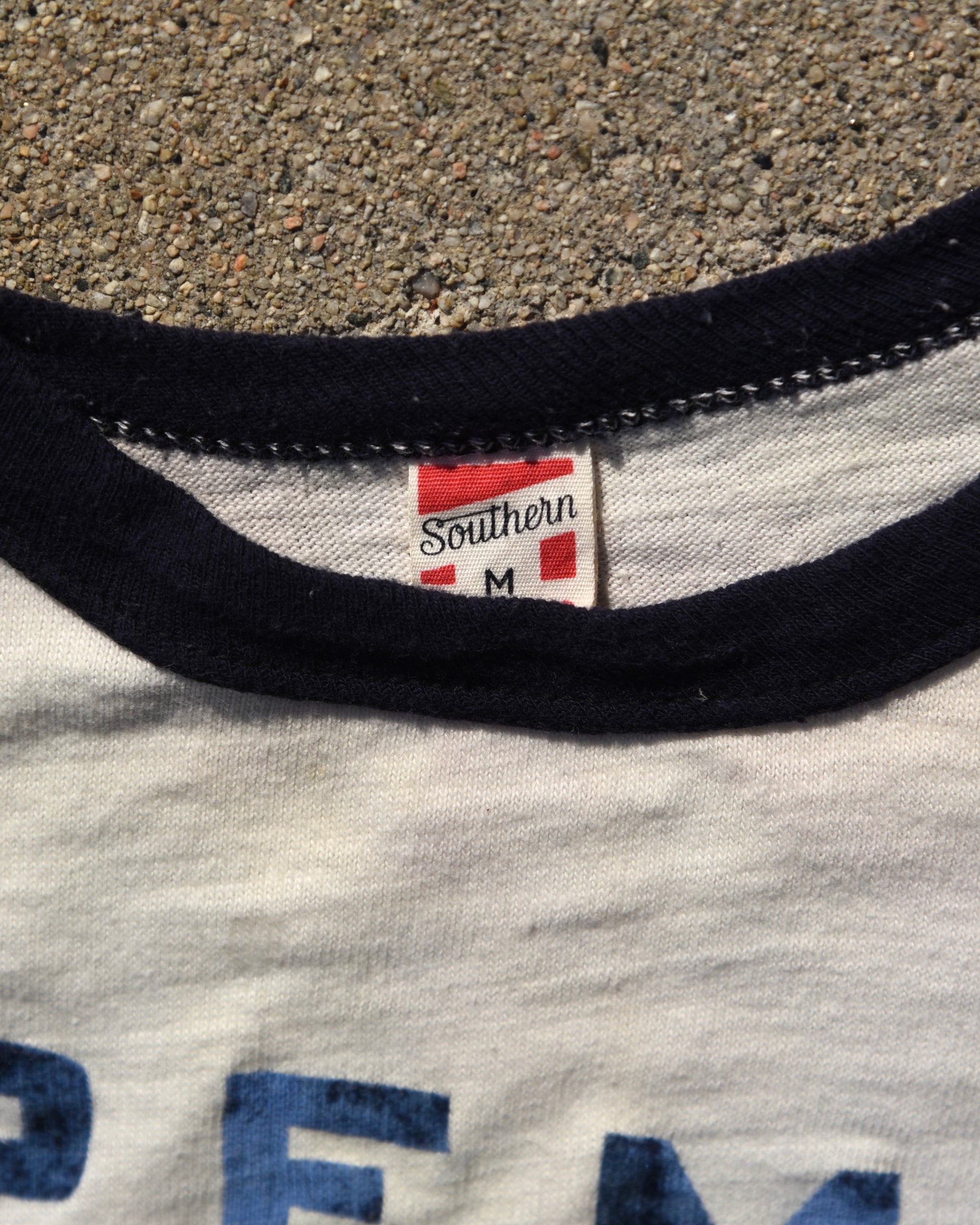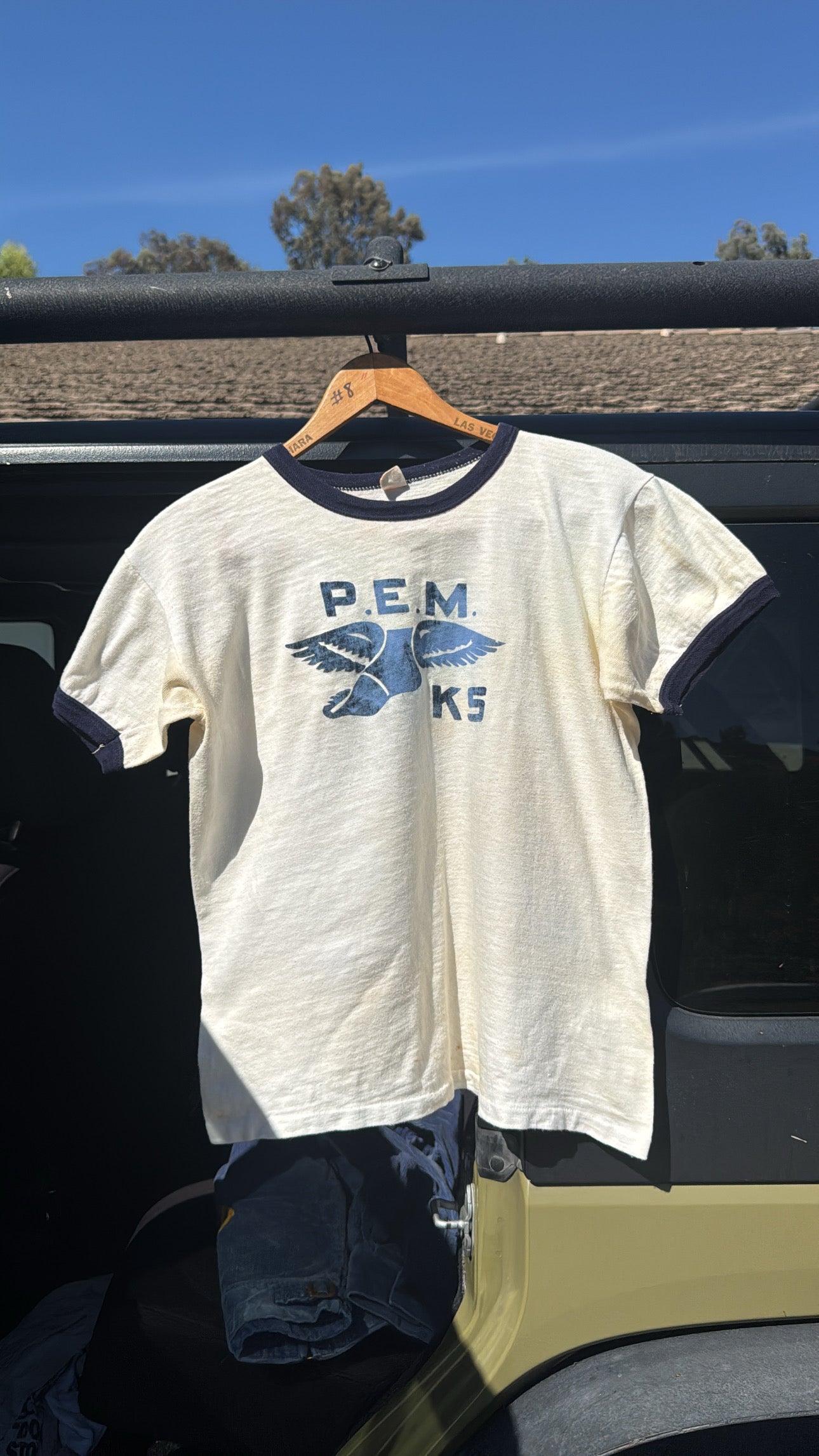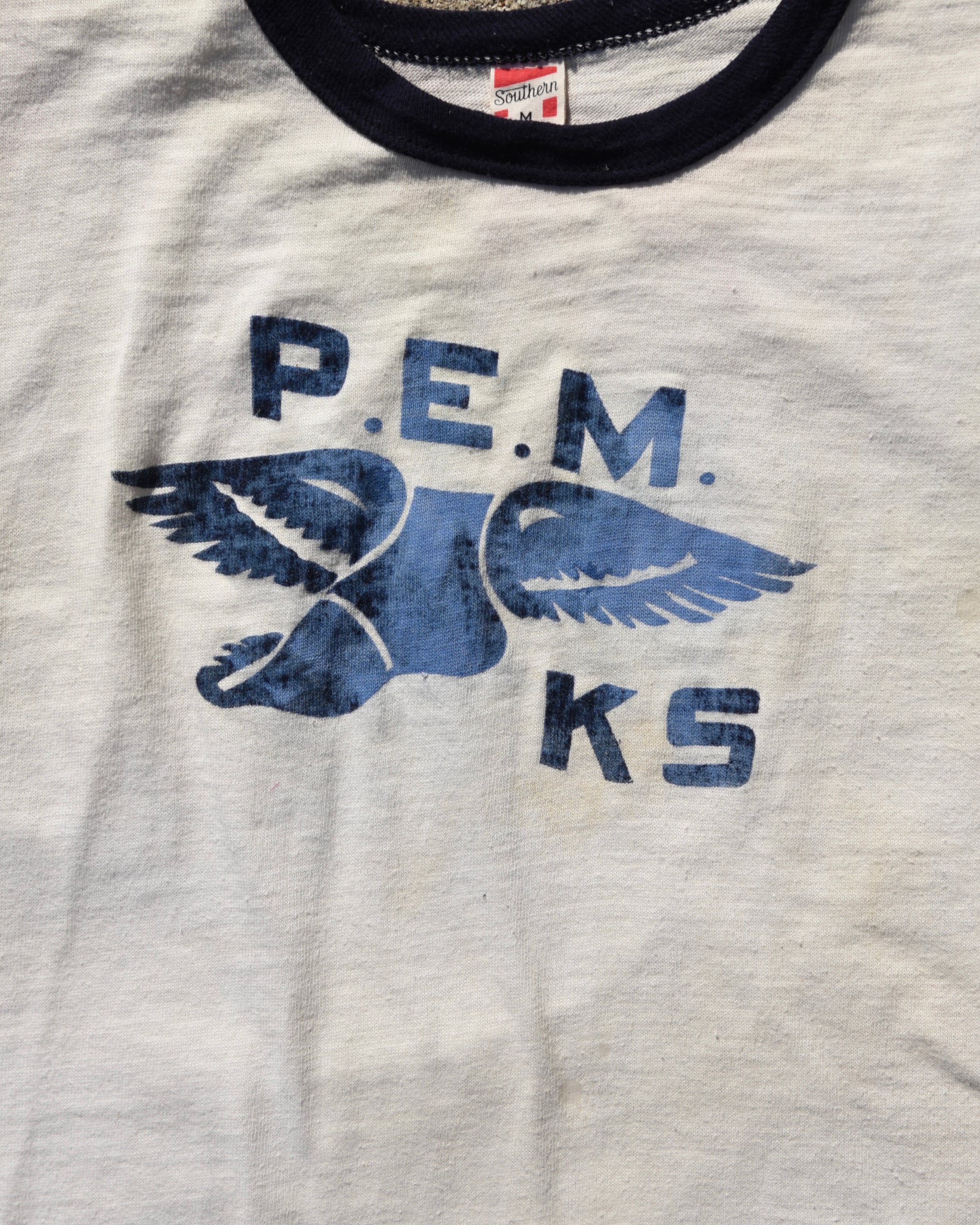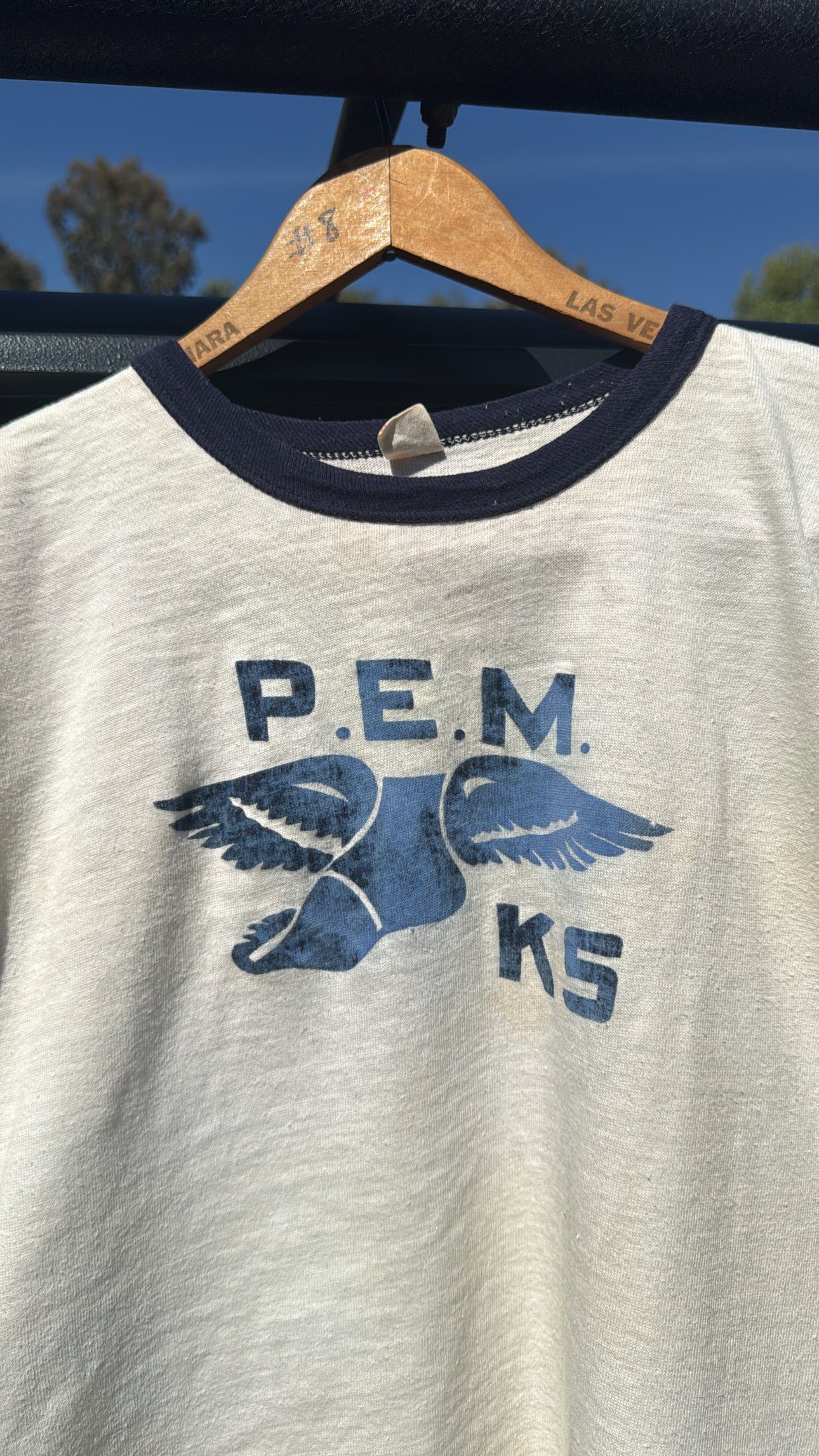 1950s PEM KS Flock Print Russell Southern Tshirt. Ringer style sleeves and collar. Tee is a heavy cotton almost feels like a jersey. Flock Print graphic that is fading in a really cool way. Tagged size medium, boxy fit