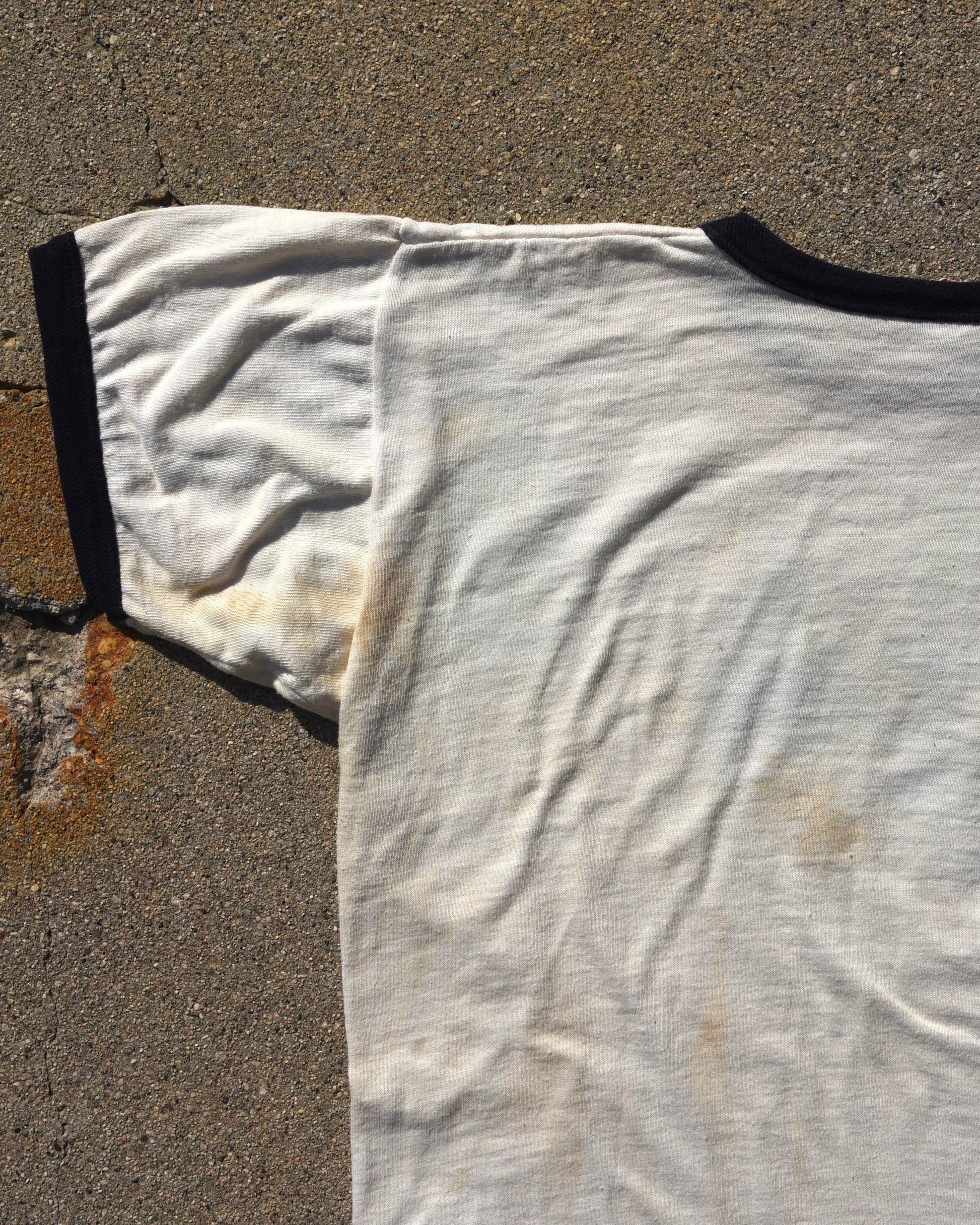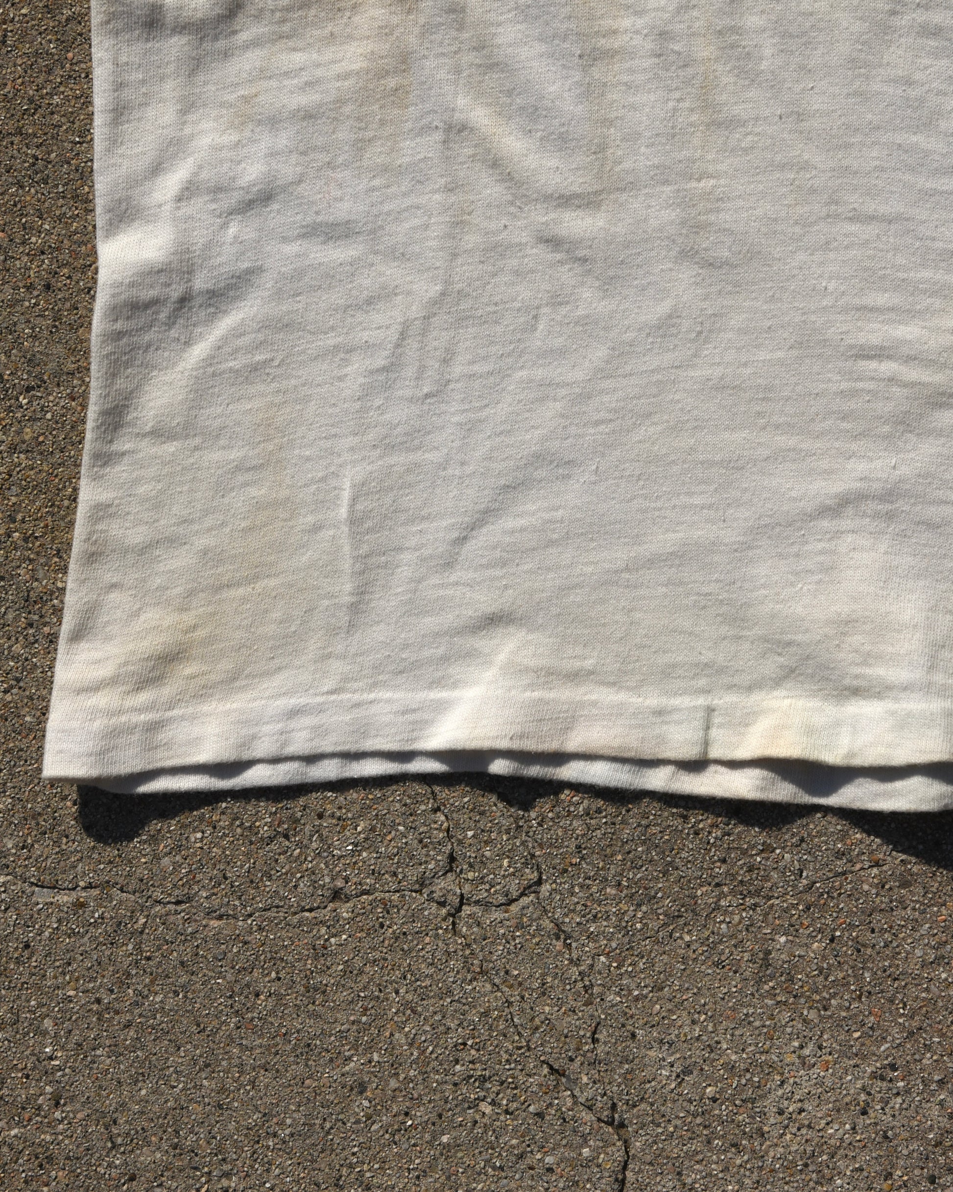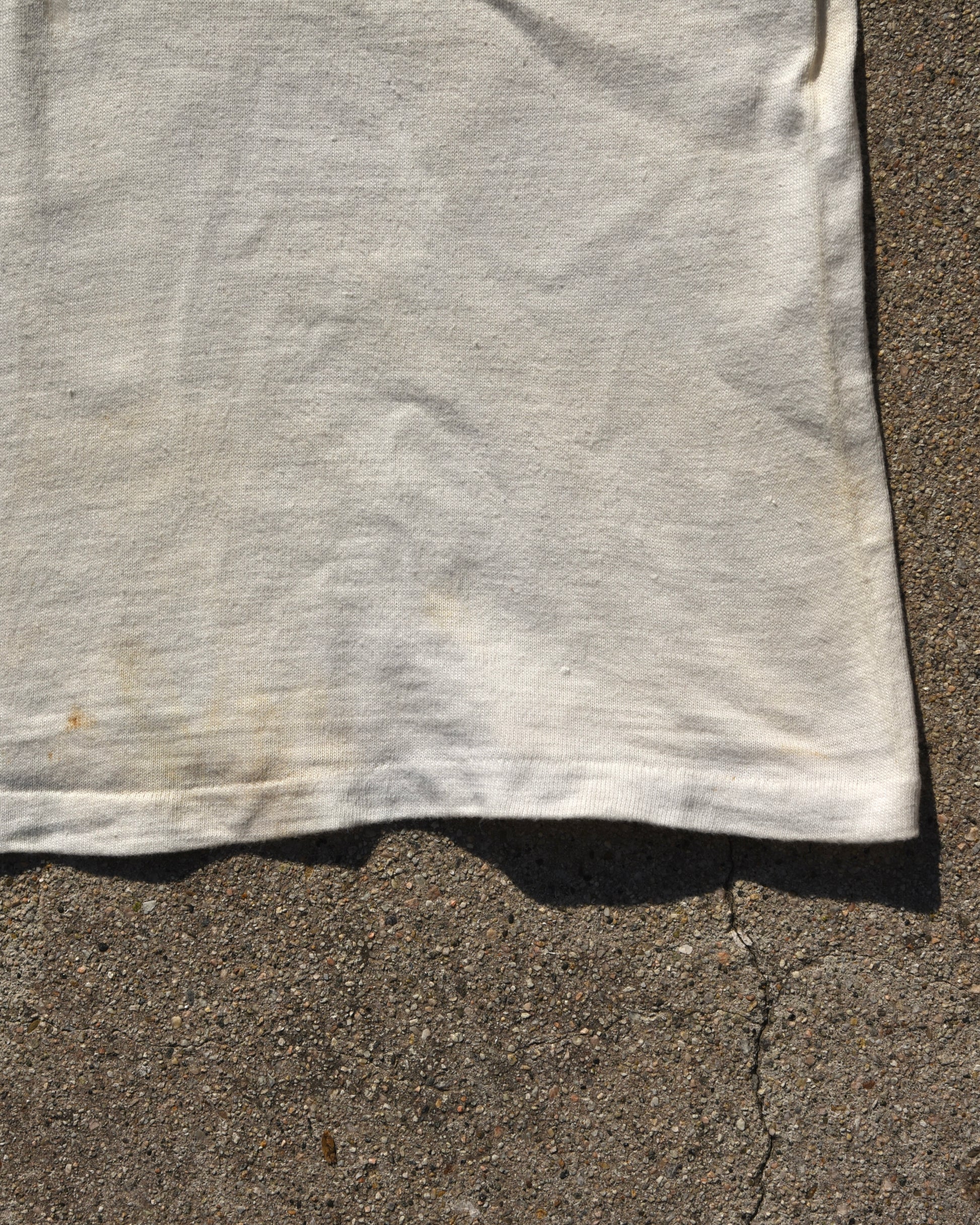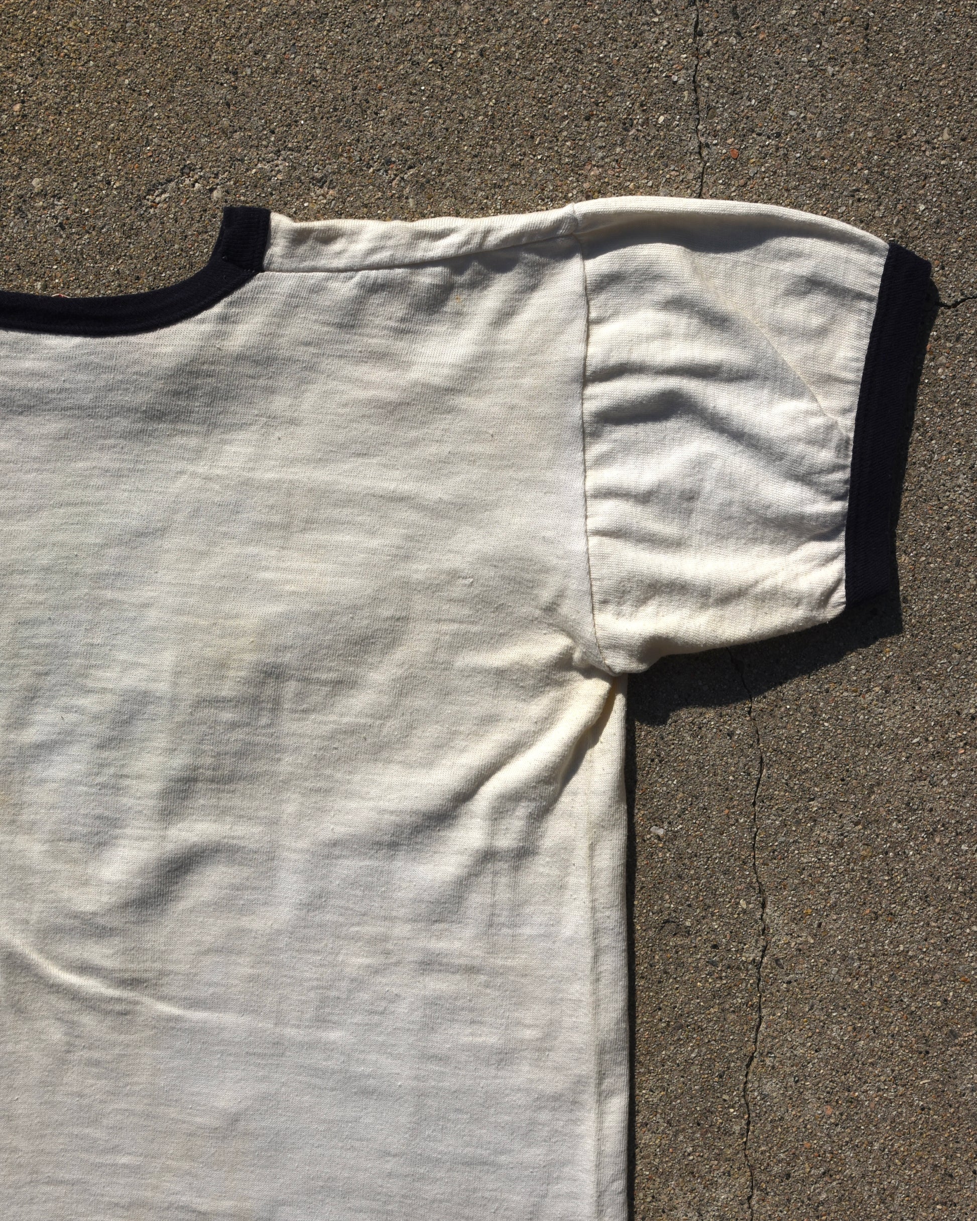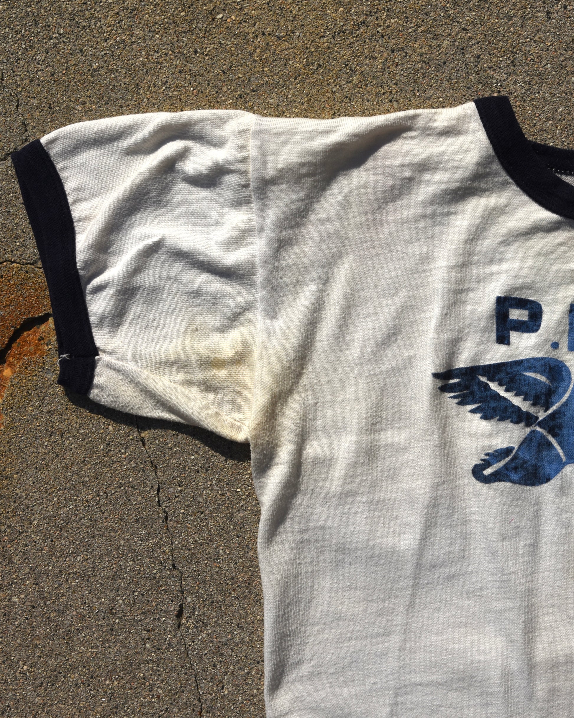 1950s PEM KS Flock Print Russell Southern Tshirt. Ringer style sleeves and collar. Tee is a heavy cotton almost feels like a jersey. Flock Print graphic that is fading in a really cool way. Tagged size medium, boxy fit