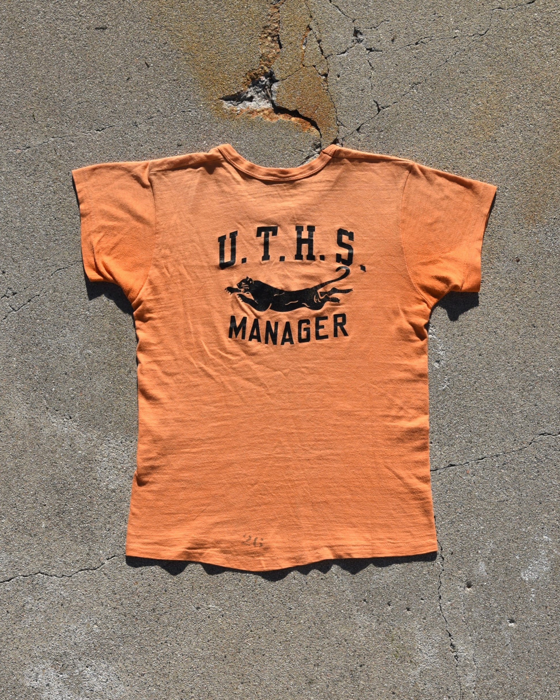 True vintage 1950s UTHS Manager Tshirt. Sun faded all throughout. Graphic is on the back, front is blank. Tagged size medium