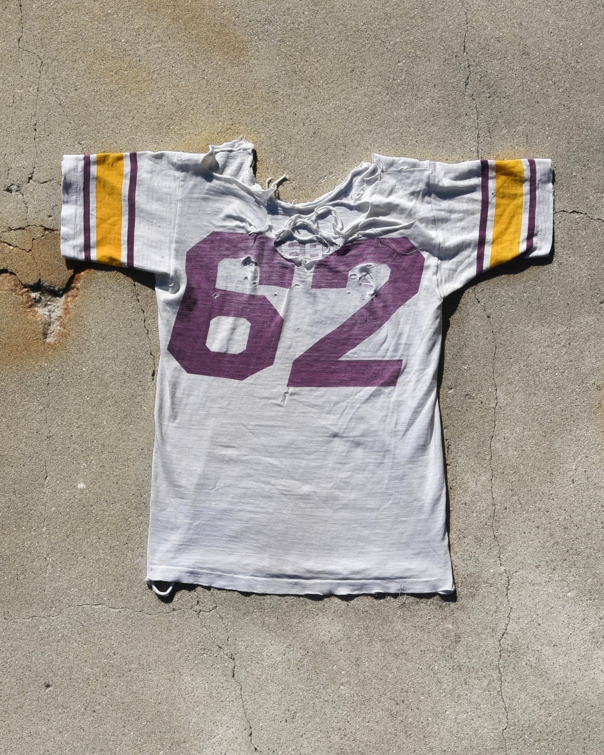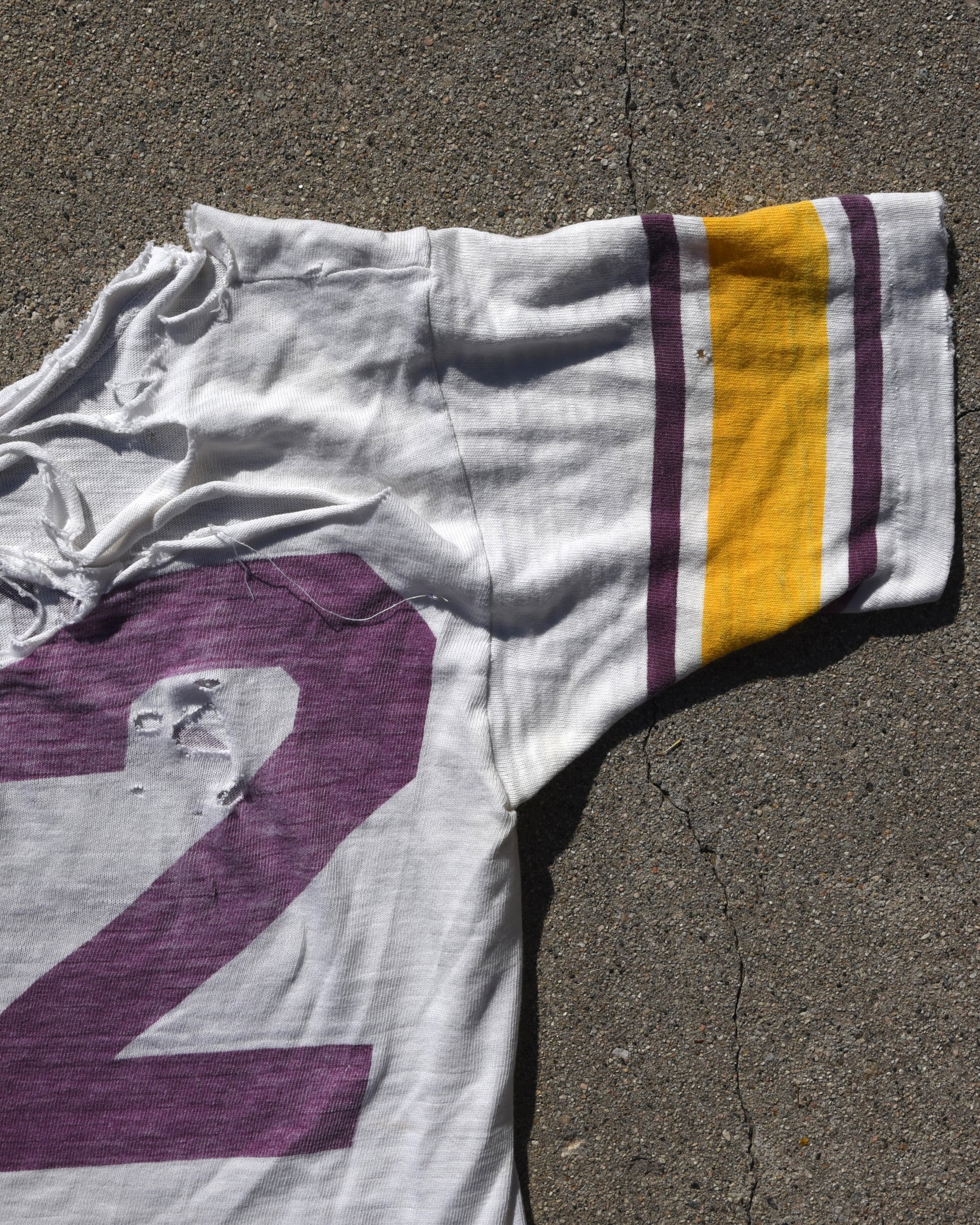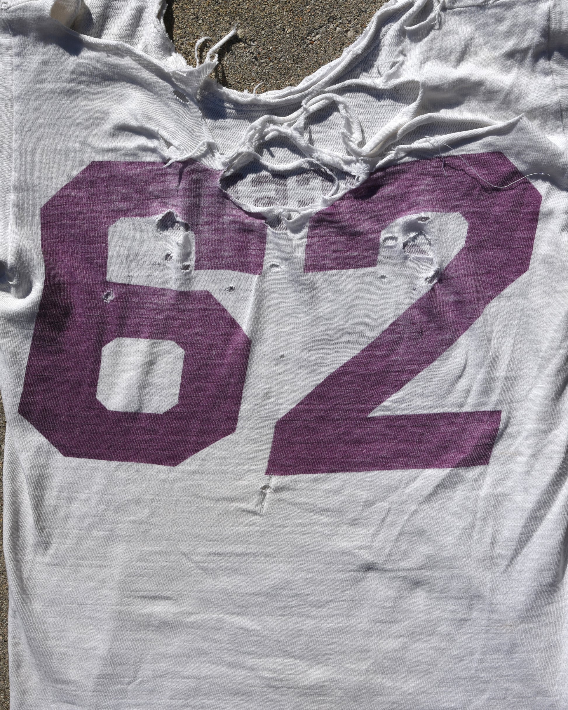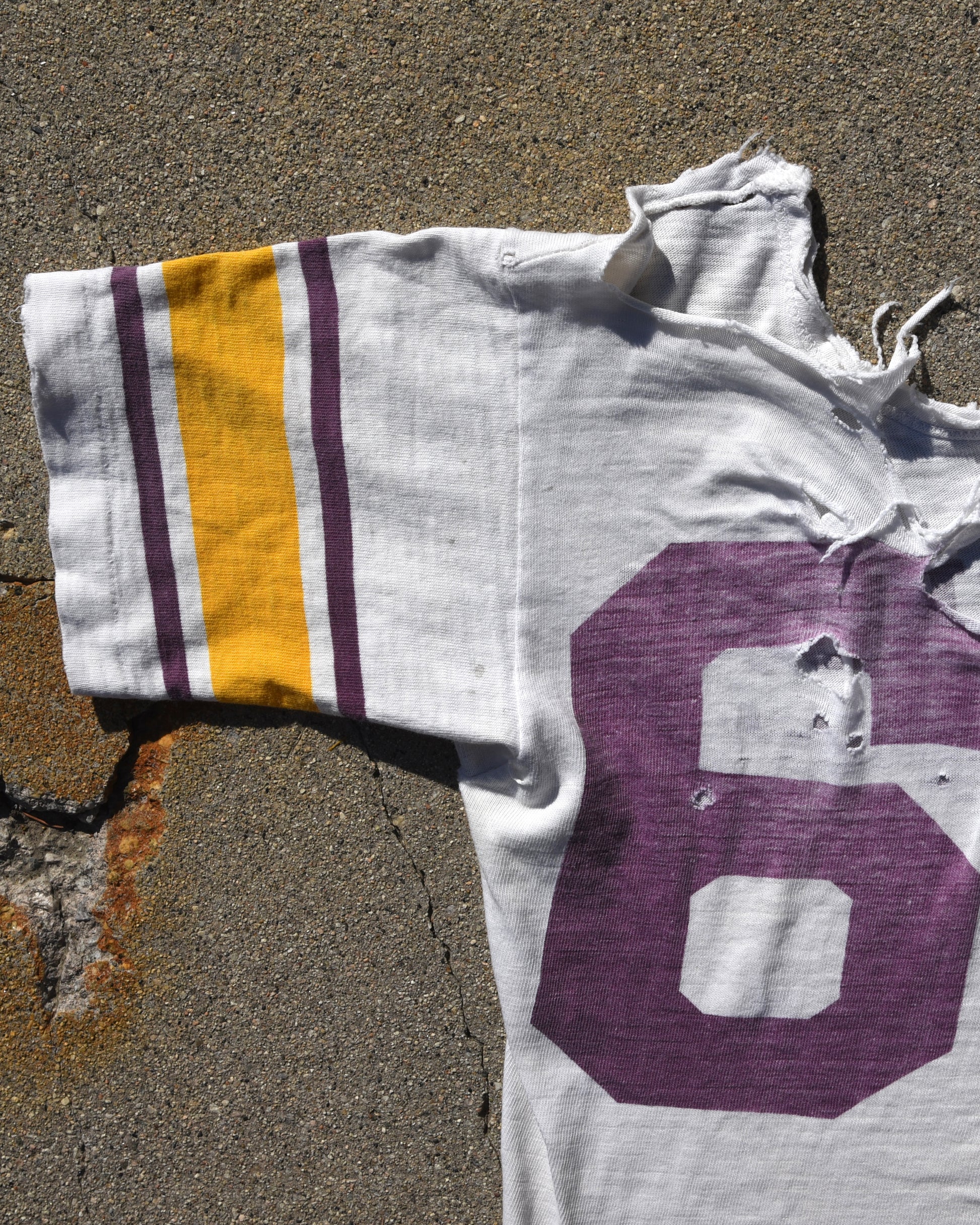 Vintage 1950s Thrashed football jersey. Heavily distressed on the collar especially on the back. No tag, but almost positive this is a 50s champion jersey as I found it with a handful of other champion jerseys from that era. Fits like a medium