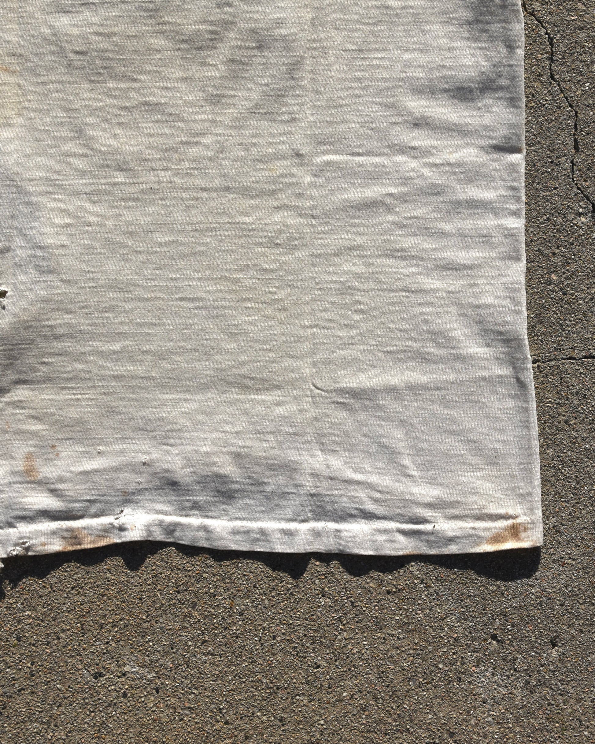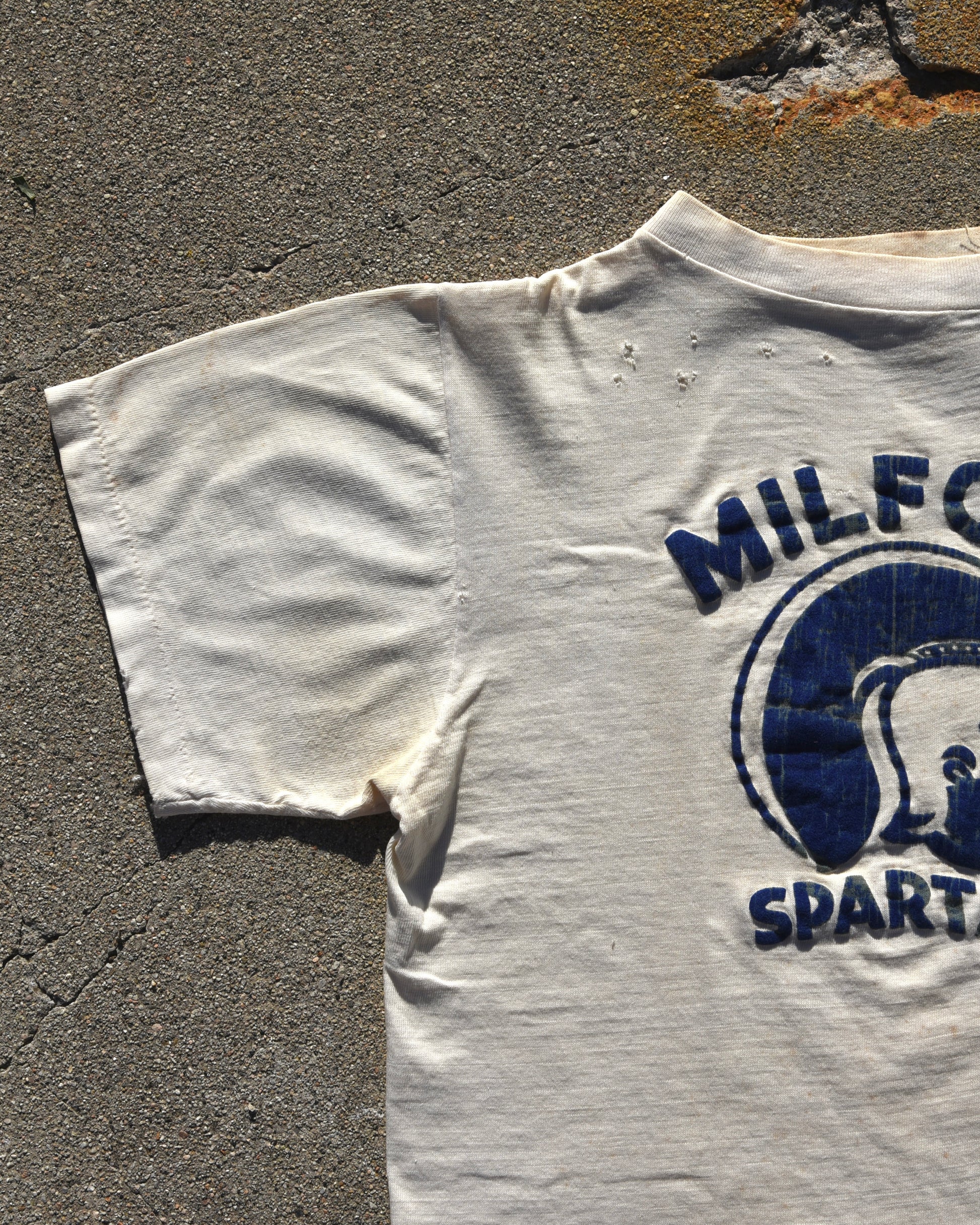 True vintage 1950s Milford Spartans Tshirt. Flock print. Thrashed heavily all throughout. On a Hampton tag, size medium