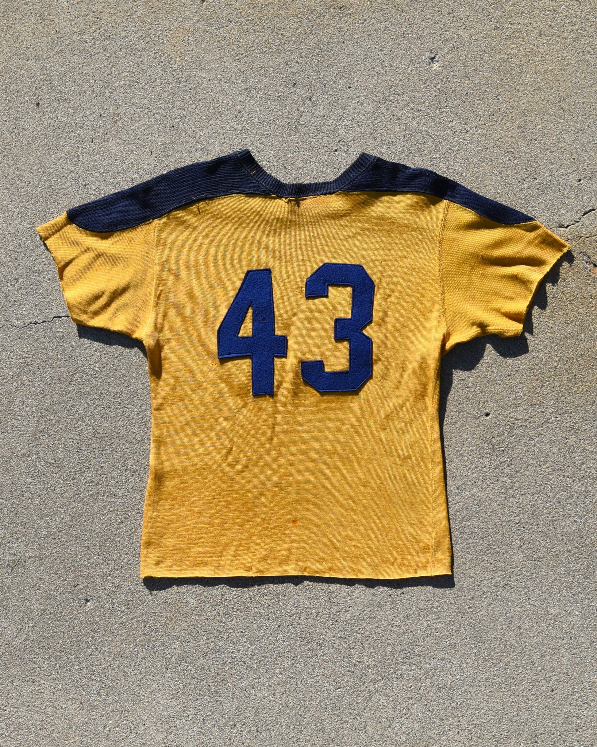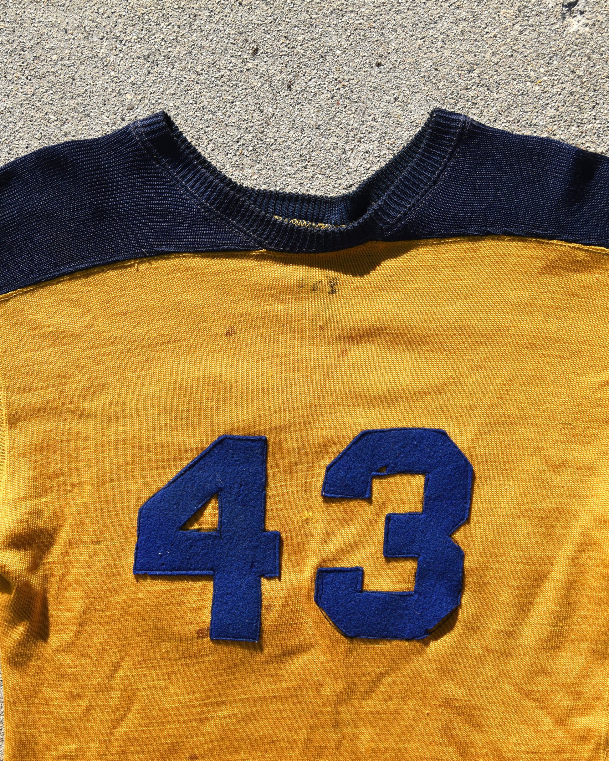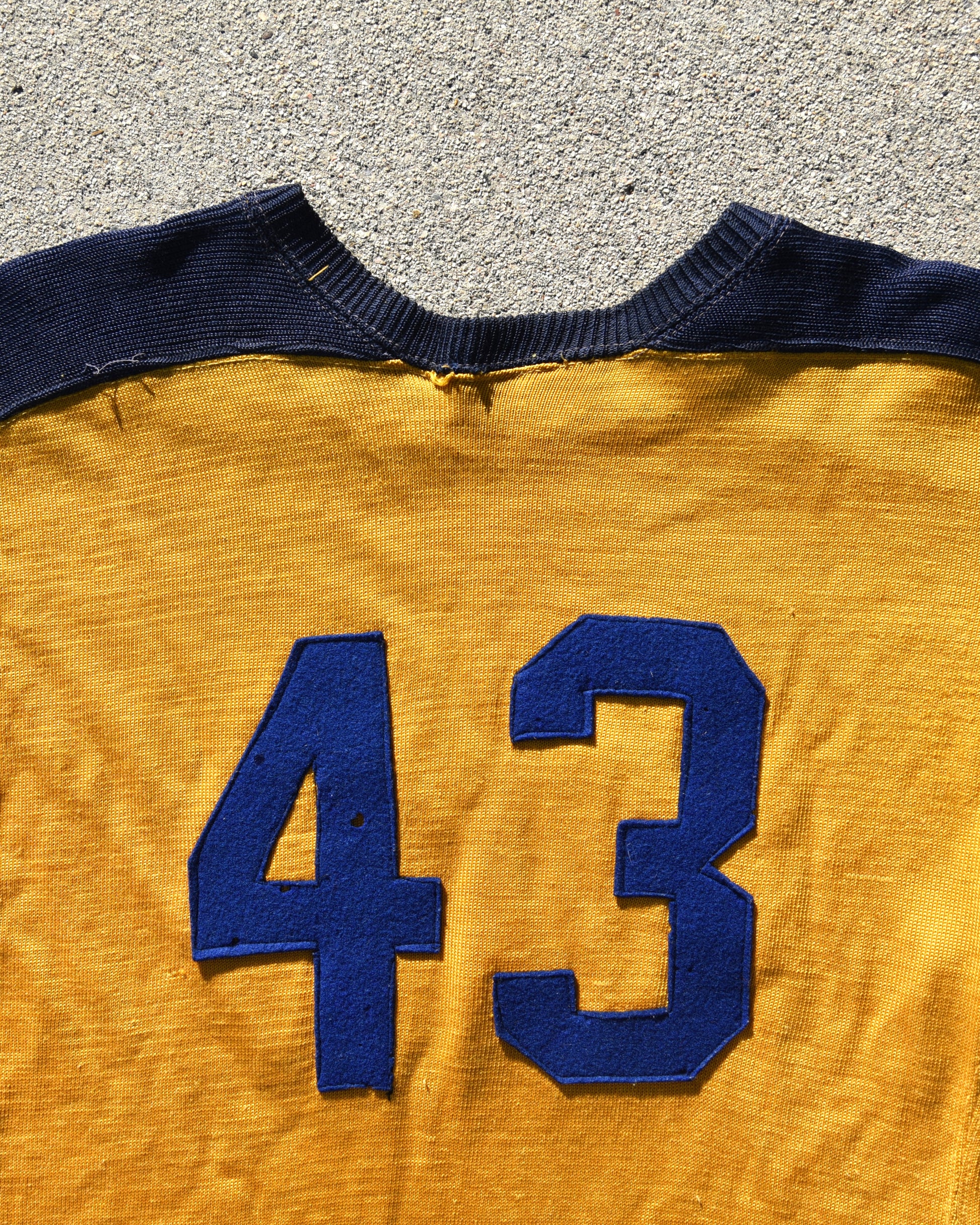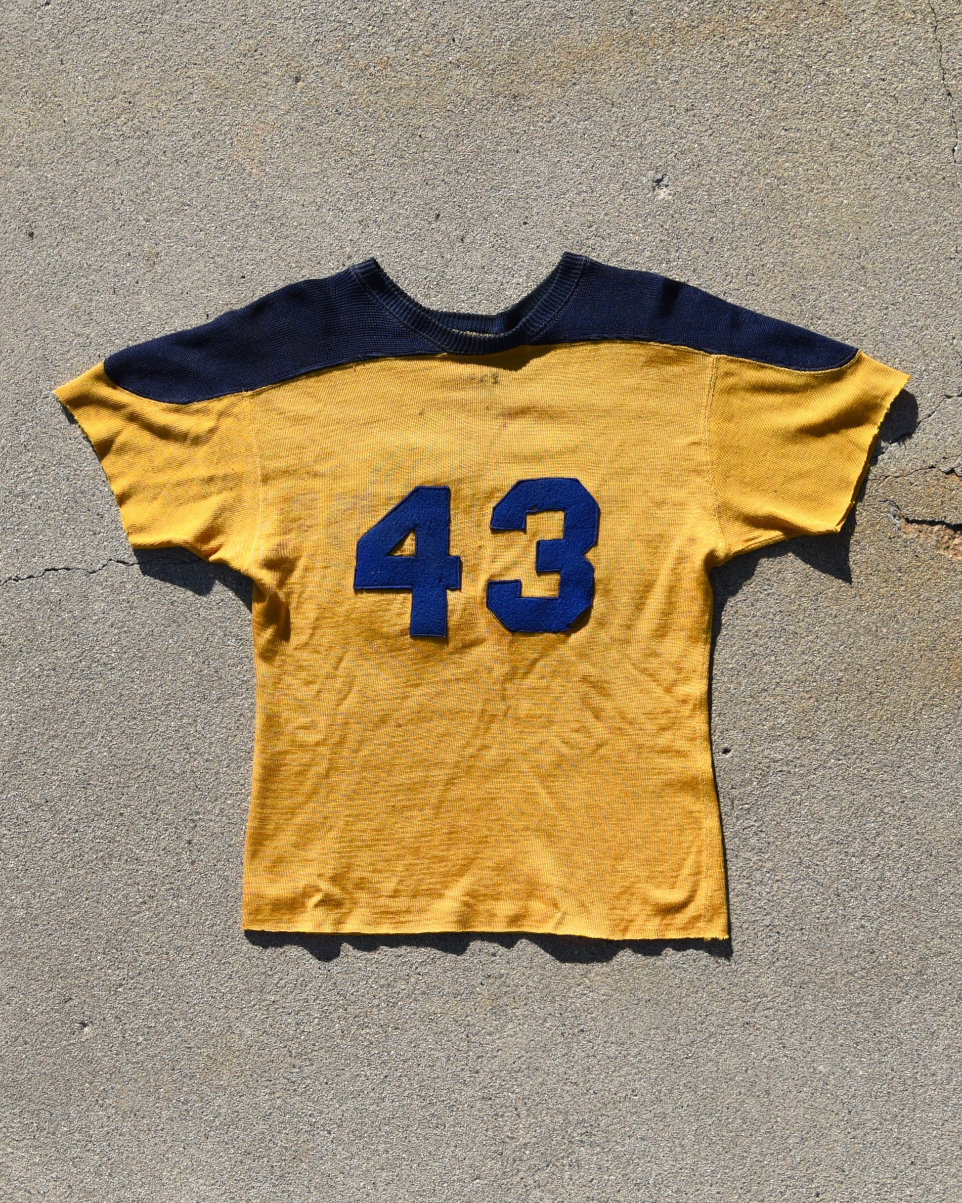 1950s Durene Football Jersey. Chopped sleeves and hem. Signs of wear throughout. No tag, fits like a boxy medium. Has quite a bit of stretch Measurements P2P Width 18.75” Length 23.5” |