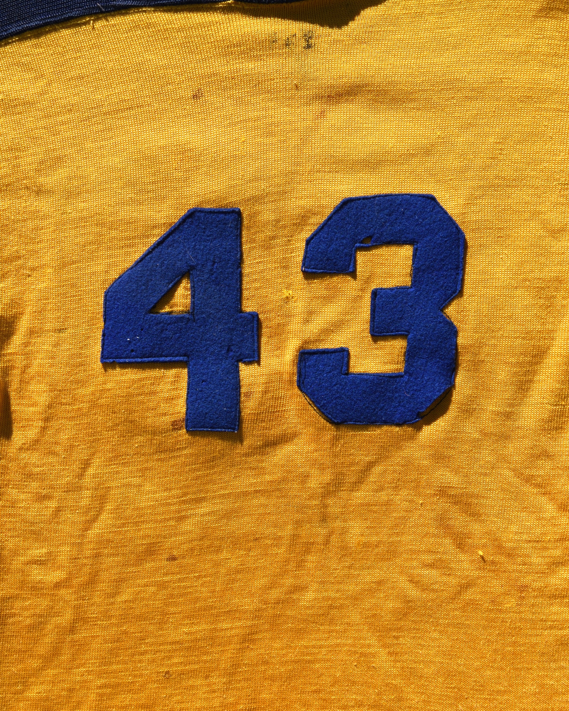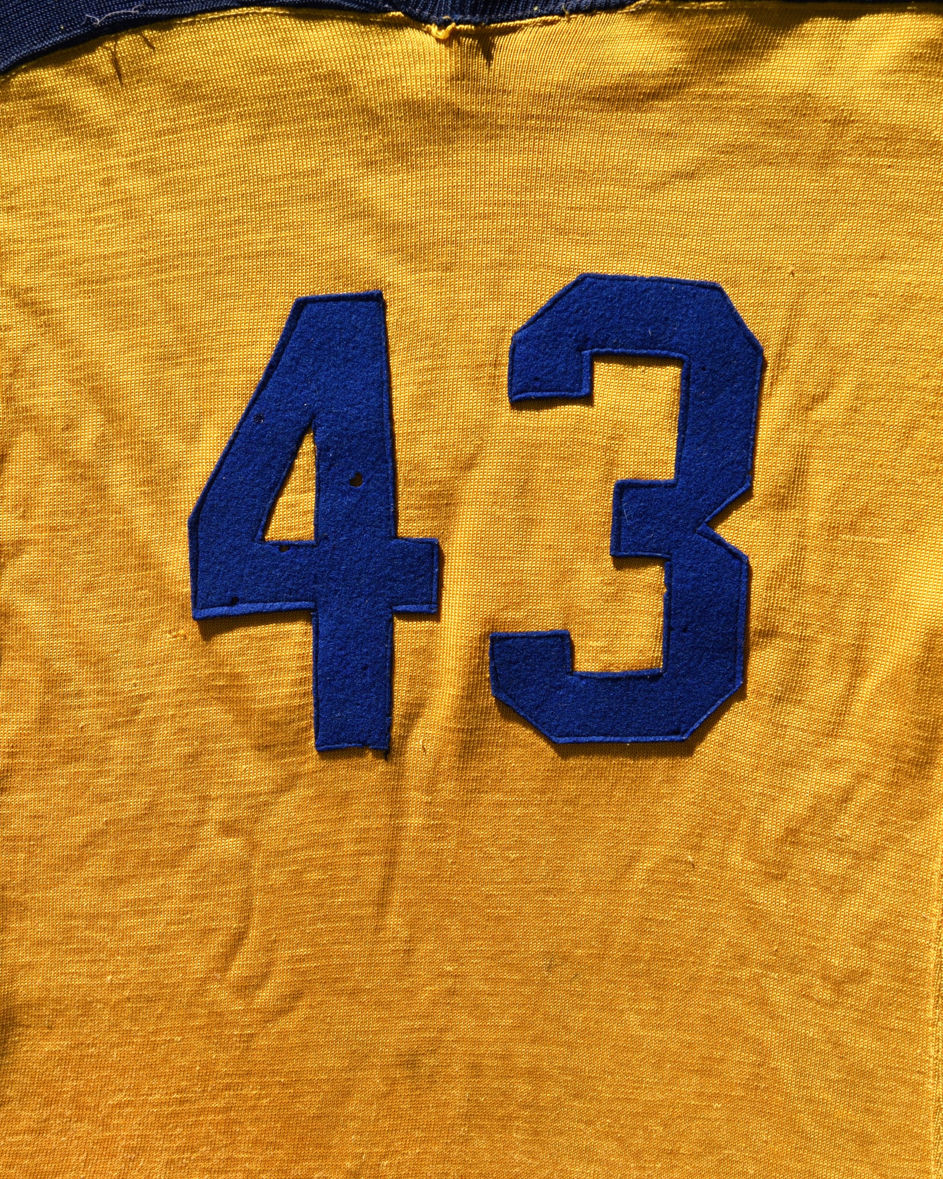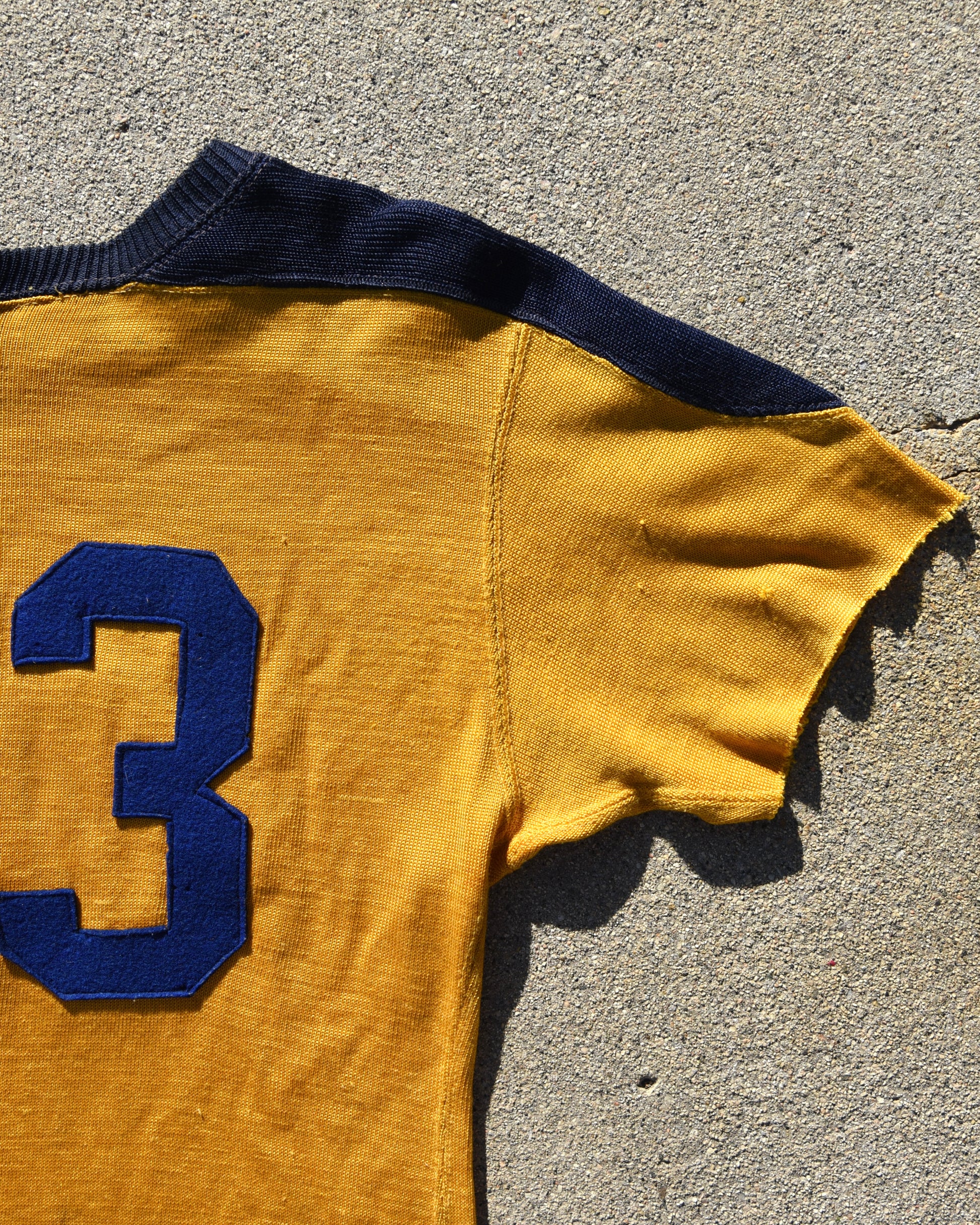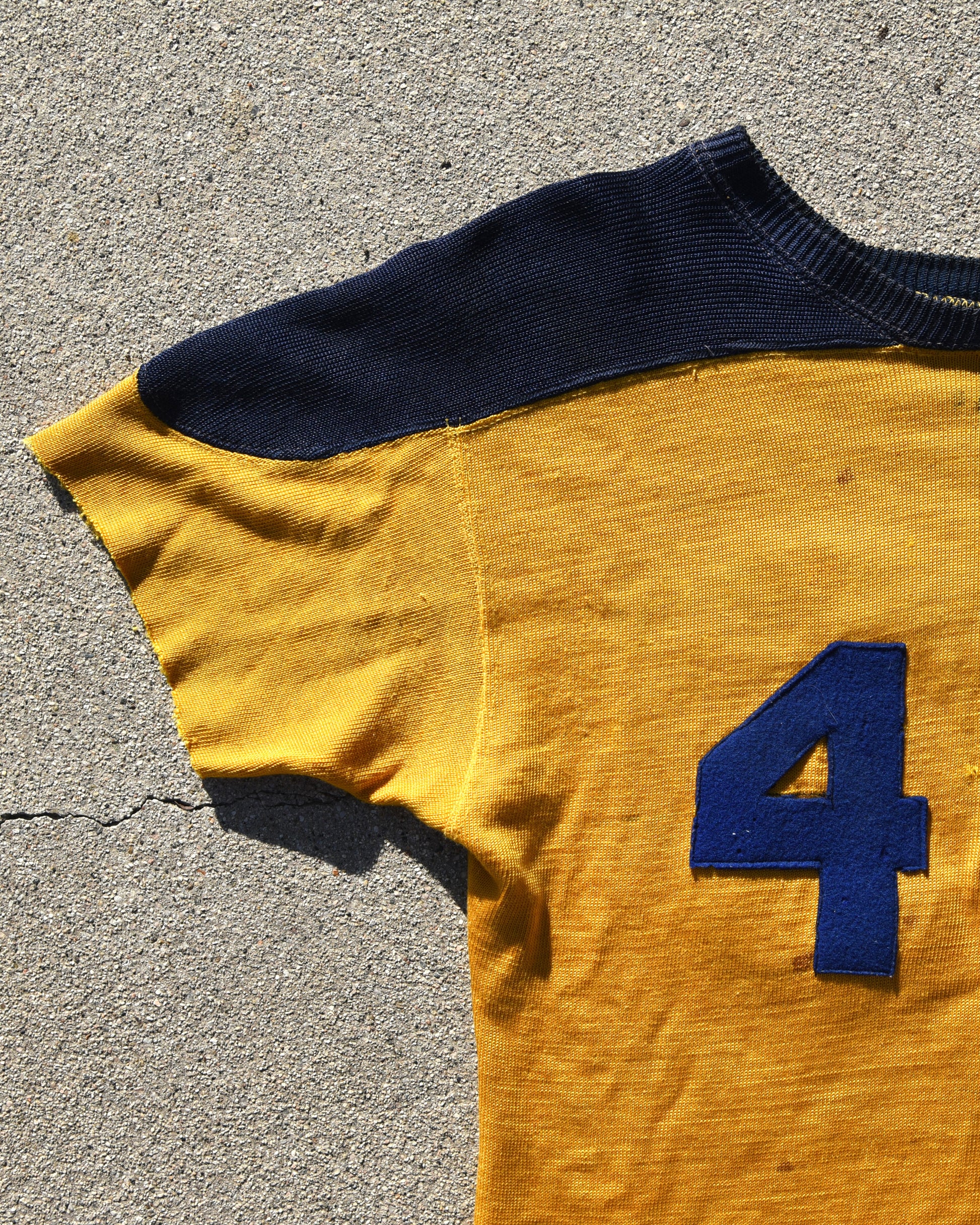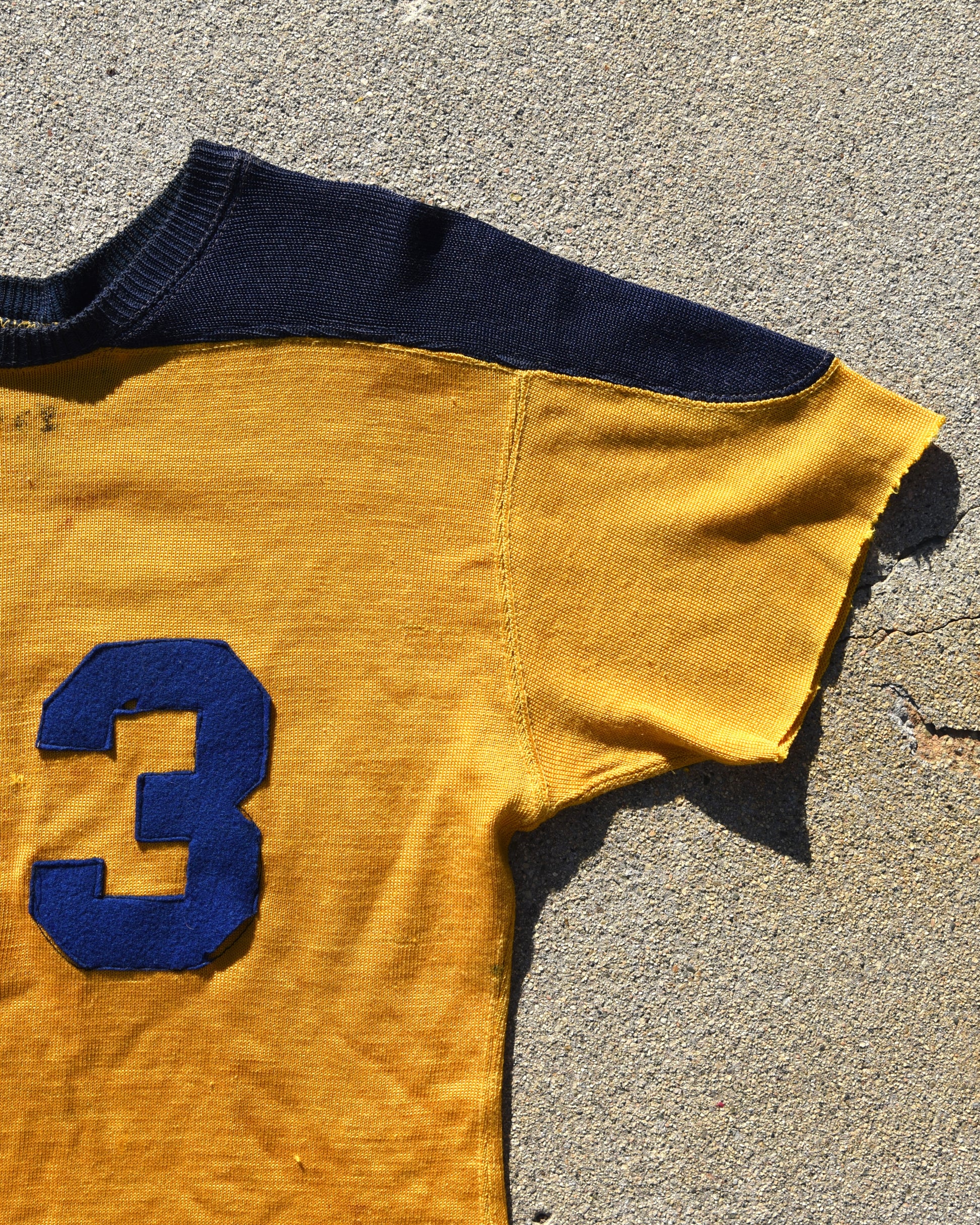 1950s Durene Football Jersey. Chopped sleeves and hem. Signs of wear throughout. No tag, fits like a boxy medium. Has quite a bit of stretch Measurements P2P Width 18.75” Length 23.5” |