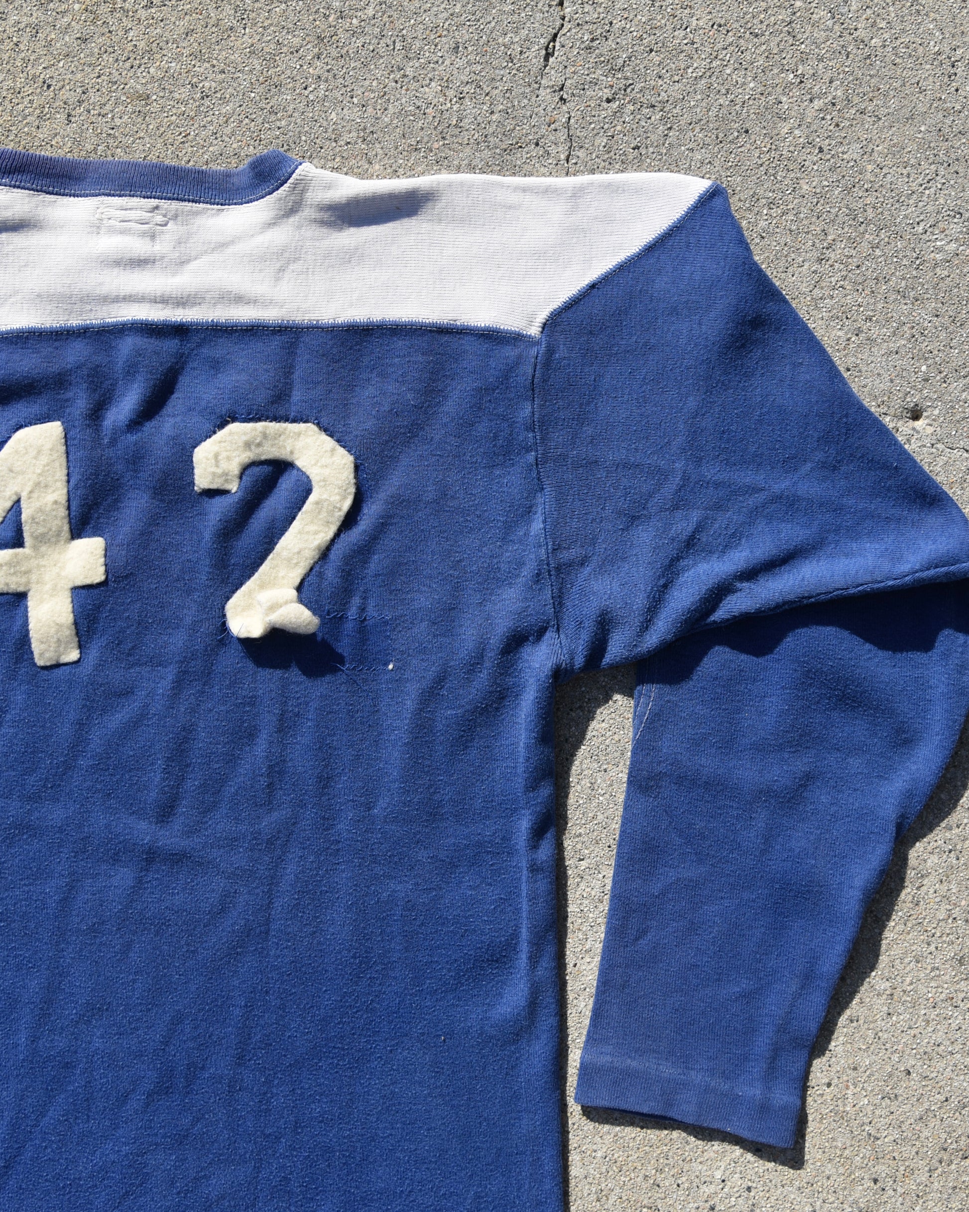 True vintage 1950s Two Tone Seat Pleasant Lions Club Jersey. In good condition overall for its age. Felt embroidered letters. Numbers on the back are detaching as shown in pics. On original Empire tag, size large Measurements: P2P Width 18” Length 26.25” |