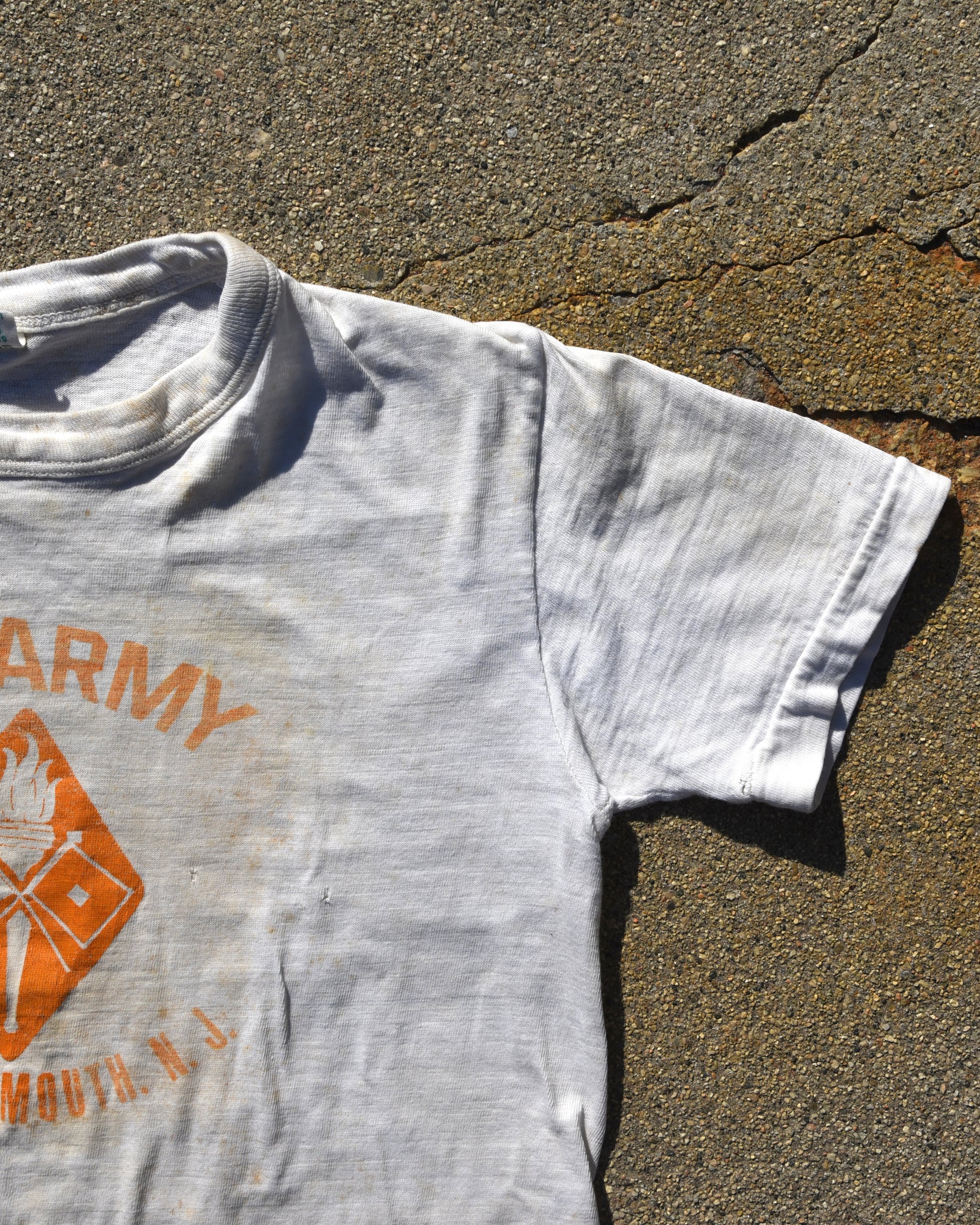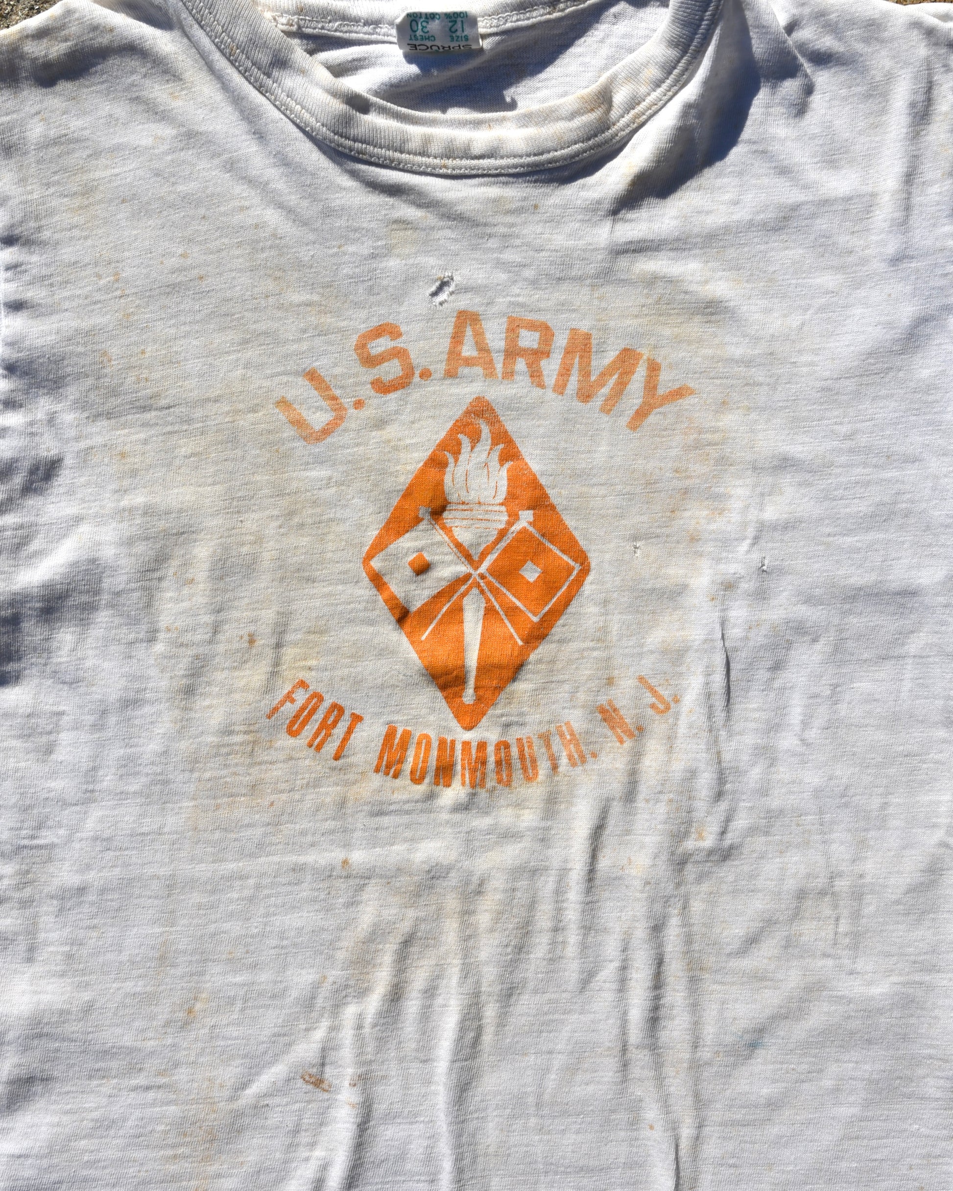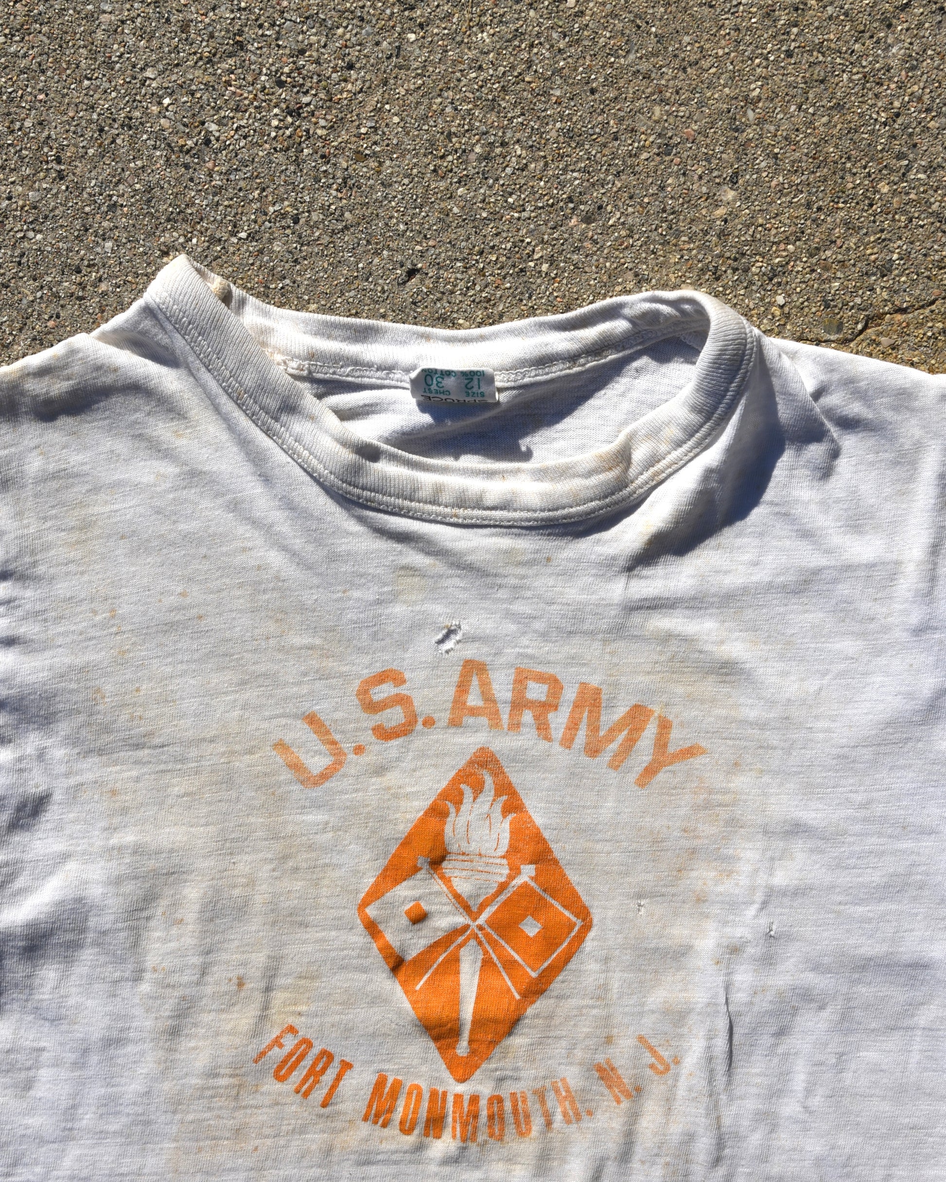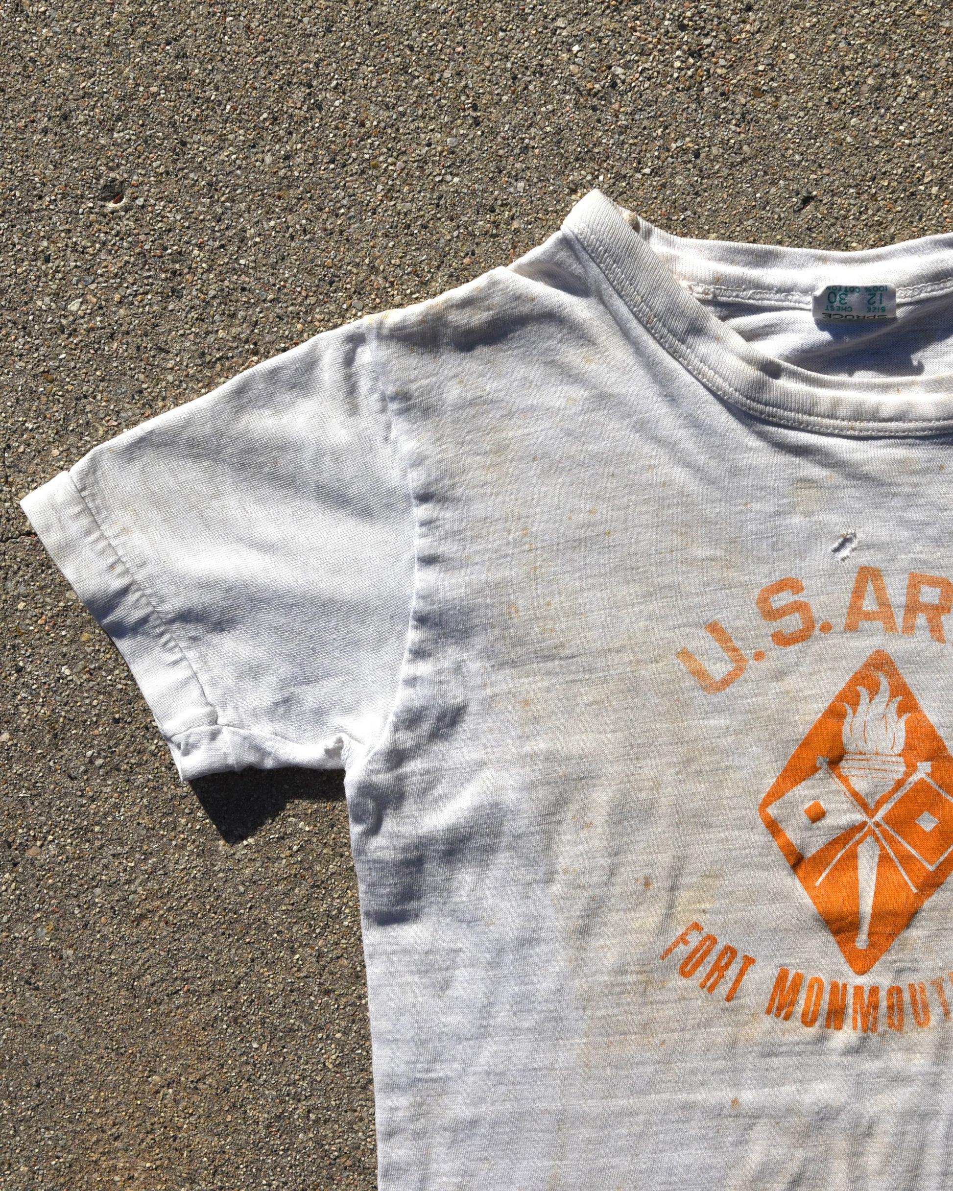 Vintage 1950s US Army Fort Monmouth NJ tshirt. On original mayo spruce tag. This is a youth tee best fit for women that wear XS or xxs. Signs of wear from years of wear all throughout
