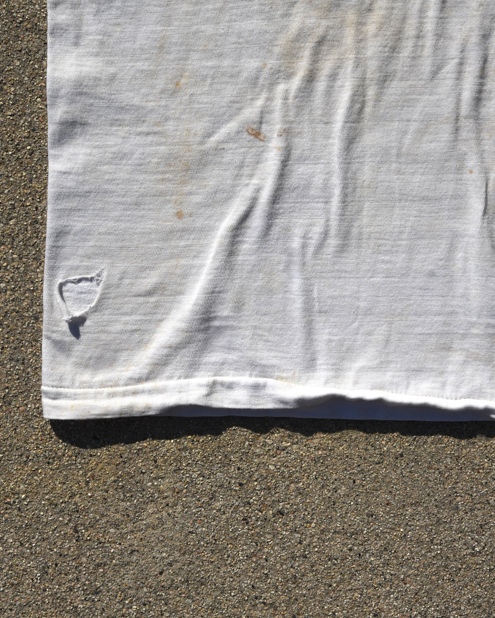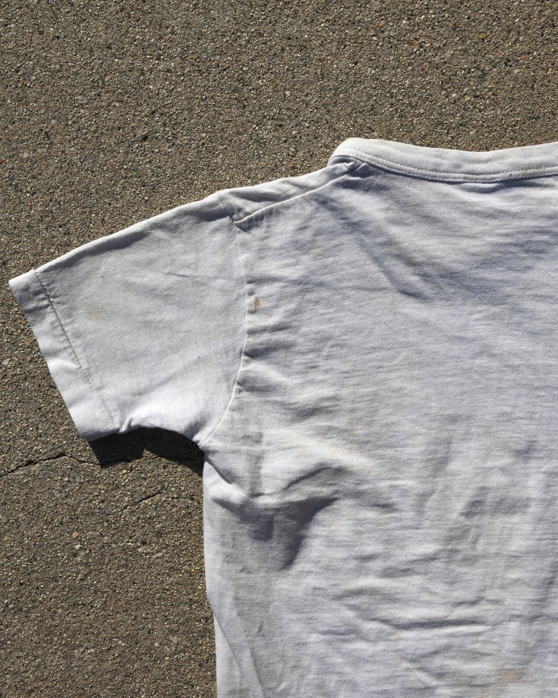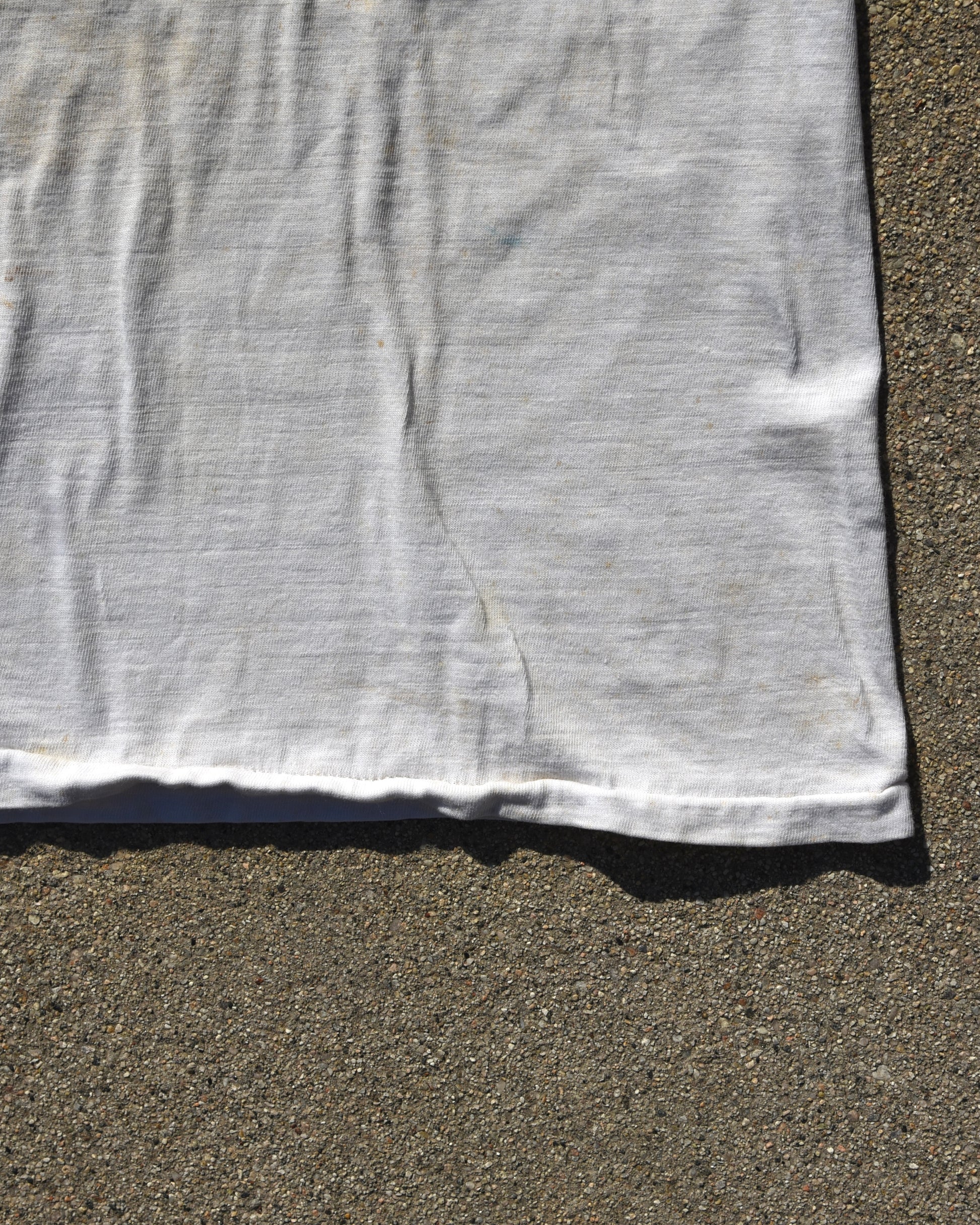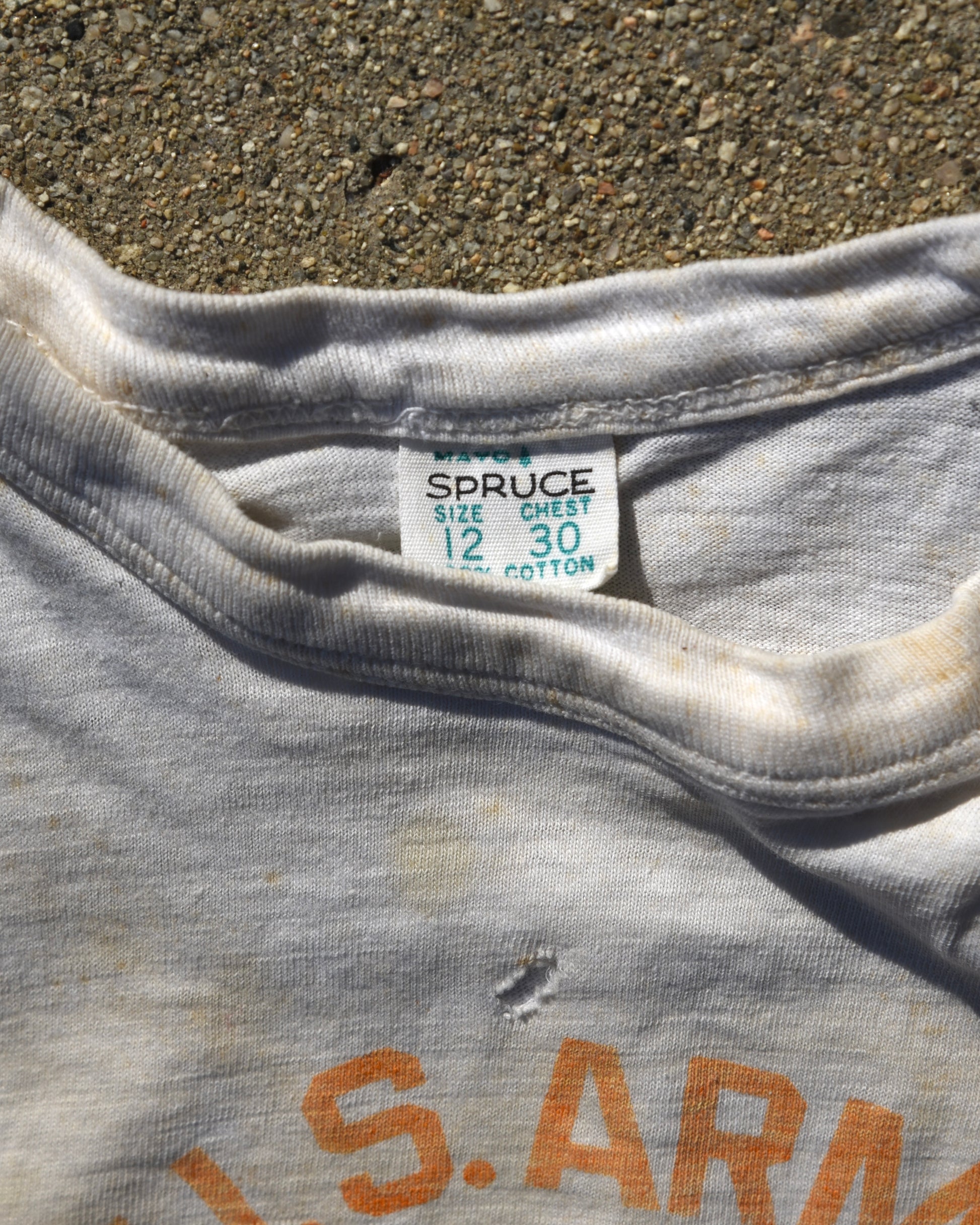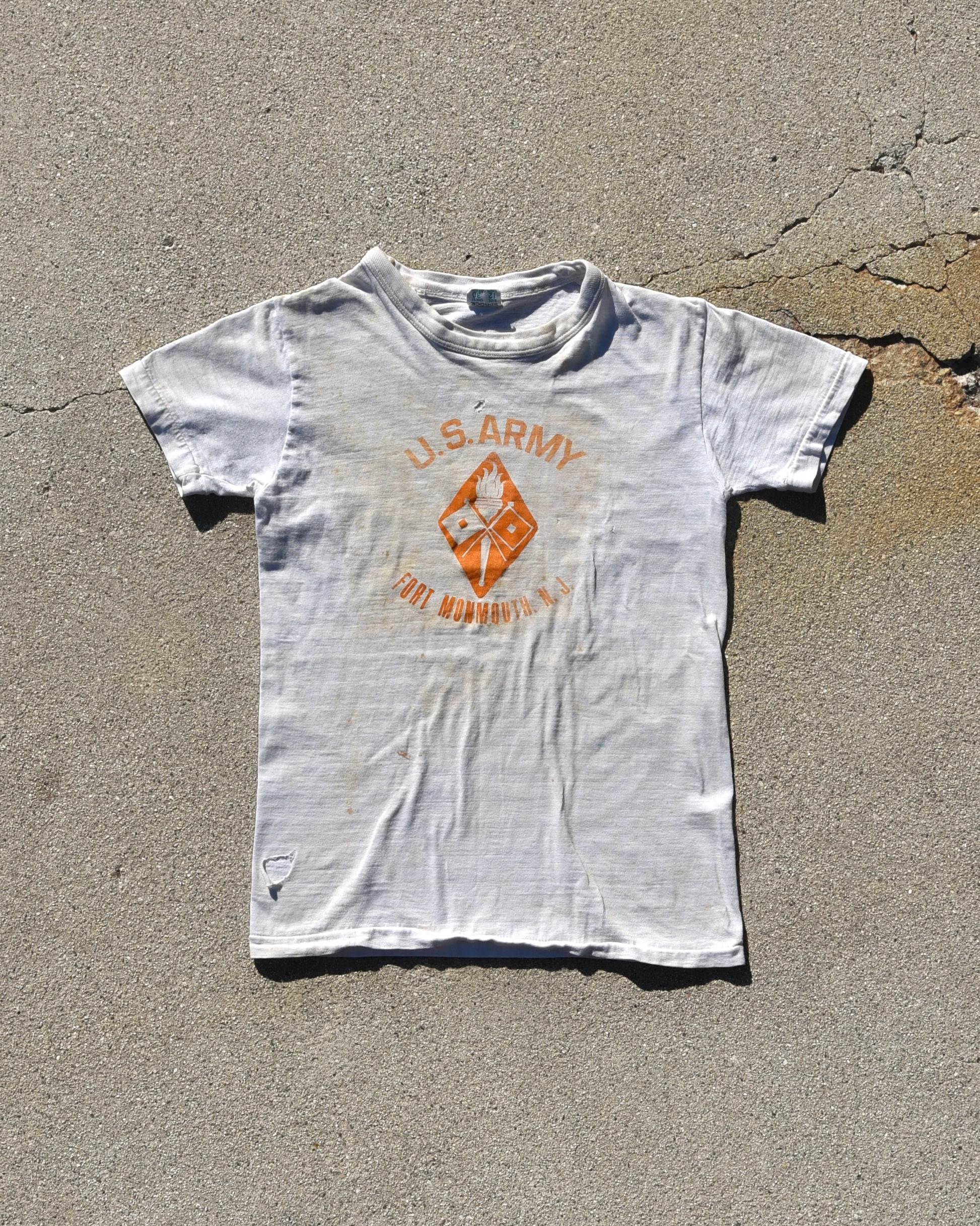 Vintage 1950s US Army Fort Monmouth NJ tshirt. On original mayo spruce tag. This is a youth tee best fit for women that wear XS or xxs. Signs of wear from years of wear all throughout
