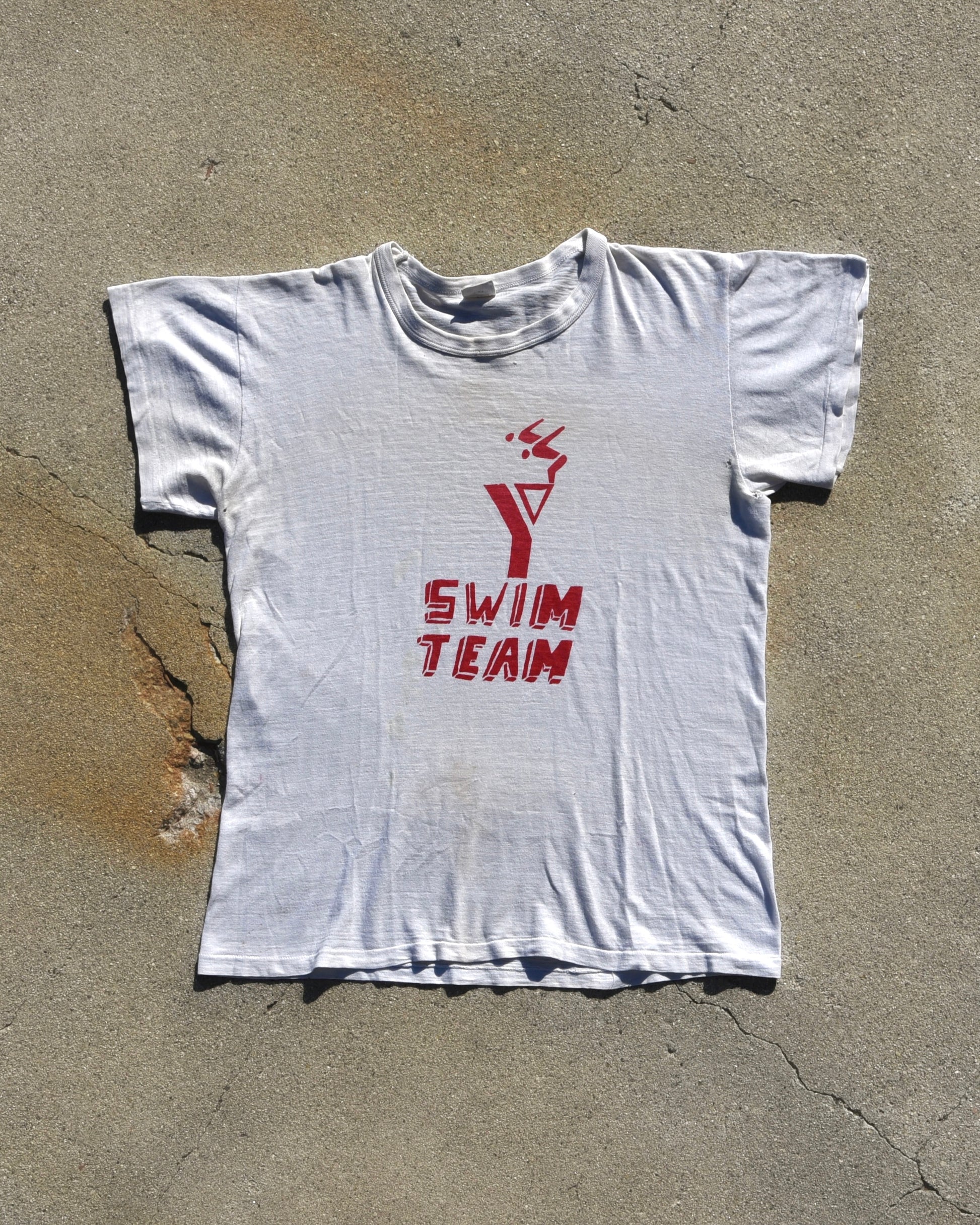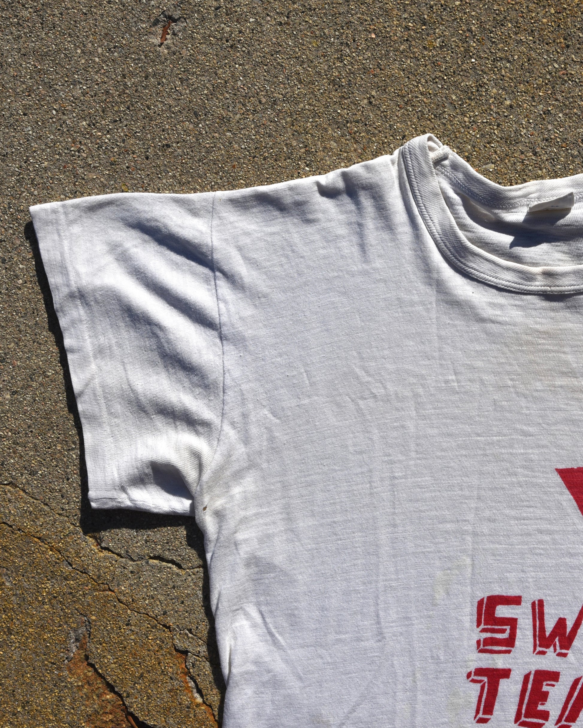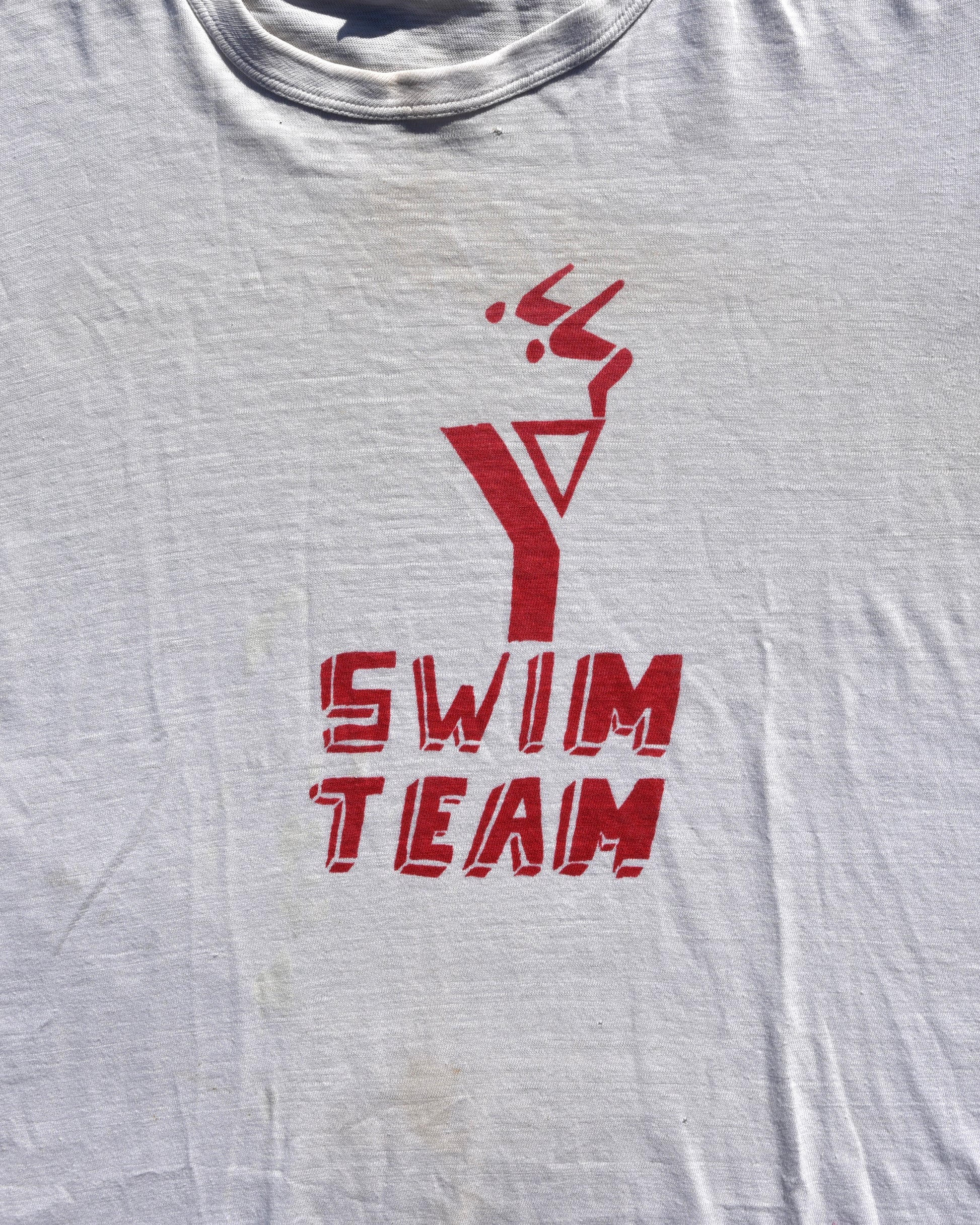 True vintage 1950s YMCA Swim Team Waterprint Tshirt. Has some signs of wear throughout but in good condition for its age. Tagged size large but fits more like a medium