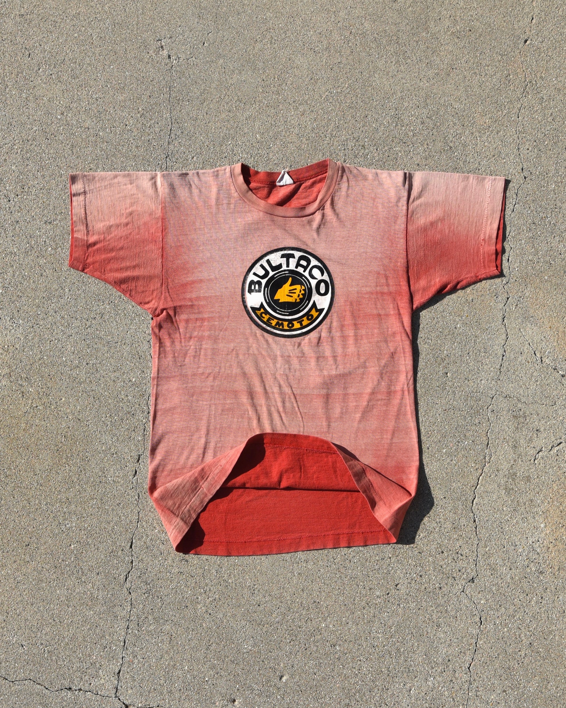 True vintage 1960s Bultaco Cemoto Motorcycles Tshirt. Sun faded heavily throughout in a really beautiful way. On a champion tag, size medium