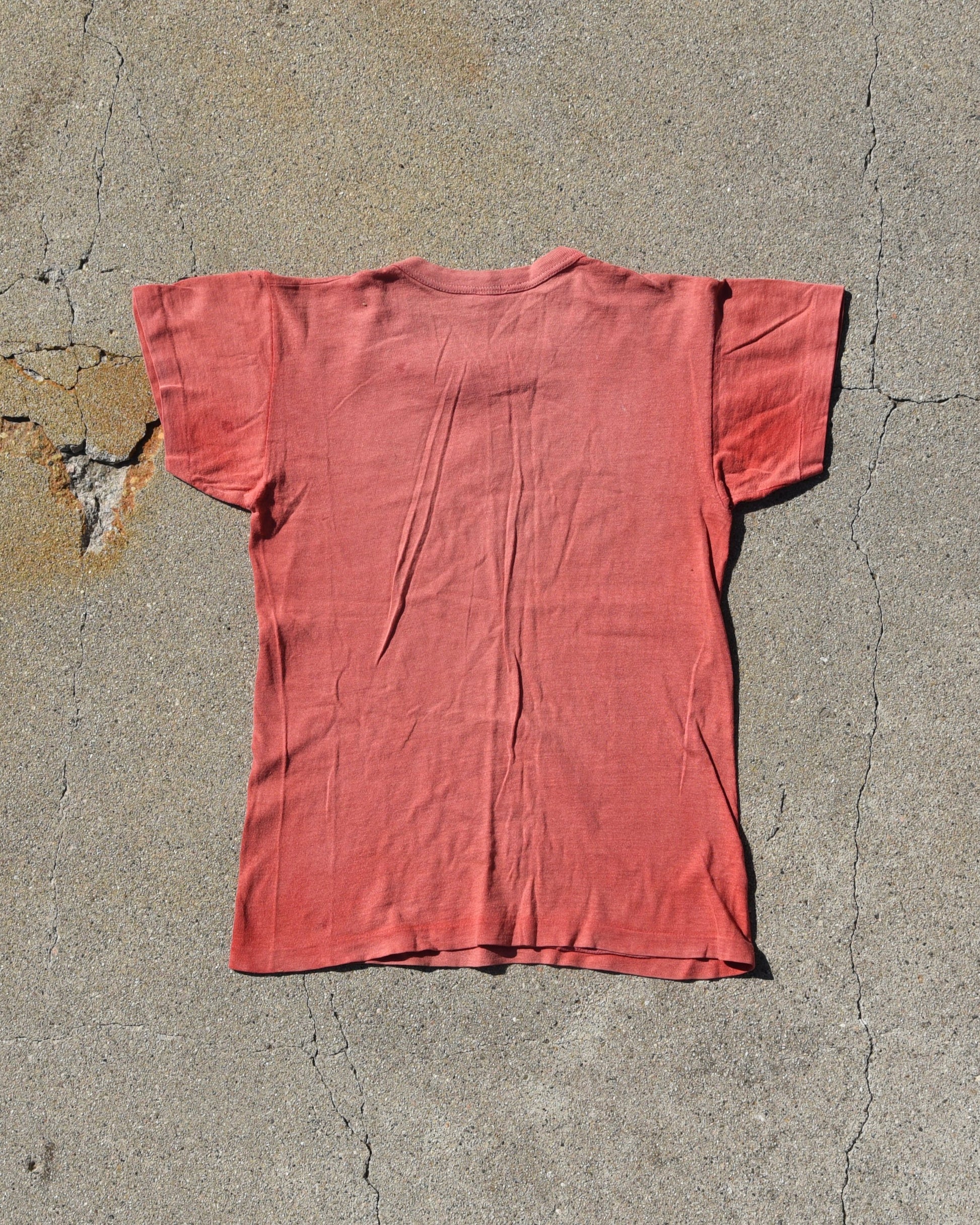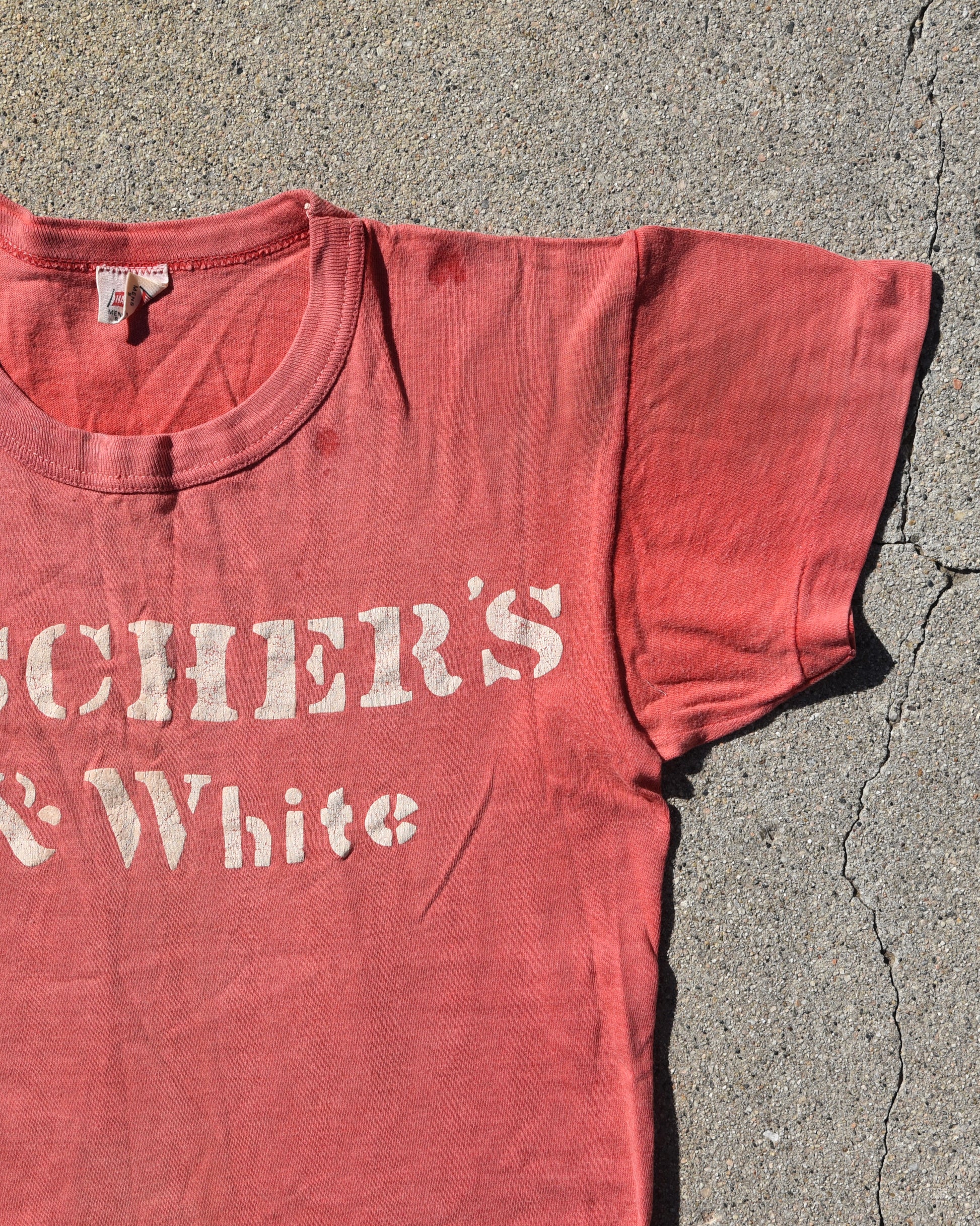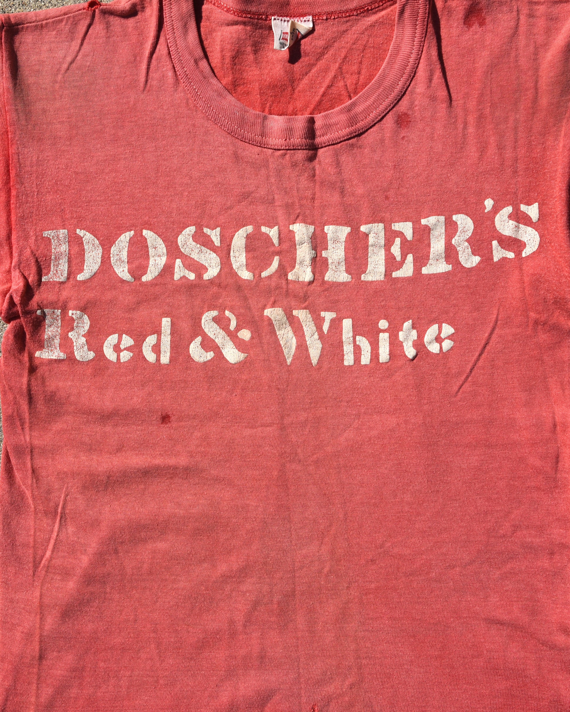 True vintage 1960s Doscher’s Red & White Tshirt. Sun faded all throughout. Tagged size small