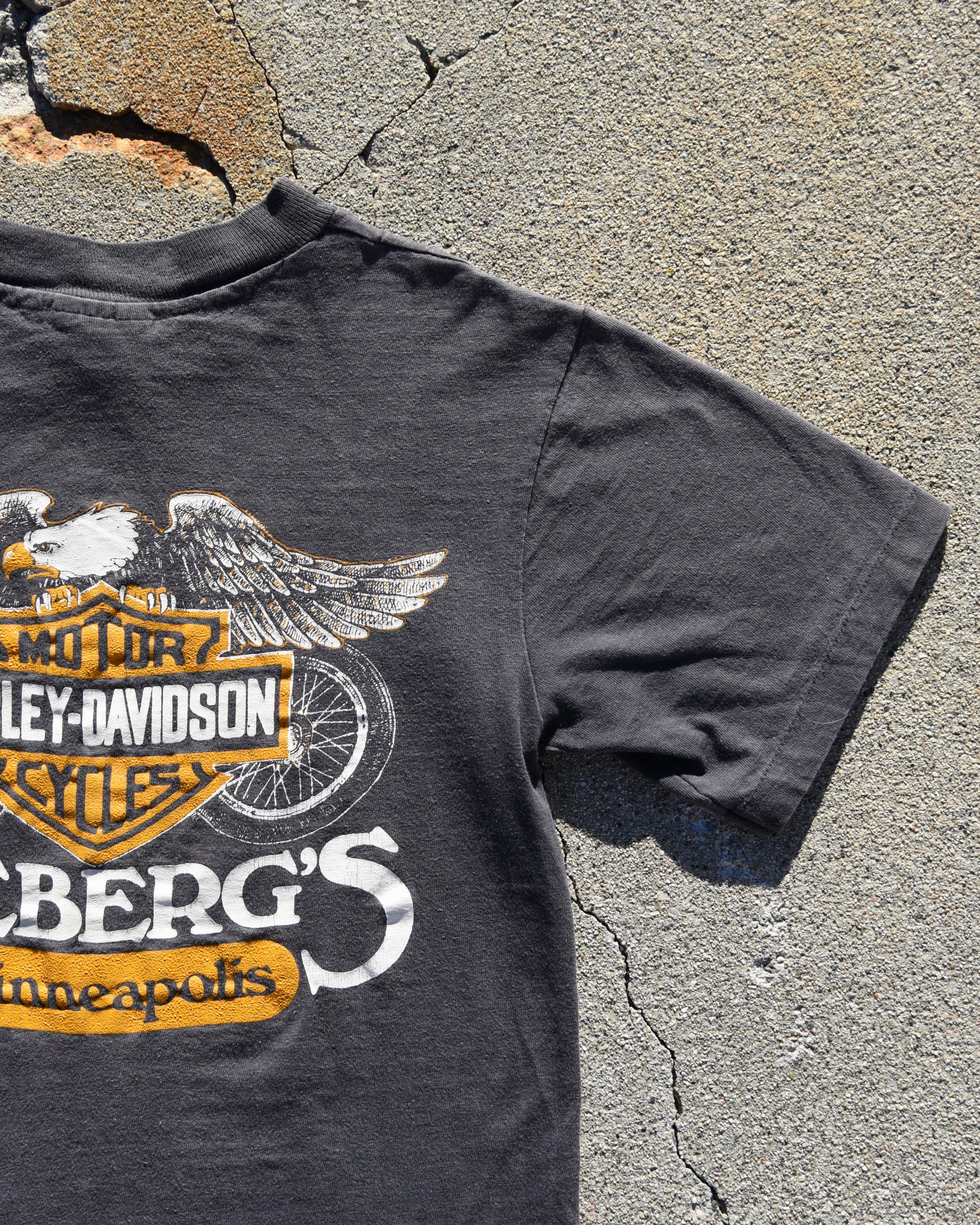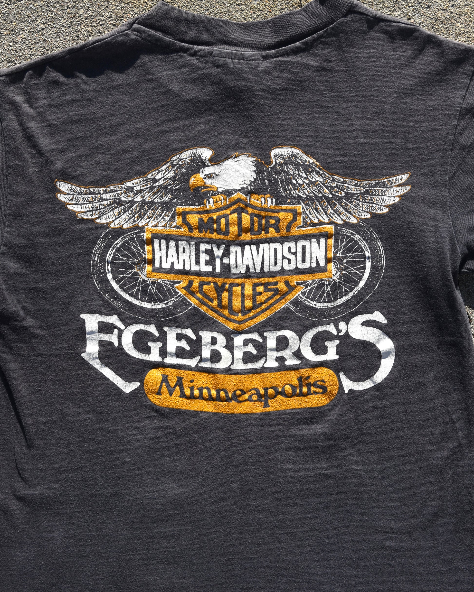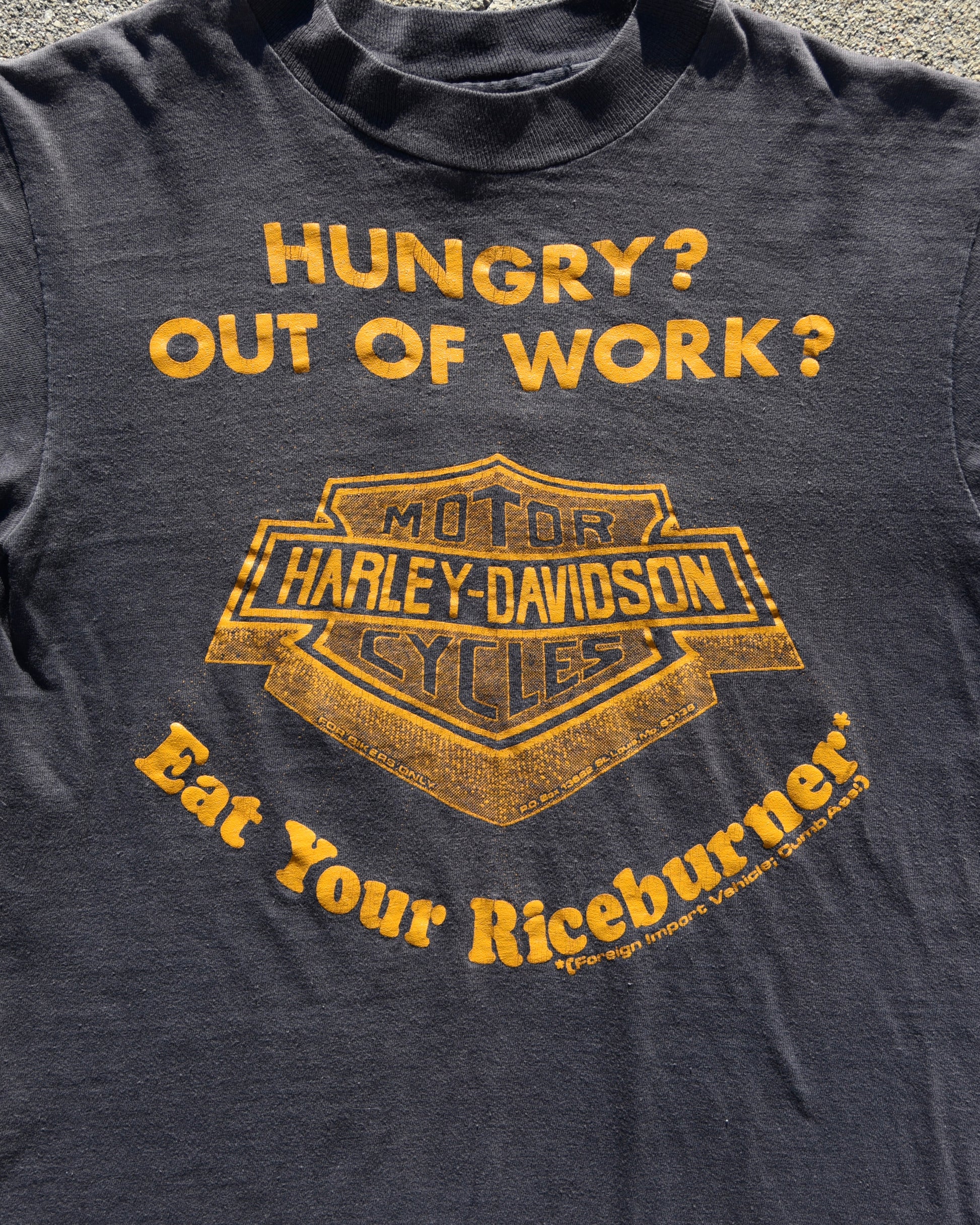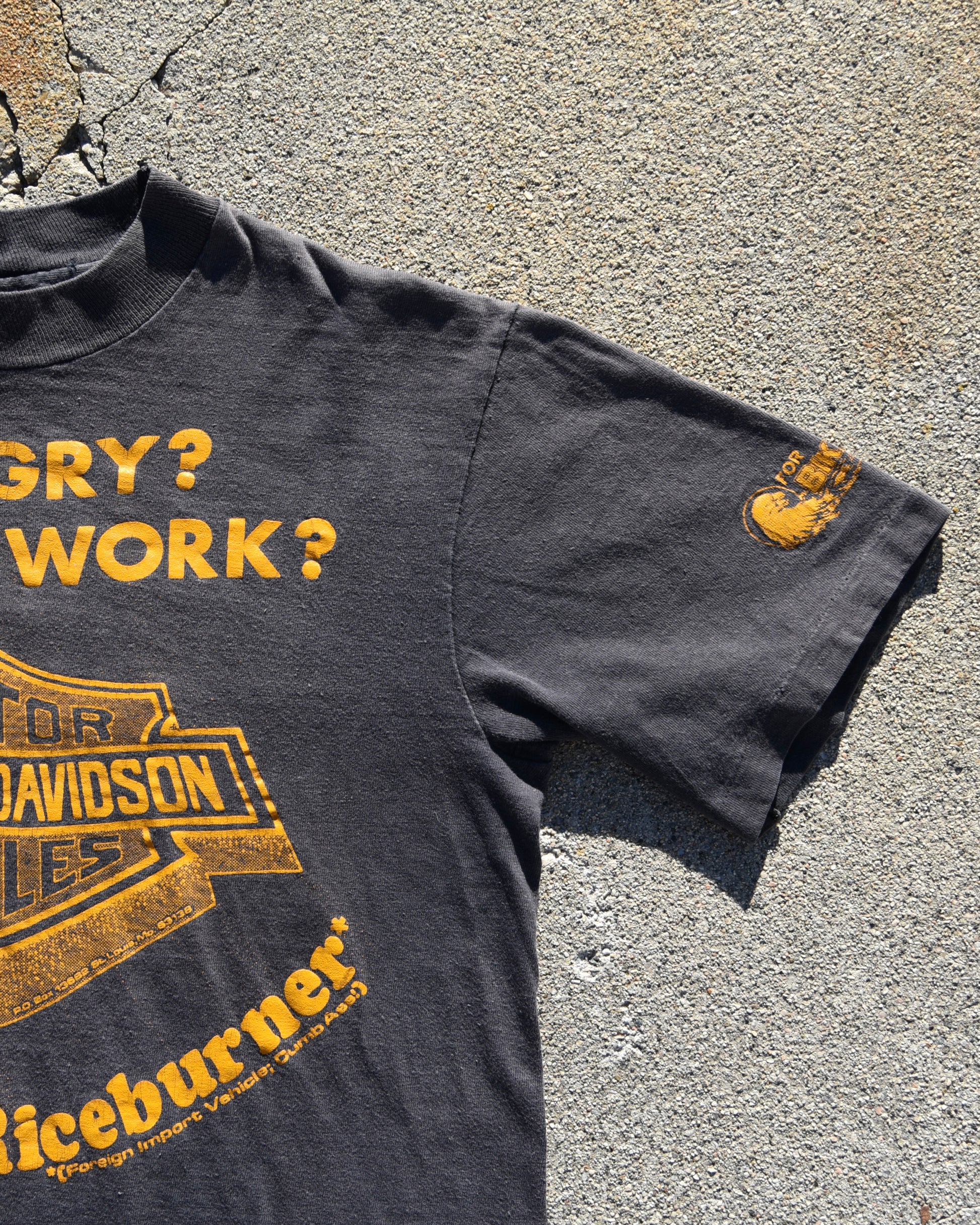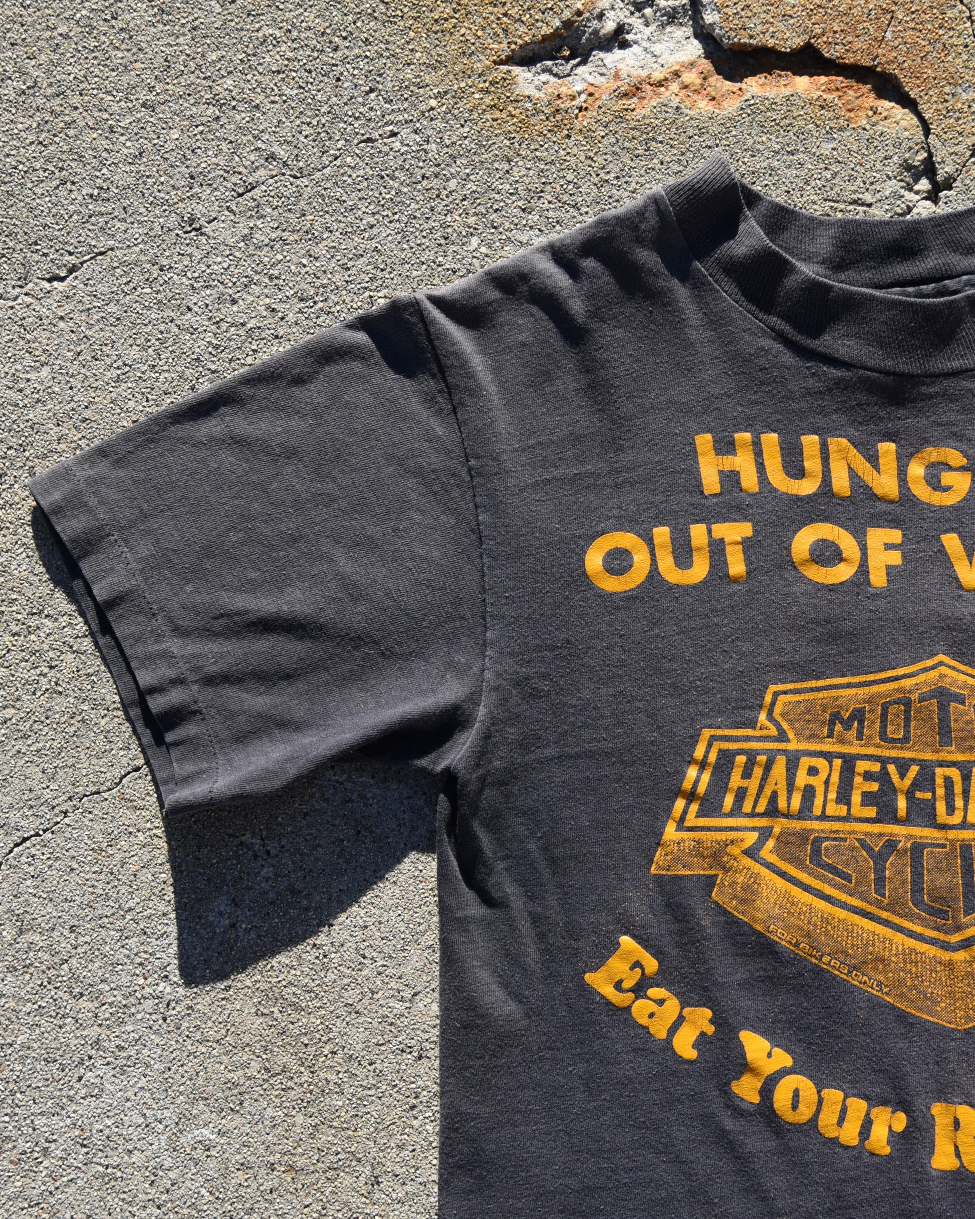 1980s Hungry Out of Work Harley Tshirt. Faded nicely throughout. On an 80s Hanes tag, size small