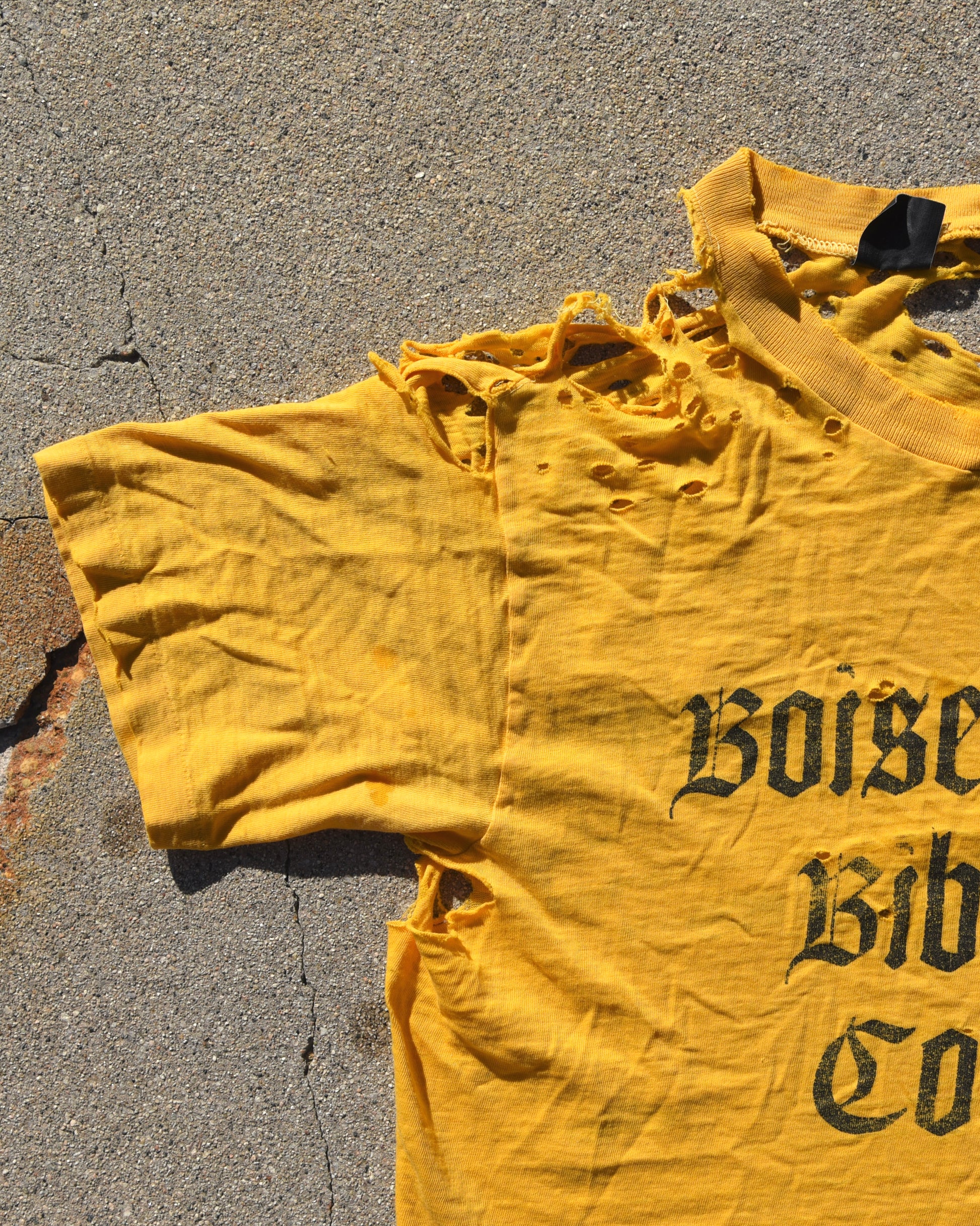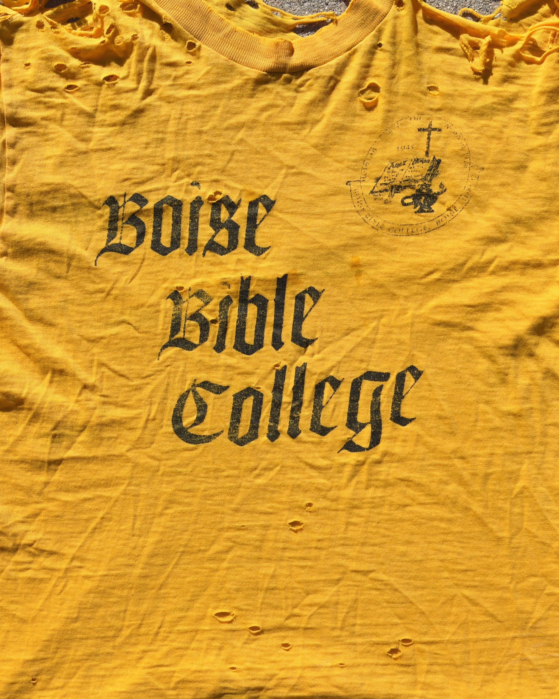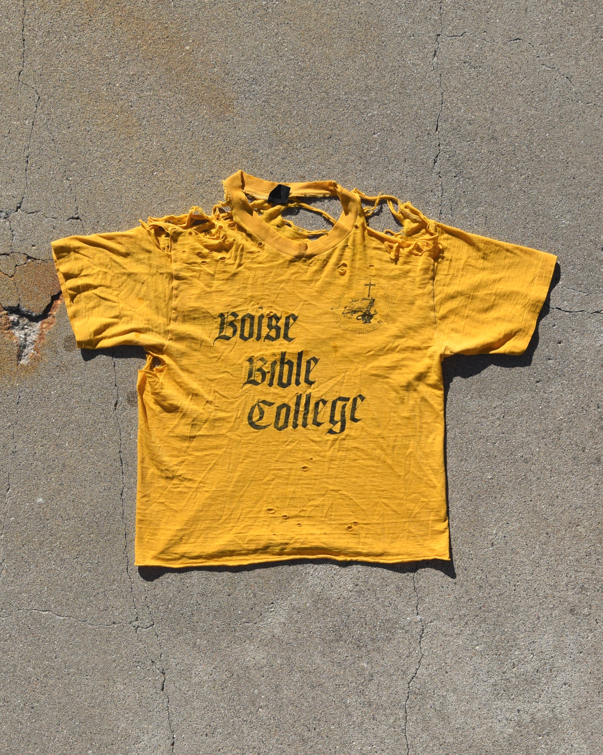 Vintage thrashed 1980s Boise Bible College Tshirt. Thrashed and distressed heavily all throughout. Cropped hem. Really cool look on this. Tag faded, fits like a medium