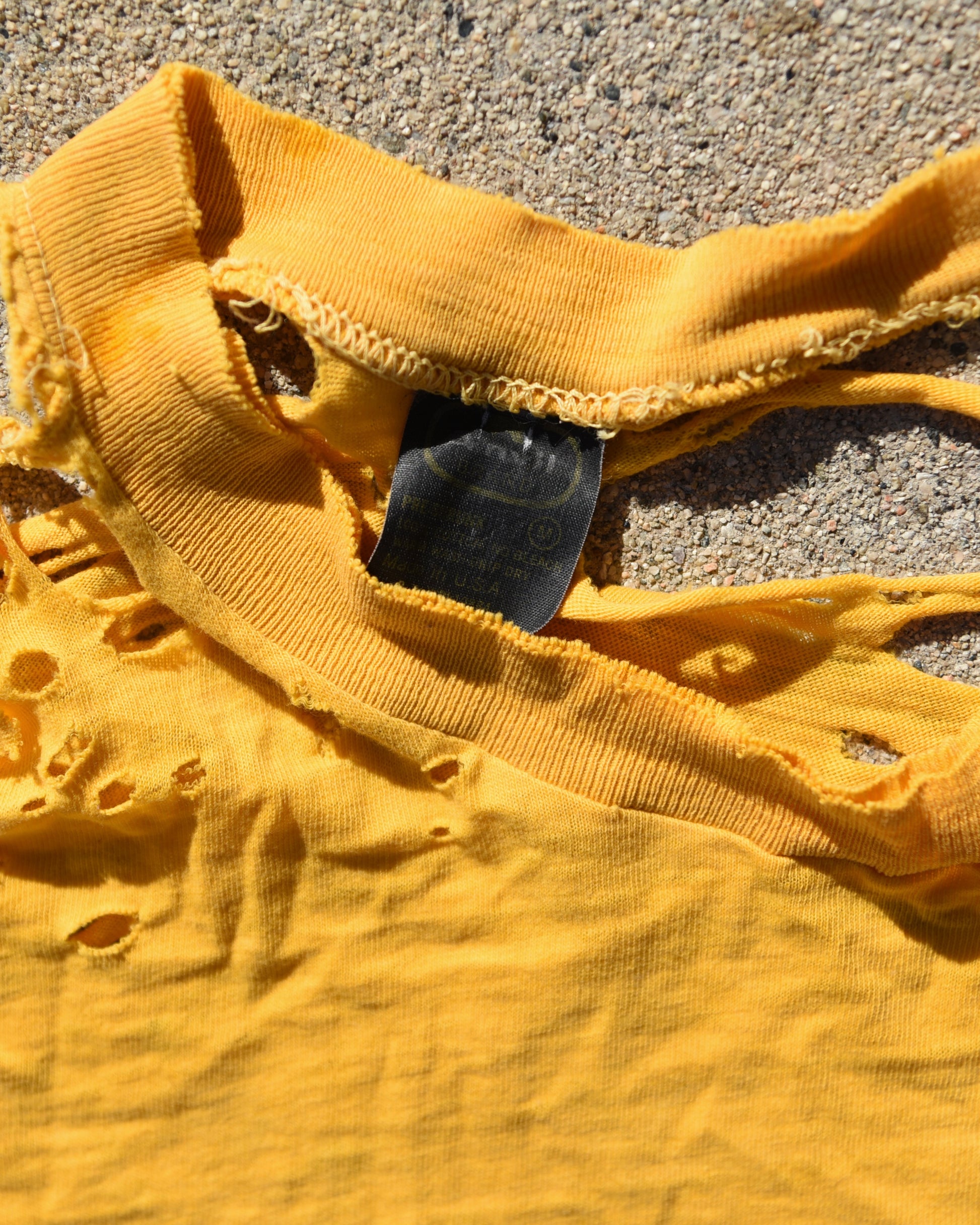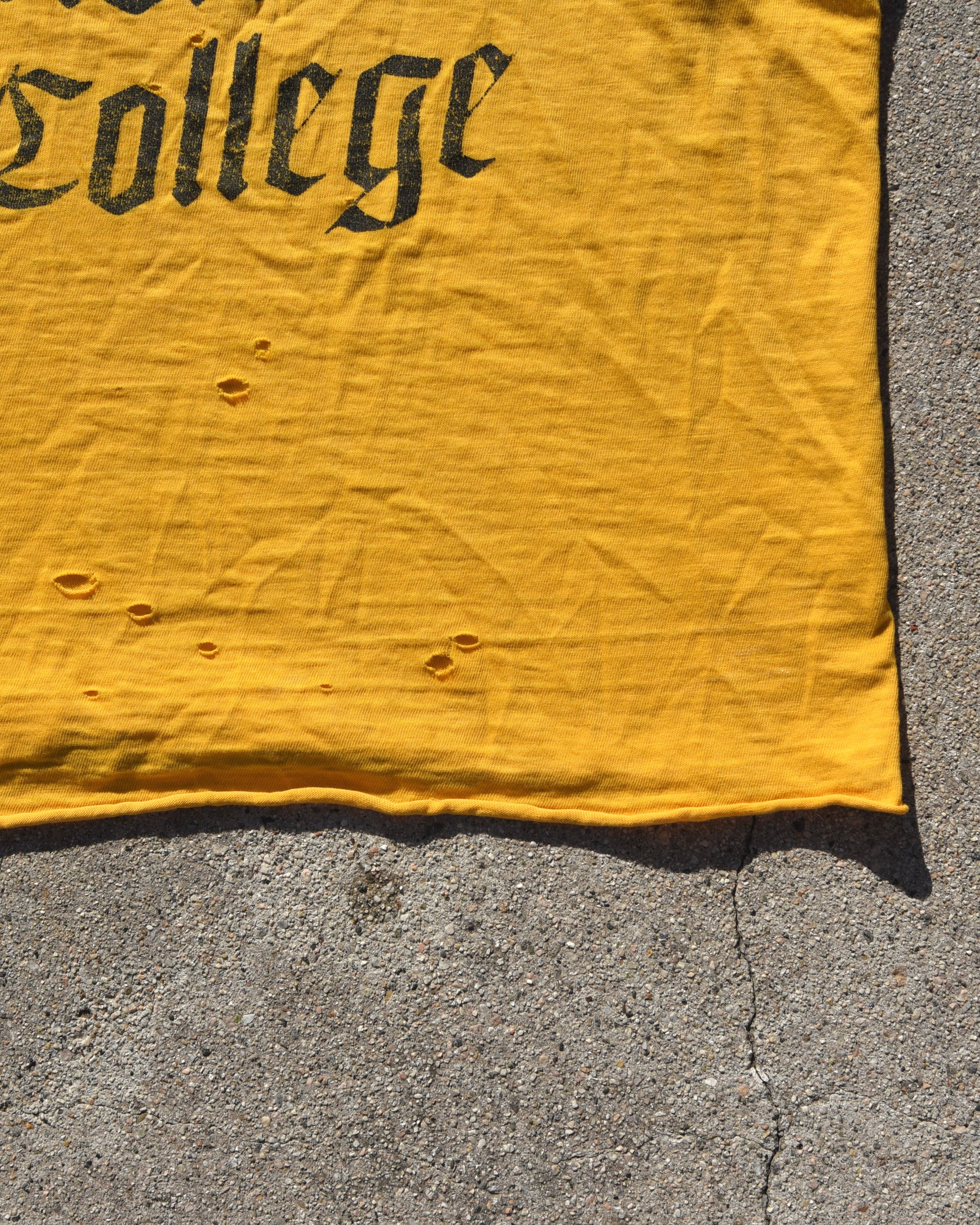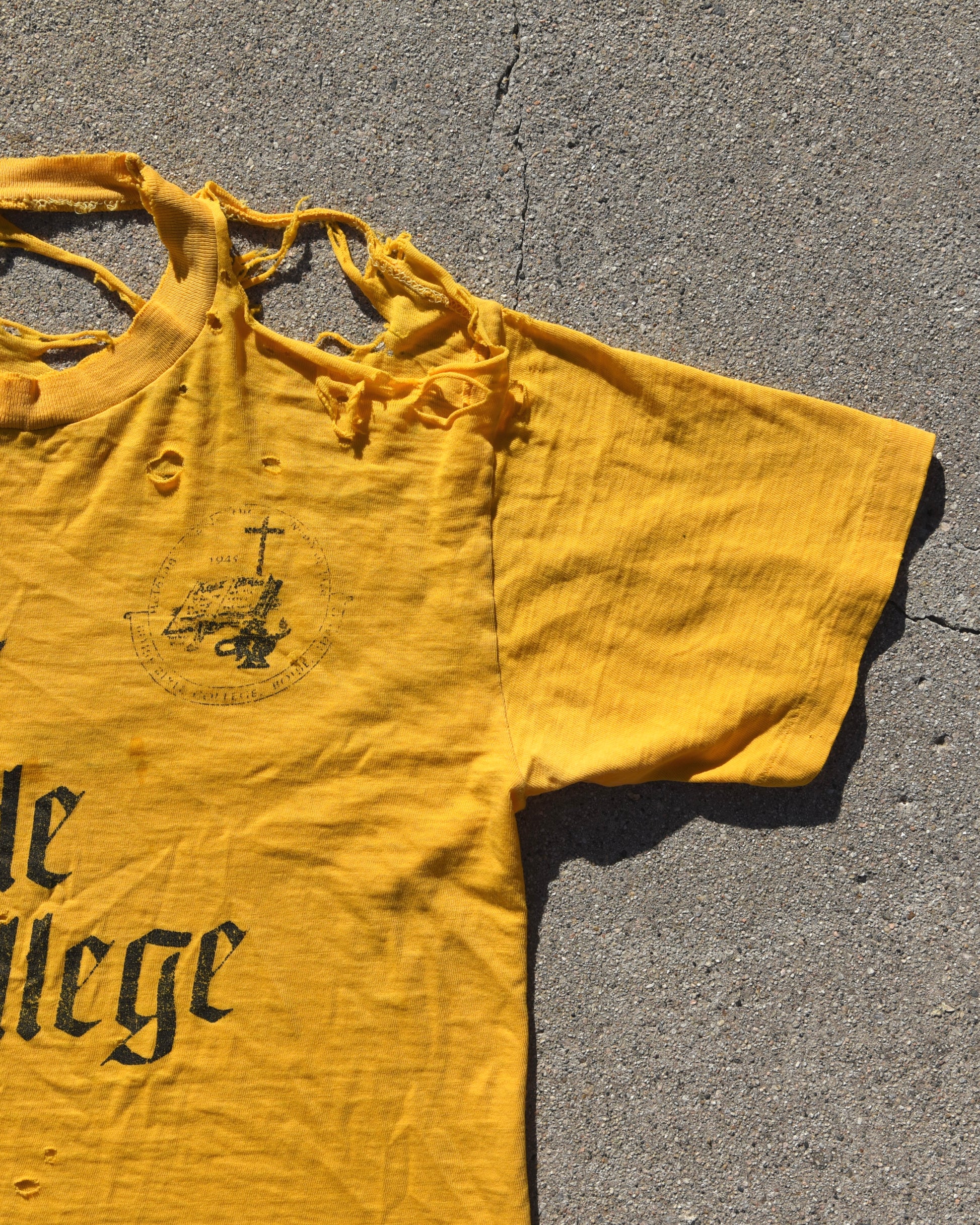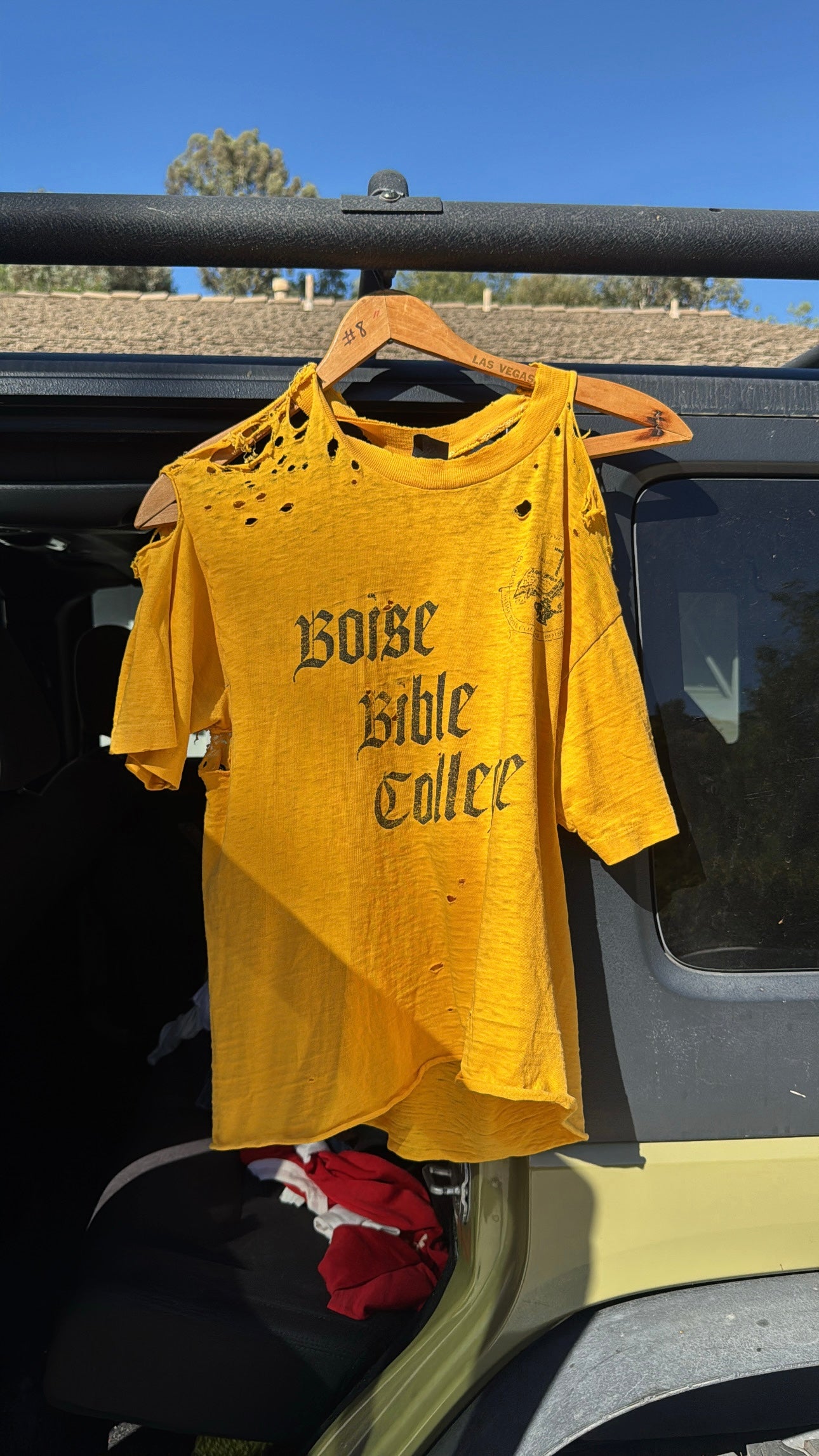 Vintage thrashed 1980s Boise Bible College Tshirt. Thrashed and distressed heavily all throughout. Cropped hem. Really cool look on this. Tag faded, fits like a medium