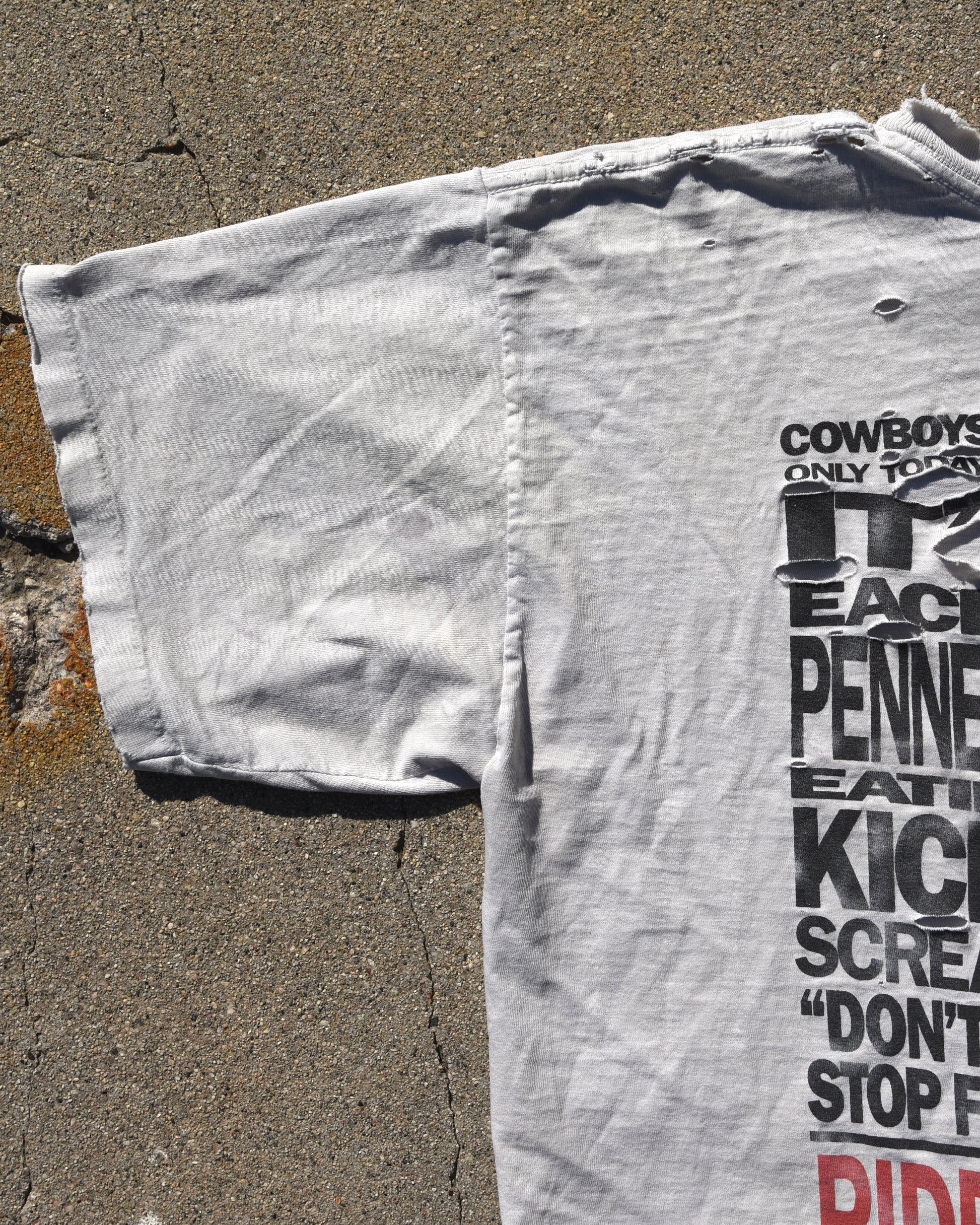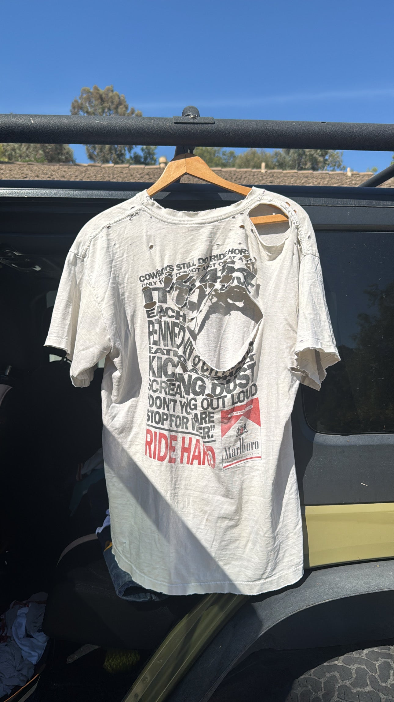 Vintage early 90s Marlboro thrashed Tshirt. Really cool graphic on the back that’s thrashed to perfection. Single stitch. Signs of wear and markings all throughout. No tag, fits like an XL