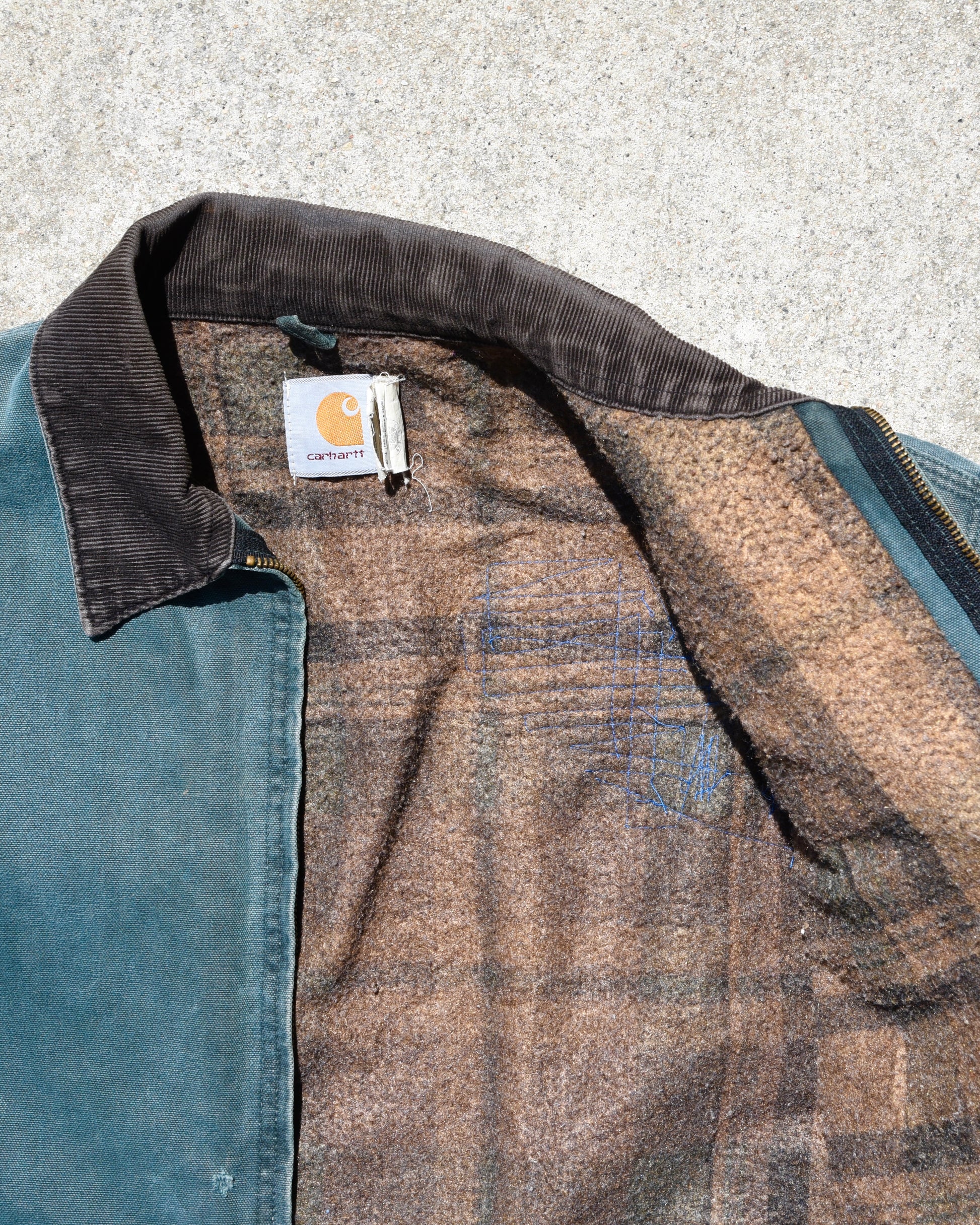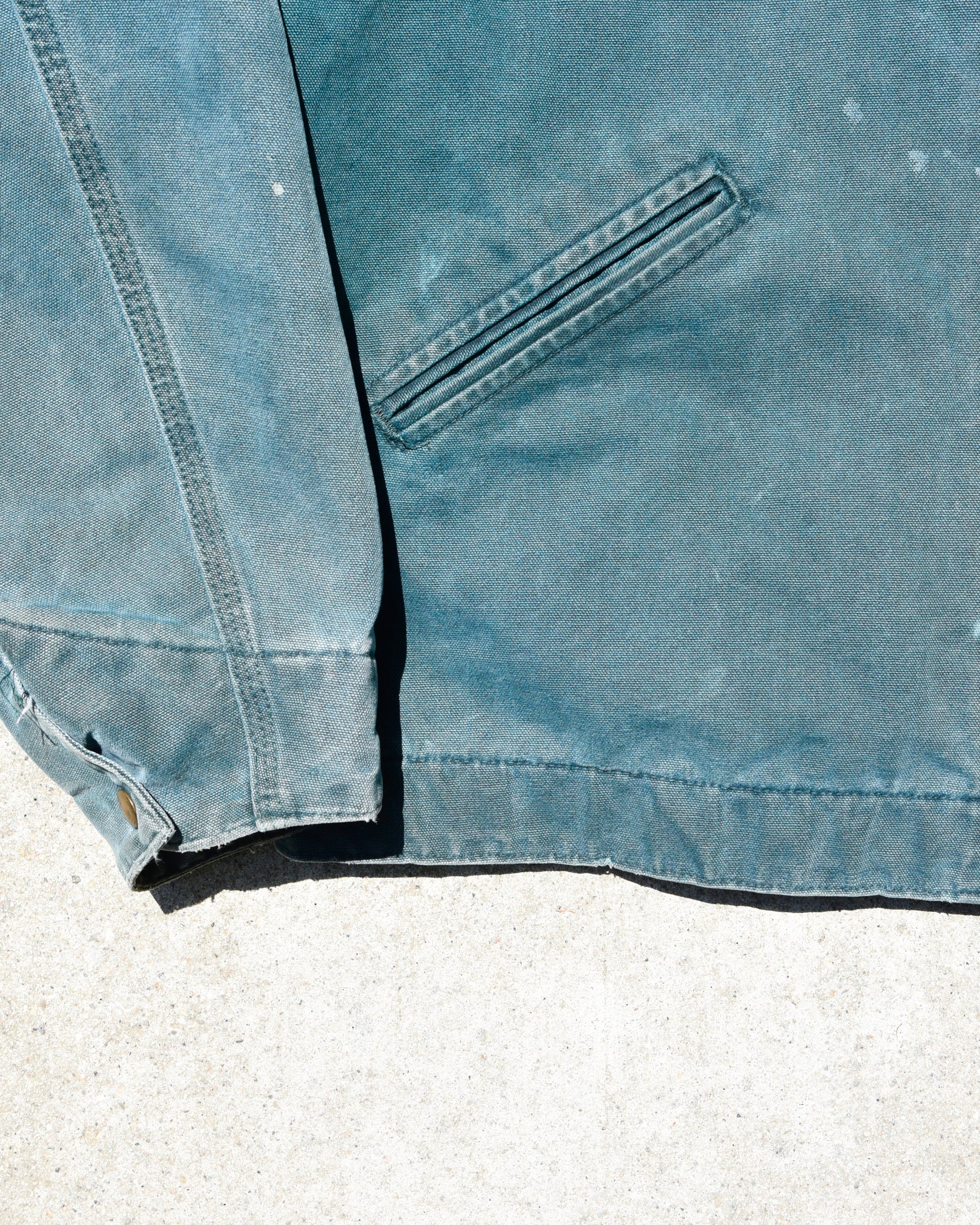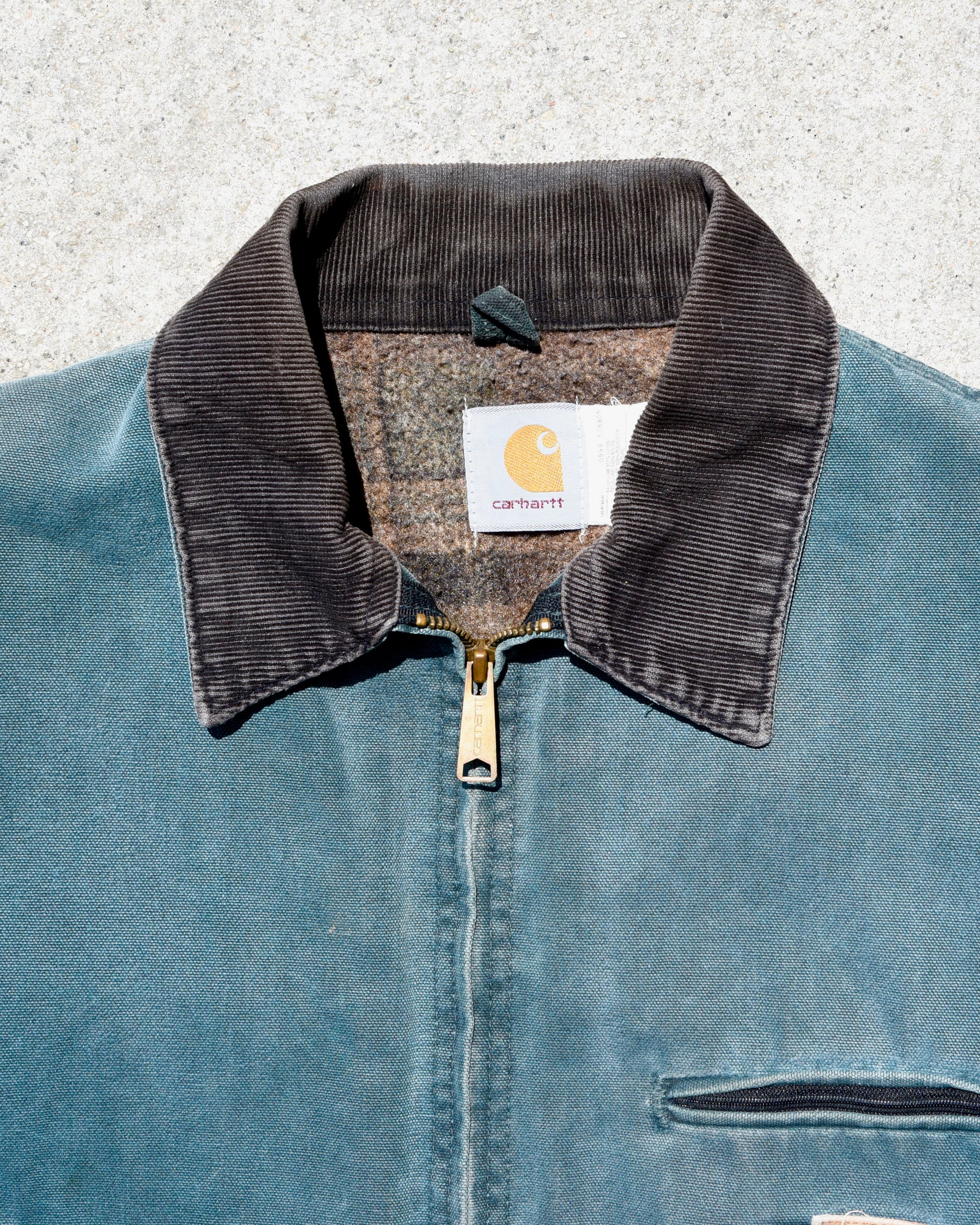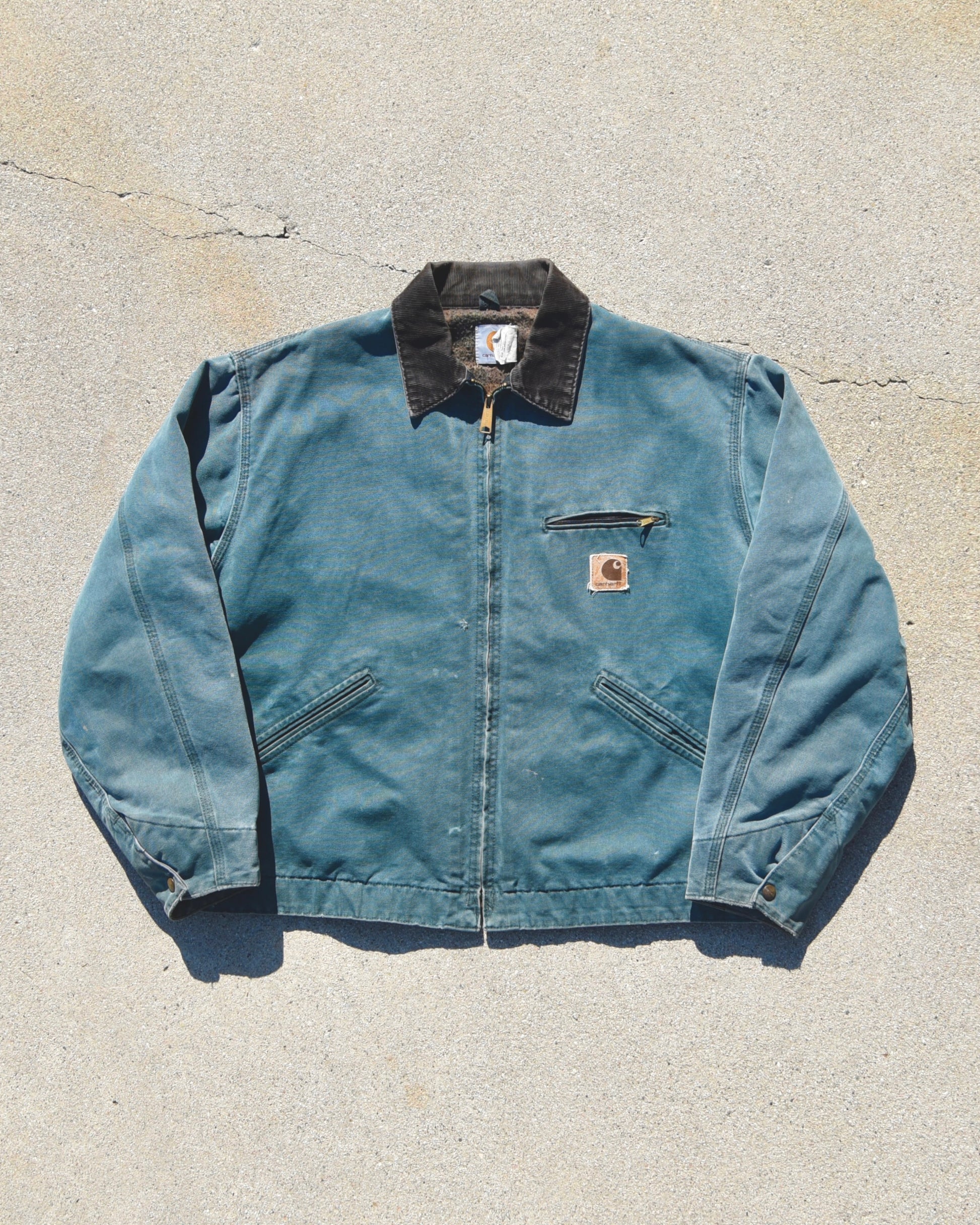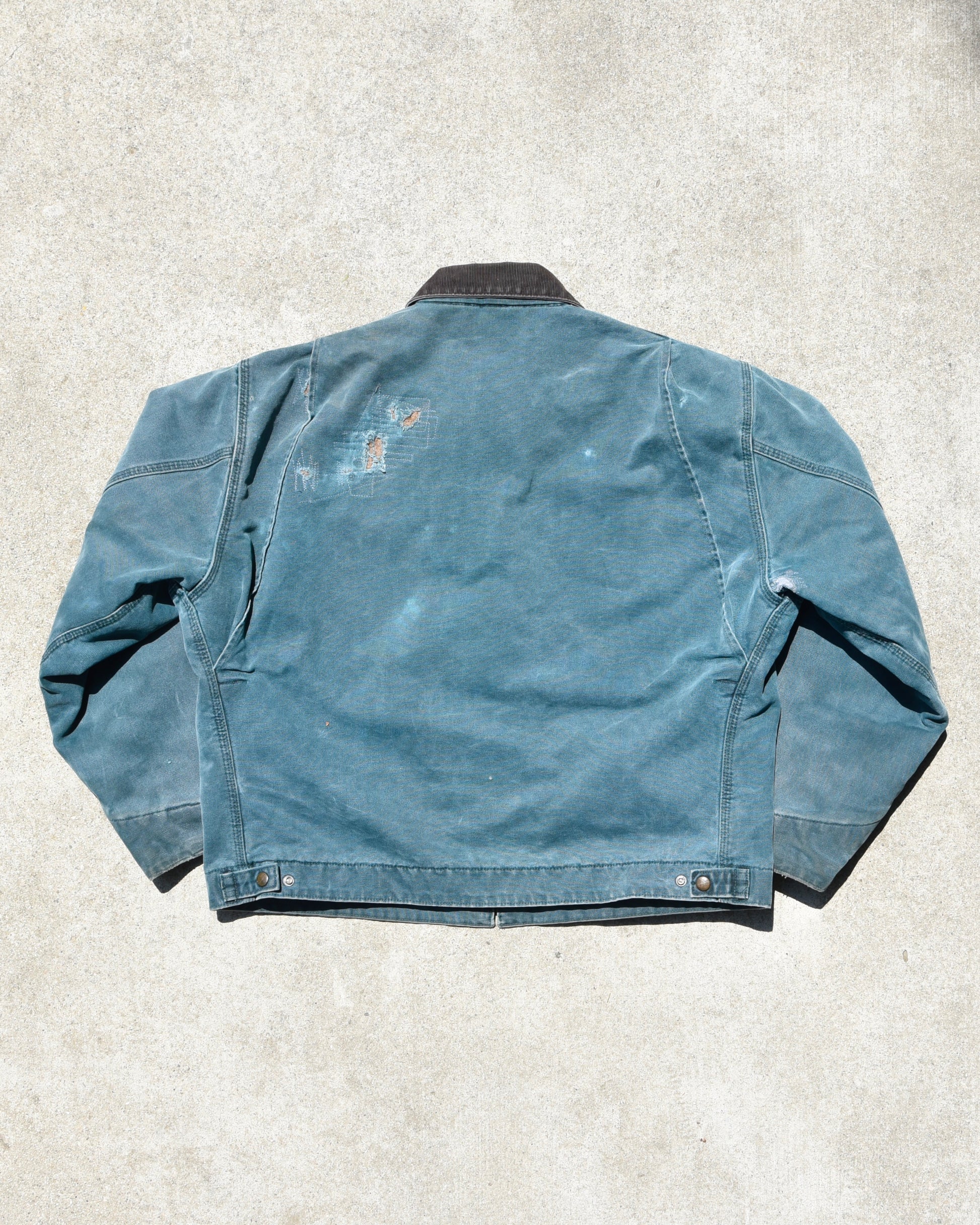 Carhartt J43 HTG Hunter Green Detroit Jacket. Very rare color. Has been repaired in the back as shown in pics. In good condition overall, zippers and hardware all work. Tagged size XL. Great fade and vibrant color