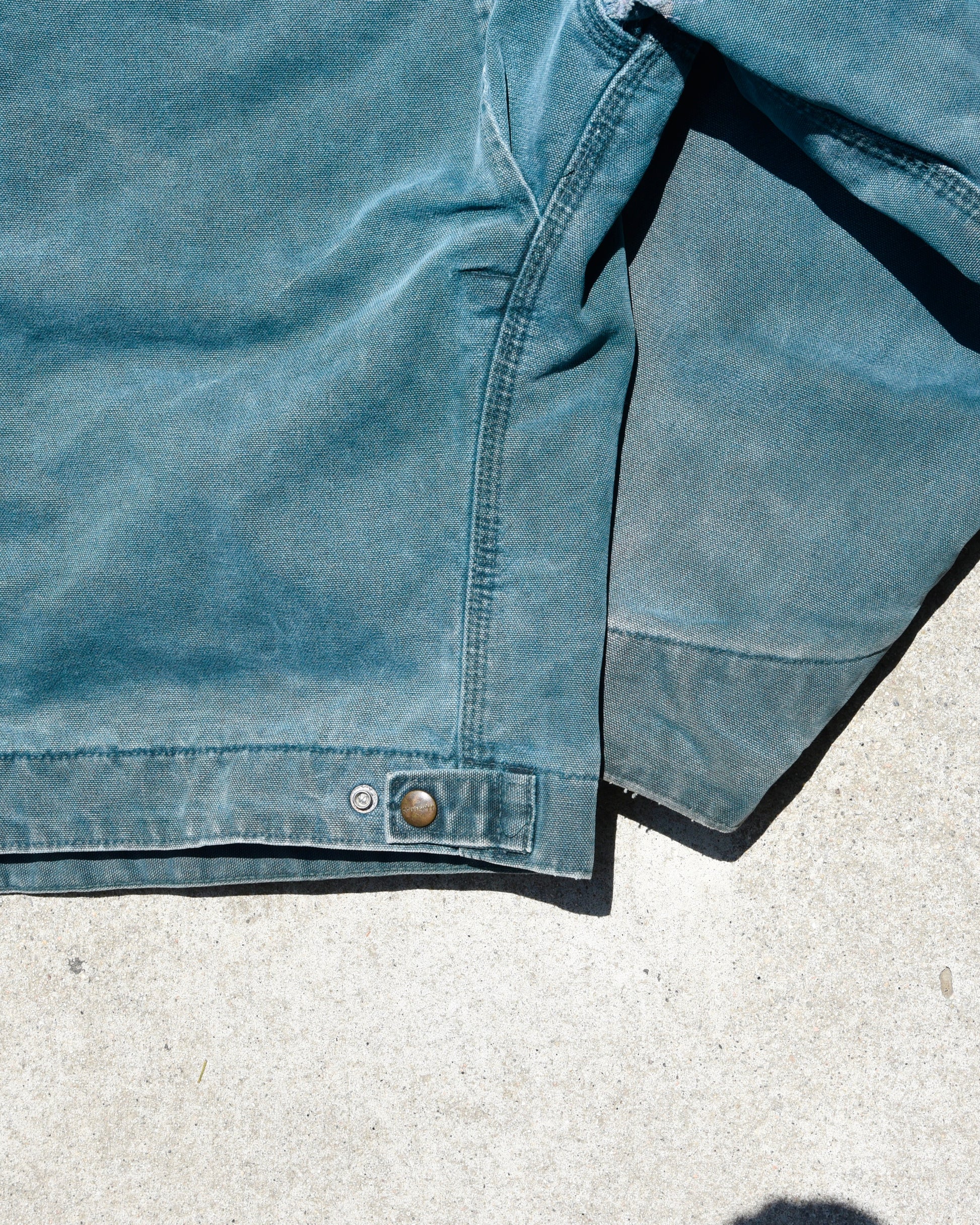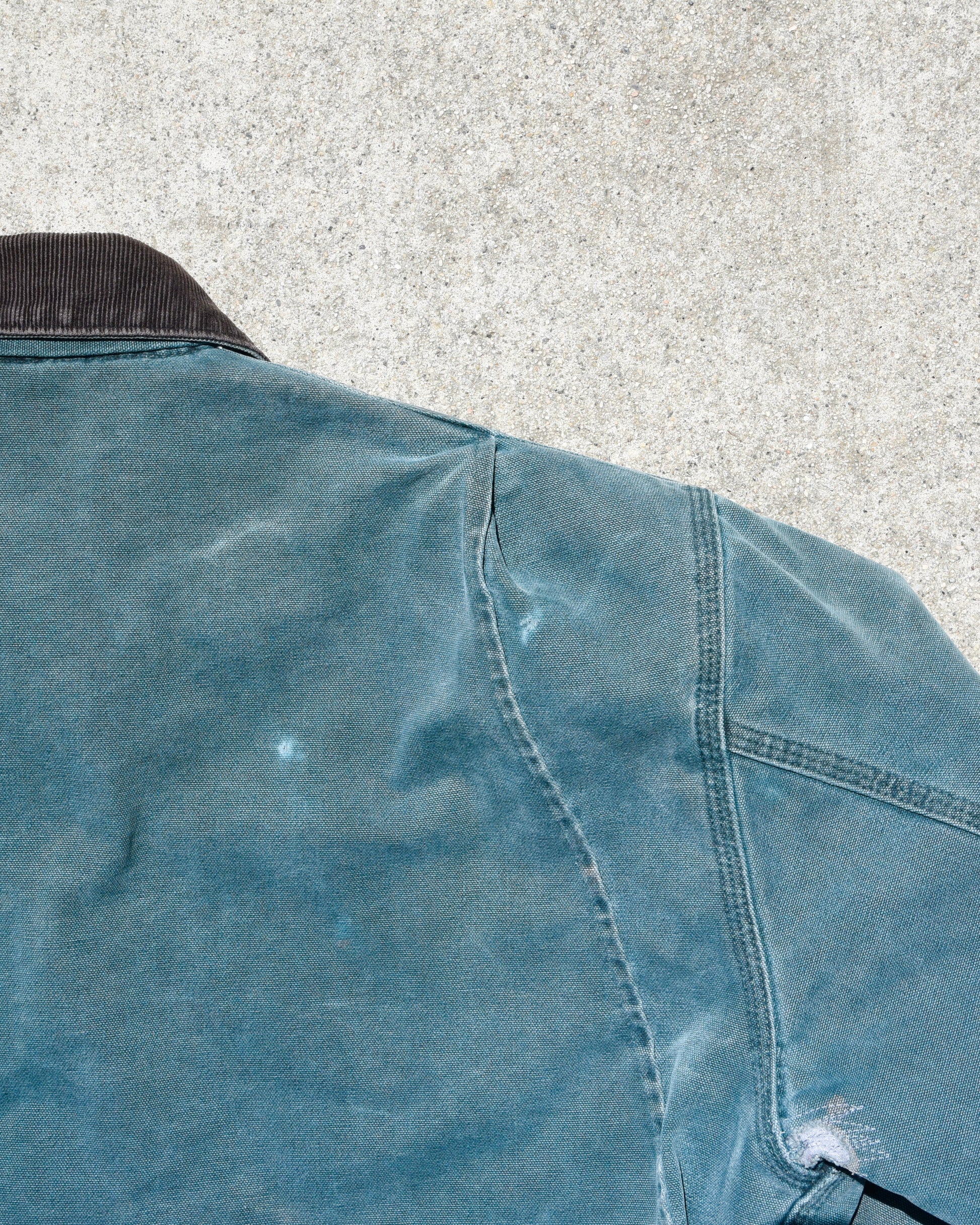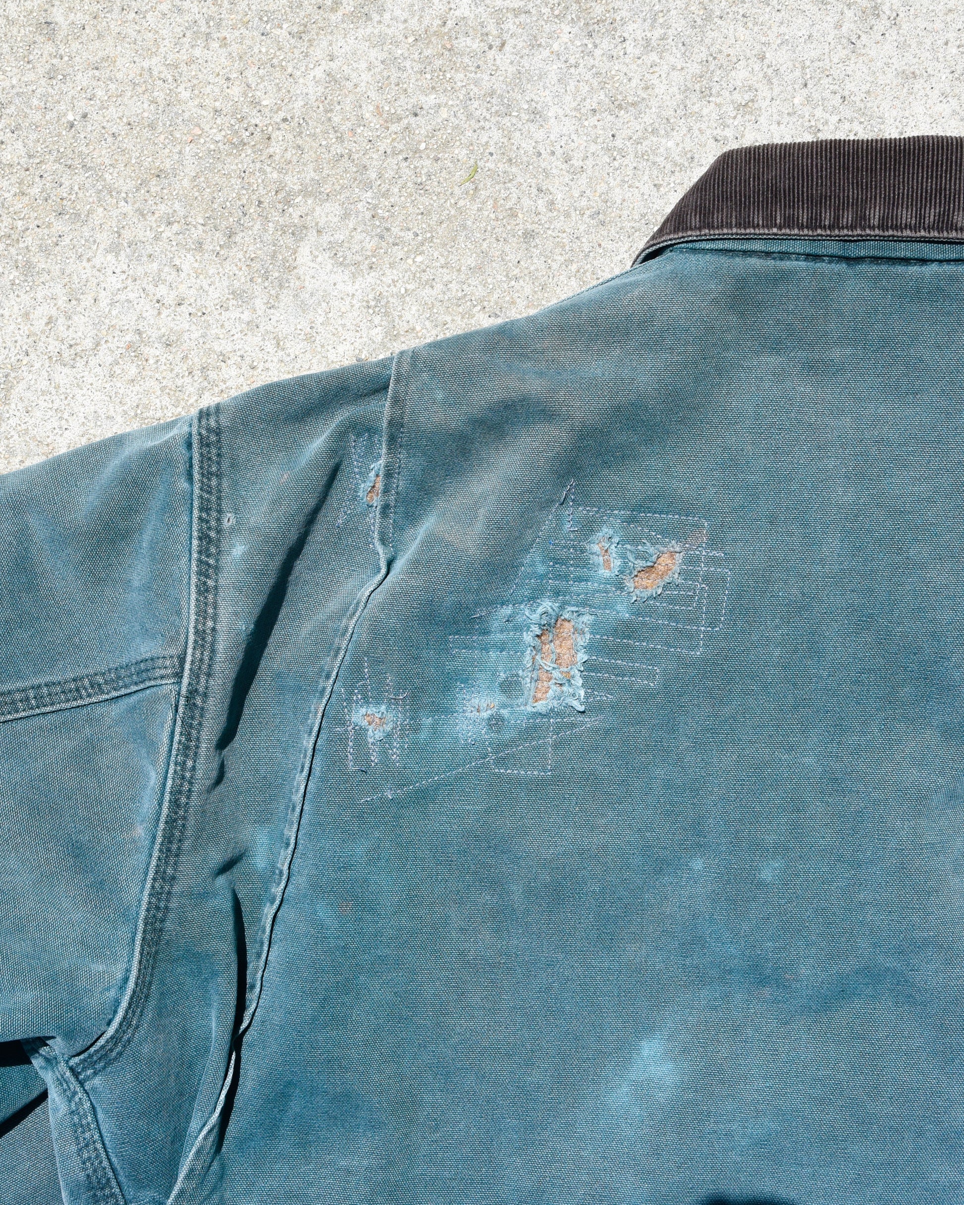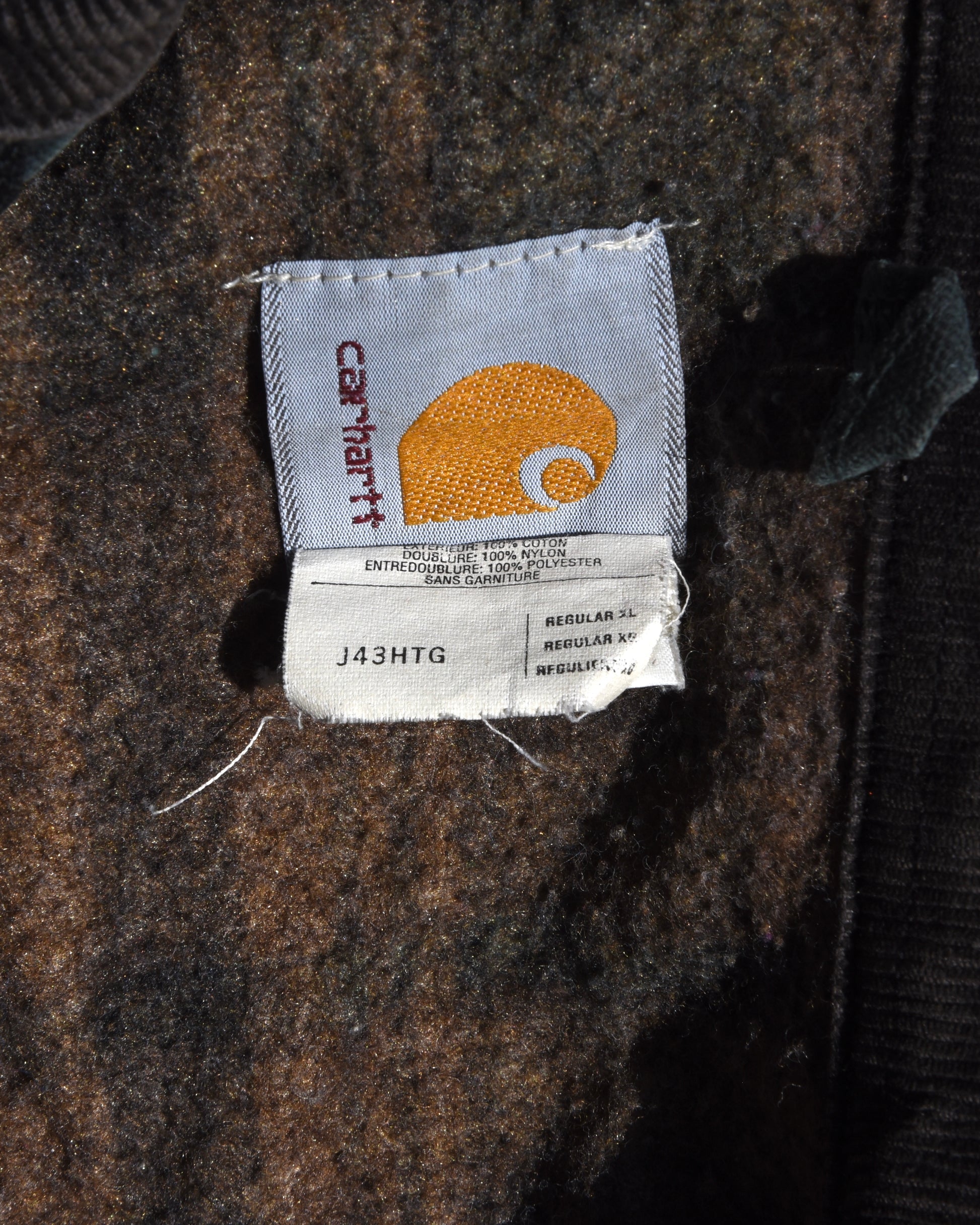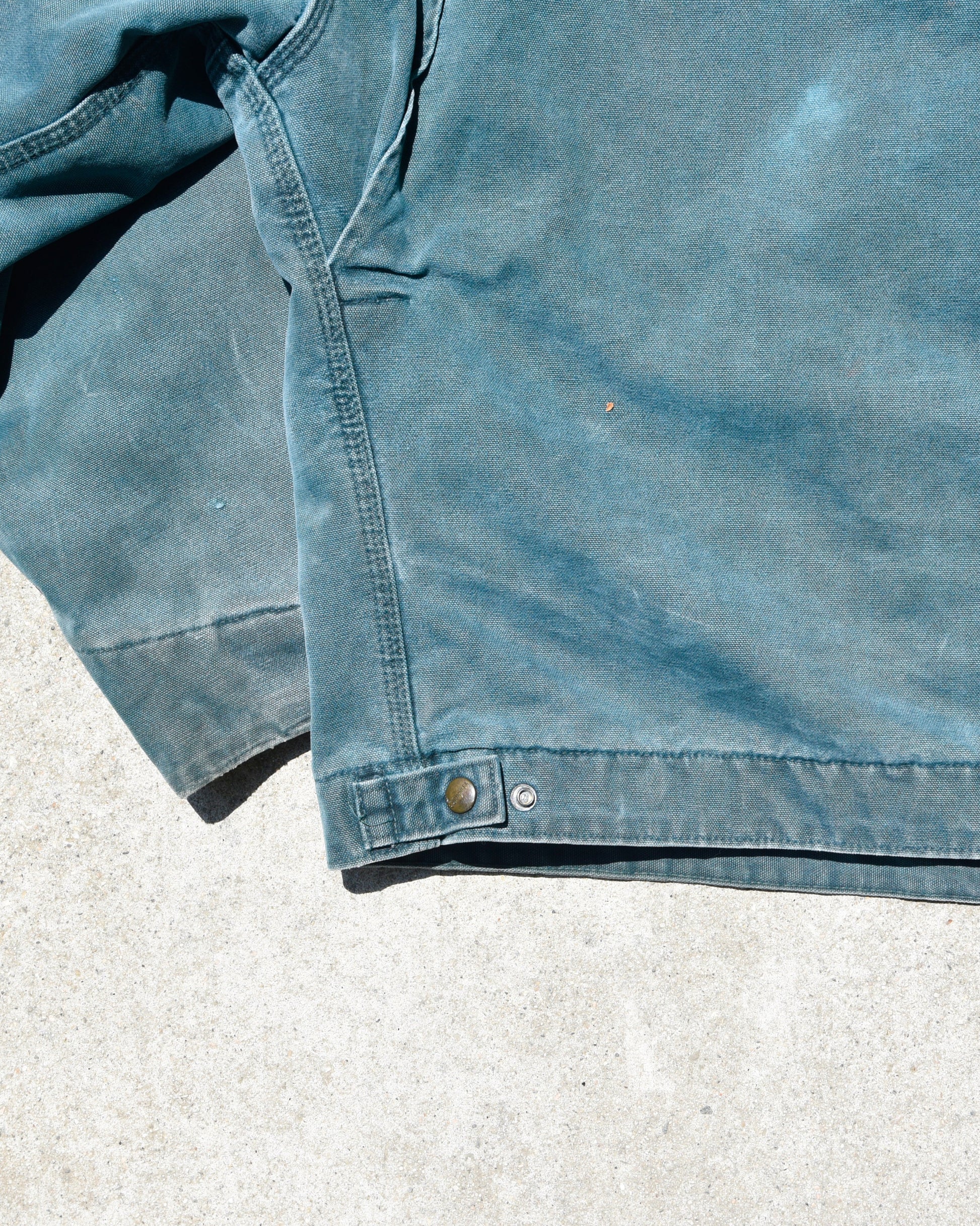 Carhartt J43 HTG Hunter Green Detroit Jacket. Very rare color. Has been repaired in the back as shown in pics. In good condition overall, zippers and hardware all work. Tagged size XL. Great fade and vibrant color