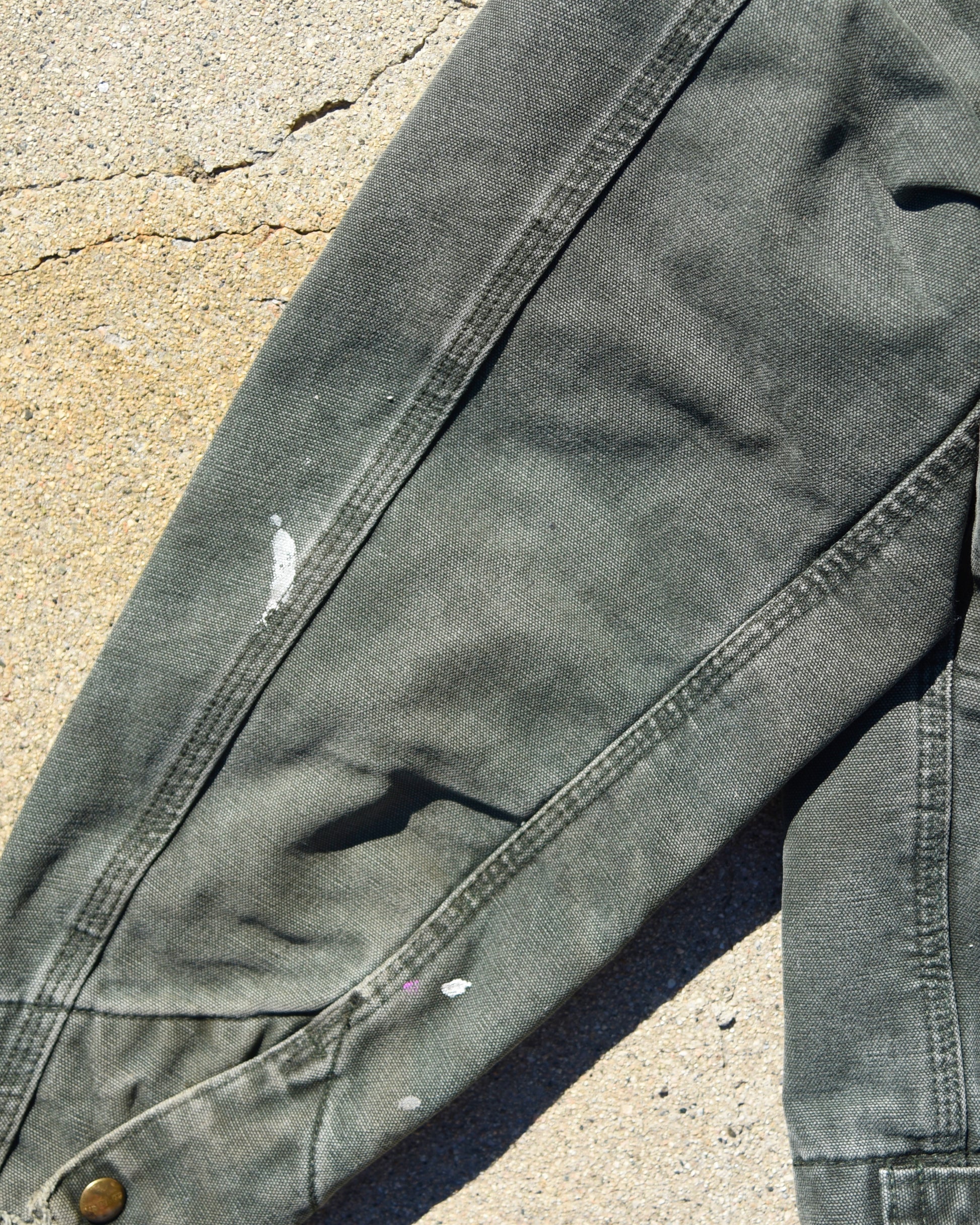 Carhartt J97 MOS Moss Green Detroit Jacket. In good condition overall. Moss color is very vibrant on this. Liner in good condition. Zipper and all hardware works. Tagged size medium. Only cosmetic flaw is there are a couple paint marks on the back of one of the sleeves as shown