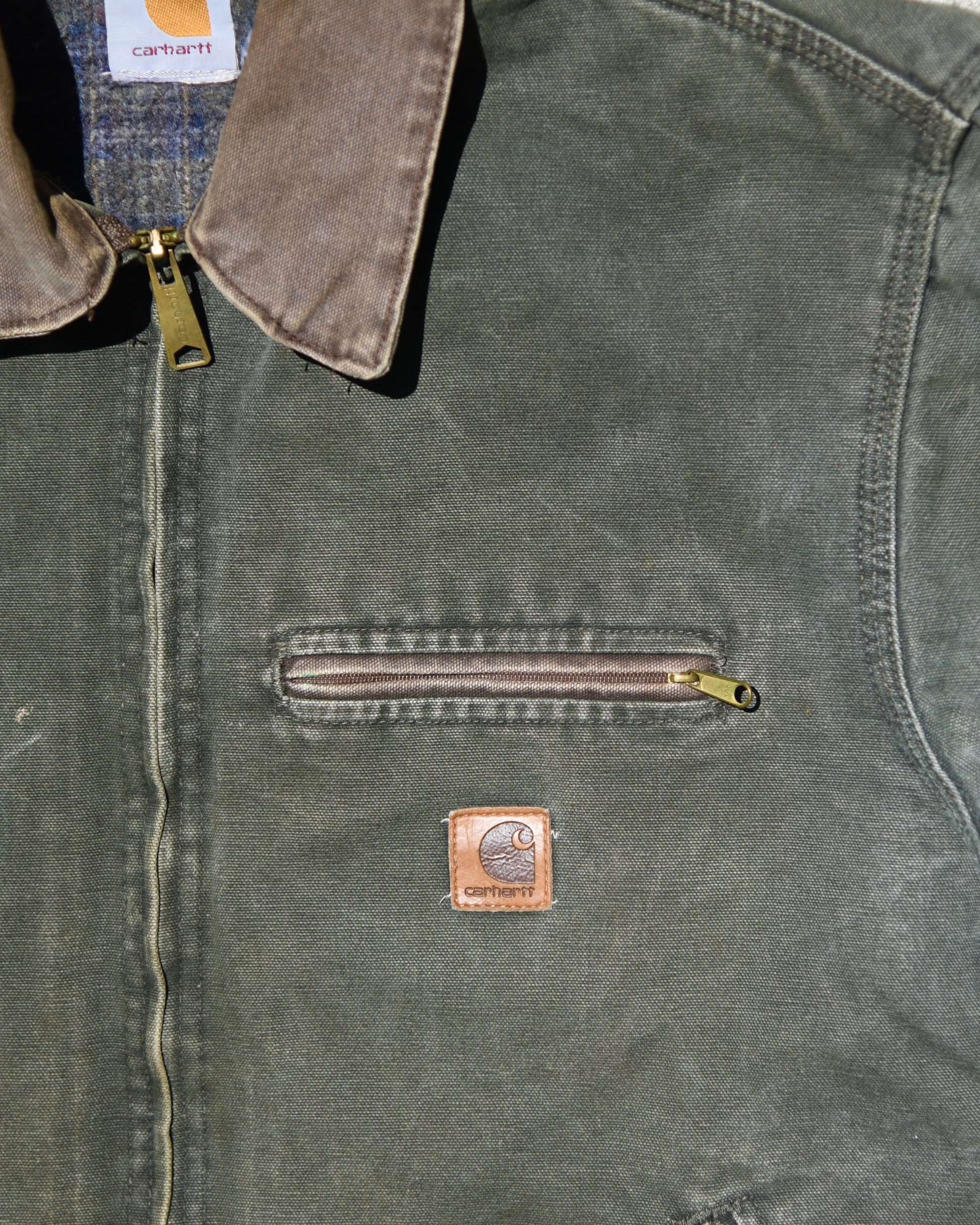 Vintage Carhartt J97 MOS Moss Green Detroit Jacket size medium. In good condition overall but does have signs of wear throughout as shown in pics. Dirt stains and markings. Zipper and hardware all works. Tag missing but is definitely a medium as it measures exactly the same as the mediums I own