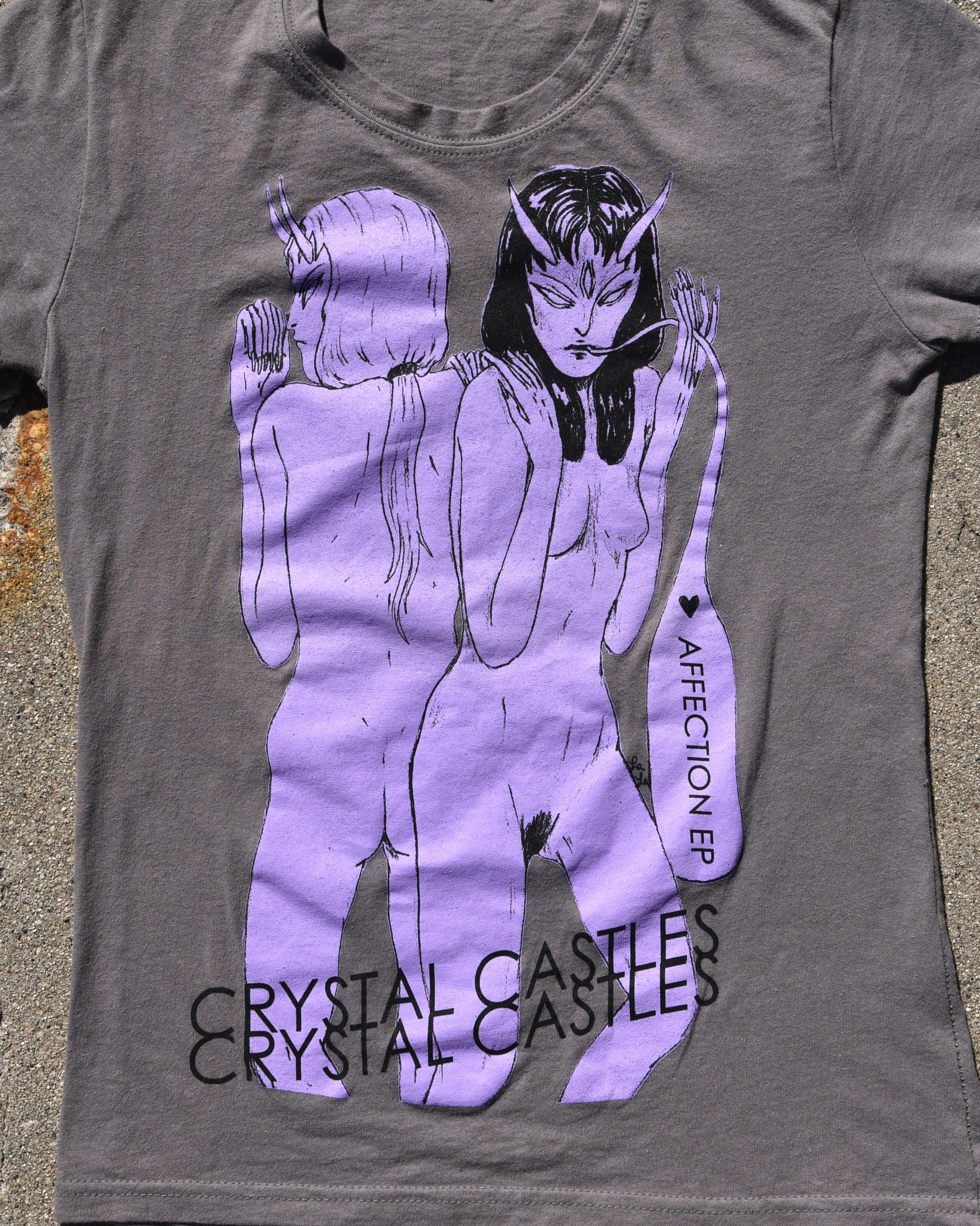 Crystal Castles Affection EP Promo Tshirt. Official bay island Crystal Castles merch. This was a promo for the Affection EP that got scrapped when the group disbanded. Extremely rare. Tagged size small. In good condition. This is a women’s tshirt