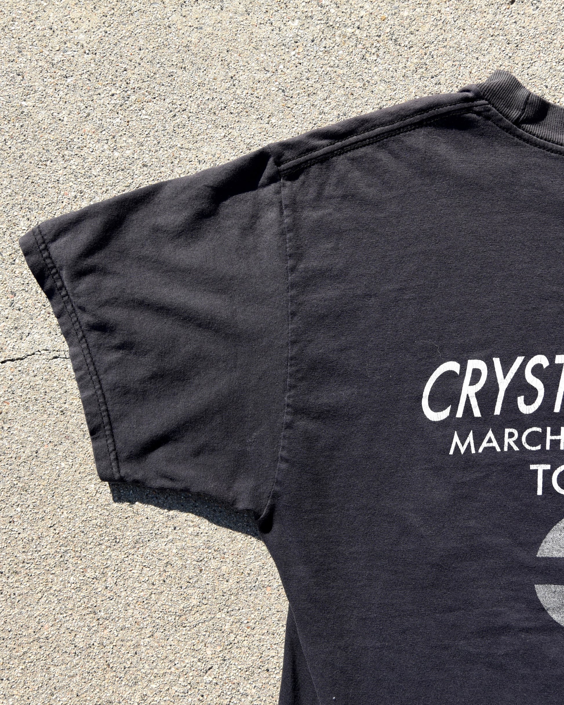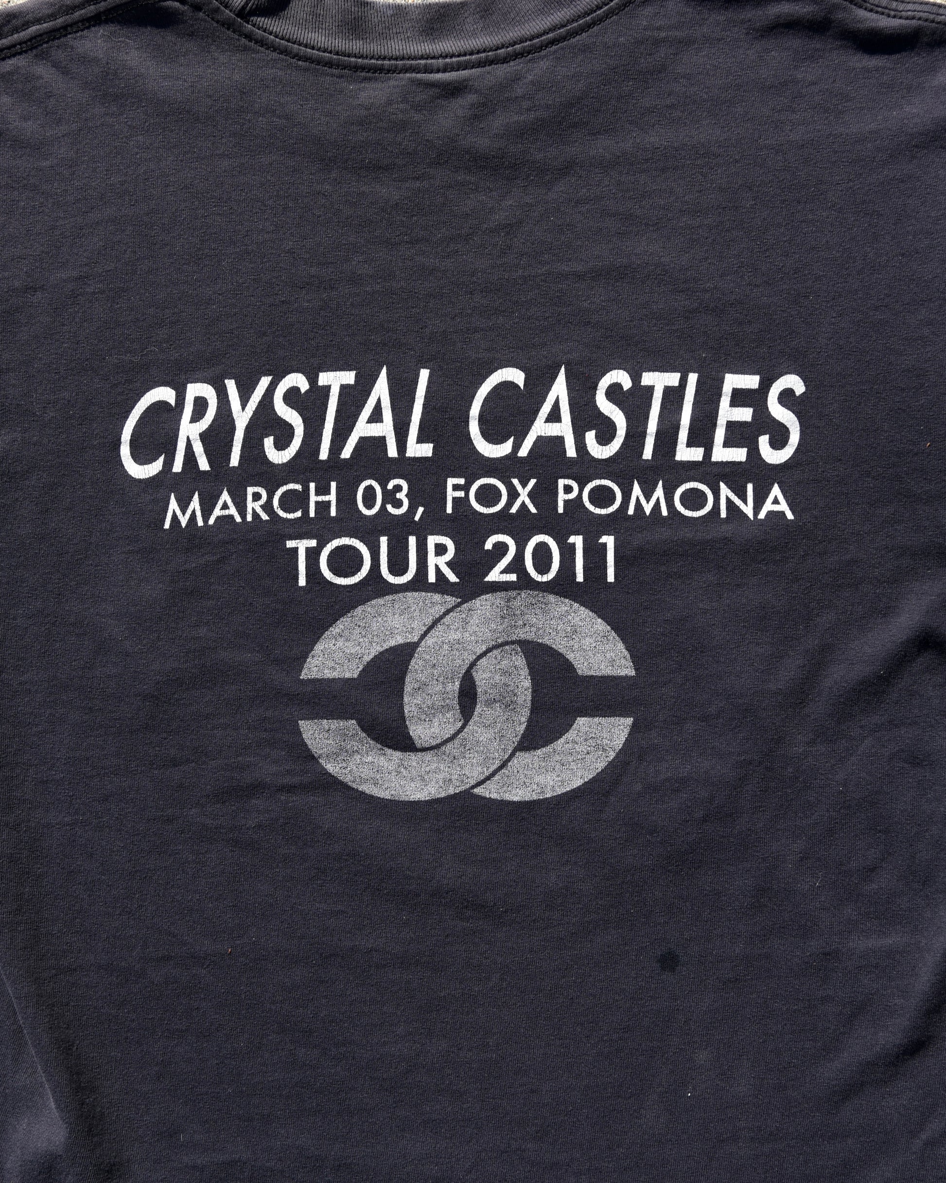 Crystal Castles official 2011 Sad Face Tour Shirt. Attained from the live show at Fox Theater in Pomona CA. Has signs of wear throughout for years of wear but in solid condition overall. Extremely rare and hard to find sad face tee especially with the tour date on the back. Tag is chopped up but fits like a medium
